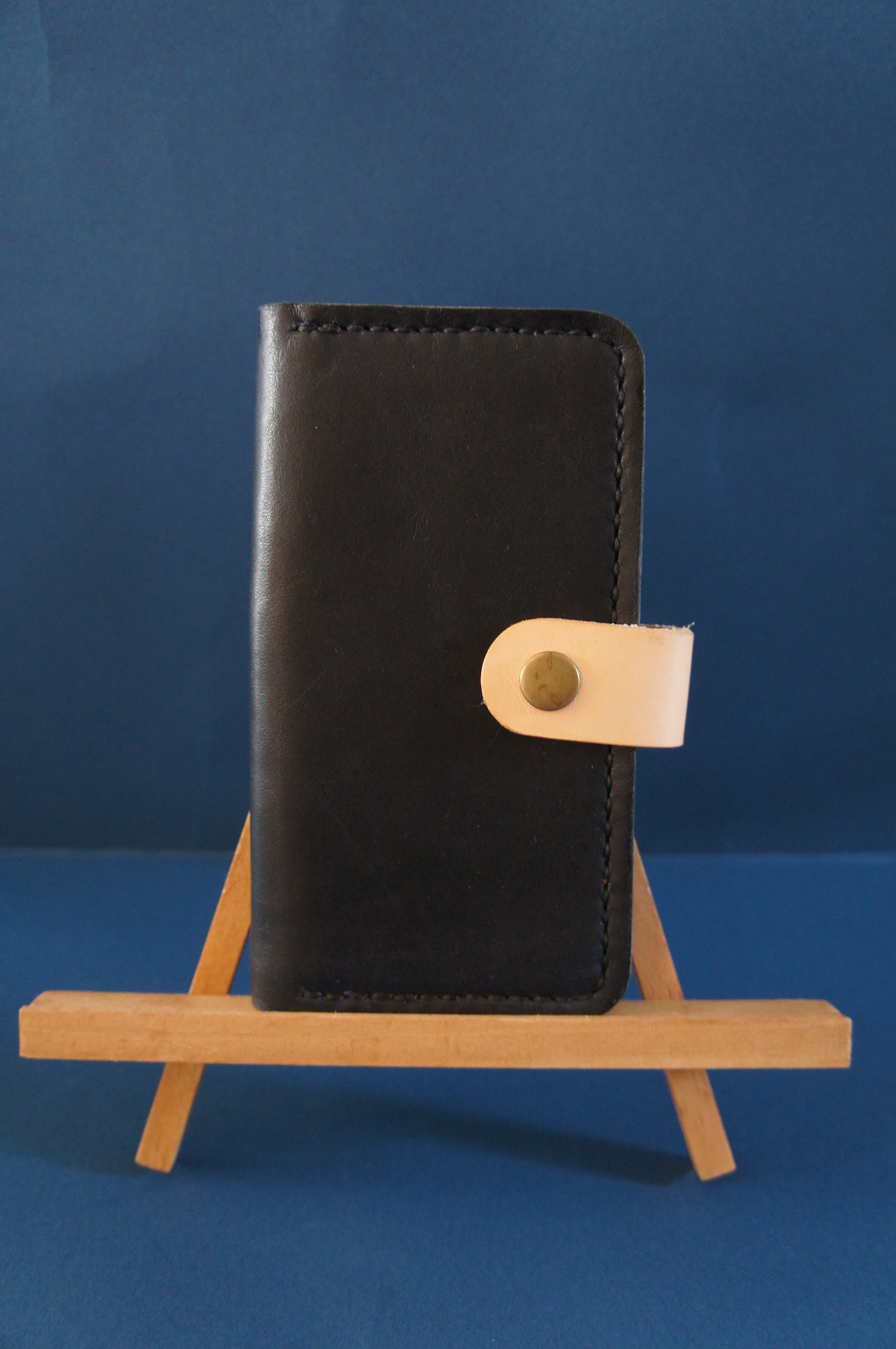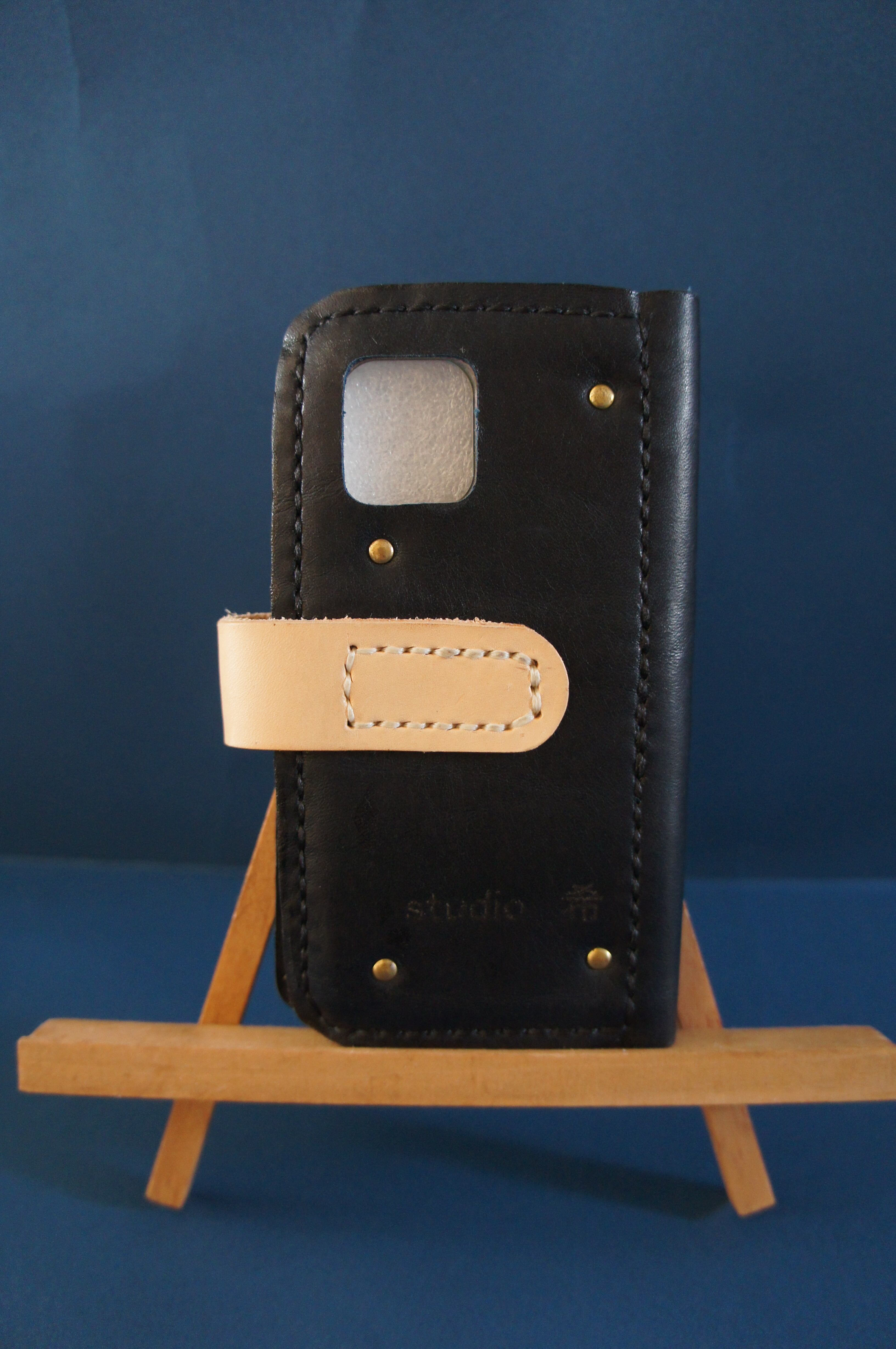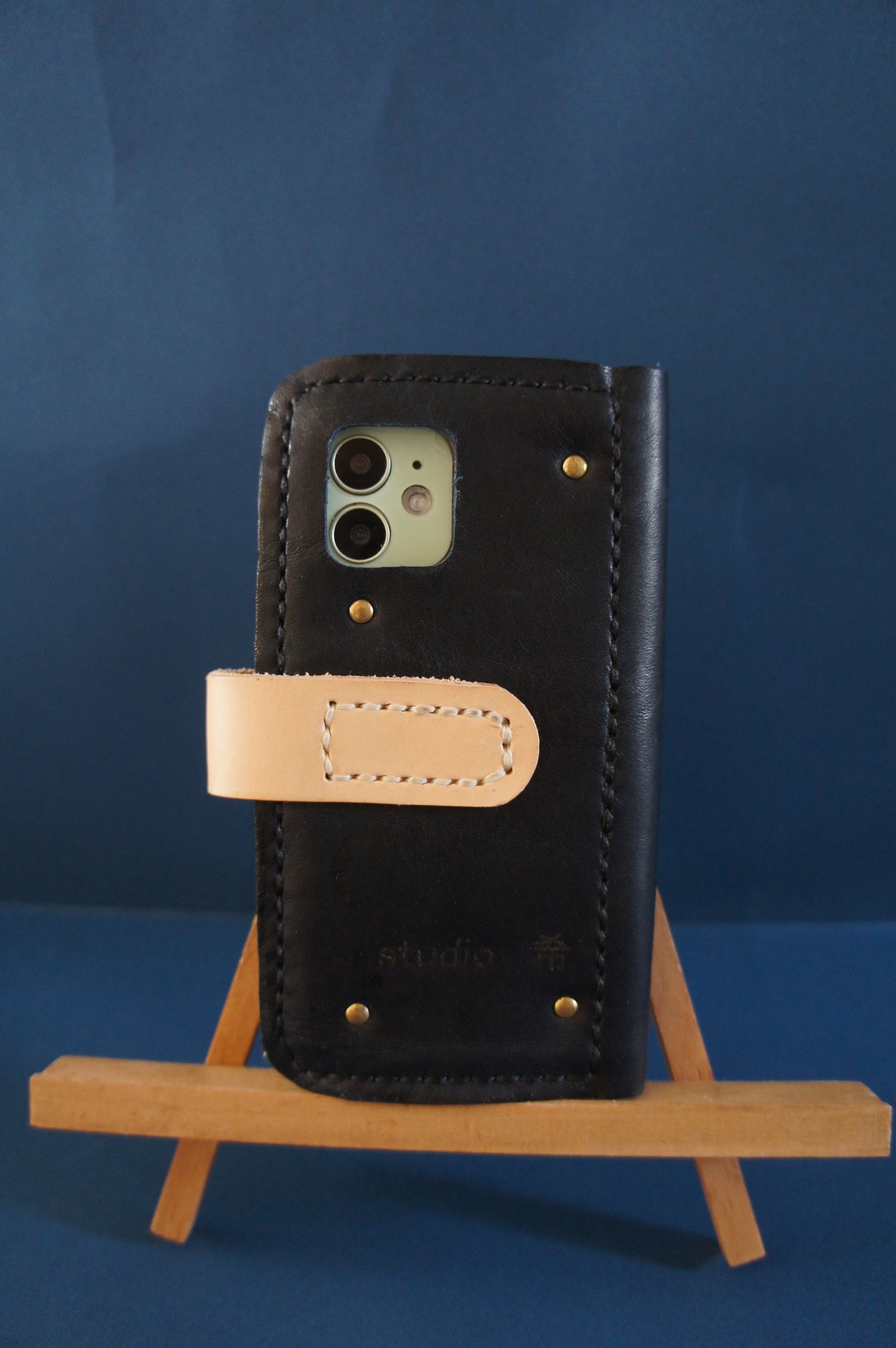一点物です。iPhone12mini用の手帳型スマートフォンケースです。本体、内側、カードホルダー、ホルダー裏、バックルの合計5枚の革を縫い合わせています。太さ1番の黒色の糸ですべて手縫いで仕上げています。2本の針で縫っていますので、ほつれにくい構造になっています。本体は1.5mmの厚さの黒色の牛革です。内側には厚さ0.8mmの水牛の革を使っています。カードホルダーが1つあります。カードホルダー部分の裏には収納スペースがあります。スマートフォンを固定する部分は、カシメ金具4個で固定してあります。バネホック、金具の色は銅色です。カメラ穴部分を硬くするためには皮革硬化剤を使用しています。張り合わせ部分はつるつるに磨いています。