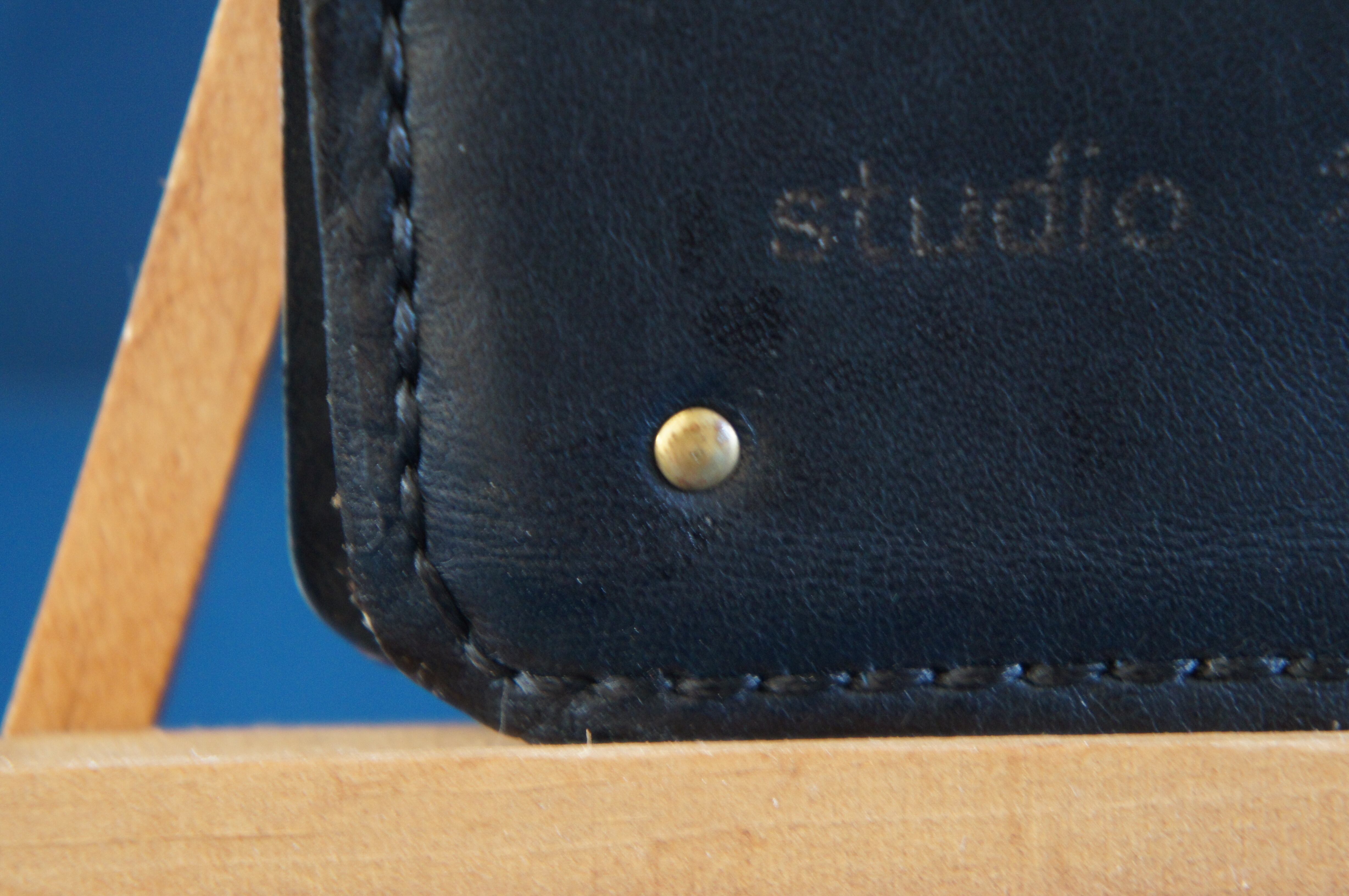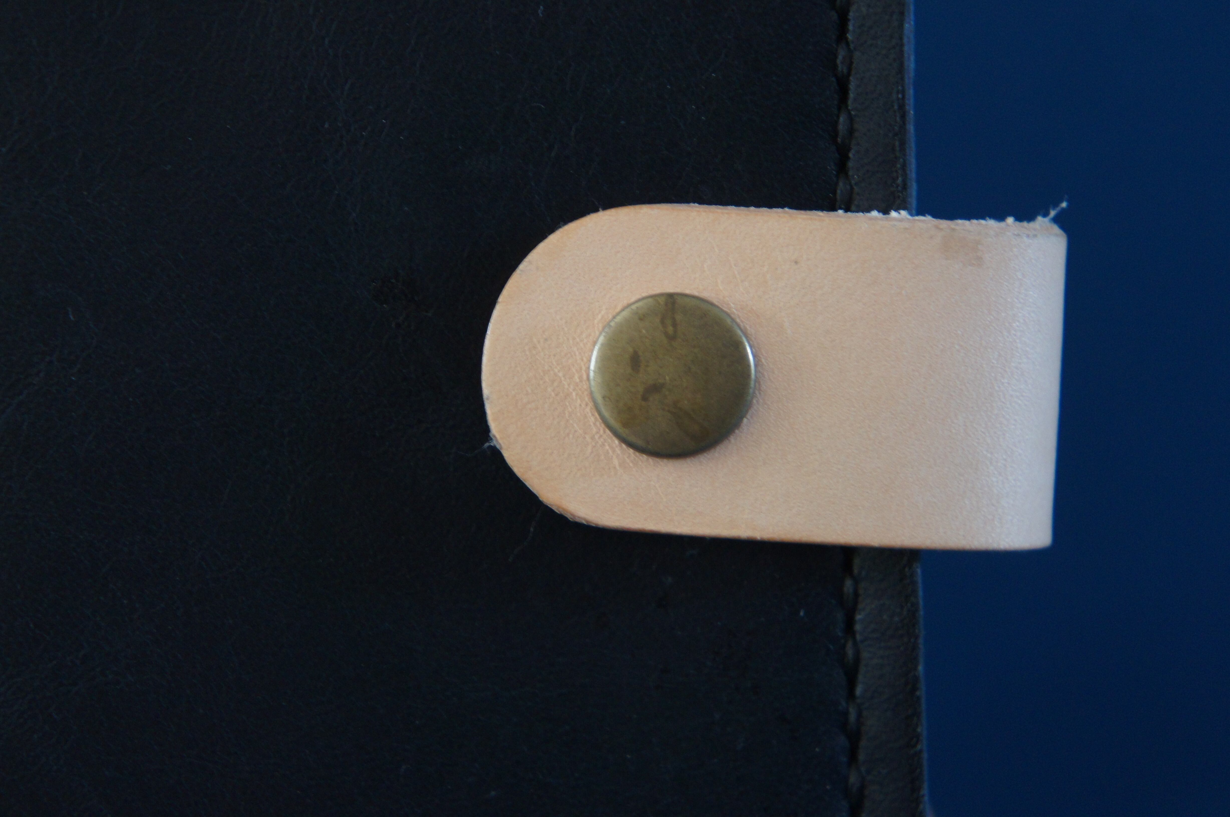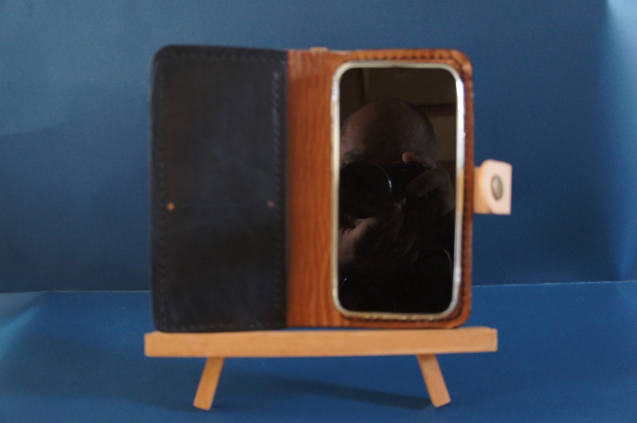 一点物です。iPhone12mini用の手帳型スマートフォンケースです。本体、内側、カードホルダー、ホルダー裏、バックルの合計5枚の革を縫い合わせています。太さ1番の黒色の糸ですべて手縫いで仕上げています。2本の針で縫っていますので、ほつれにくい構造になっています。本体は1.5mmの厚さの黒色の牛革です。内側には厚さ0.8mmの水牛の革を使っています。カードホルダーが1つあります。カードホルダー部分の裏には収納スペースがあります。スマートフォンを固定する部分は、カシメ金具4個で固定してあります。バネホック、金具の色は銅色です。カメラ穴部分を硬くするためには皮革硬化剤を使用しています。張り合わせ部分はつるつるに磨いています。