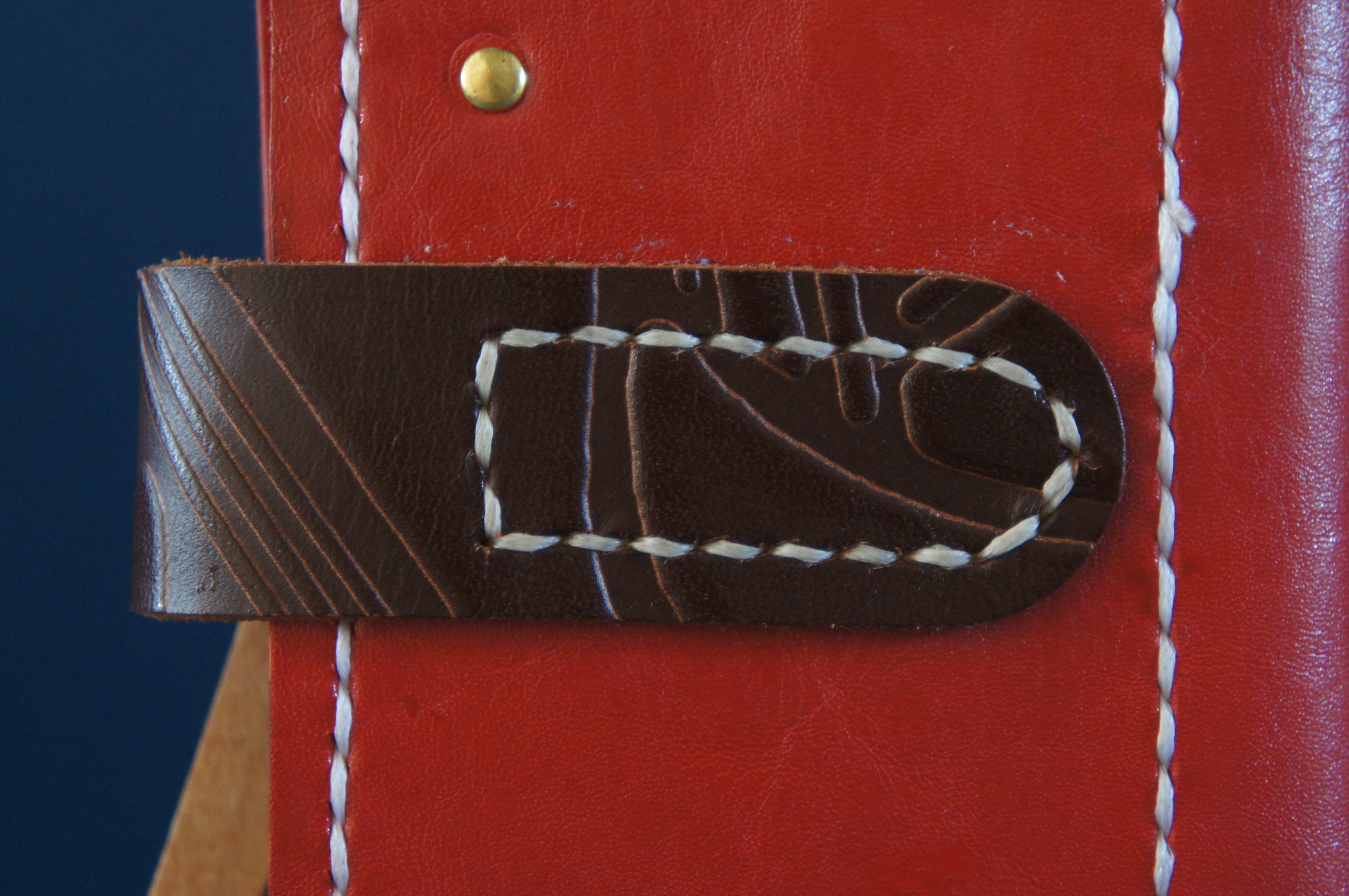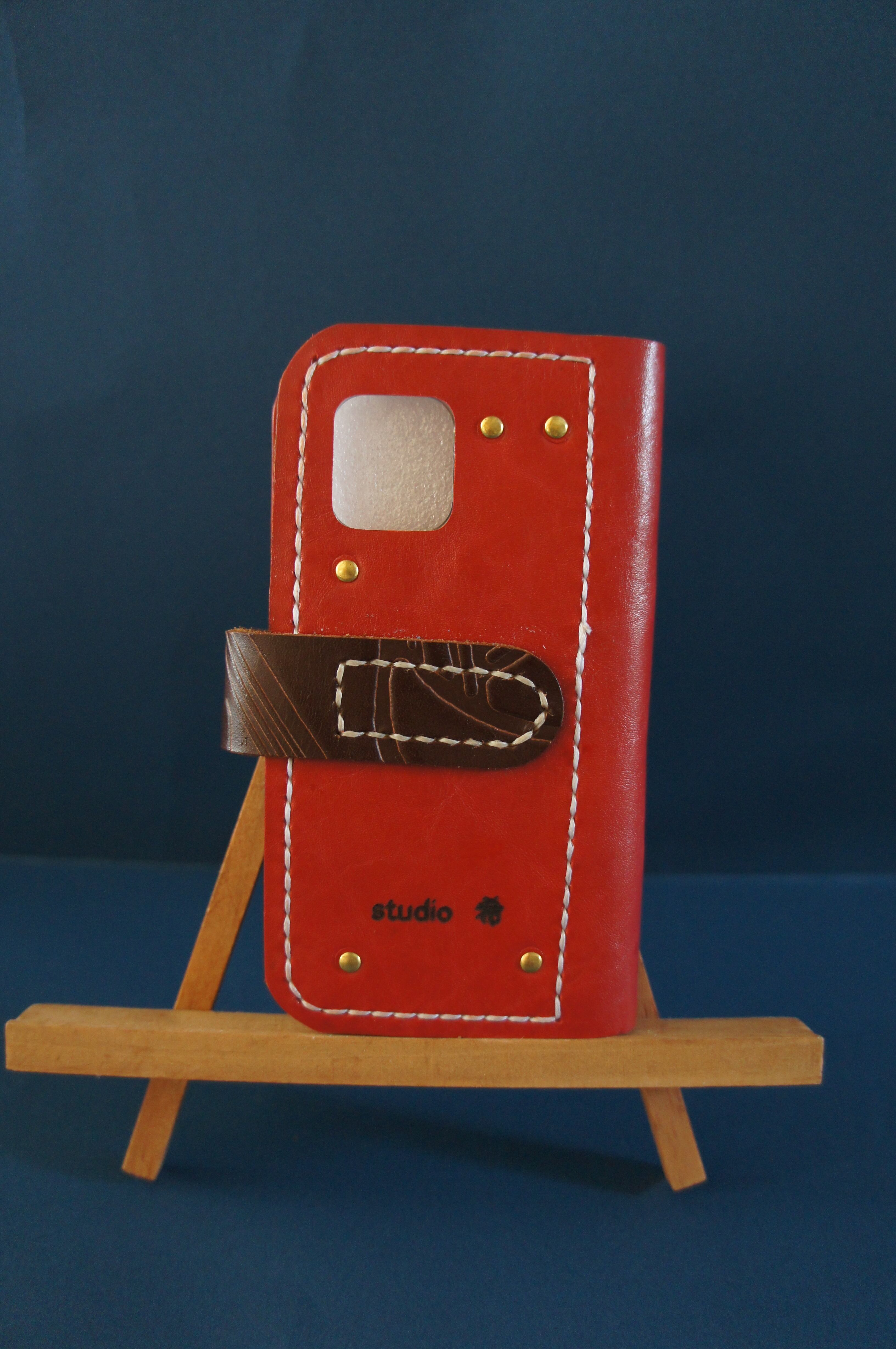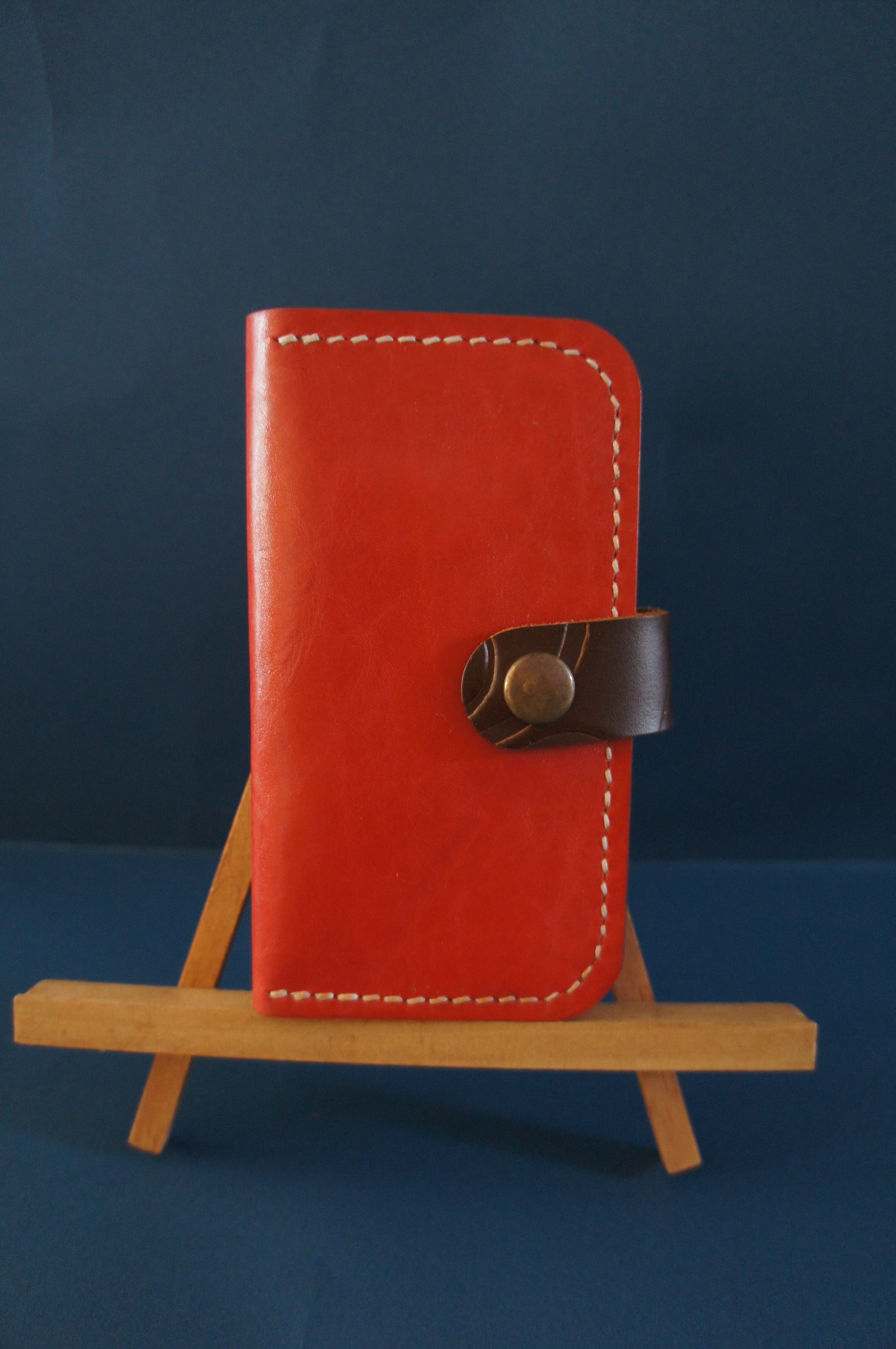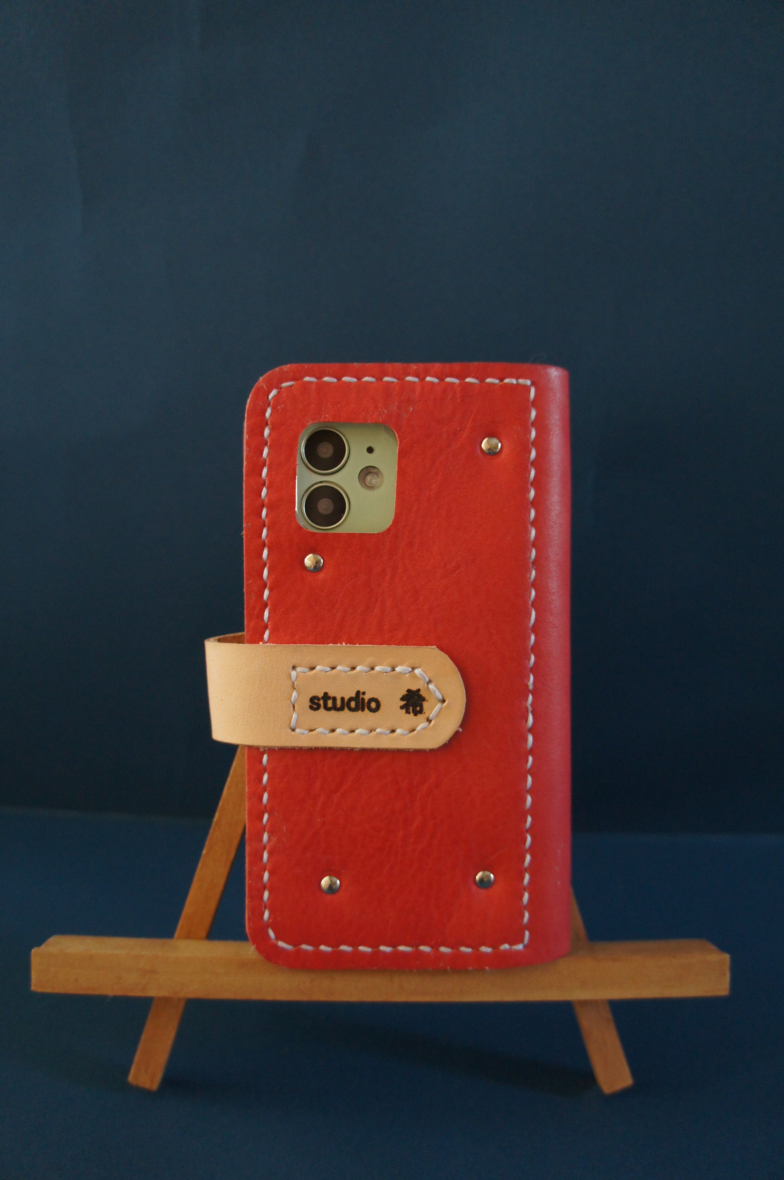 一点物です。iPhone12mini用の手帳型スマートフォンケースです。本体、内側、カードホルダー、ホルダー裏、バックルの合計5枚の革を縫い合わせています。太さ1番の白色の糸ですべて手縫いで仕上げています。2本の針で縫っていますので、ほつれにくい構造になっています。本体は1.5mmの厚さのオレンジ色のシュリンクの牛革です。内側には厚さ0.8mmのアメ豚の革を使っています。カードホルダーが1つあります。カードホルダー部分の裏には収納スペースがあります。スマートフォンを固定する部分は、カシメ金具5個で固定してあります。バネホック、金具の色は金色です。カメラ穴部分を固くするためには皮革硬化剤を使用しています。貼り付け部分はつるつるに磨いています。