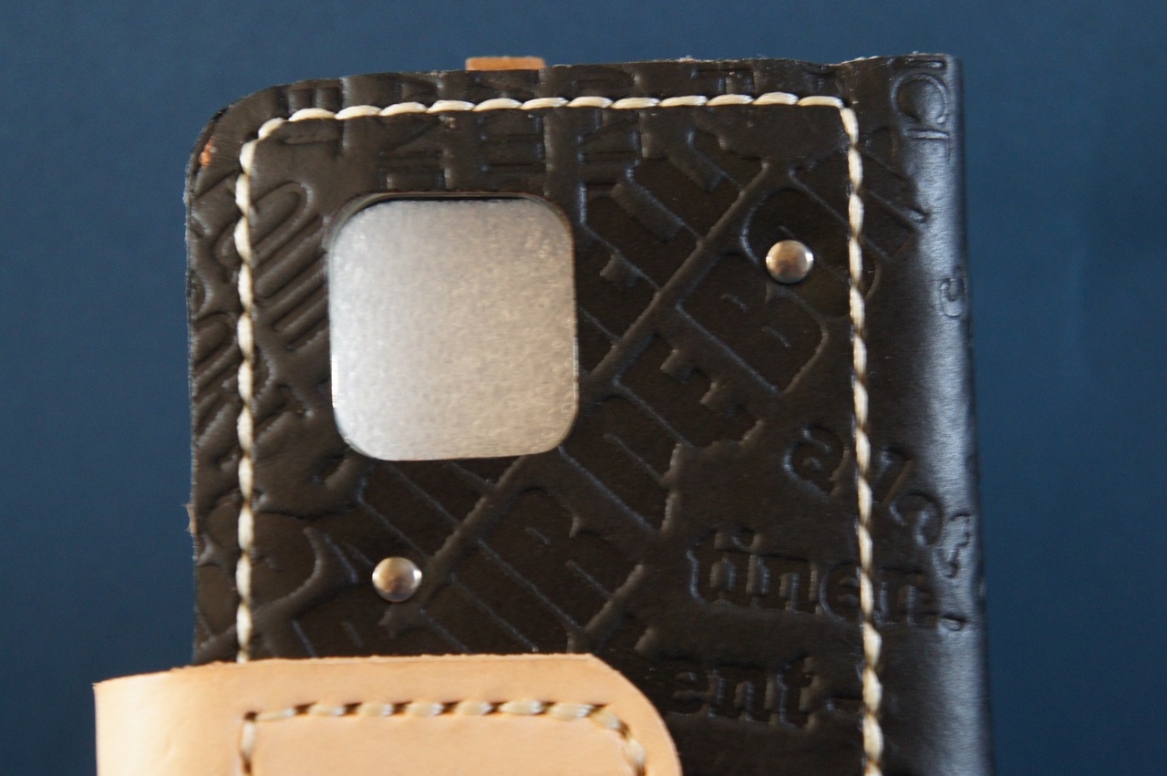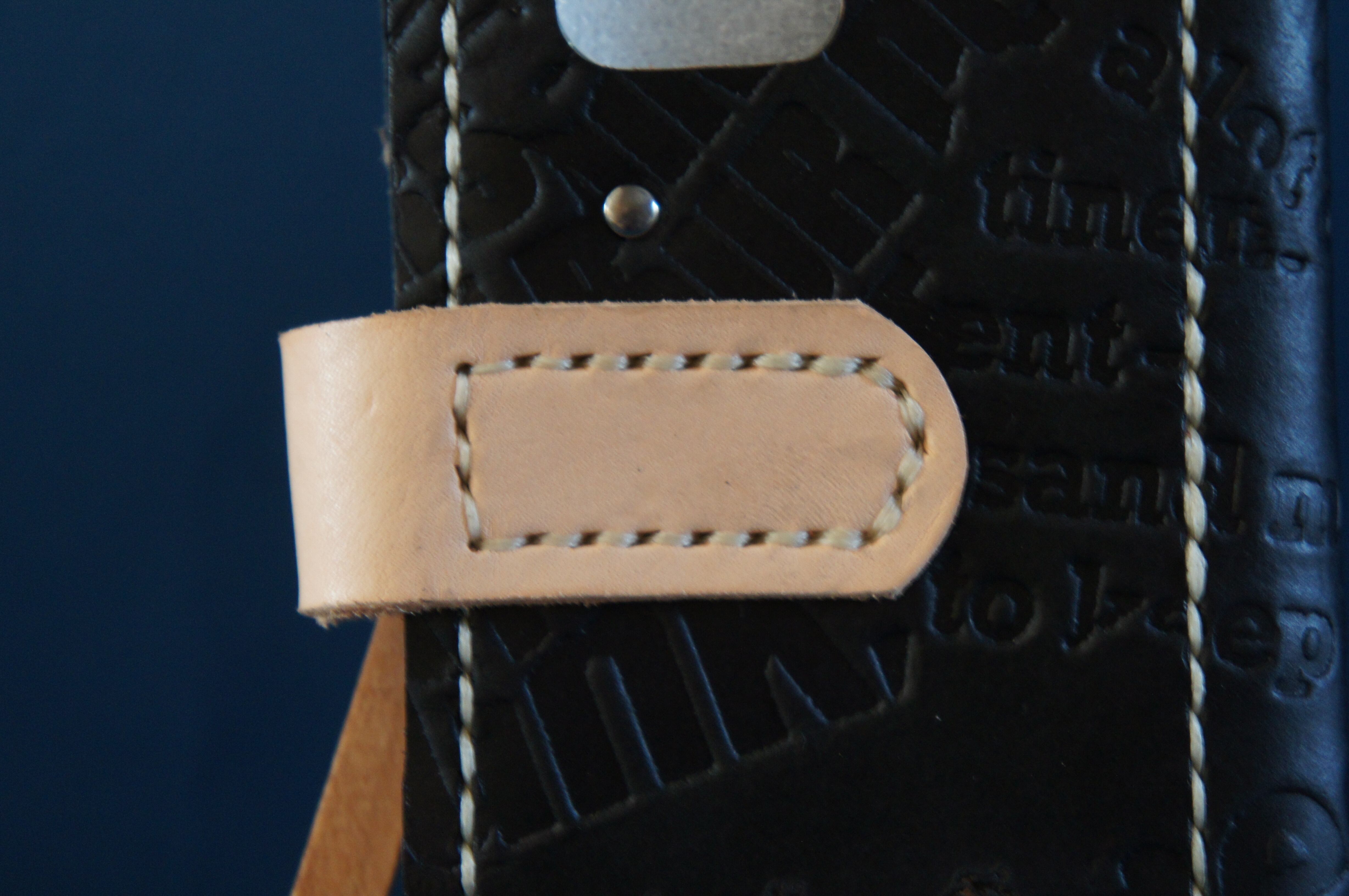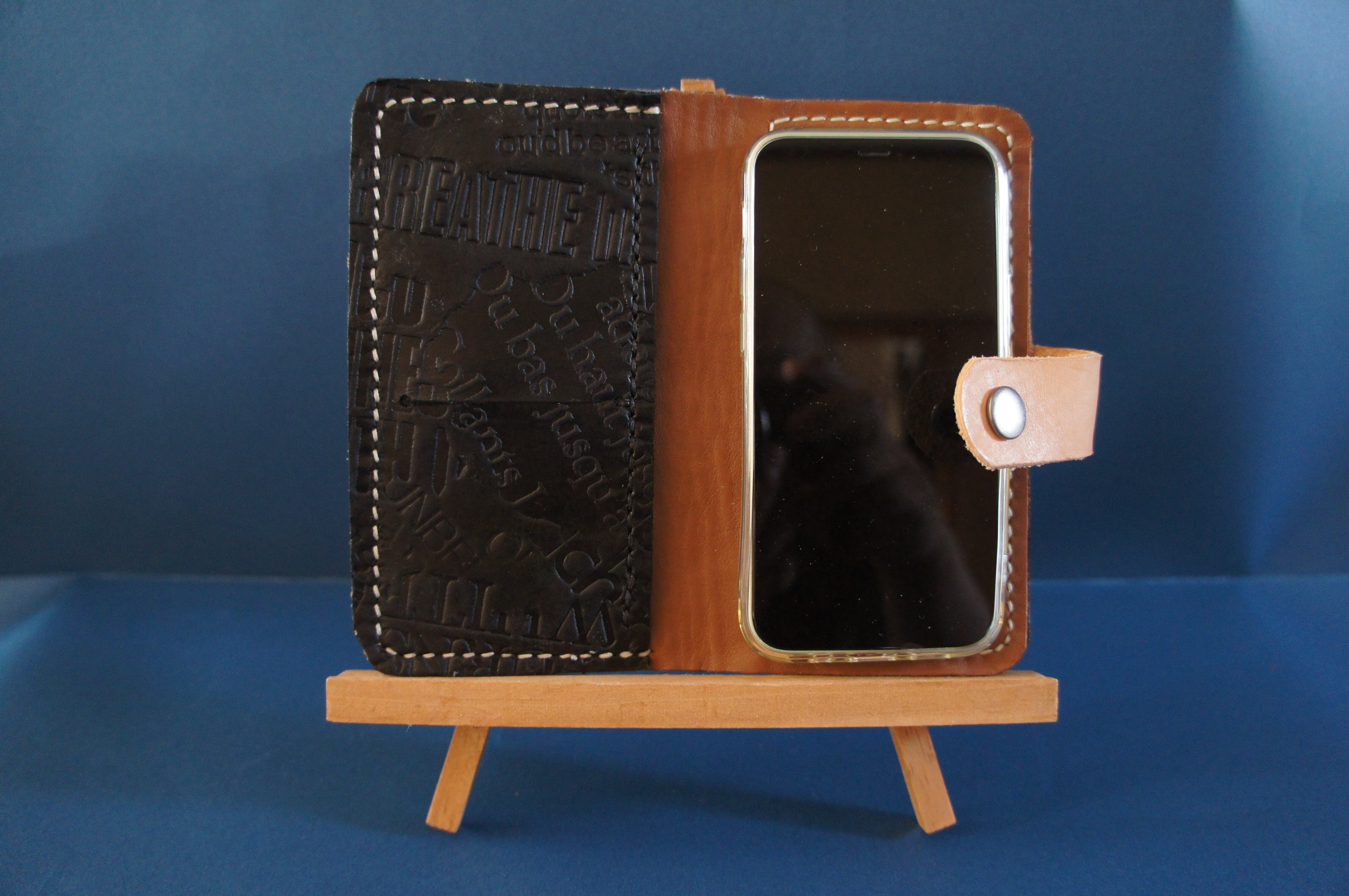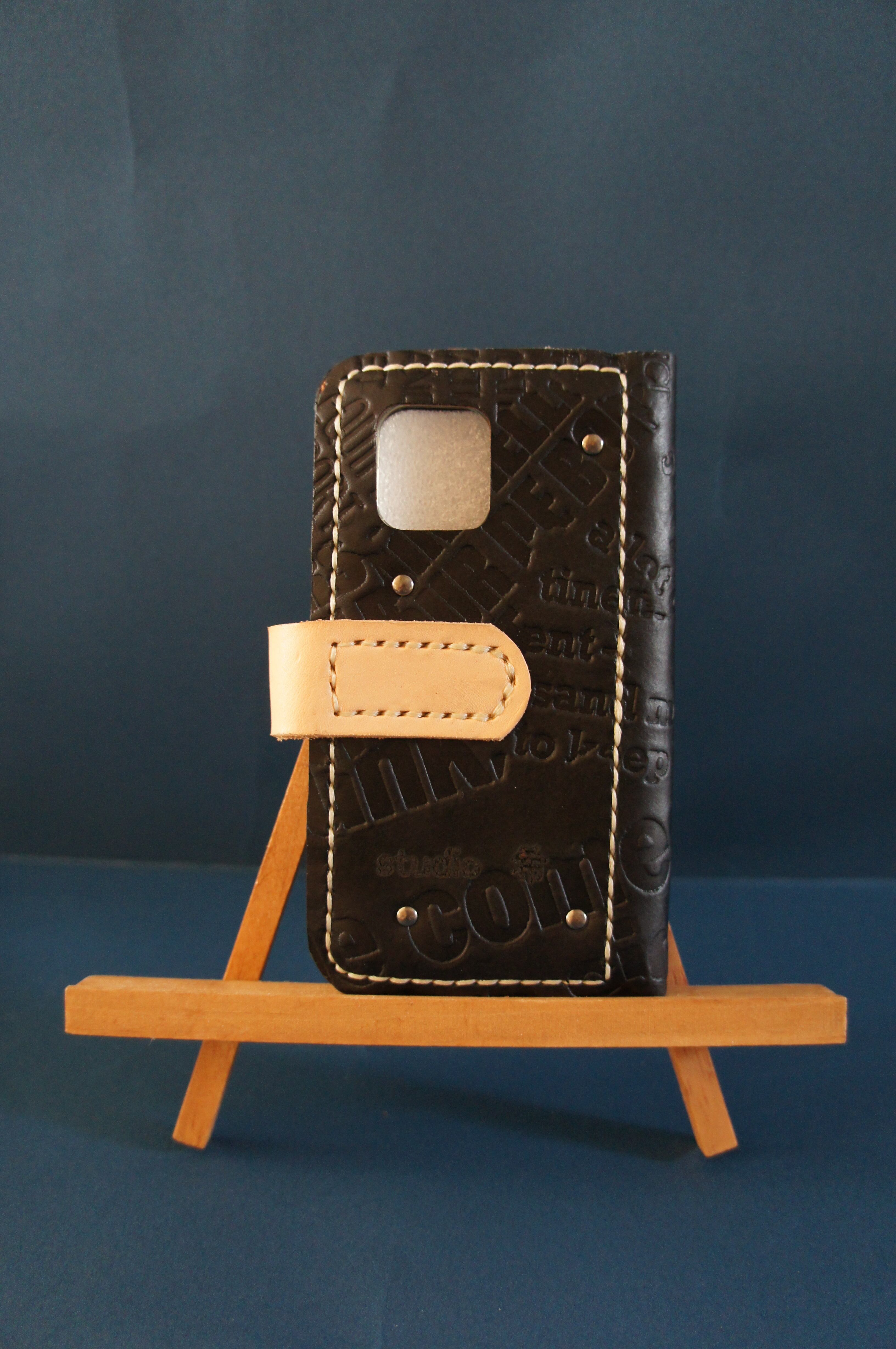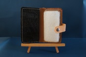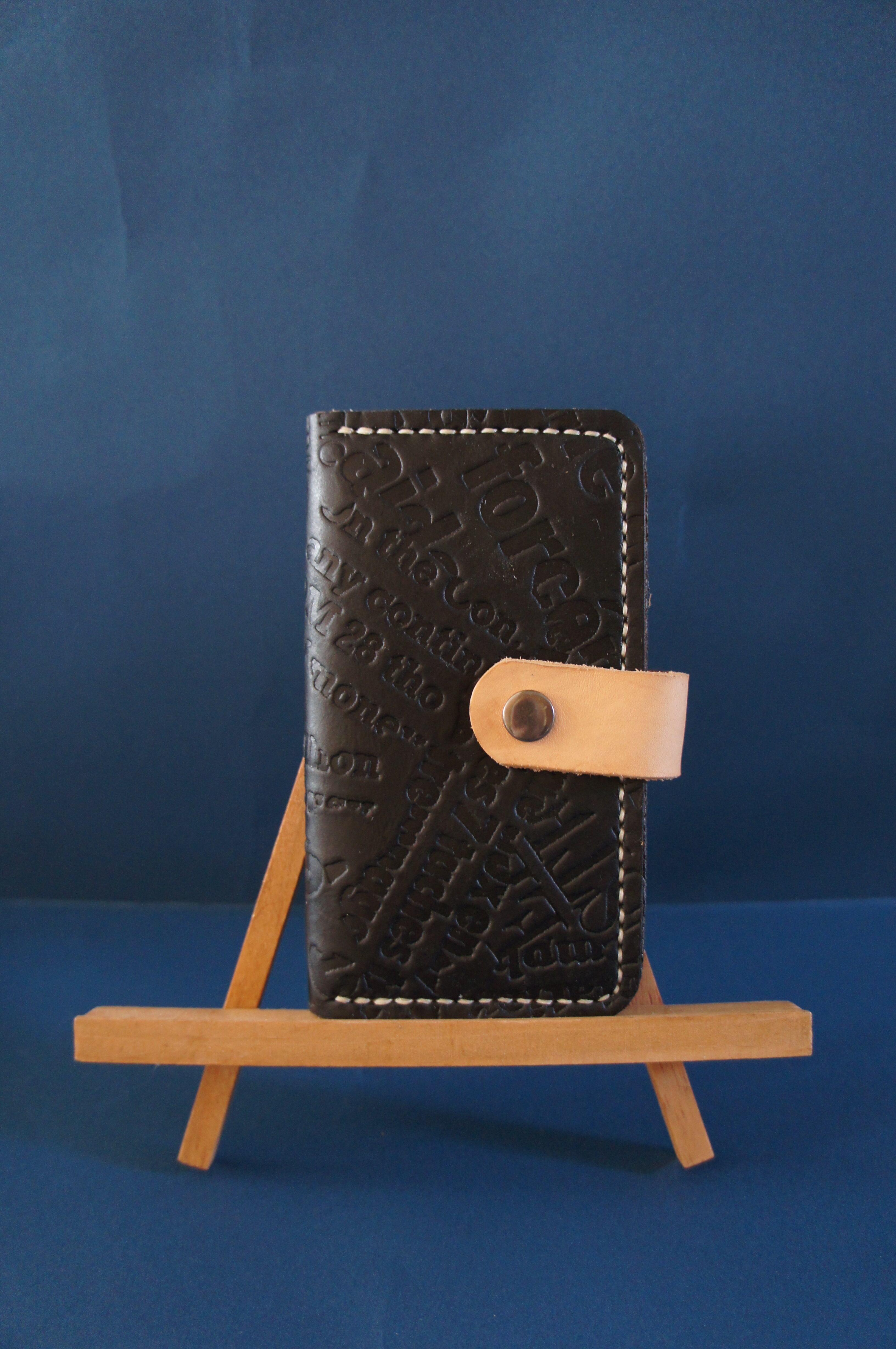 一点物です。iPhone12mini用の手帳型スマートフォンケースです。本体、内側、カードホルダー、ホルダー裏、バックルの合計5枚の革を縫い合わせています。太さ1番の白色の糸ですべて手縫いで仕上げています。2本の針で縫っていますので、ほつれにくい構造になっています。本体は1.5mmの厚さの英字型押し黒色の牛革です。内側には厚さ0.8mmの水牛の革を使っています。カードホルダーが1つあります。カードホルダー部分の裏には収納スペースがあります。スマートフォンを固定する部分は、カシメ金具4個で固定してあります。バネホック、金具の色はブロンズです。カメラ穴部分を固くするためには皮革硬化剤を使用しています。貼り付け部分はつるつるに磨いています。