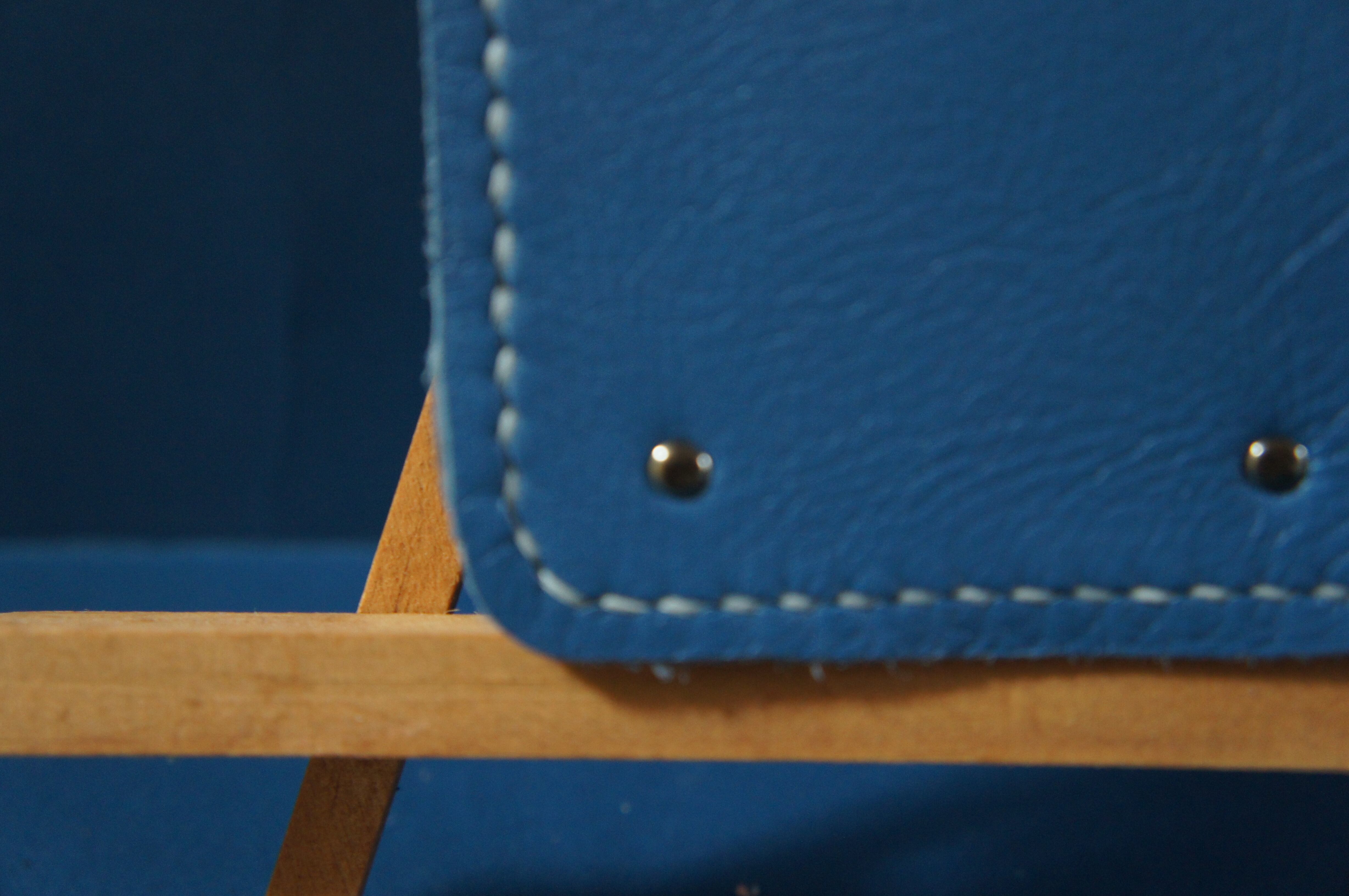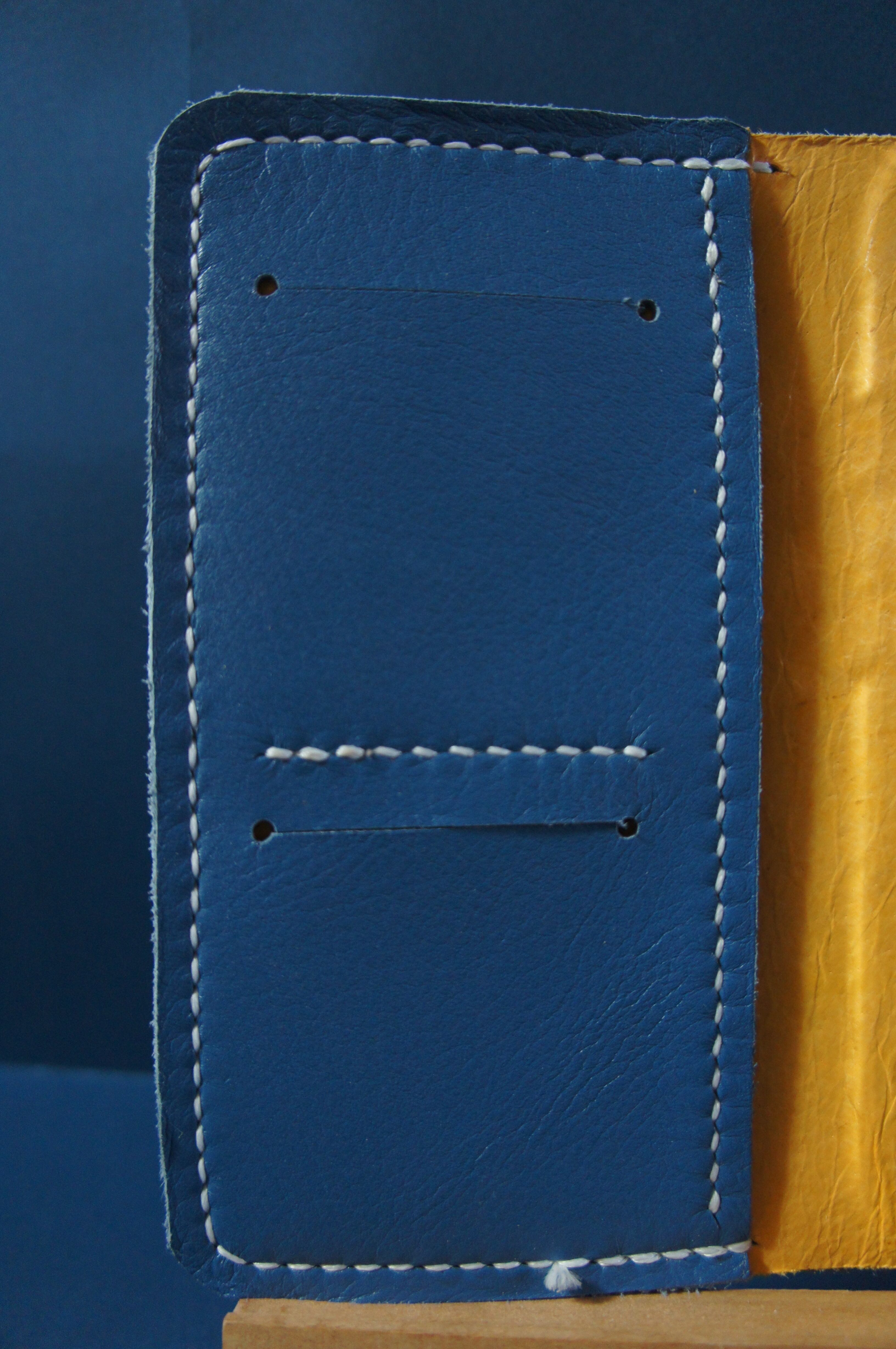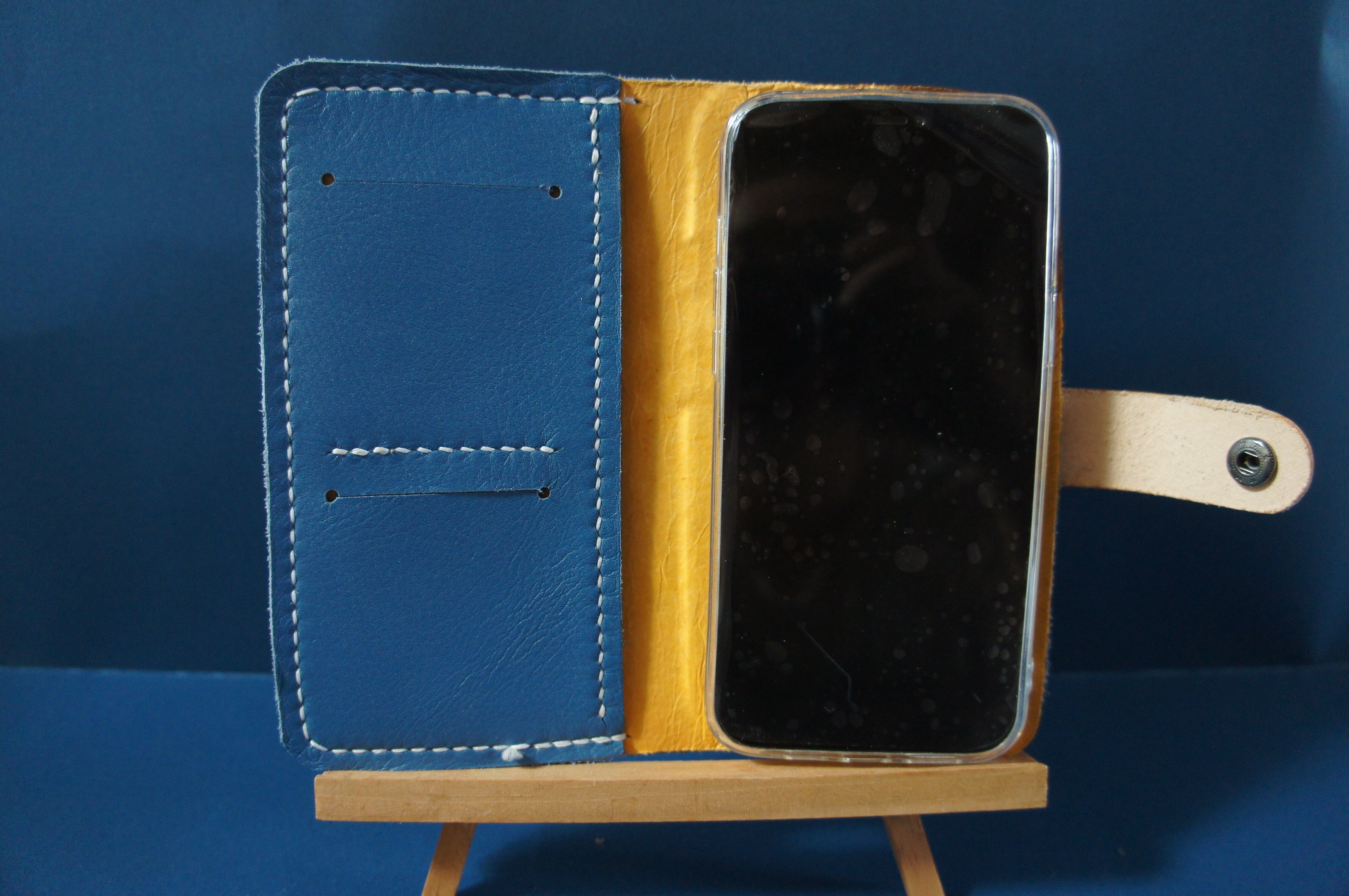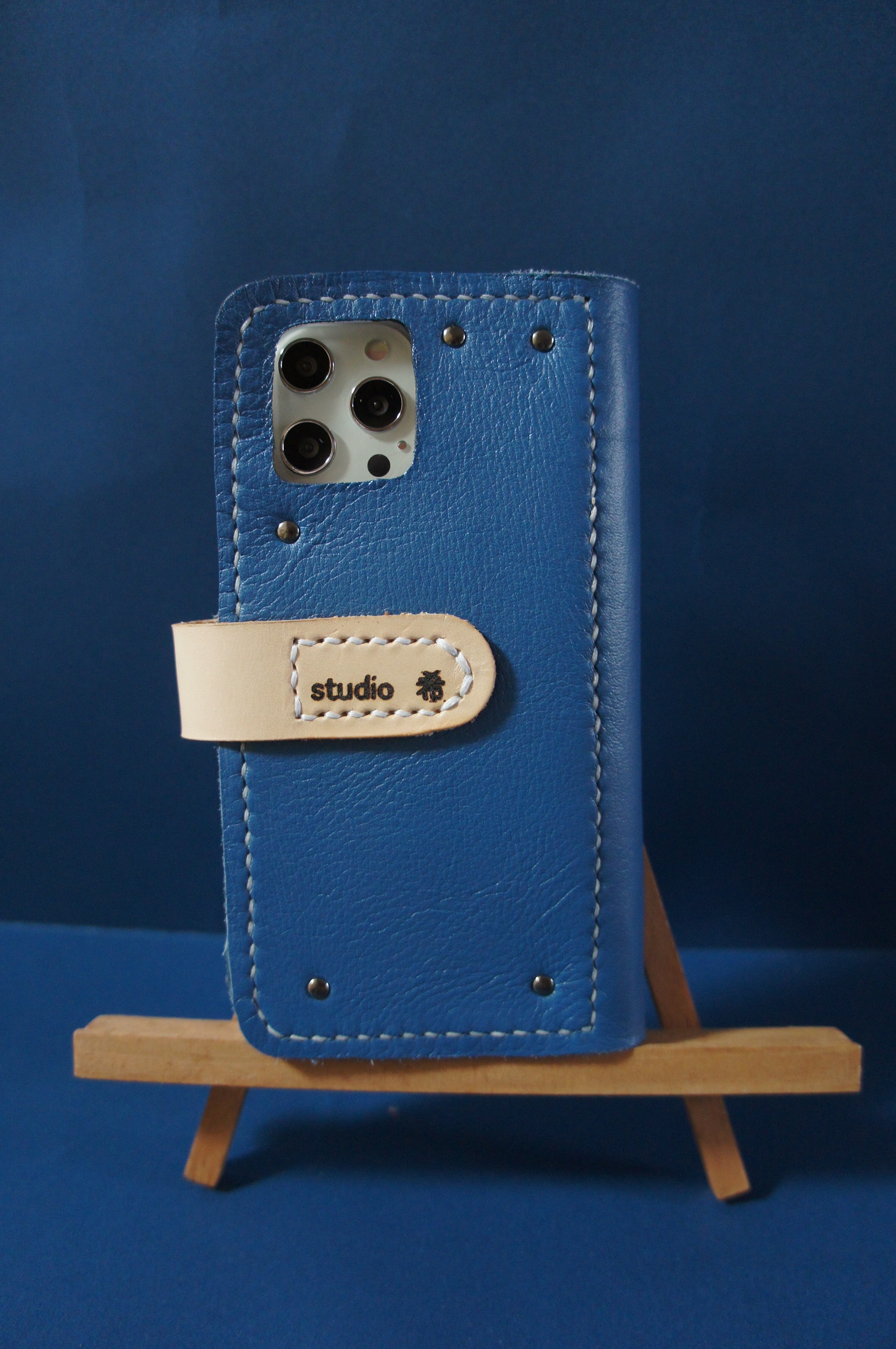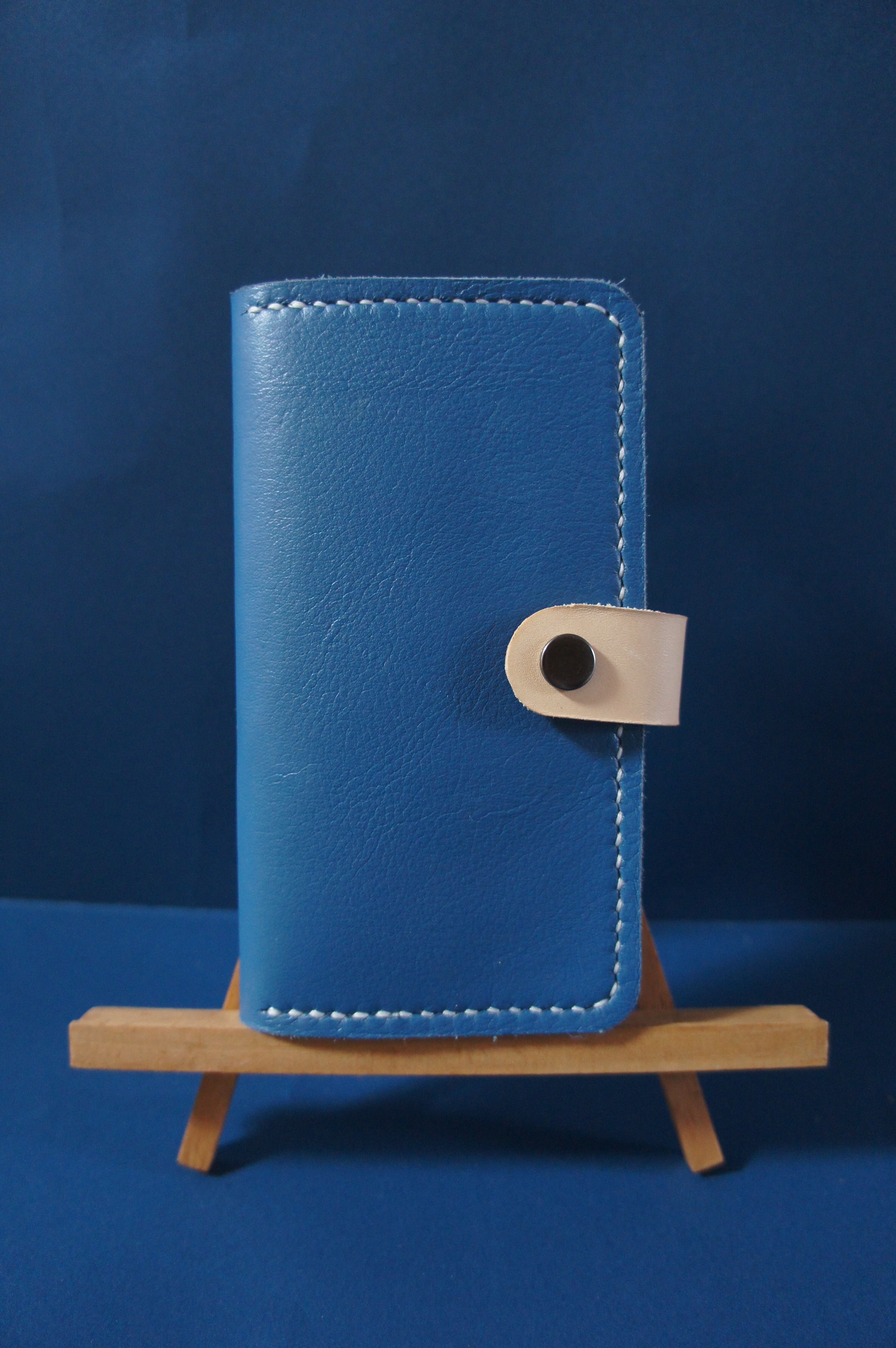 一点物です。iPhone12promax用の手帳型スマートフォンケースです。本体、内側、カードホルダー、ホルダー裏、バックルの合計5枚の革を縫い合わせています。太さ1番の白色の糸ですべて手縫いで仕上げています。2本の針で縫っていますので、ほつれにくい構造になっています。本体は2.0mmの厚さの青色のソフト牛革です。内側には厚さ0.8mmのアメ豚の革を使っています。カードホルダーが2つあります。カードホルダー部分の裏には収納スペースがあります。スマートフォンを固定する部分は、カシメ金具5個で固定してあります。バネホック、金具の色はブロンズです。カメラ穴部分を固くするためには皮革硬化剤を使用しています。貼り付け部分はつるつるに磨いています。