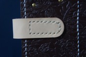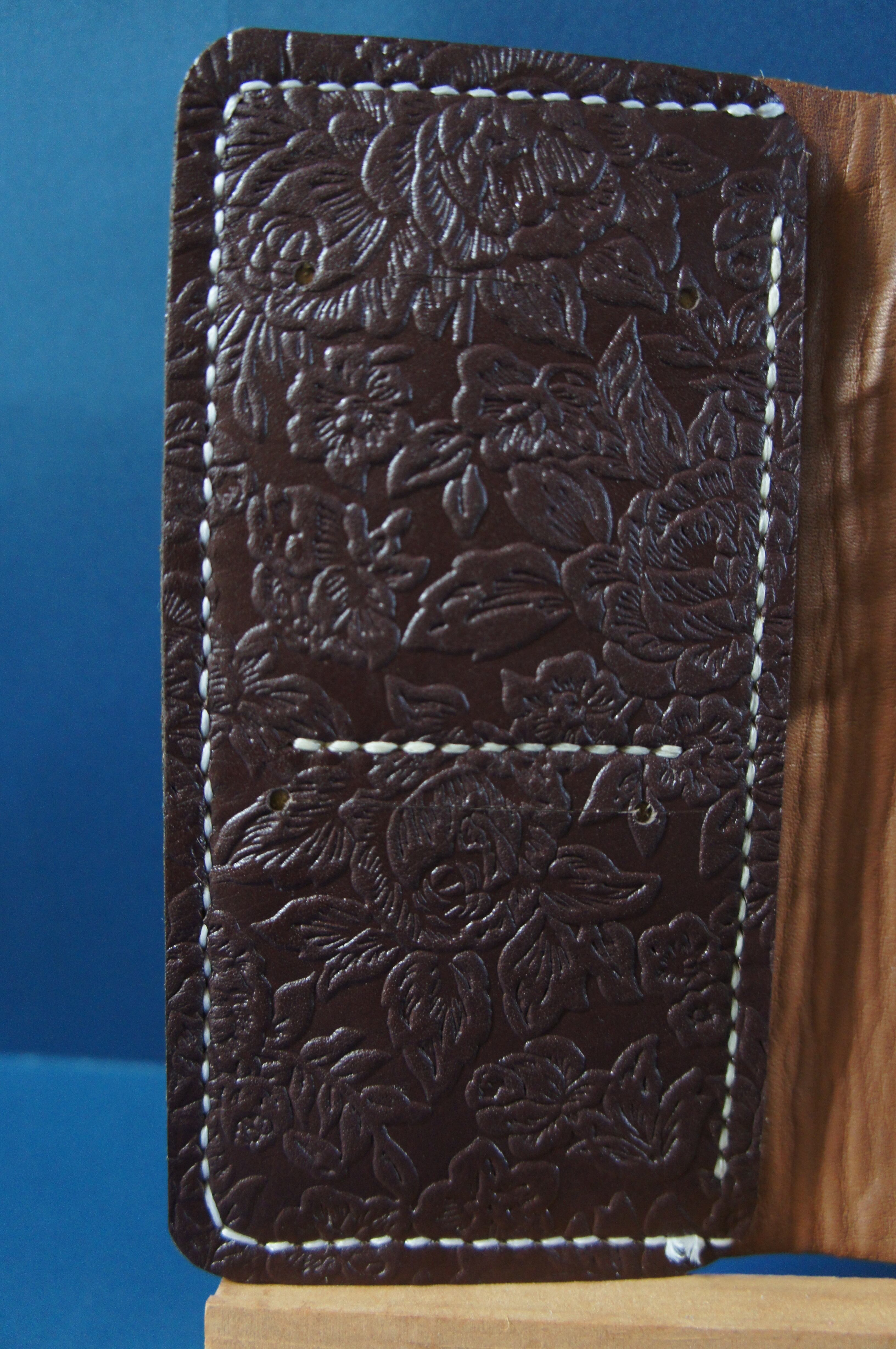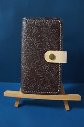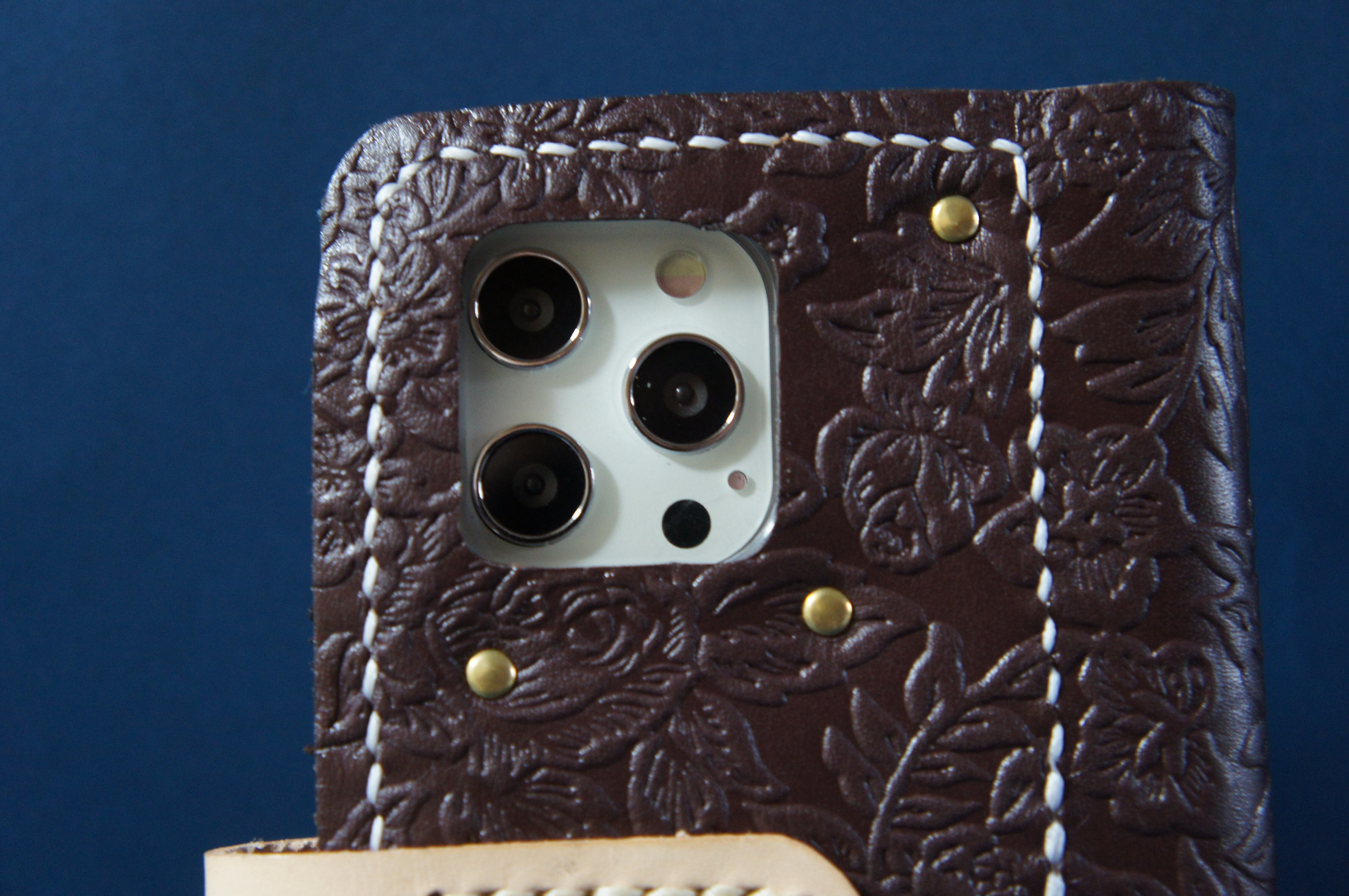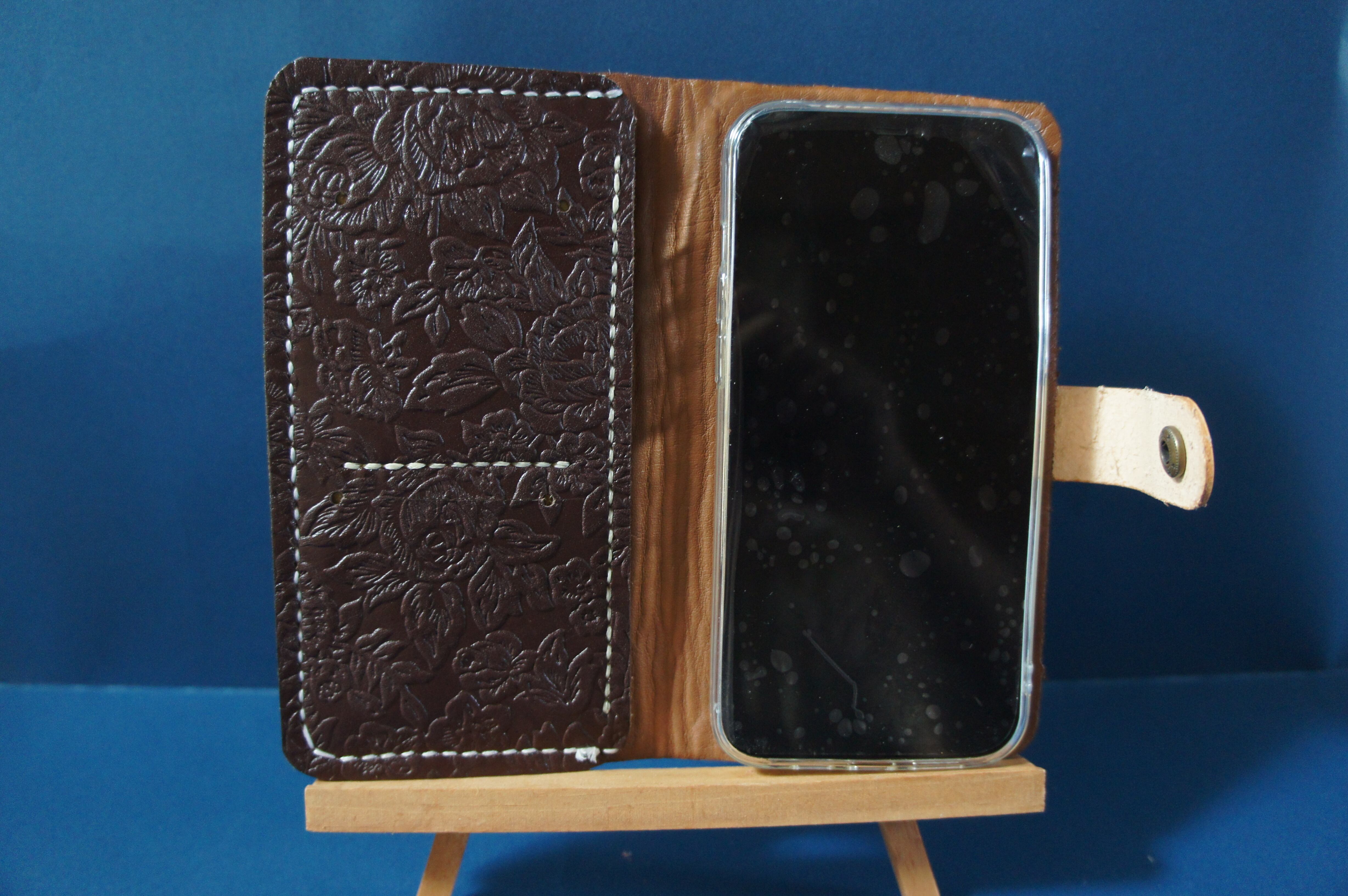 一点物です。iPhone12promax用の手帳型スマートフォンケースです。本体、内側、カードホルダー、ホルダー裏、バックルの合計5枚の革を縫い合わせています。太さ1番の白色の糸ですべて手縫いで仕上げています。2本の針で縫っていますので、ほつれにくい構造になっています。本体は1.5mmの厚さの花柄型押しの茶色の牛革です。内側には厚さ0.8mmの水牛の革を使っています。カードホルダーが2つあります。カードホルダー部分の裏には収納スペースがあります。スマートフォンを固定する部分は、カシメ金具5個で固定してあります。バネホック、金具の色は銅色です。カメラ穴部分を固くするためには皮革硬化剤を使用しています。貼り付け部分はつるつるに磨いています。