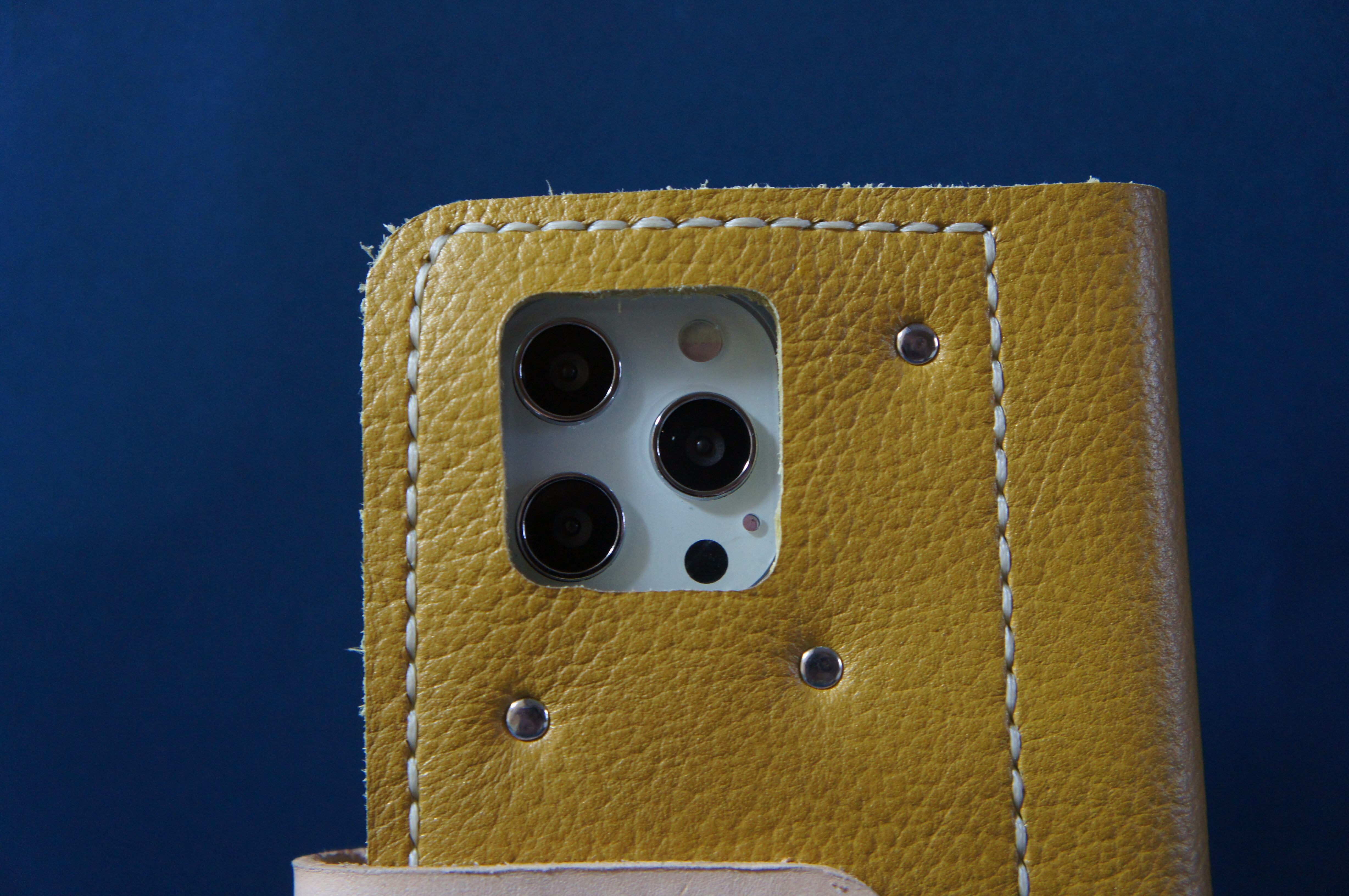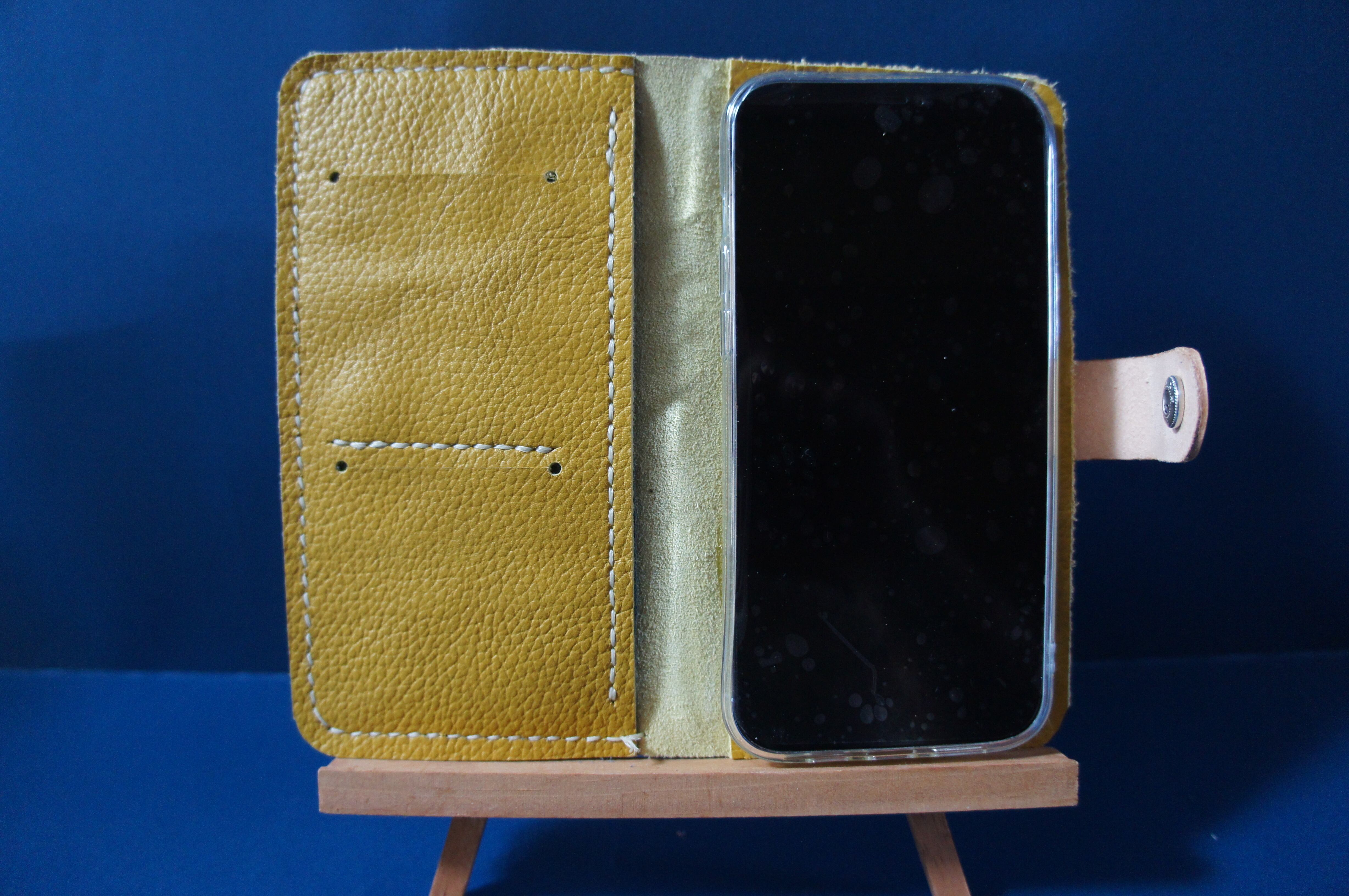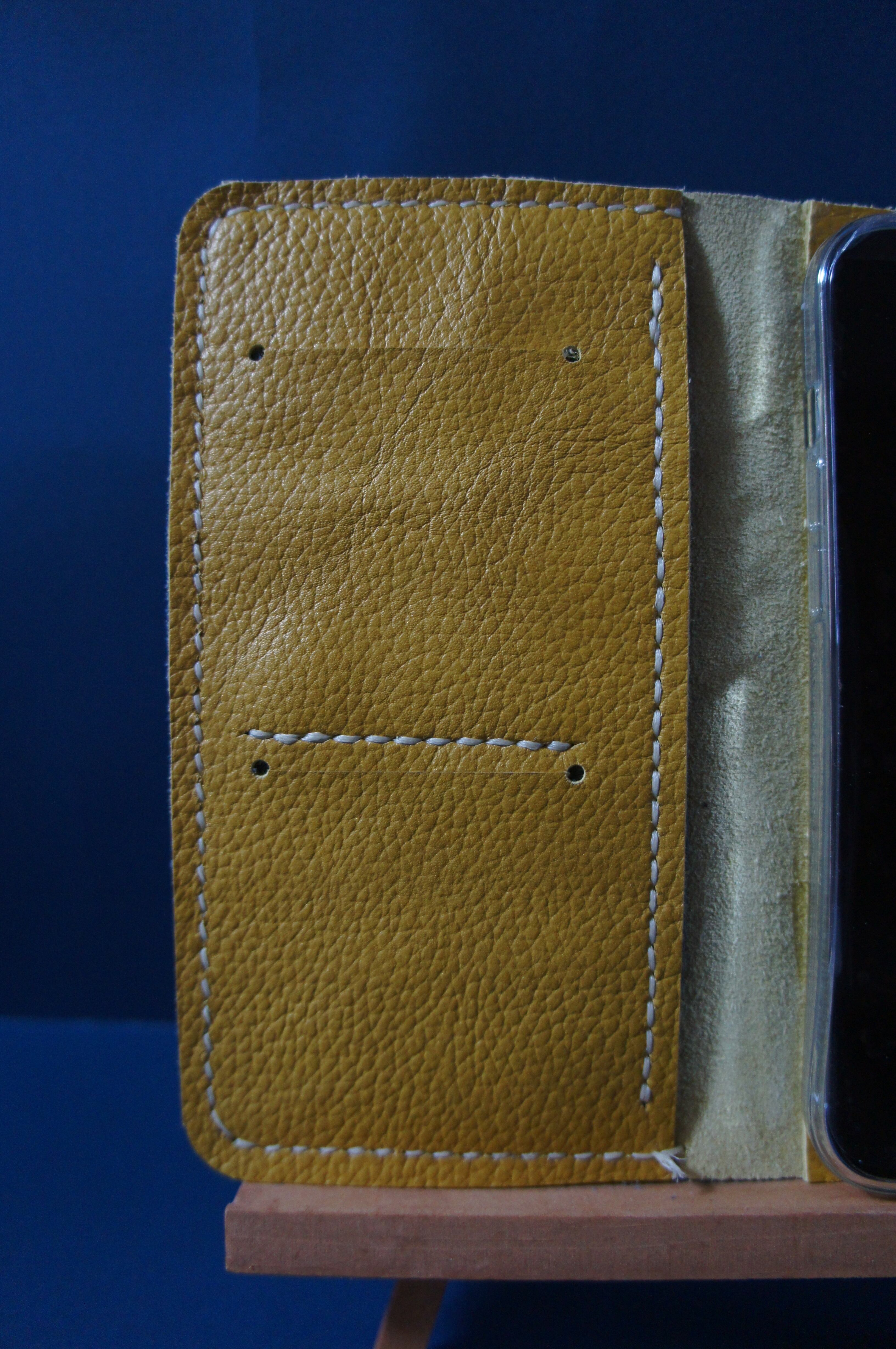 一点物です。iPhone12promax用の手帳型スマートフォンケースです。本体、内側、カードホルダー、ホルダー裏、バックルの合計5枚の革を縫い合わせています。太さ1番の黒色の糸ですべて手縫いで仕上げています。2本の針で縫っていますので、ほつれにくい構造になっています。本体は2.0mmの厚さの黄土色のソフトシュリンクの牛革です。内側にも同じ革を使っています。カードホルダーが2つあります。カードホルダー部分の裏には収納スペースがあります。スマートフォンを固定する部分は、カシメ金具5個で固定してあります。バネホック、金具の色は銀色です。カメラ穴部分を固くするためには皮革硬化剤を使用しています。貼り付け部分はつるつるに磨いています。