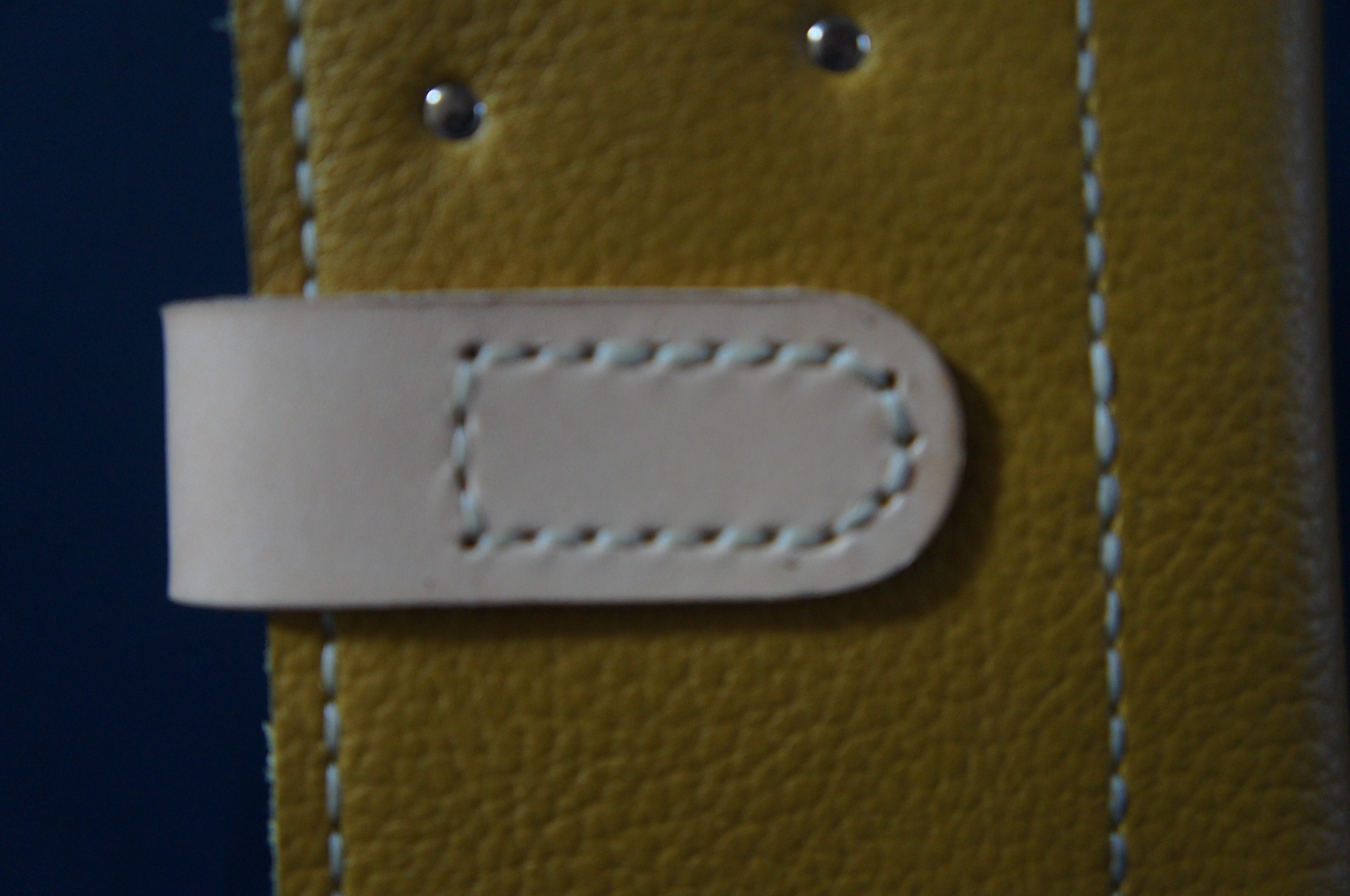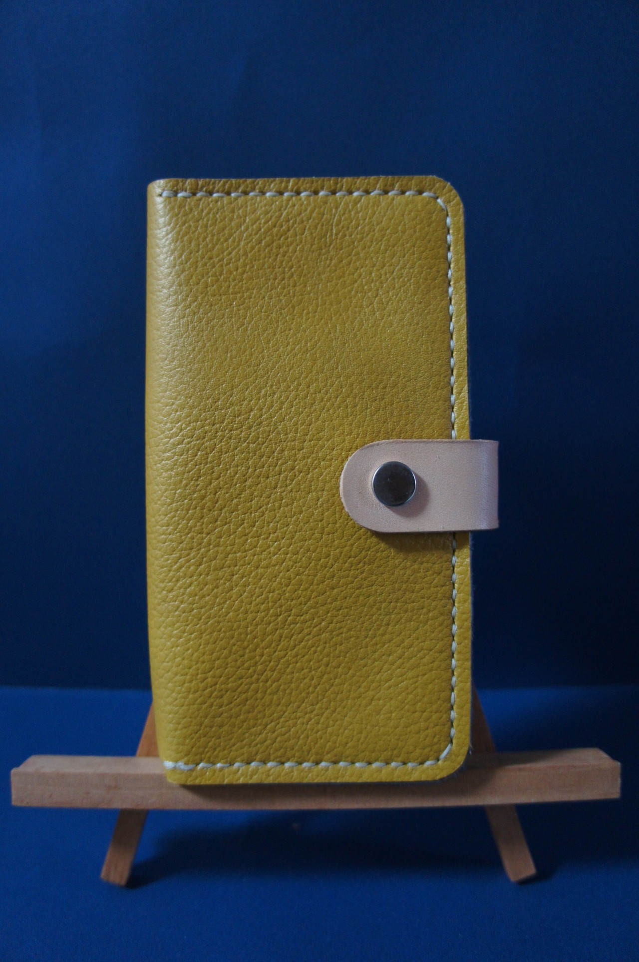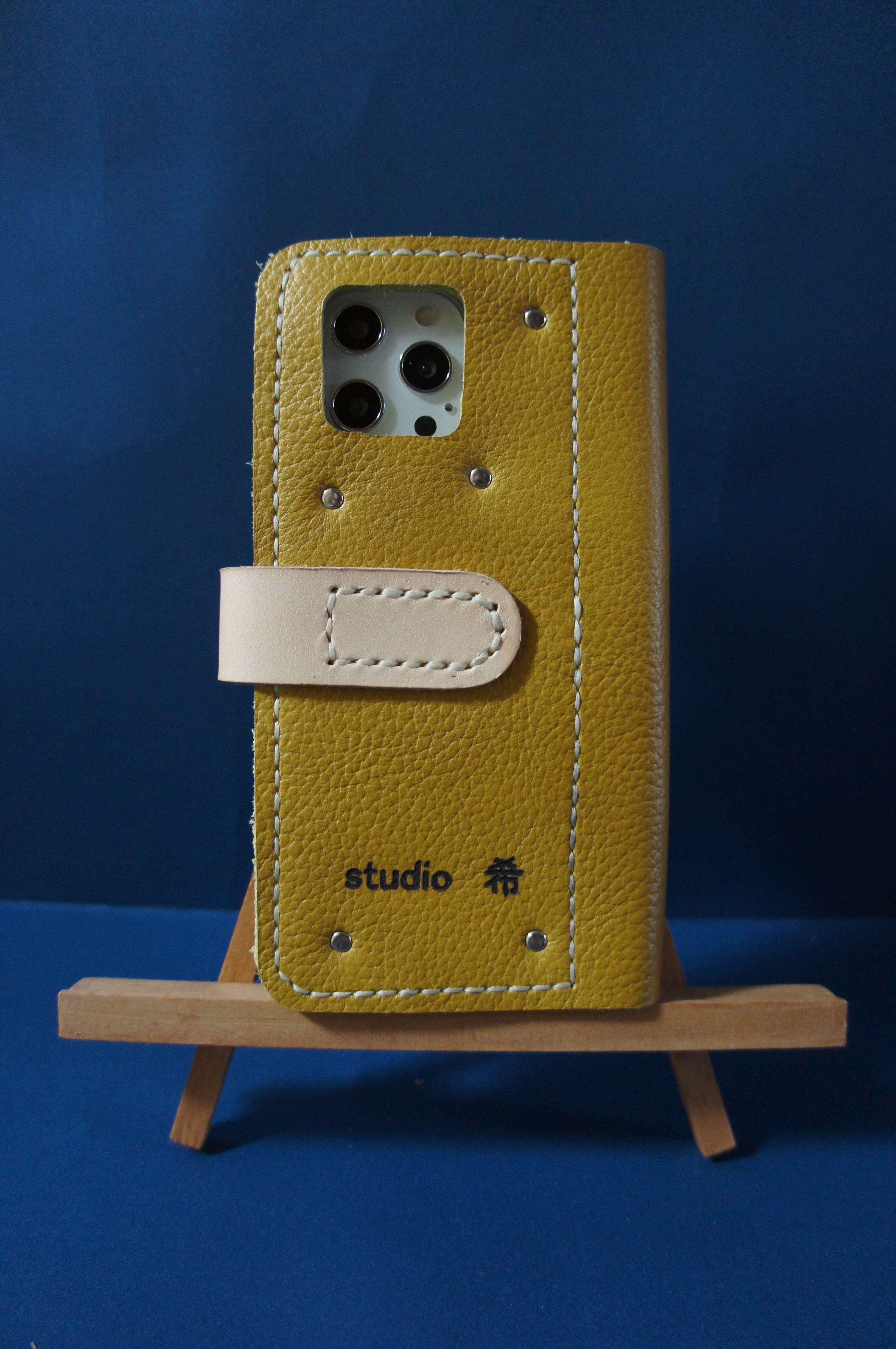 一点物です。iPhone12promax用の手帳型スマートフォンケースです。本体、内側、カードホルダー、ホルダー裏、バックルの合計5枚の革を縫い合わせています。太さ1番の黒色の糸ですべて手縫いで仕上げています。2本の針で縫っていますので、ほつれにくい構造になっています。本体は2.0mmの厚さの黄土色のソフトシュリンクの牛革です。内側にも同じ革を使っています。カードホルダーが2つあります。カードホルダー部分の裏には収納スペースがあります。スマートフォンを固定する部分は、カシメ金具5個で固定してあります。バネホック、金具の色は銀色です。カメラ穴部分を固くするためには皮革硬化剤を使用しています。貼り付け部分はつるつるに磨いています。