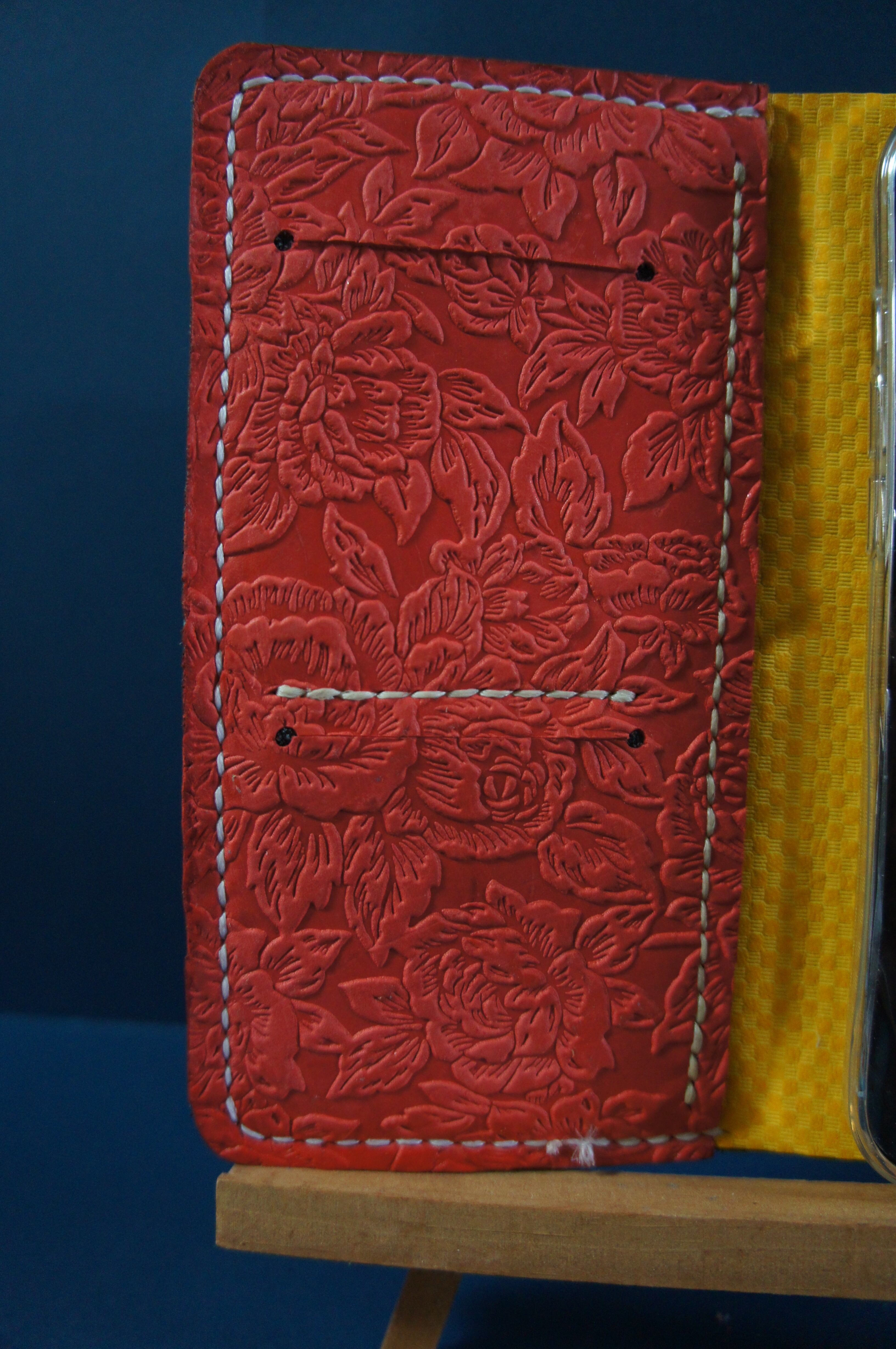 一点物です。iPhone12promax用の手帳型スマートフォンケースです。本体、内側、カードホルダー、ホルダー裏、バックルの合計5枚の革を縫い合わせています。太さ1番の白色の糸ですべて手縫いで仕上げています。2本の針で縫っていますので、ほつれにくい構造になっています。本体は1.5mmの厚さの星形型押しの赤色の牛革です。内側には厚さ1.0mmの黄色の牛革を使っています。カードホルダーが2つあります。カードホルダー部分の裏には収納スペースがあります。スマートフォンを固定する部分は、カシメ金具5個で固定してあります。バネホック、金具の色はブロンズです。カメラ穴部分を固くするためには皮革硬化剤を使用しています。貼り付け部分はつるつるに磨いています。