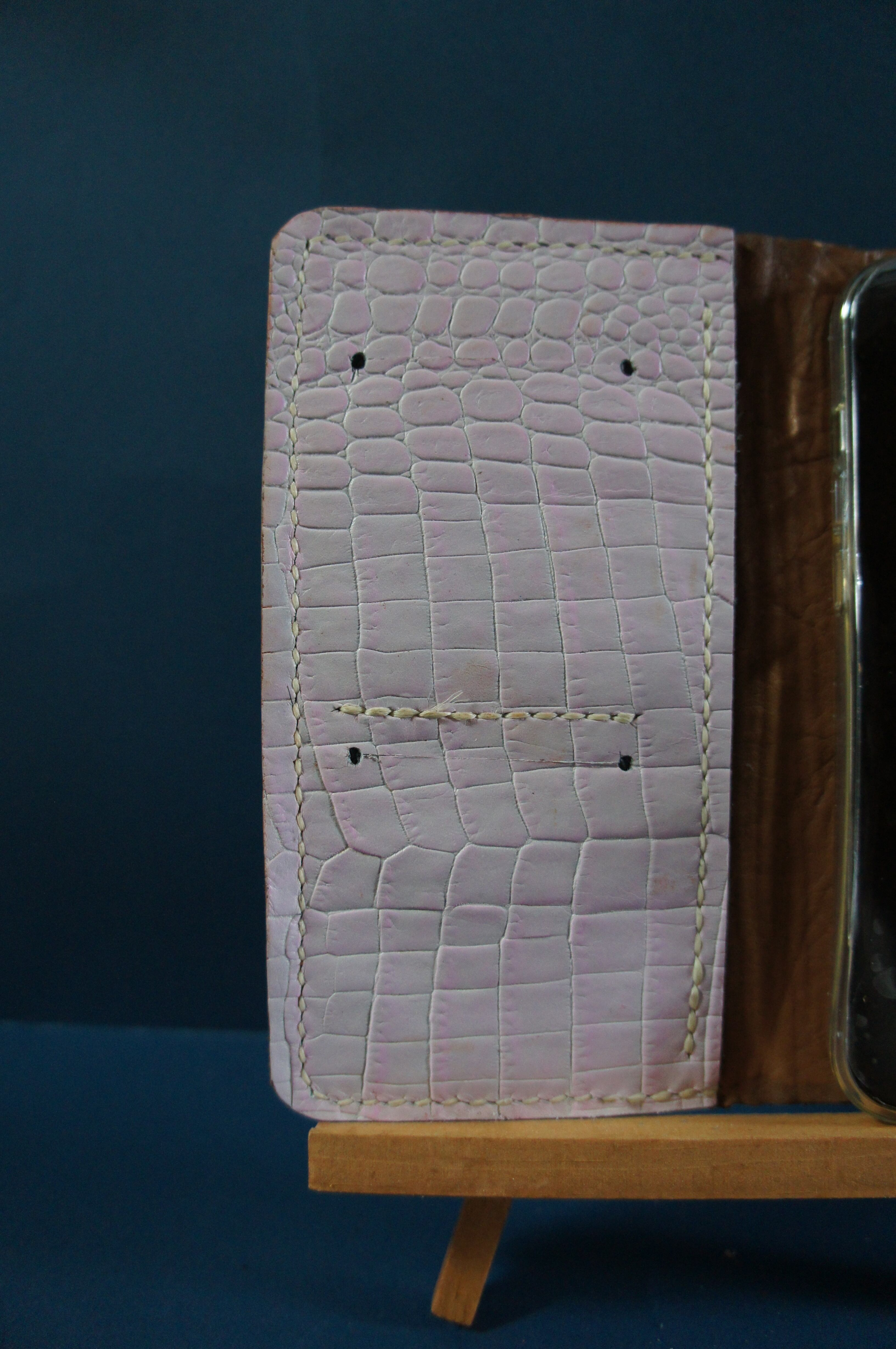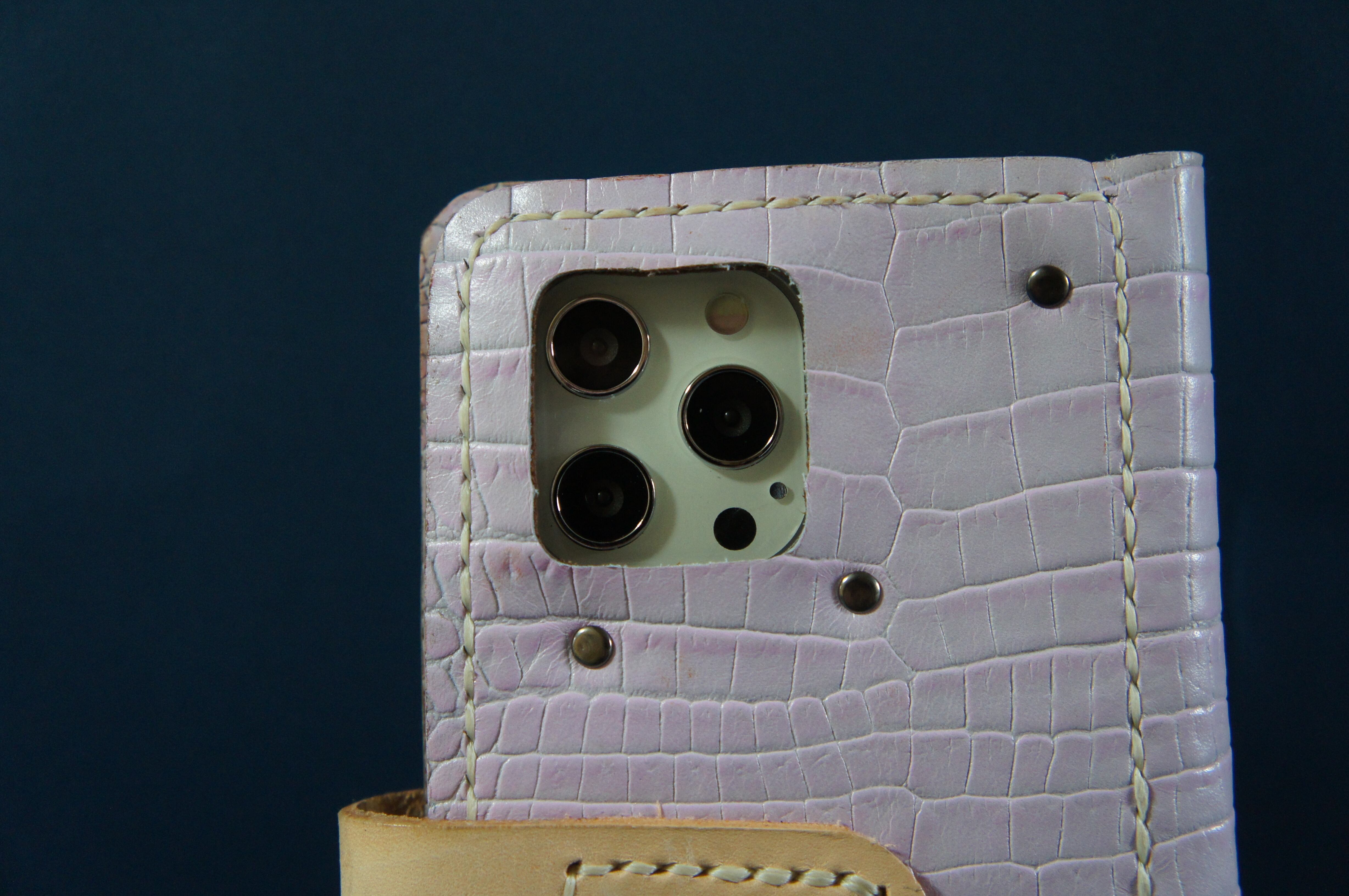 一点物です。iPhone12promax用の手帳型スマートフォンケースです。本体、内側、カードホルダー、ホルダー裏、バックルの合計5枚の革を縫い合わせています。太さ1番の白色の糸ですべて手縫いで仕上げています。2本の針で縫っていますので、ほつれにくい構造になっています。本体は1.5mmの厚さのトカゲ型押しのピンク色の牛革です。内側には厚さ0.8mmの水牛の革を使っています。カードホルダーが2つあります。カードホルダー部分の裏には収納スペースがあります。スマートフォンを固定する部分は、カシメ金具5個で固定してあります。バネホック、金具の色はブロンズです。カメラ穴部分を固くするためには皮革硬化剤を使用しています。貼り付け部分はつるつるに磨いています。