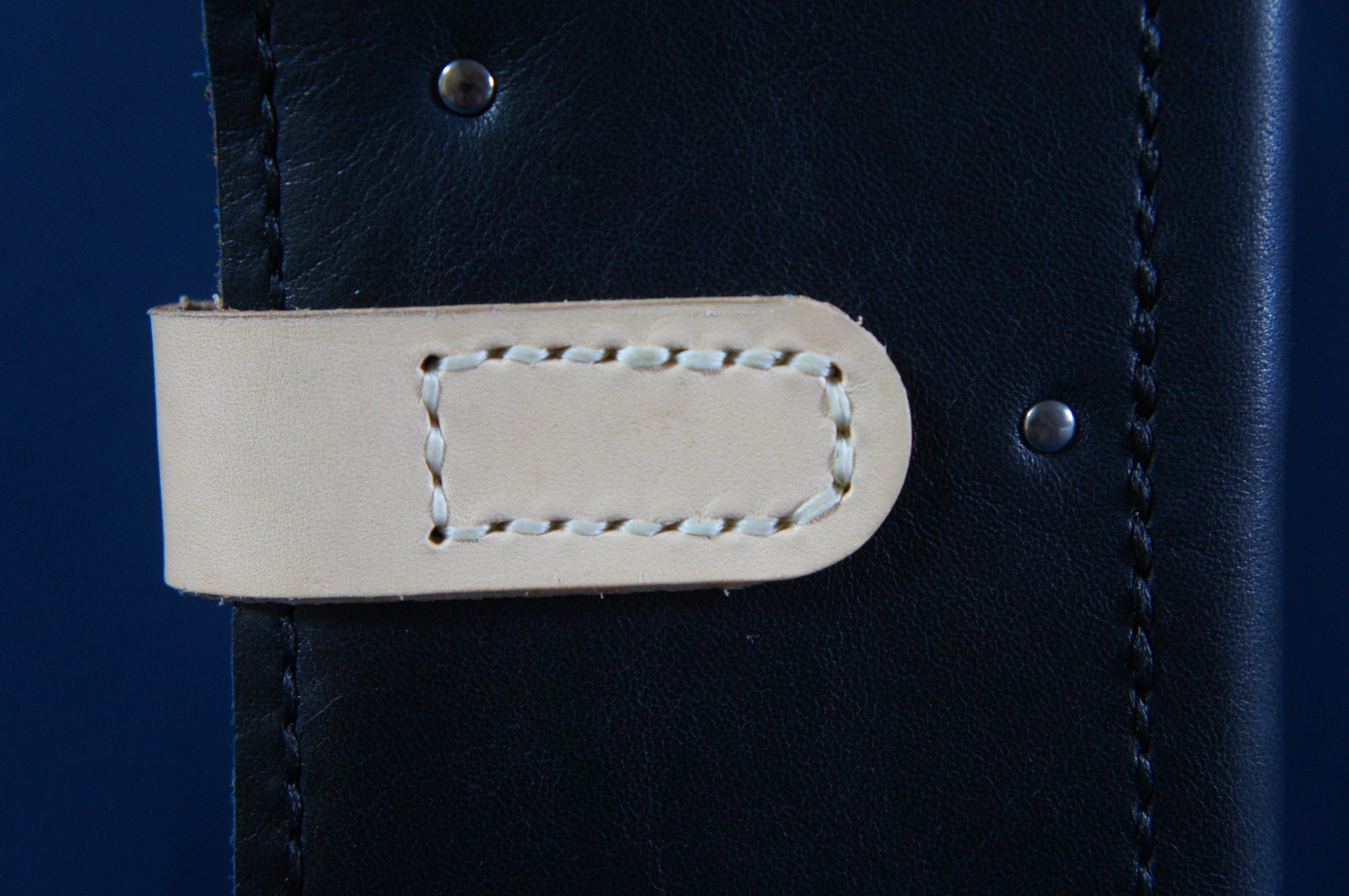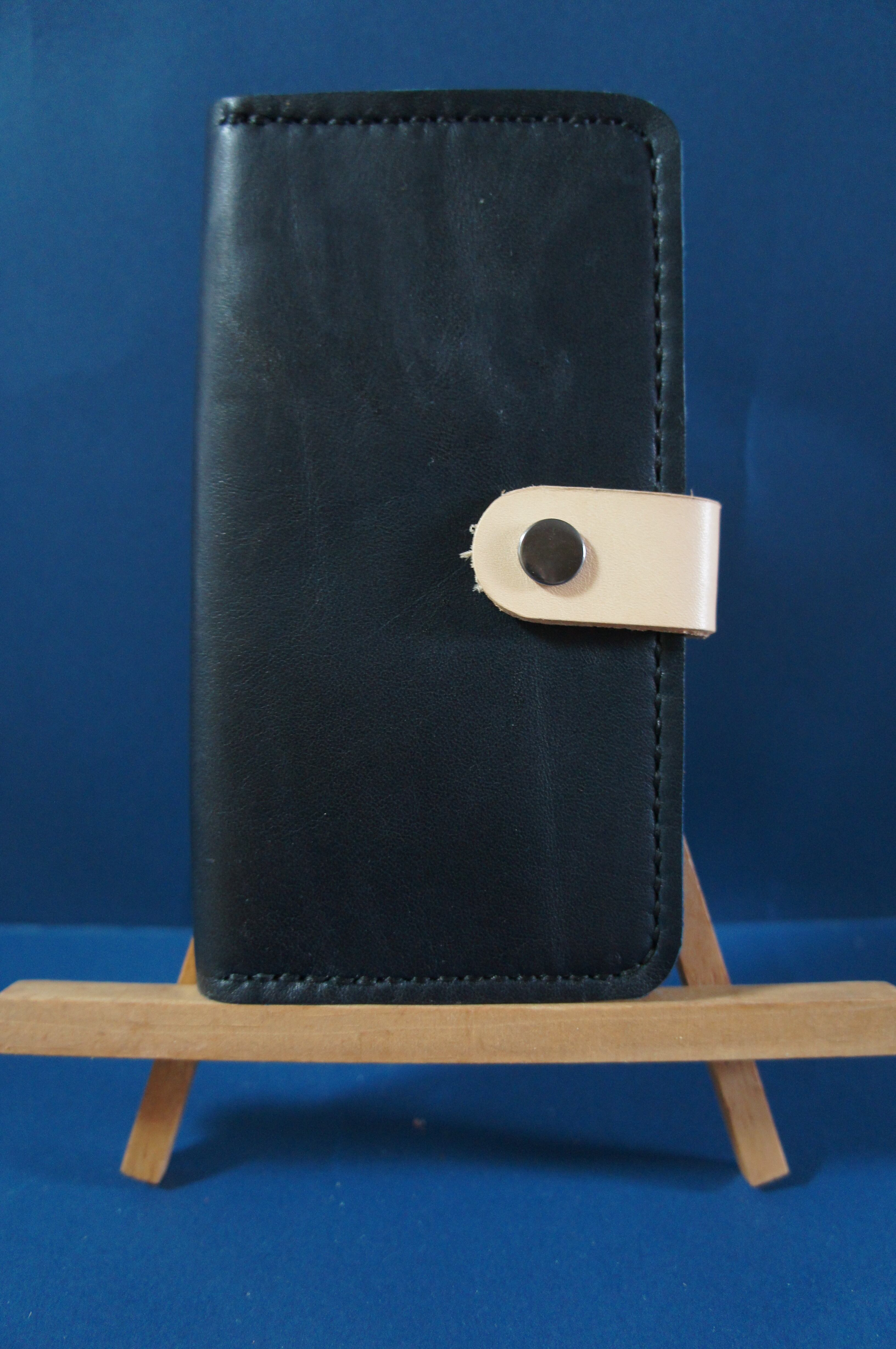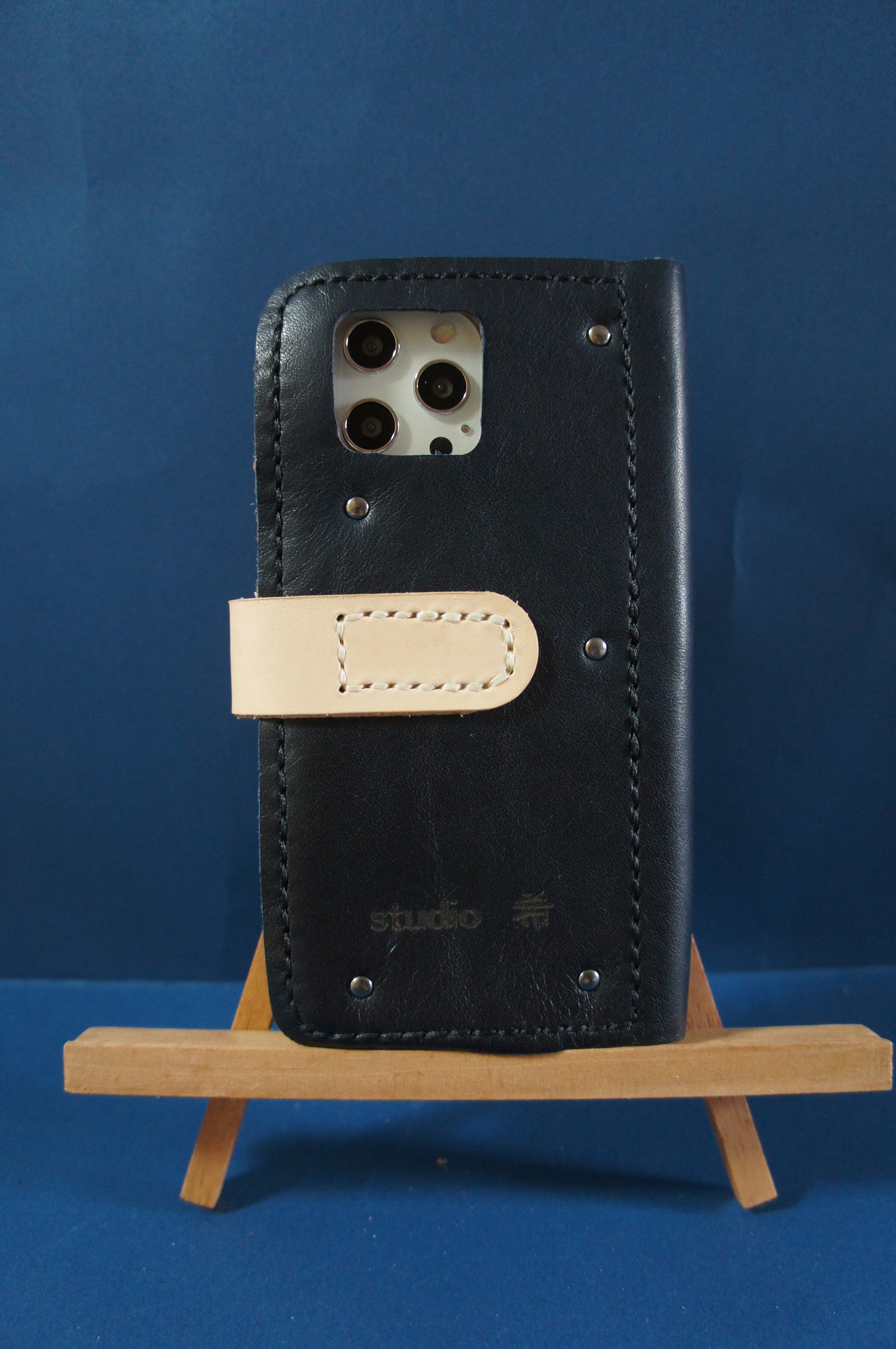 一点物です。iPhone12promax用の手帳型スマートフォンケースです。本体、内側、カードホルダー、ホルダー裏、バックルの合計5枚の革を縫い合わせています。太さ1番の黒色の糸ですべて手縫いで仕上げています。2本の針で縫っていますので、ほつれにくい構造になっています。本体は1.5mmの厚さの黒色のソフト牛革です。内側には厚さ0.8mmの水牛の革を使っています。カードホルダーが2つあります。カードホルダー部分の裏には収納スペースがあります。スマートフォンを固定する部分は、カシメ金具5個で固定してあります。バネホック、金具の色はブロンズです。カメラ穴部分を固くするためには皮革硬化剤を使用しています。貼り付け部分はつるつるに磨いています。