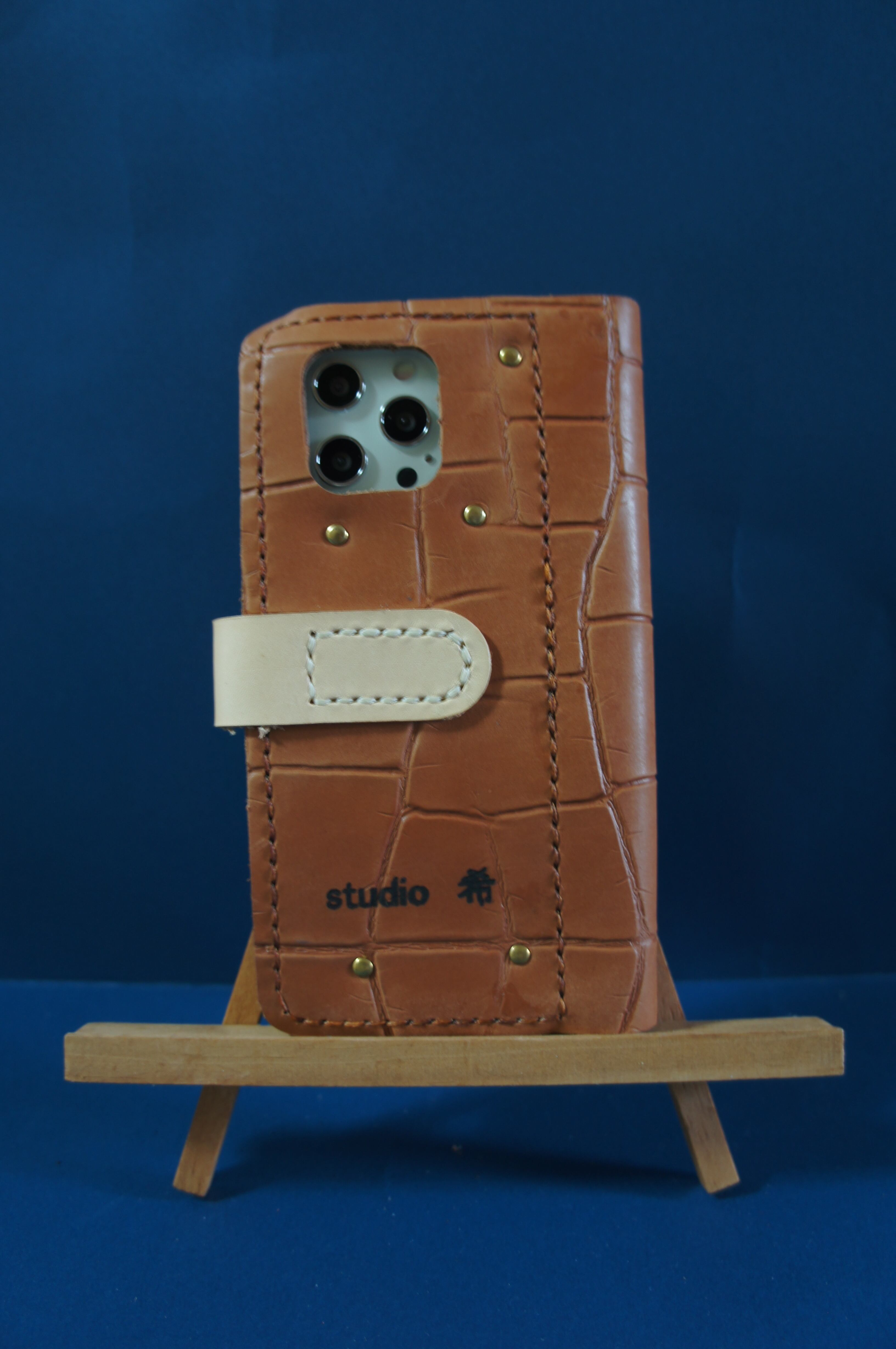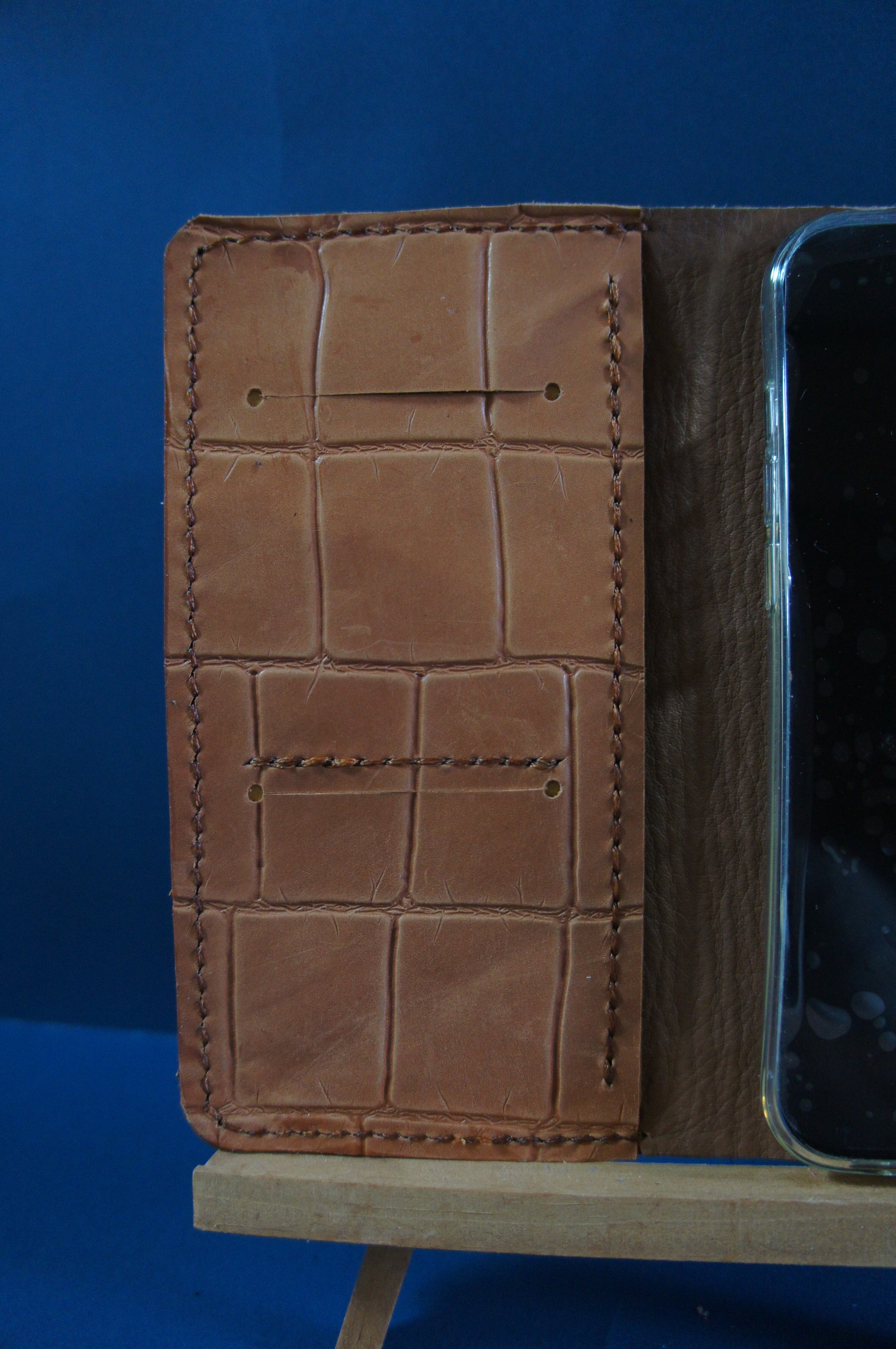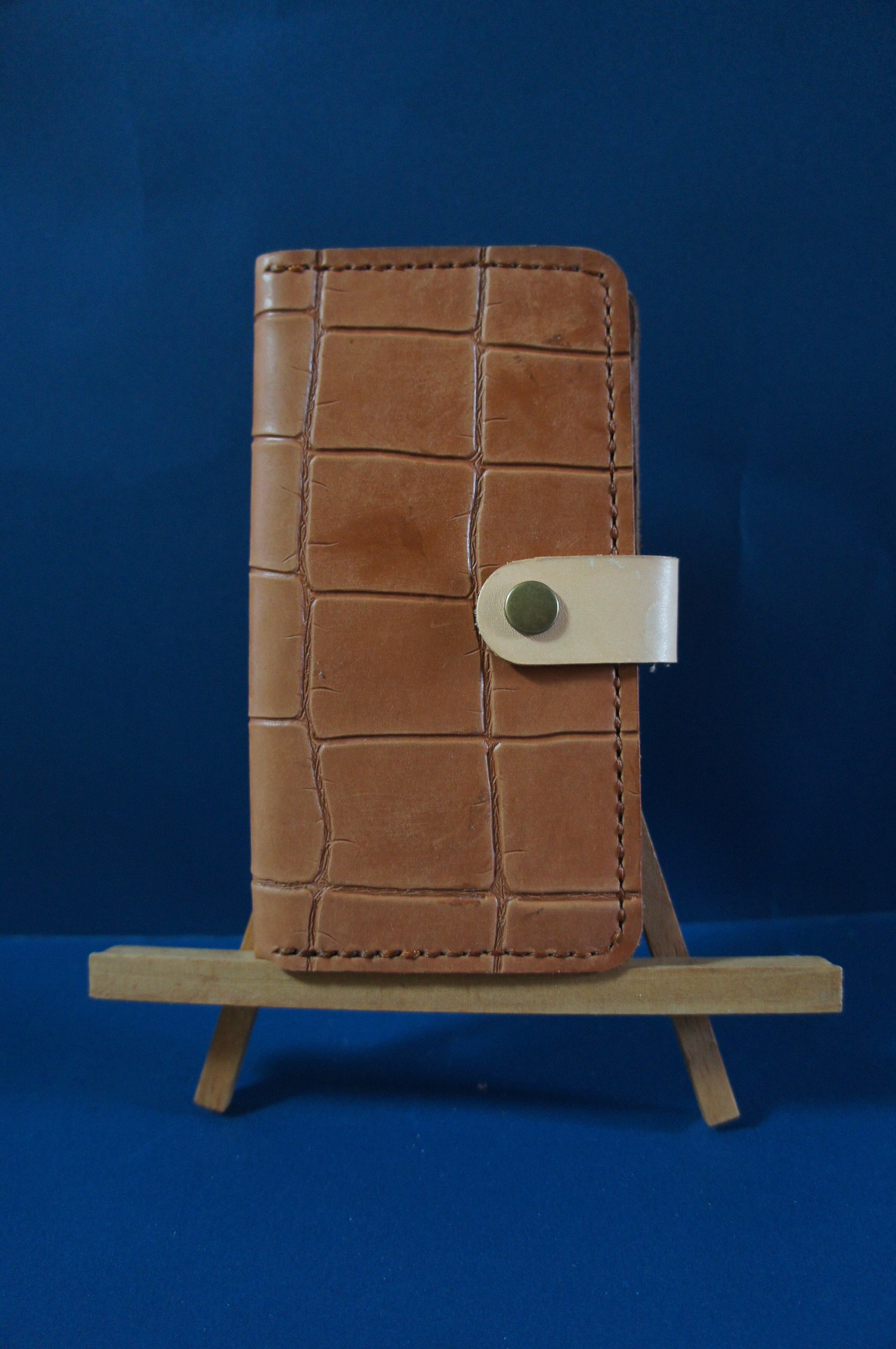 一点物です。iPhone12promax用の手帳型スマートフォンケースです。本体、内側、カードホルダー、ホルダー裏、バックルの合計5枚の革を縫い合わせています。太さ1番の白色の糸ですべて手縫いで仕上げています。2本の針で縫っていますので、ほつれにくい構造になっています。本体は1.5mmの厚さのワニ型押しの茶色の牛革です。内側には厚さ0.8mmの水牛の革を使っています。カードホルダーが2つあります。カードホルダー部分の裏には収納スペースがあります。スマートフォンを固定する部分は、カシメ金具5個で固定してあります。バネホック、金具の色は銅色です。カメラ穴部分を固くするためには皮革硬化剤を使用しています。貼り付け部分はつるつるに磨いています。