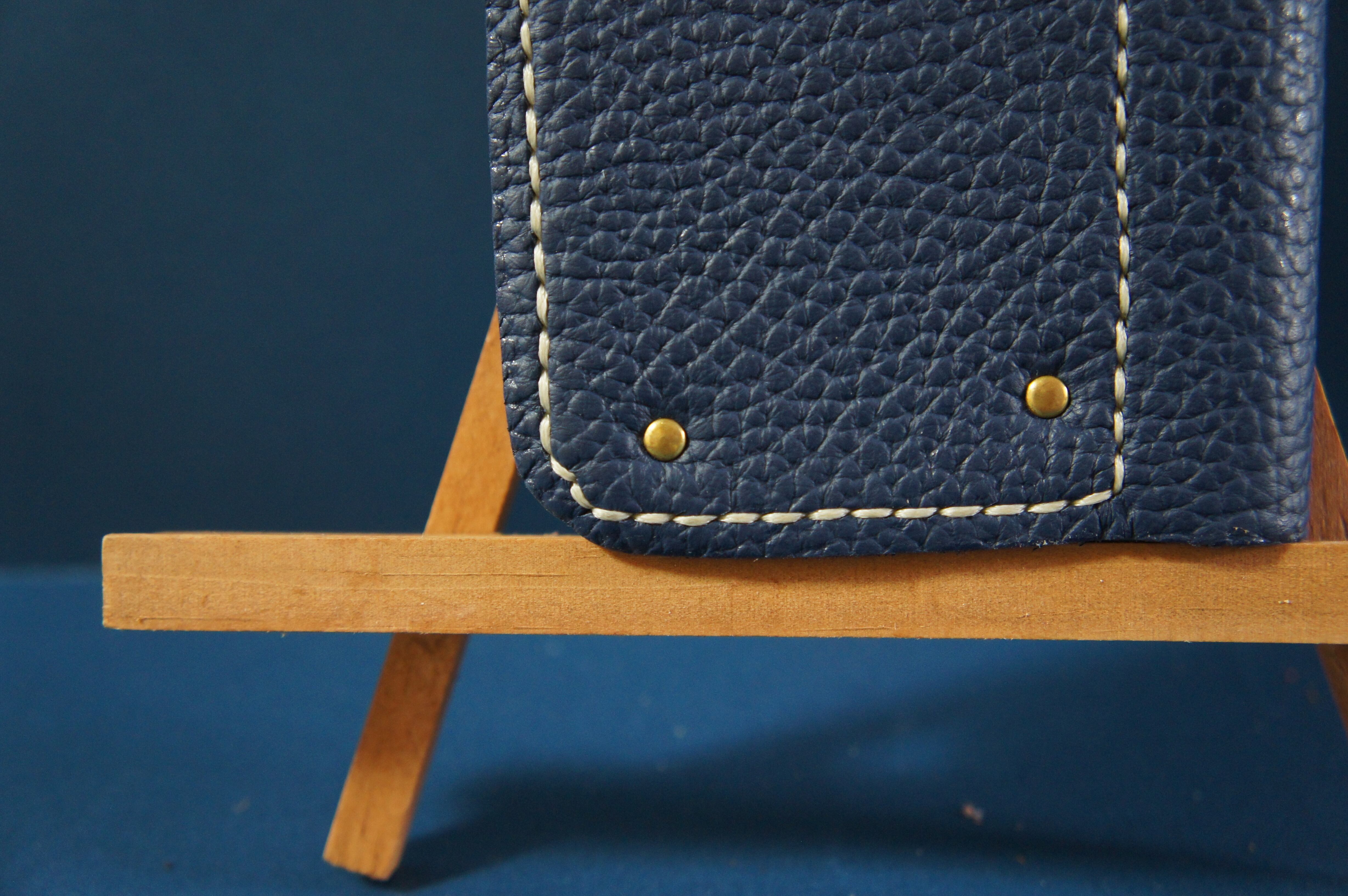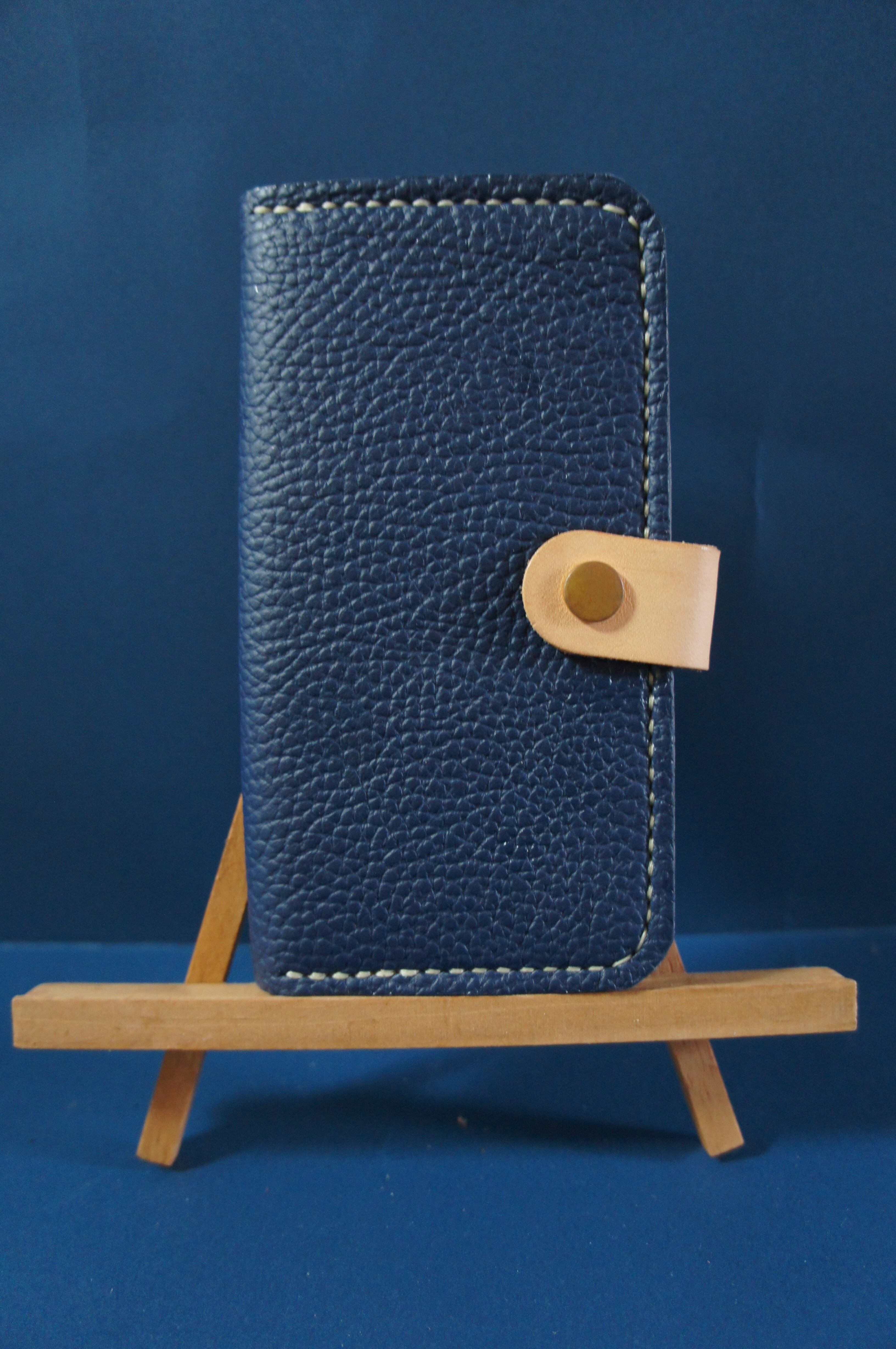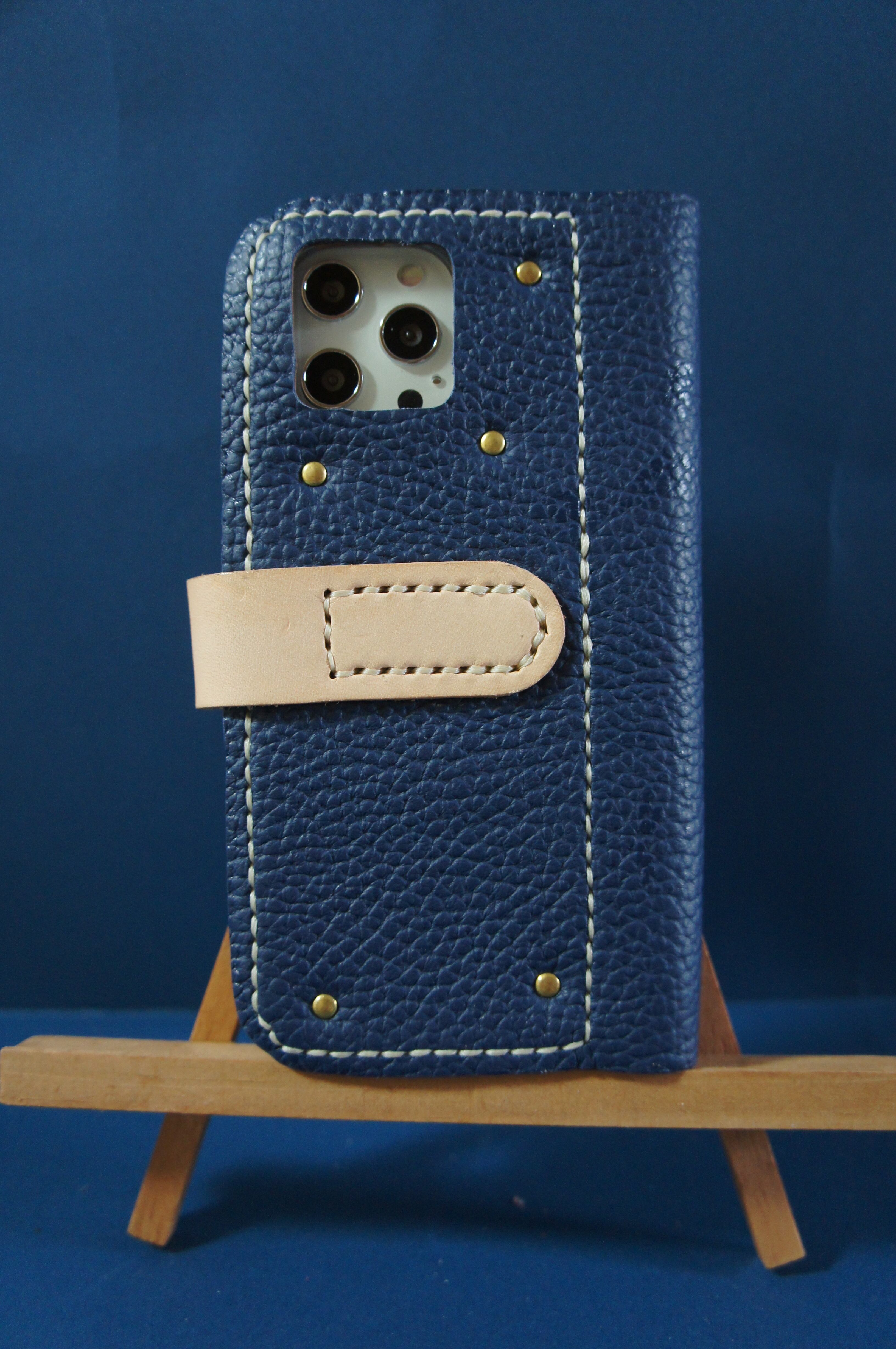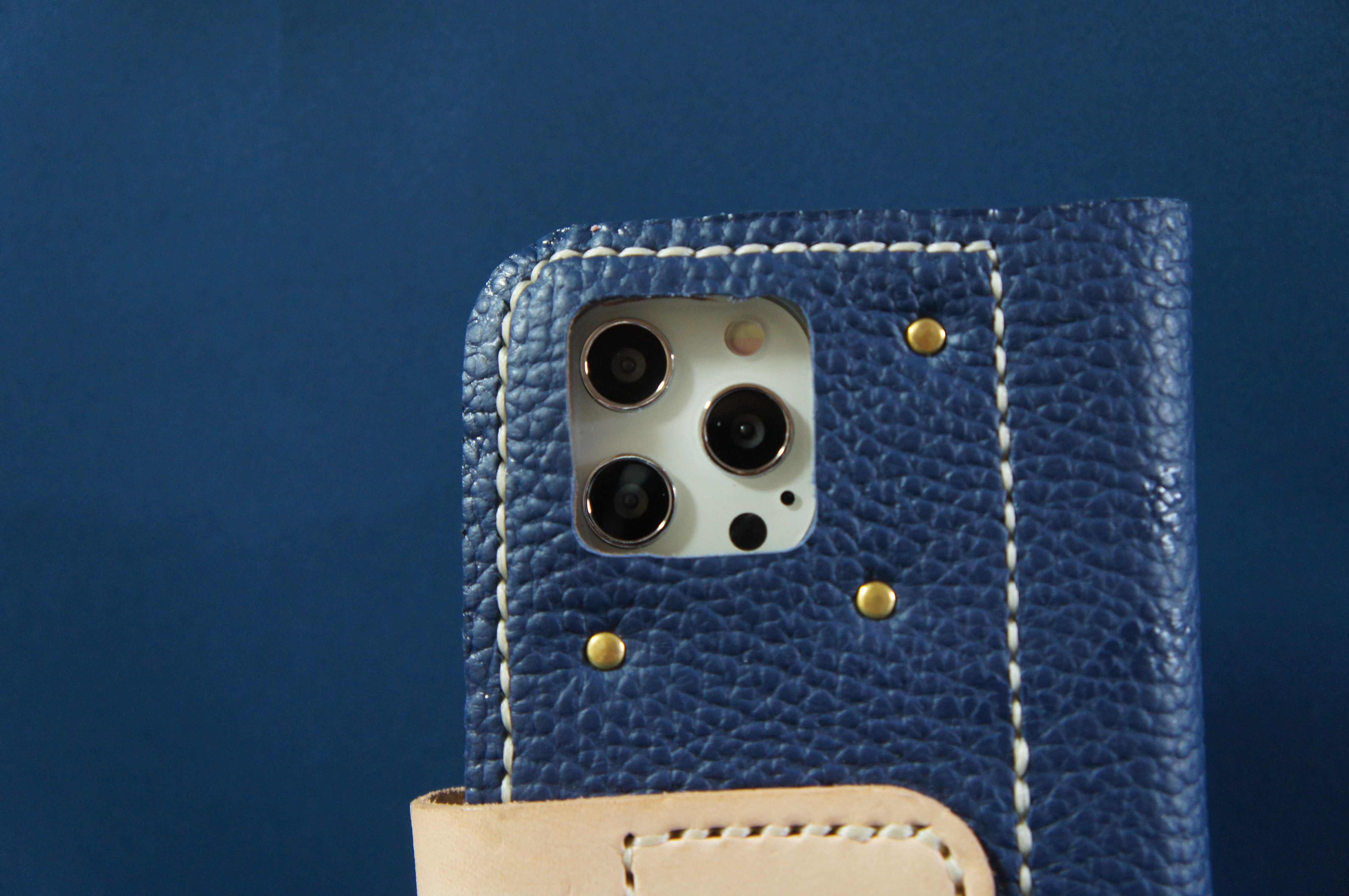 一点物です。iPhone12promax用の手帳型スマートフォンケースです。太さ1番の白色の糸ですべて手縫いで仕上げています。2本の針で縫っていますので、ほつれにくい構造になっています。本体は2.0mmの厚さの紺色のシュリンクの牛革です。内側には厚さ0.8mmの水牛の革を使っています。カードホルダーが2つあります。カードホルダー部分の裏には収納スペースがあります。スマートフォンを固定する部分は、カシメ金具5個で固定してあります。バネホック、金具の色は銅色です。カメラ穴部分を固くするためには皮革硬化剤を使用しています。貼り付け部分はつるつるに磨いています。