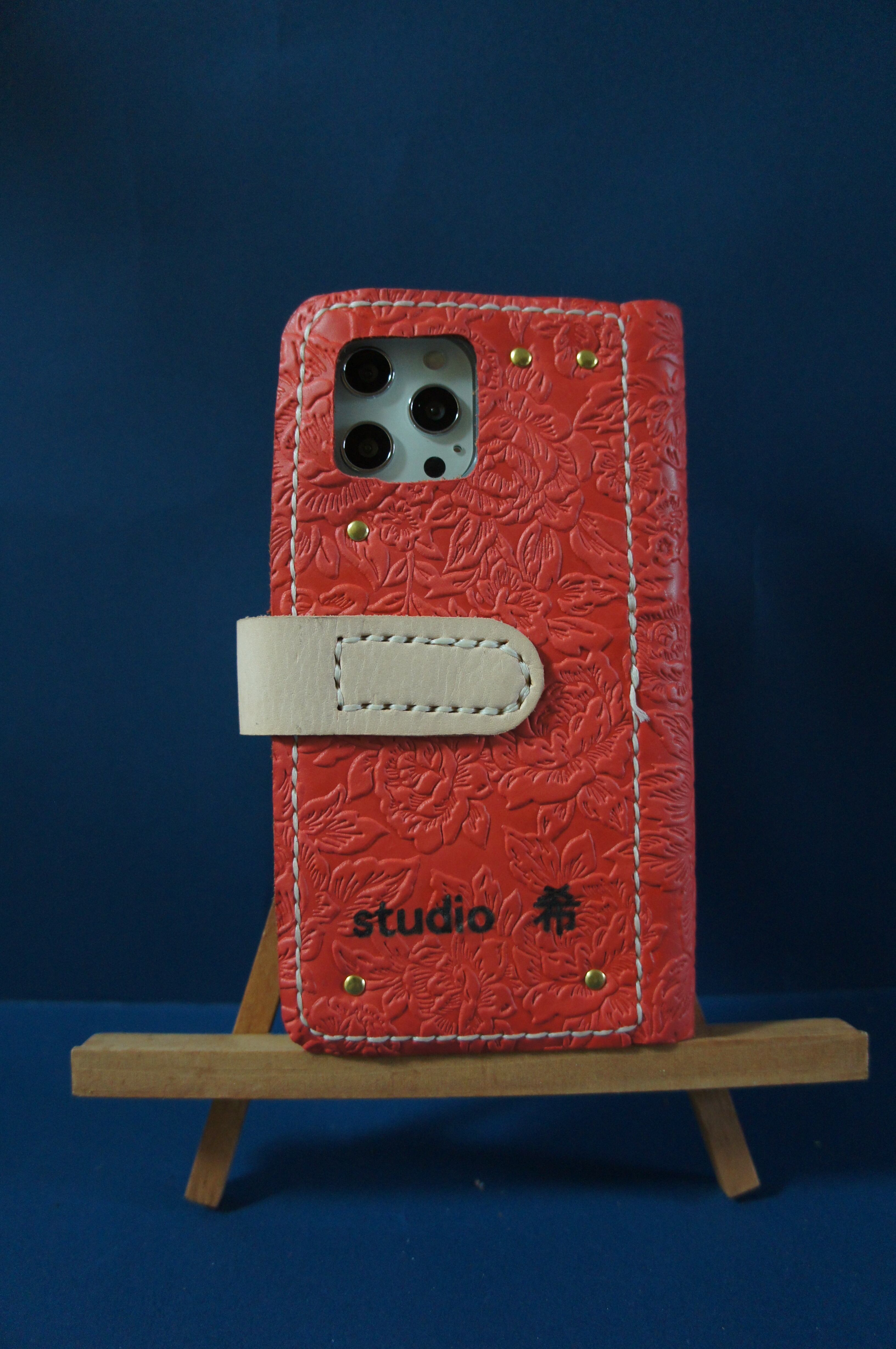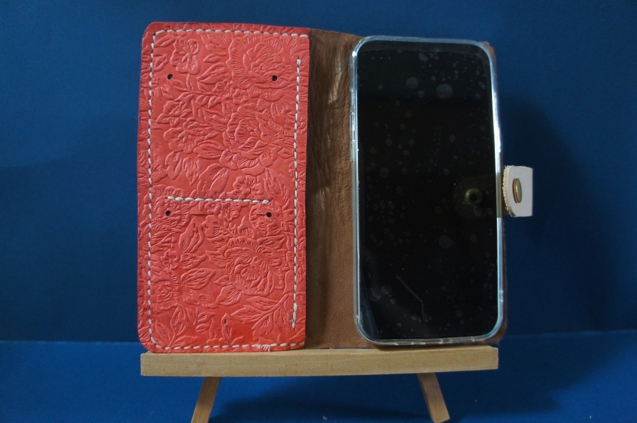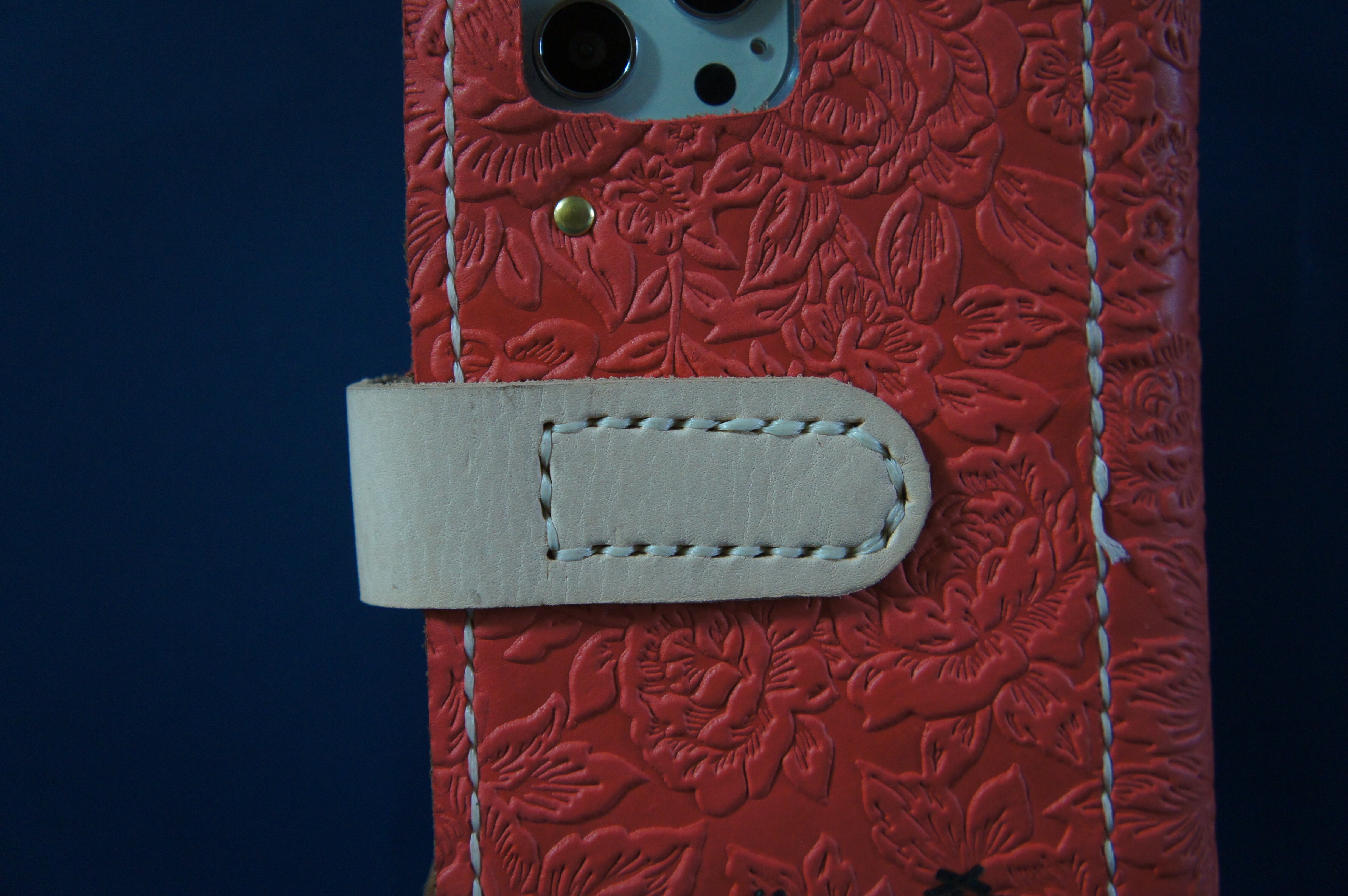 一点物です。iPhone12promax用の手帳型スマートフォンケースです。太さ1番の白色の糸ですべて手縫いで仕上げています。2本の針で縫っていますので、ほつれにくい構造になっています。本体は1.2mmの厚さの花柄型押しの朱色の牛革です。内側には厚さ0.8mmの水牛の革を使っています。カードホルダーが2つあります。カードホルダー部分の裏には収納スペースがあります。スマートフォンを固定する部分は、カシメ金具4個で固定してあります。バネホック、金具の色は金色です。カメラ穴部分を固くするためには皮革硬化剤を使用しています。貼り付け部分はつるつるに磨いています。
