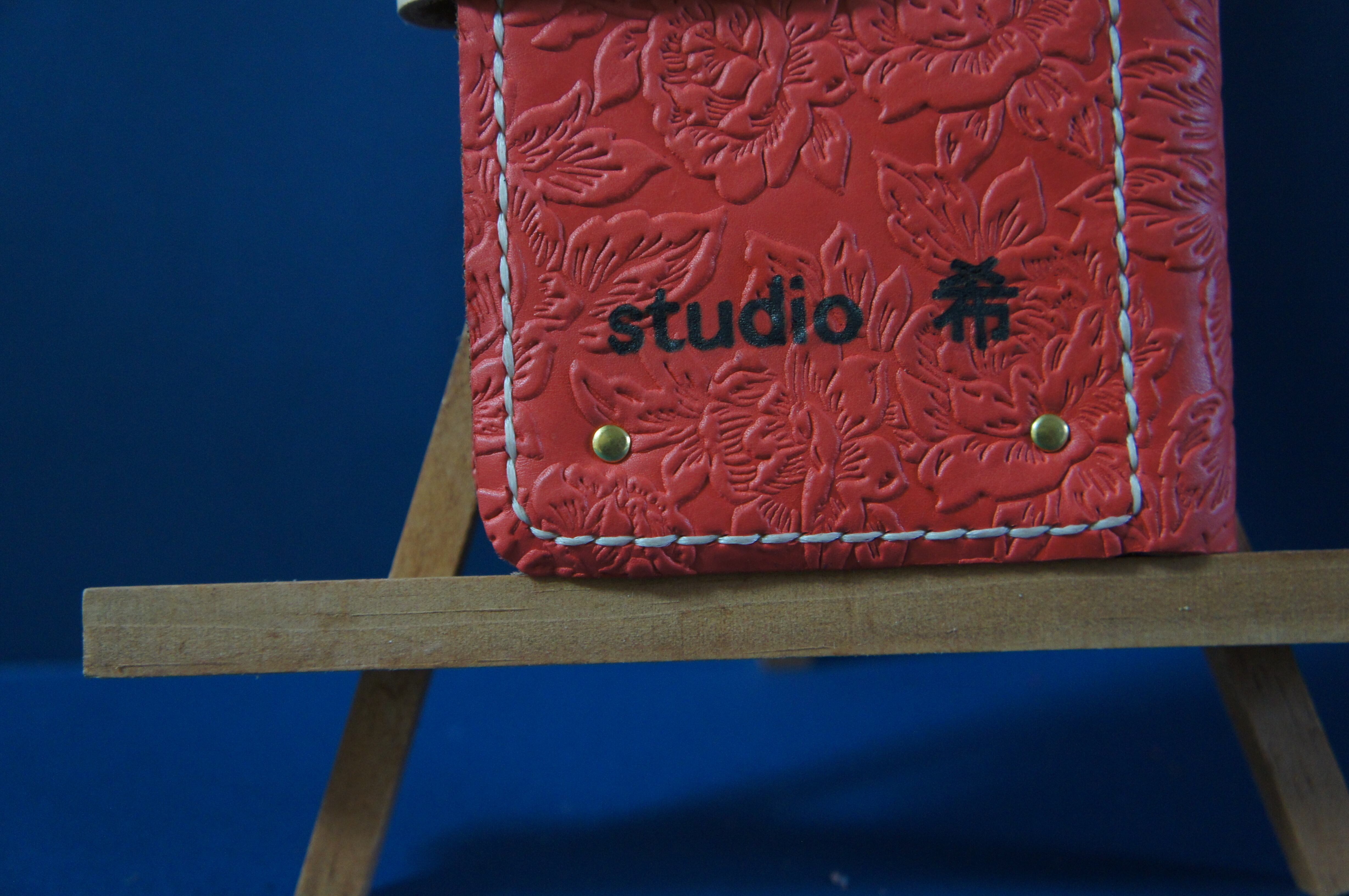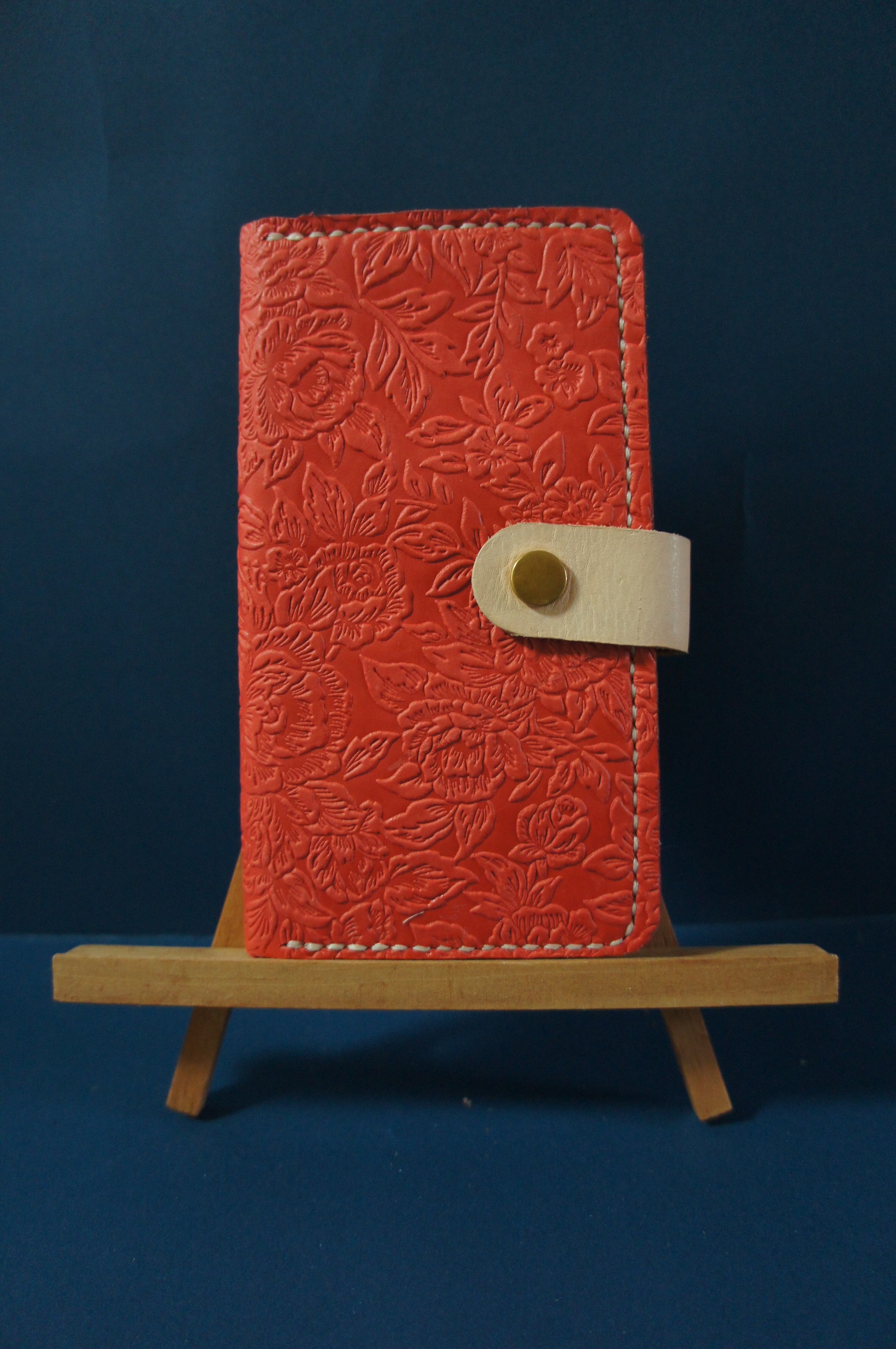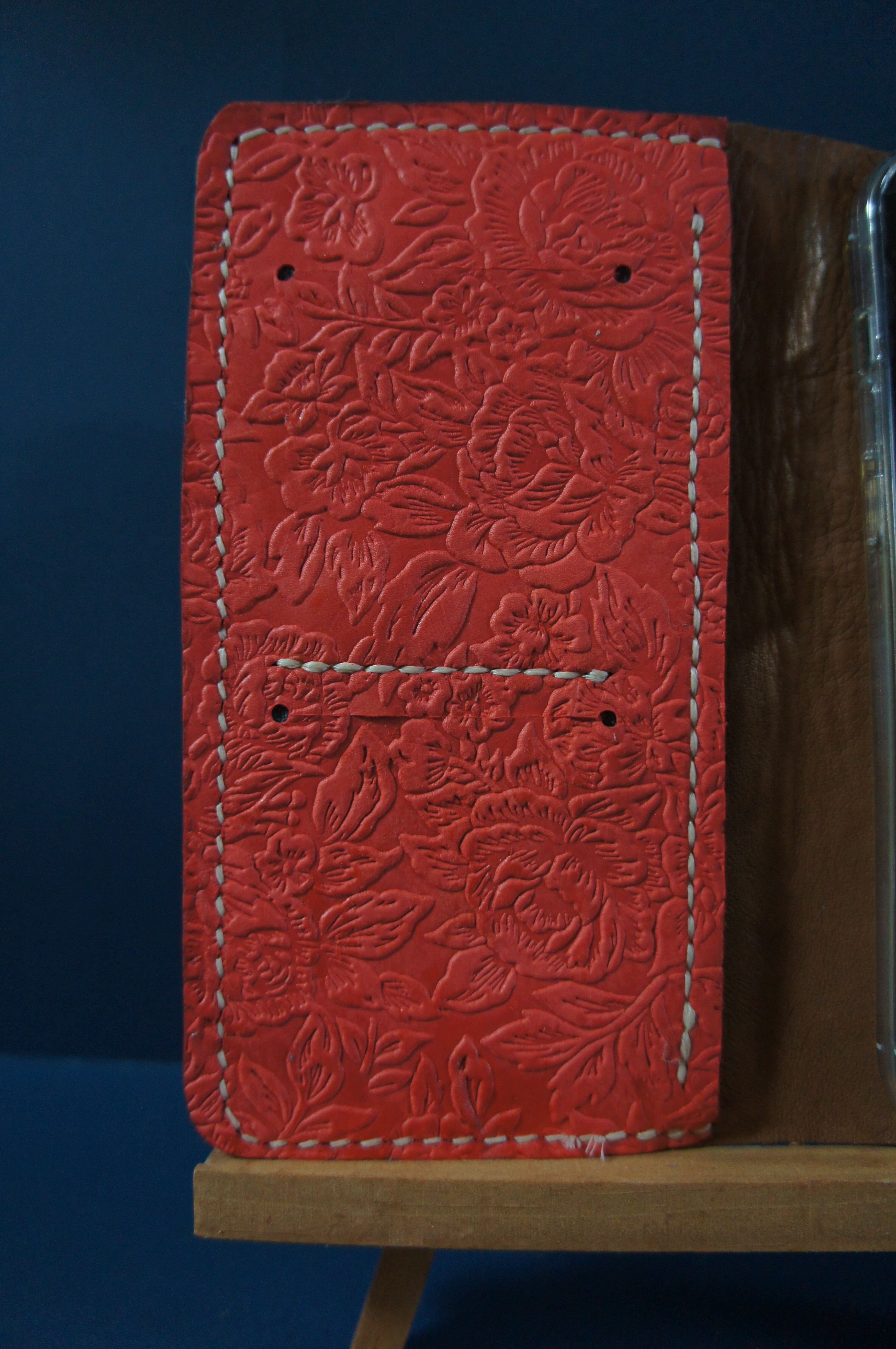 一点物です。iPhone12promax用の手帳型スマートフォンケースです。太さ1番の白色の糸ですべて手縫いで仕上げています。2本の針で縫っていますので、ほつれにくい構造になっています。本体は1.2mmの厚さの花柄型押しの朱色の牛革です。内側には厚さ0.8mmの水牛の革を使っています。カードホルダーが2つあります。カードホルダー部分の裏には収納スペースがあります。スマートフォンを固定する部分は、カシメ金具4個で固定してあります。バネホック、金具の色は金色です。カメラ穴部分を固くするためには皮革硬化剤を使用しています。貼り付け部分はつるつるに磨いています。