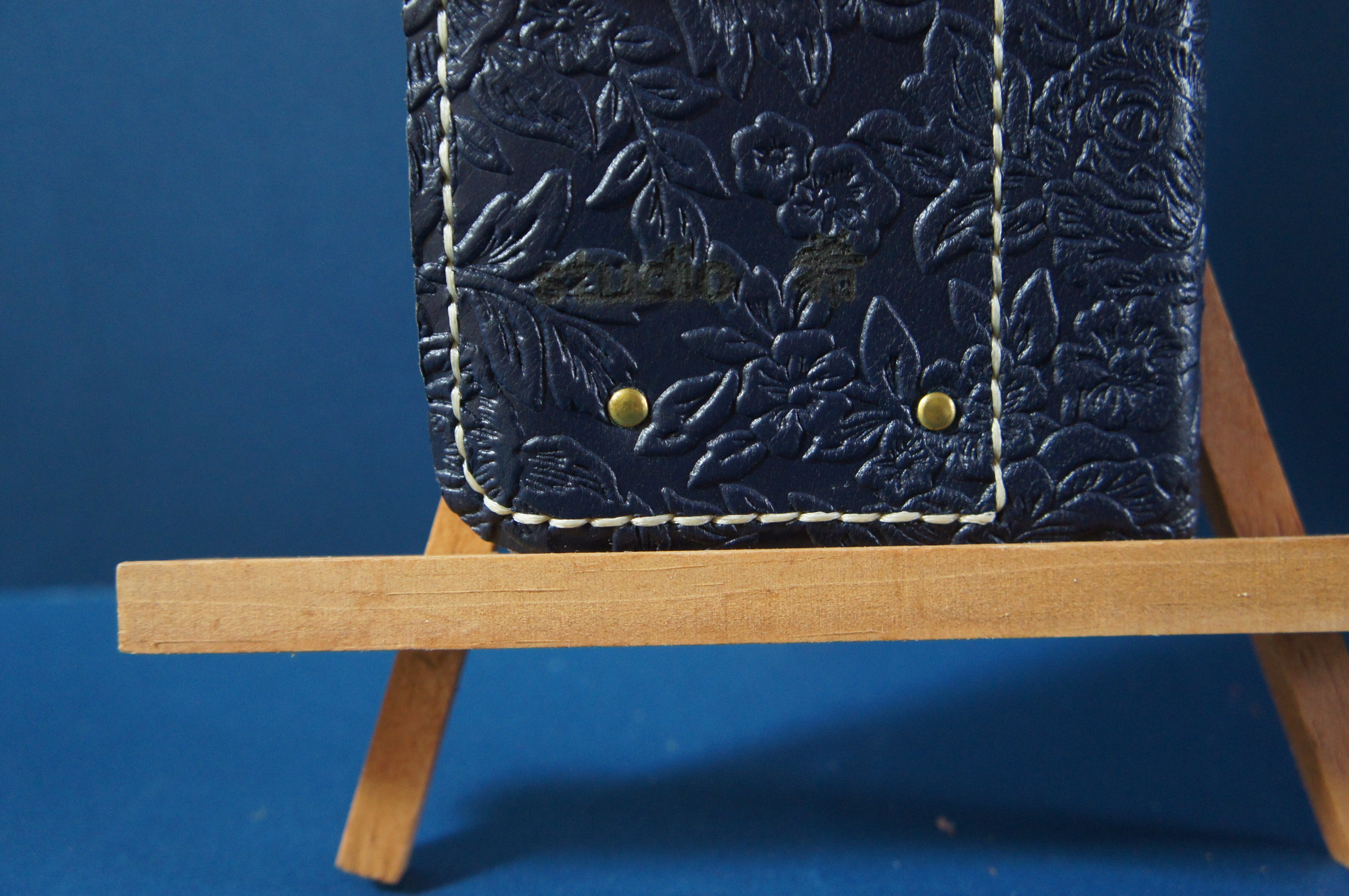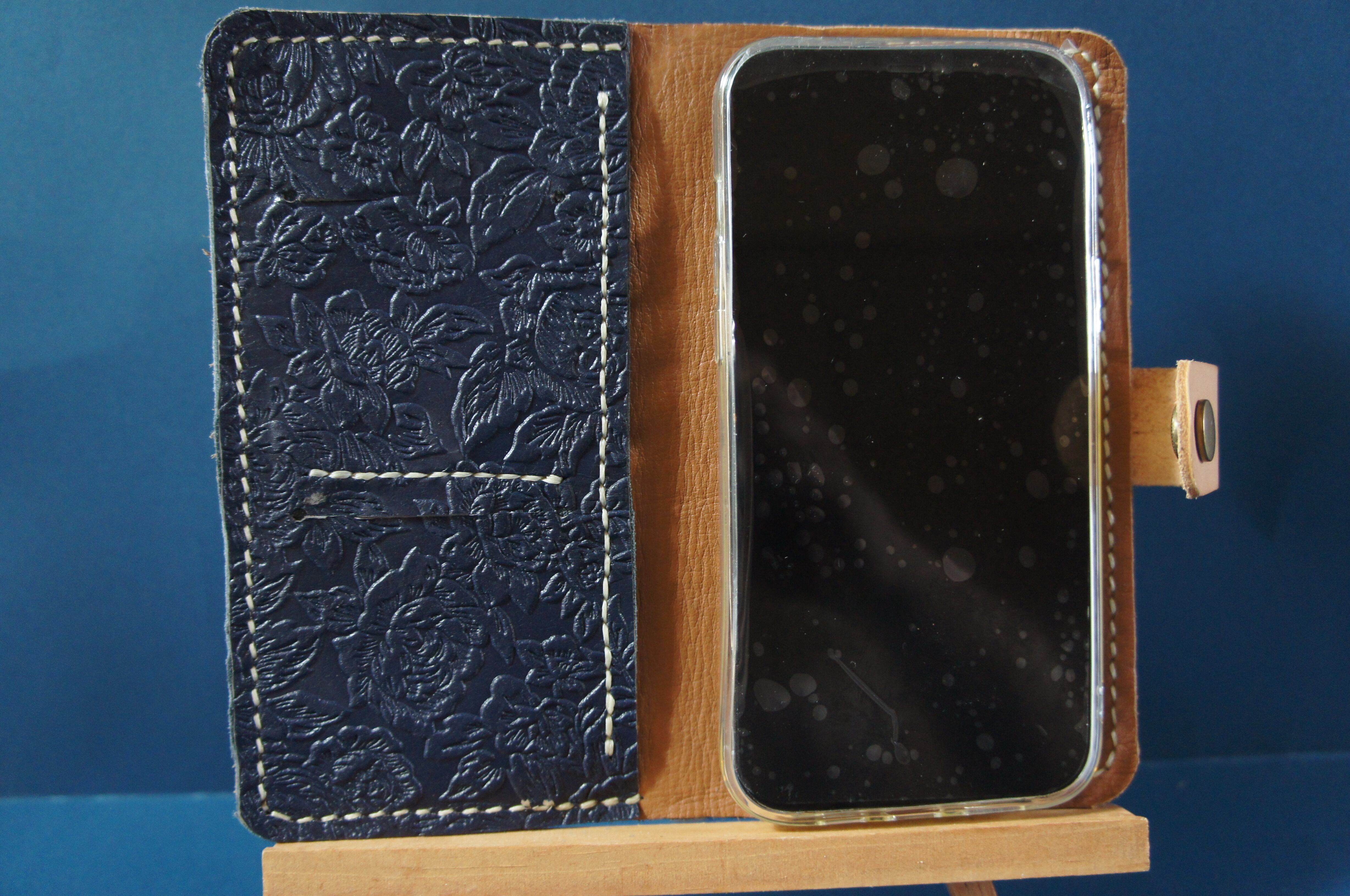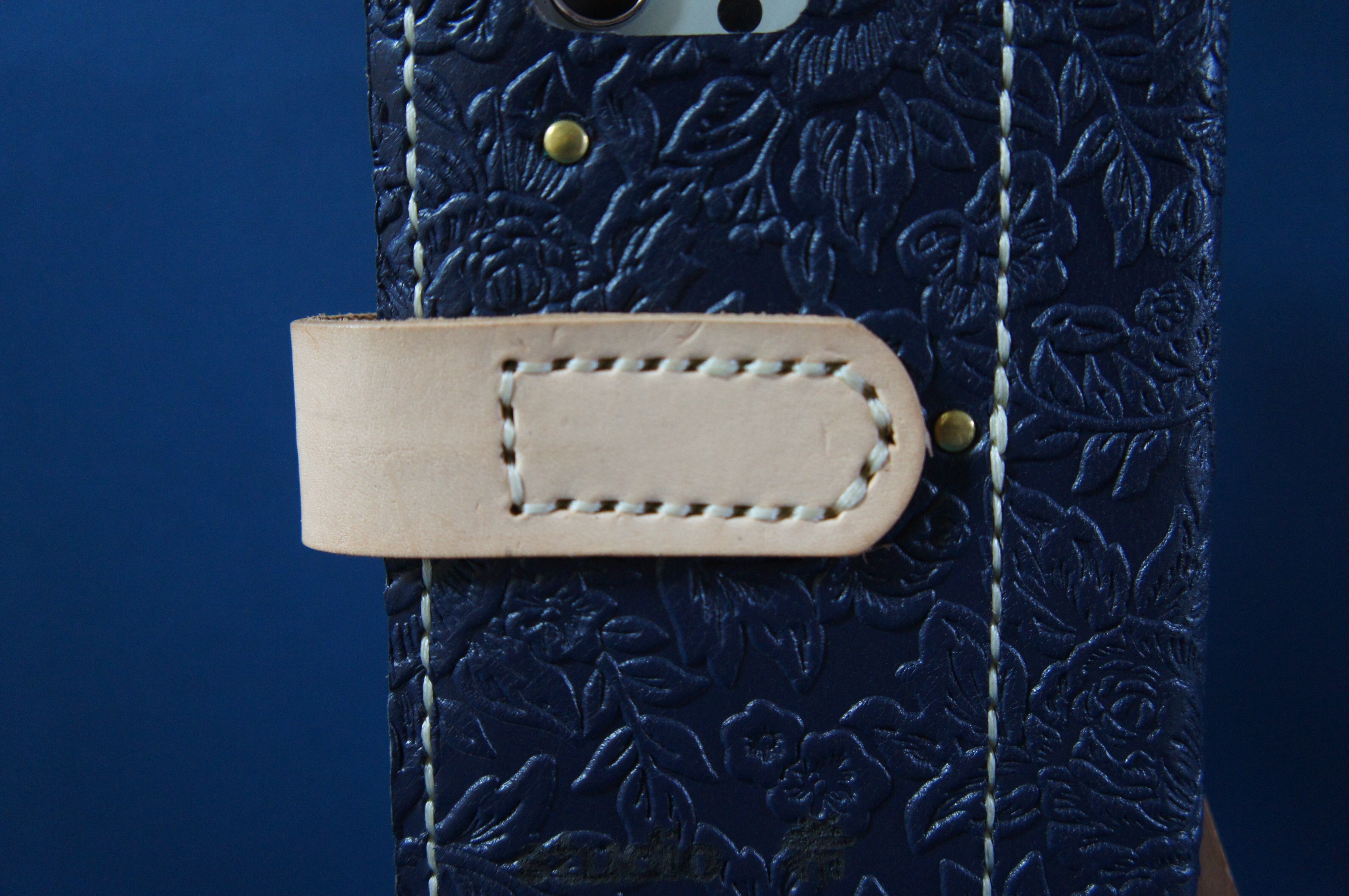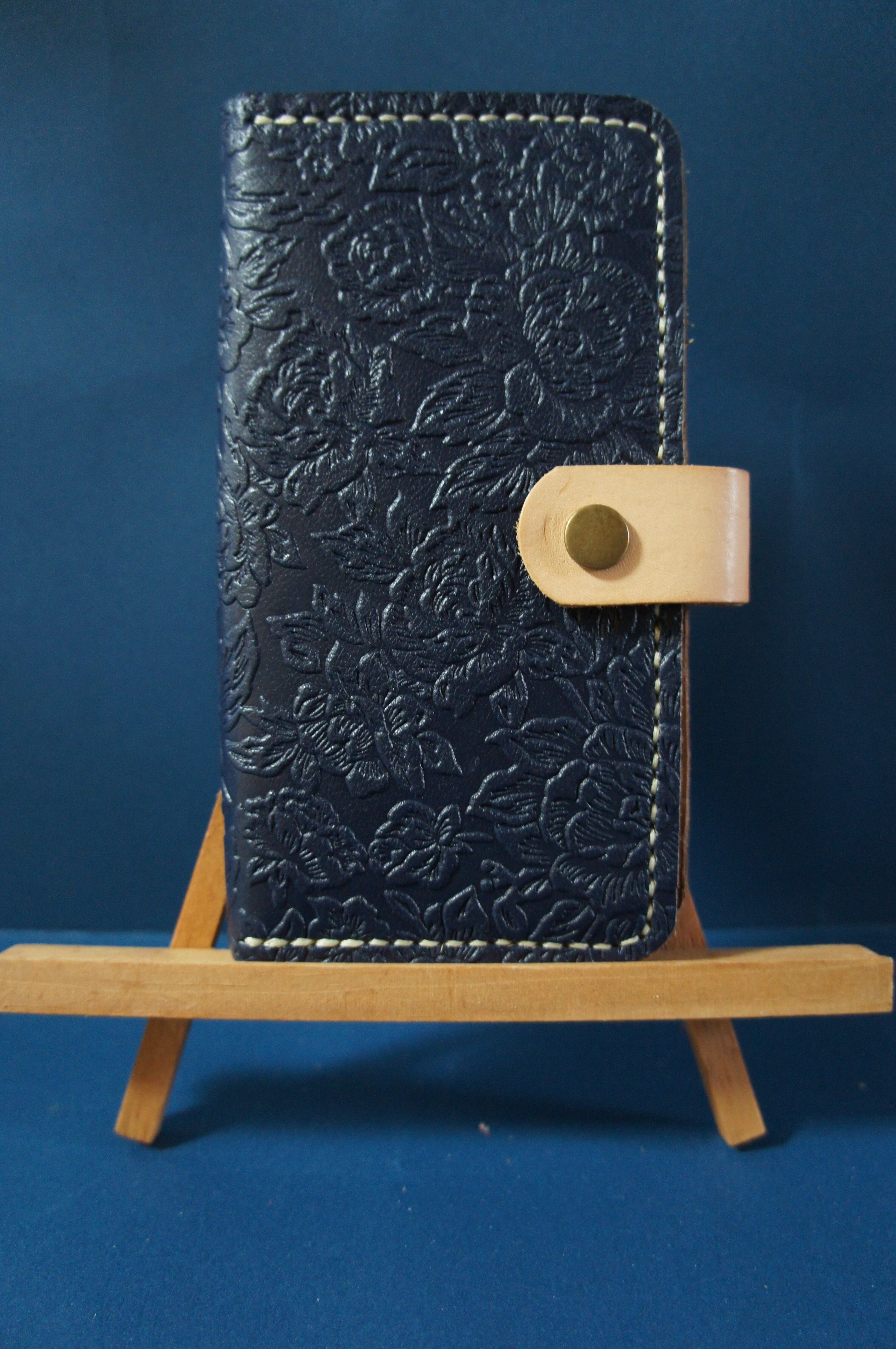 一点物です。iPhone12promax用の手帳型スマートフォンケースです。本体、内側、カードホルダー、ホルダー裏、バックルの合計5枚の革を縫い合わせています。太さ1番の白色の糸ですべて手縫いで仕上げています。2本の針で縫っていますので、ほつれにくい構造になっています。本体は1.5mmの厚さの花柄押しの紺色の牛革です。内側には厚さ0.8mmの水牛の革を使っています。カードホルダーが1つあります。カードホルダー部分の裏には収納スペースがあります。スマートフォンを固定する部分は、カシメ金具5個で固定してあります。バネホック、金具の色は銅色です。カメラ穴部分を固くするためには皮革硬化剤を使用しています。貼り付け部分はつるつるに磨いています。