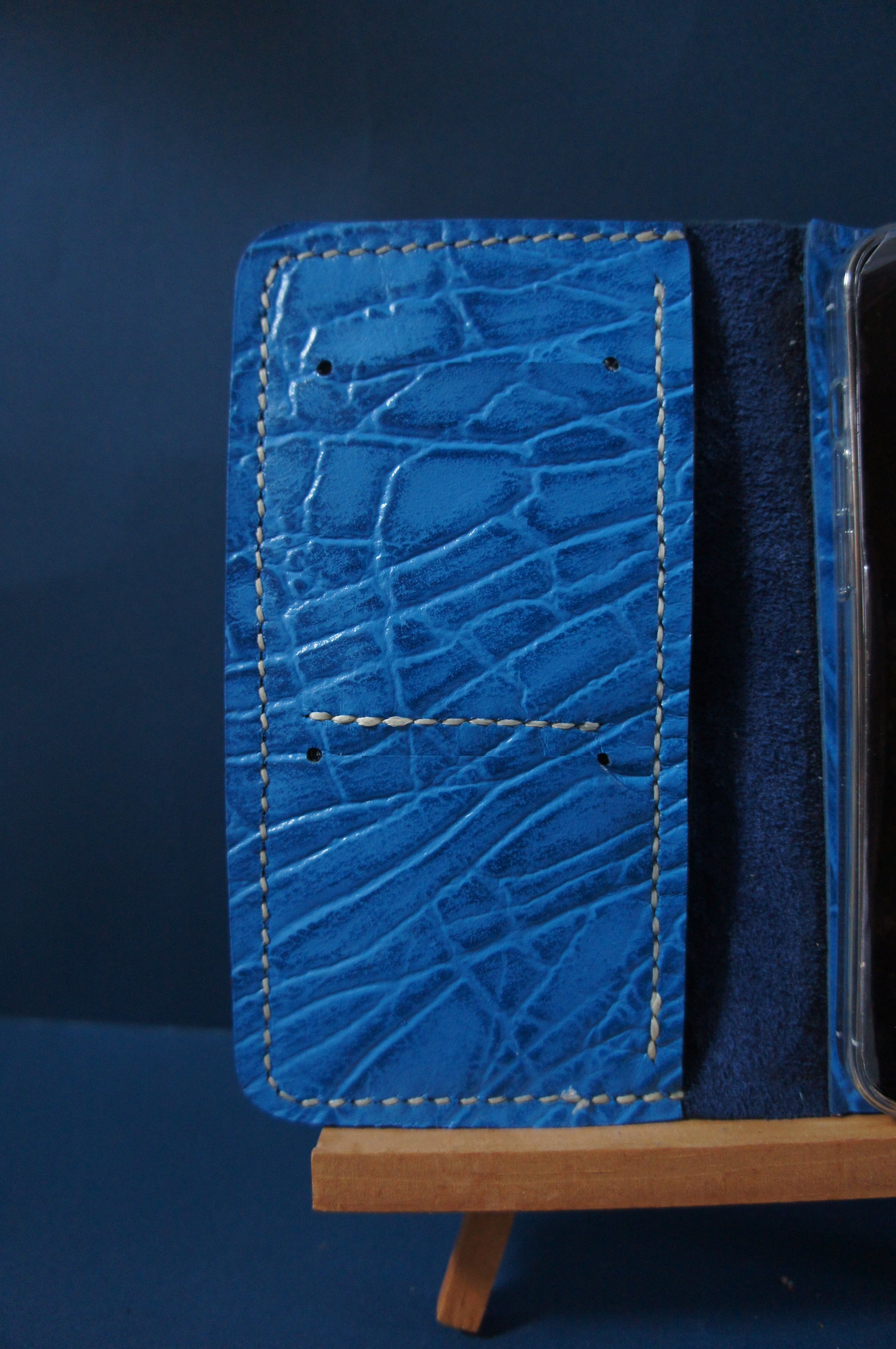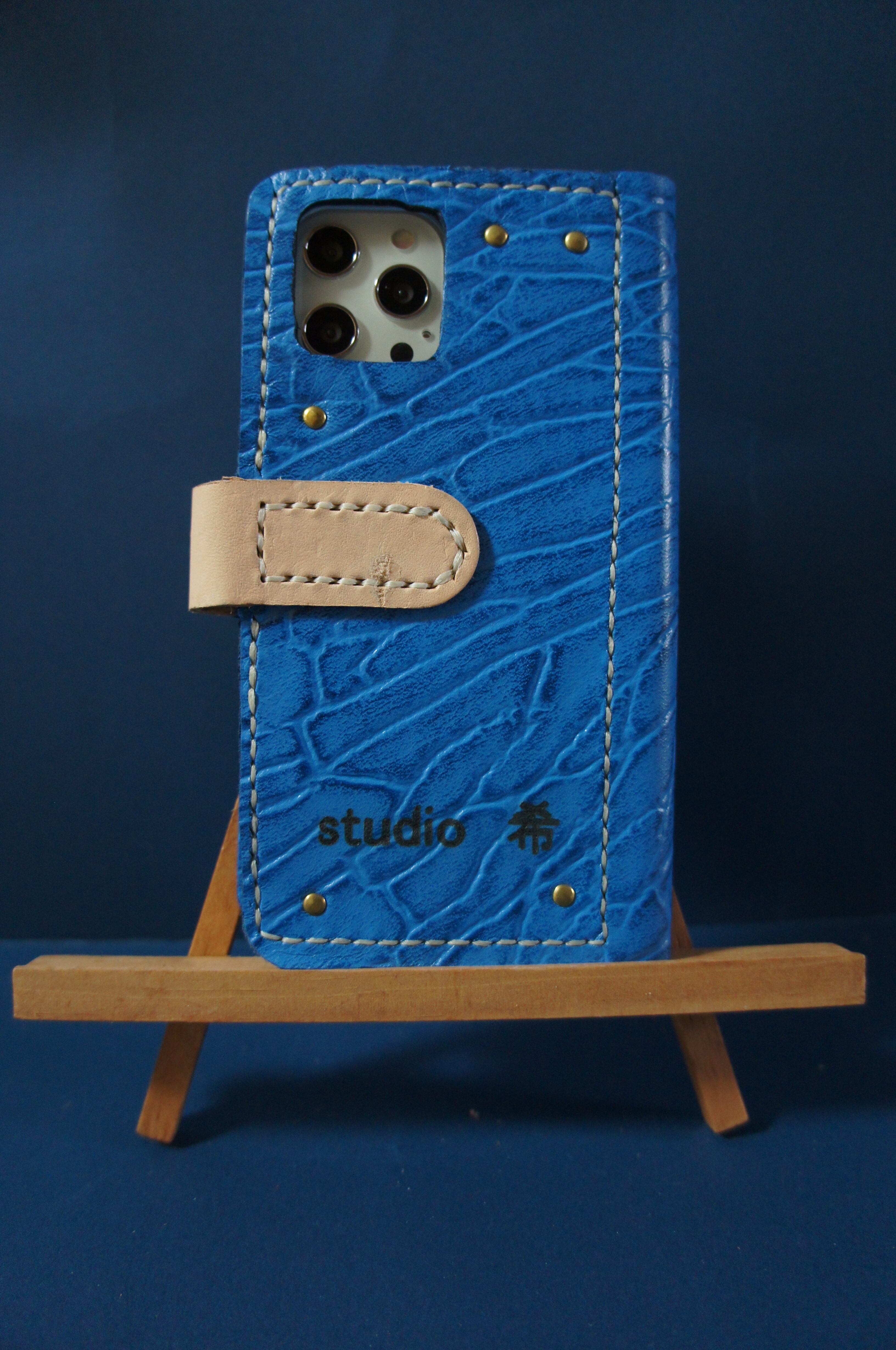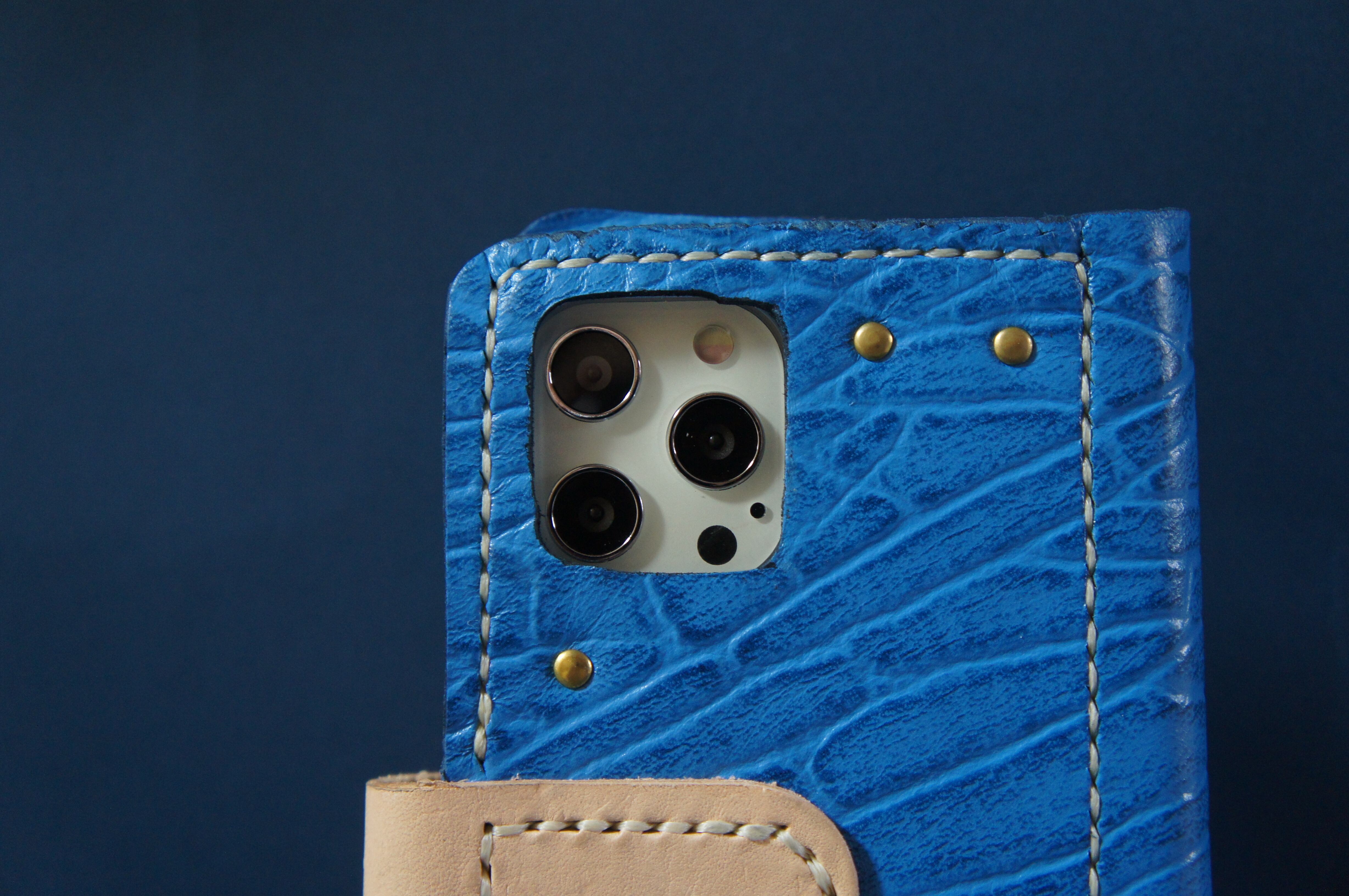 一点物です。iPhone12promax用の手帳型スマートフォンケースです。本体、内側、カードホルダー、ホルダー裏、バックルの合計5枚の革を縫い合わせています。太さ1番の白色の糸ですべて手縫いで仕上げています。2本の針で縫っていますので、ほつれにくい構造になっています。本体は1.5mmの厚さの蛇型押しの青色の牛革です。内側にも同じ革を使っています。カードホルダーが2つあります。カードホルダー部分の裏には収納スペースがあります。スマートフォンを固定する部分は、カシメ金具5個で固定してあります。バネホック、金具の色は銅色です。カメラ穴部分を固くするためには皮革硬化剤を使用しています。貼り付け部分はつるつるに磨いています。