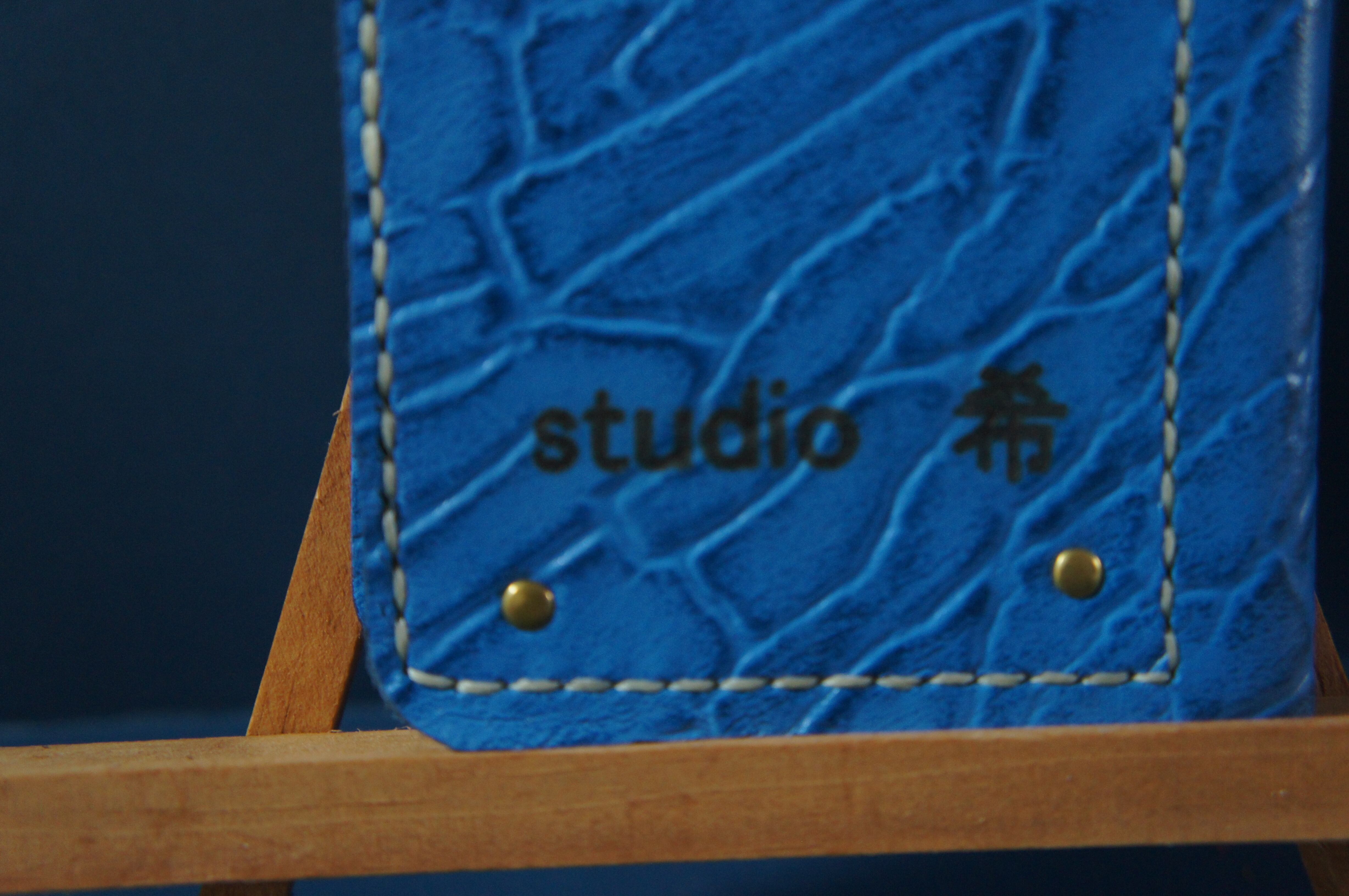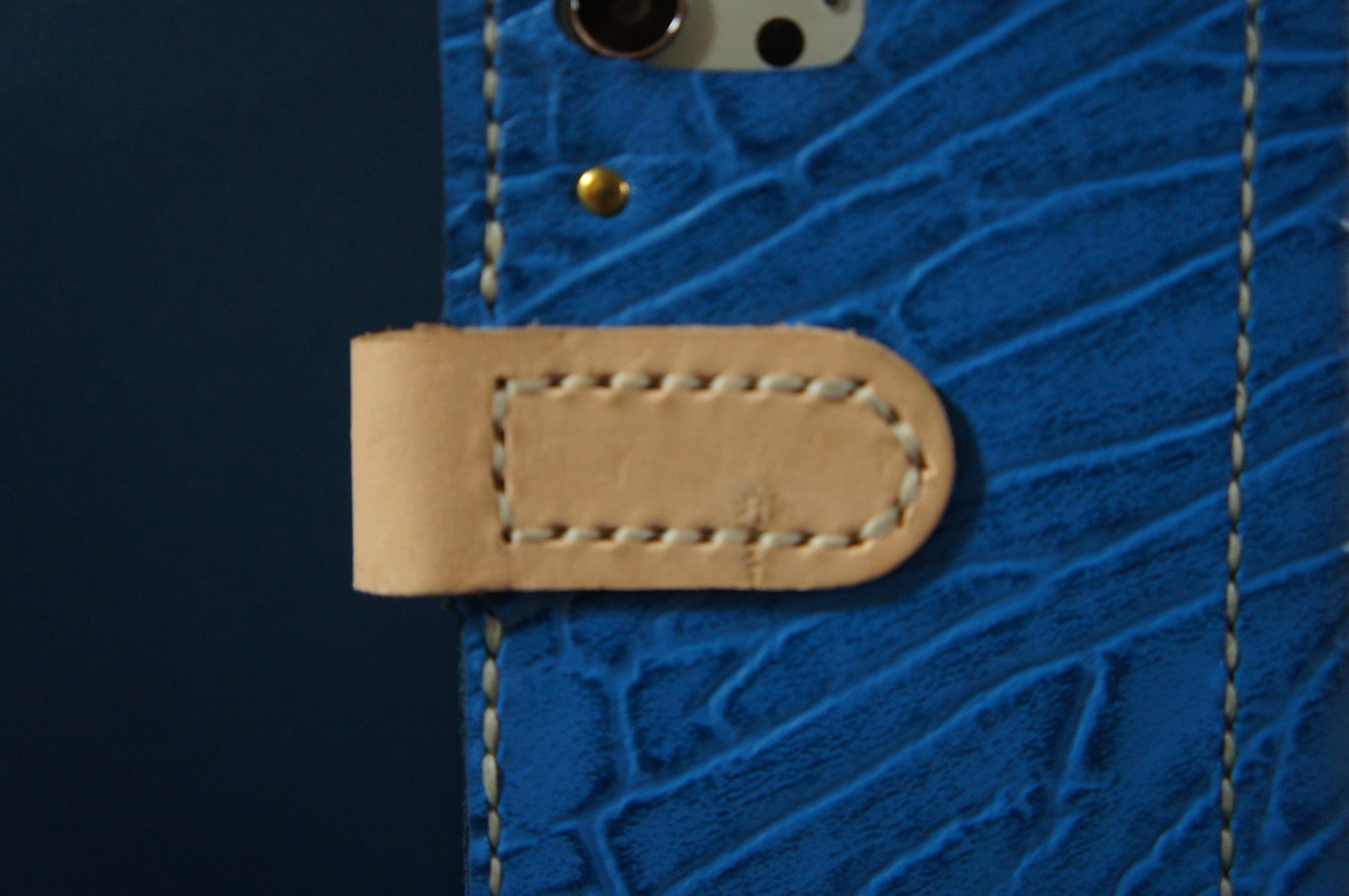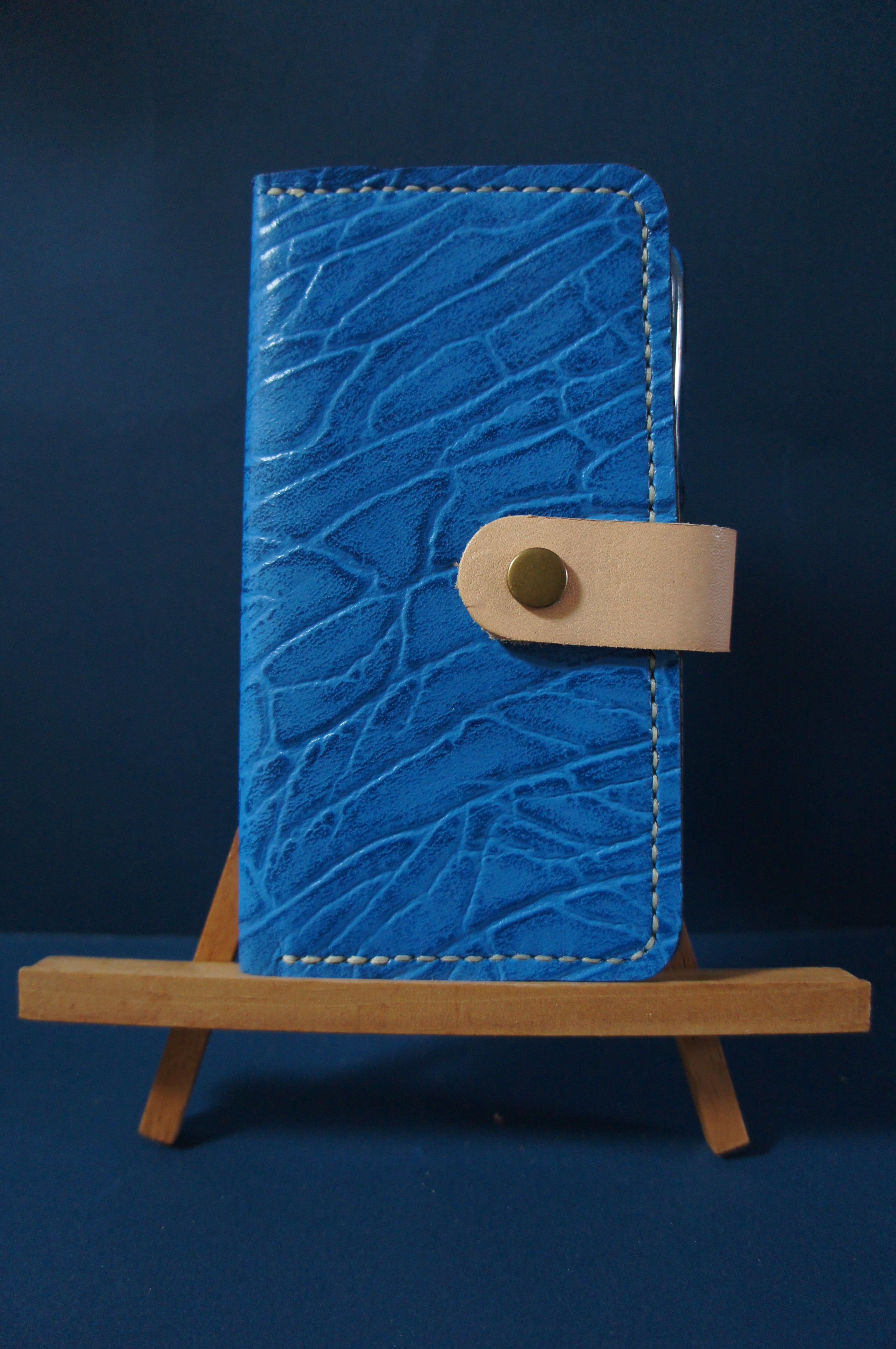 一点物です。iPhone12promax用の手帳型スマートフォンケースです。本体、内側、カードホルダー、ホルダー裏、バックルの合計5枚の革を縫い合わせています。太さ1番の白色の糸ですべて手縫いで仕上げています。2本の針で縫っていますので、ほつれにくい構造になっています。本体は1.5mmの厚さの蛇型押しの青色の牛革です。内側にも同じ革を使っています。カードホルダーが2つあります。カードホルダー部分の裏には収納スペースがあります。スマートフォンを固定する部分は、カシメ金具5個で固定してあります。バネホック、金具の色は銅色です。カメラ穴部分を固くするためには皮革硬化剤を使用しています。貼り付け部分はつるつるに磨いています。