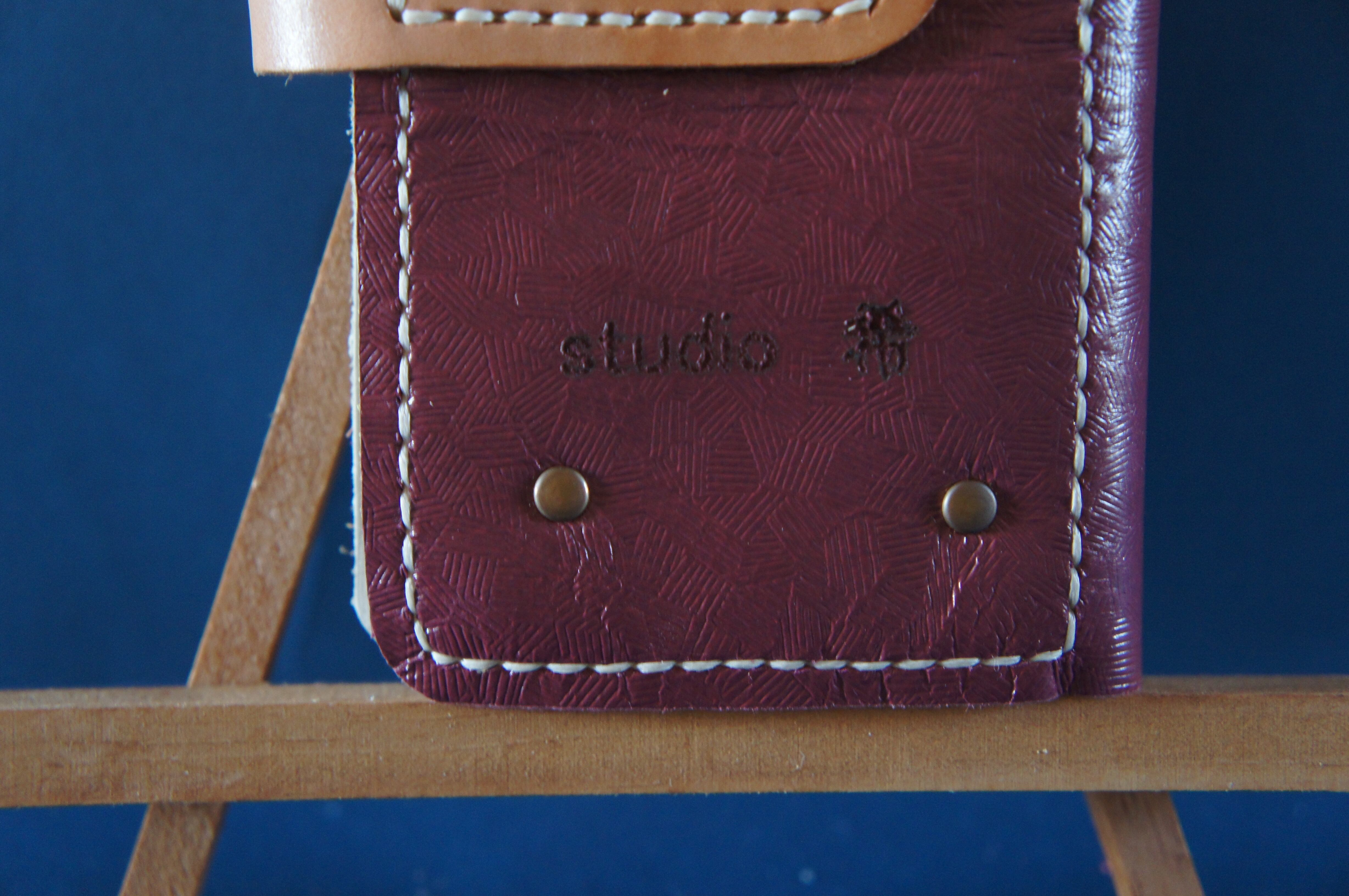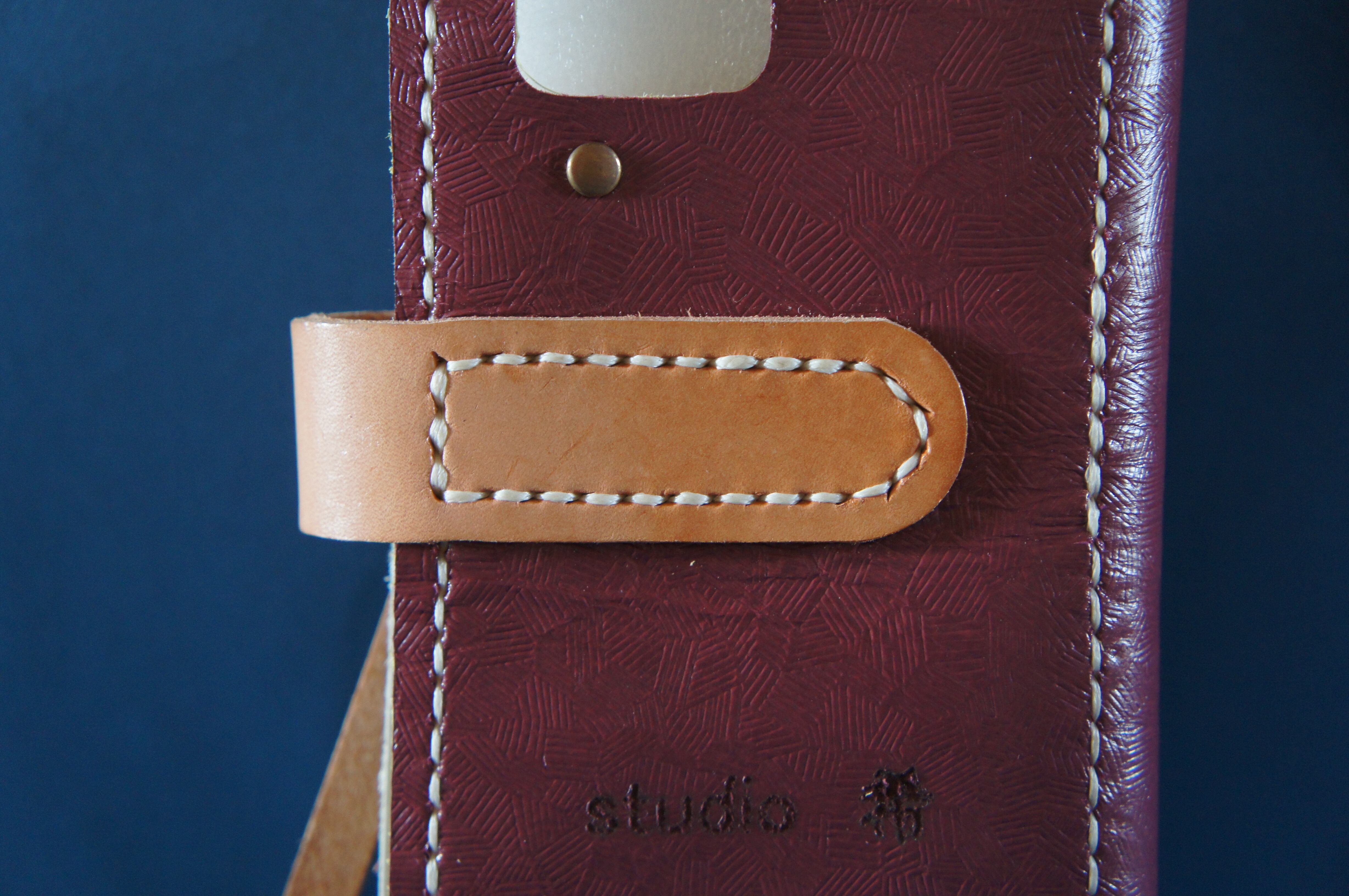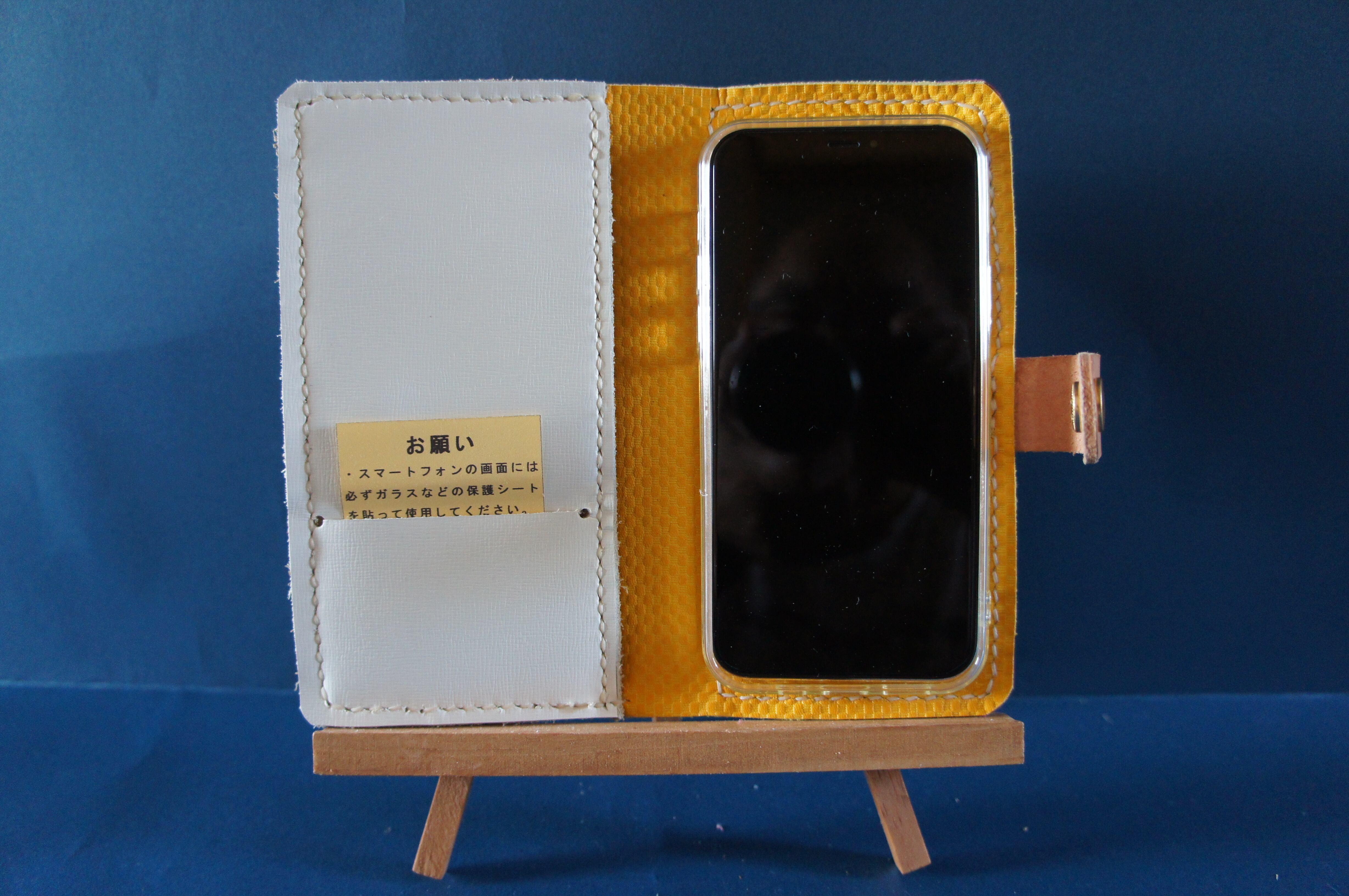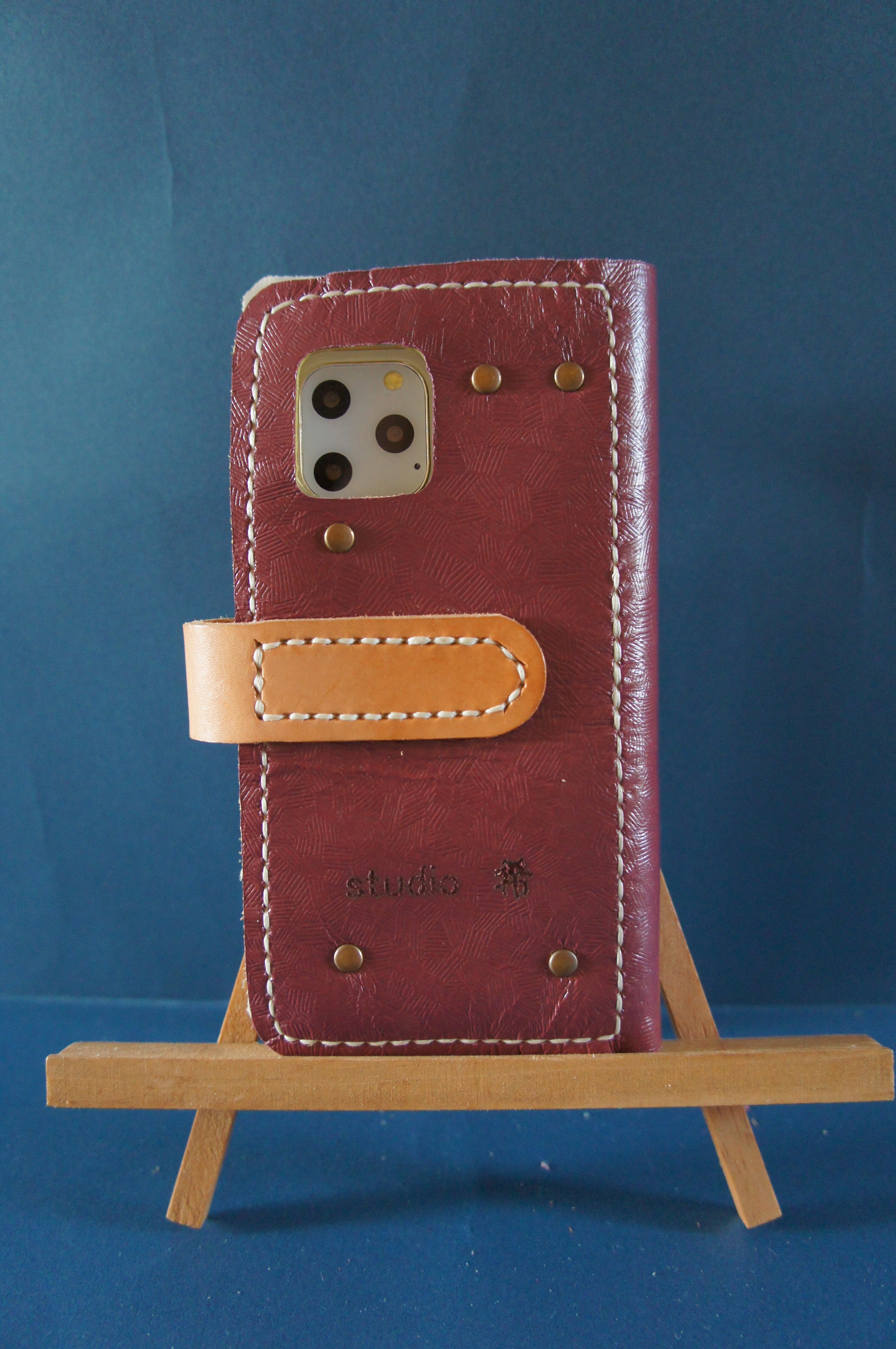 一点物です。iPhone12pro用の手帳型スマートフォンケースです。太さ1番の白色の糸ですべて手縫いで仕上げています。2本の針で縫っていますので、ほつれにくい構造になっています。本体は1.3mmの厚さの型押しの紫色のゴート革です。内側には厚さ1.0mmの牛革を使っています。カードホルダー部分には白色の牛革を使っています。カードホルダーが1つあります。カードホルダー部分の裏には収納スペースがあります。スマートフォンを固定する部分は、カシメ金具5個で固定してあります。バネホック、金具の色は銅色です。カメラ穴部分を固くするためには皮革硬化剤を使用しています。貼り付け部分はつるつるに磨いています。