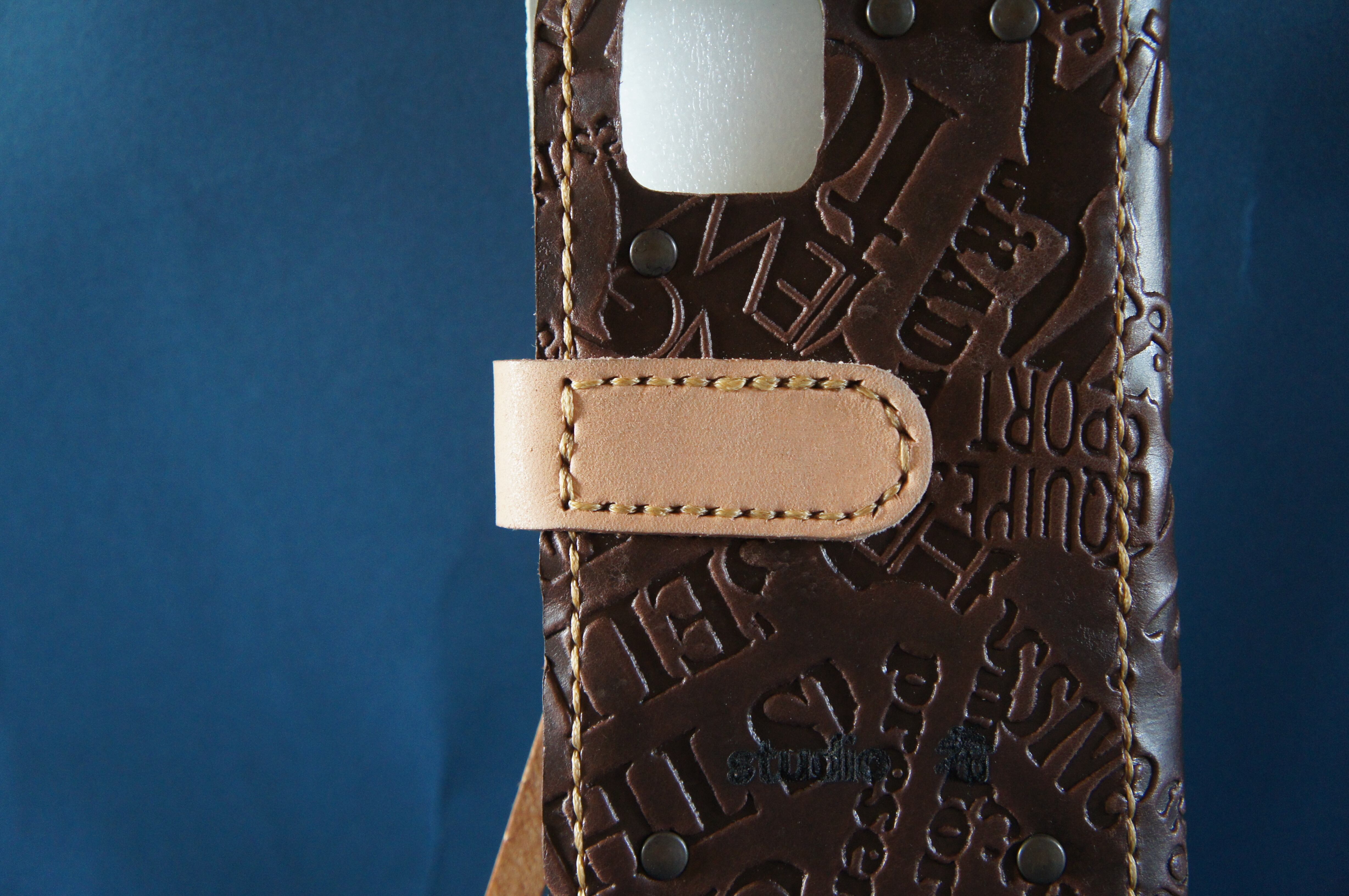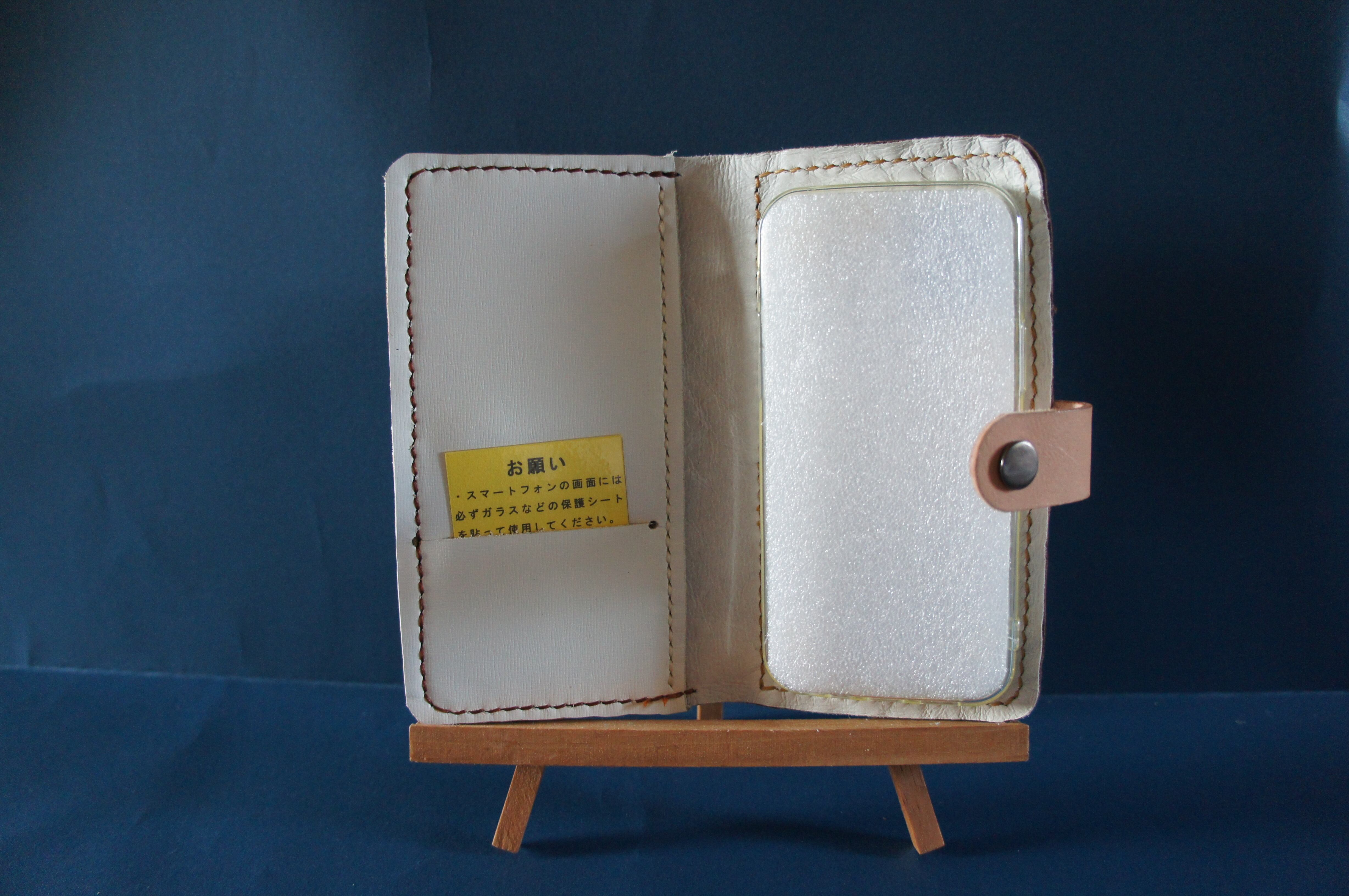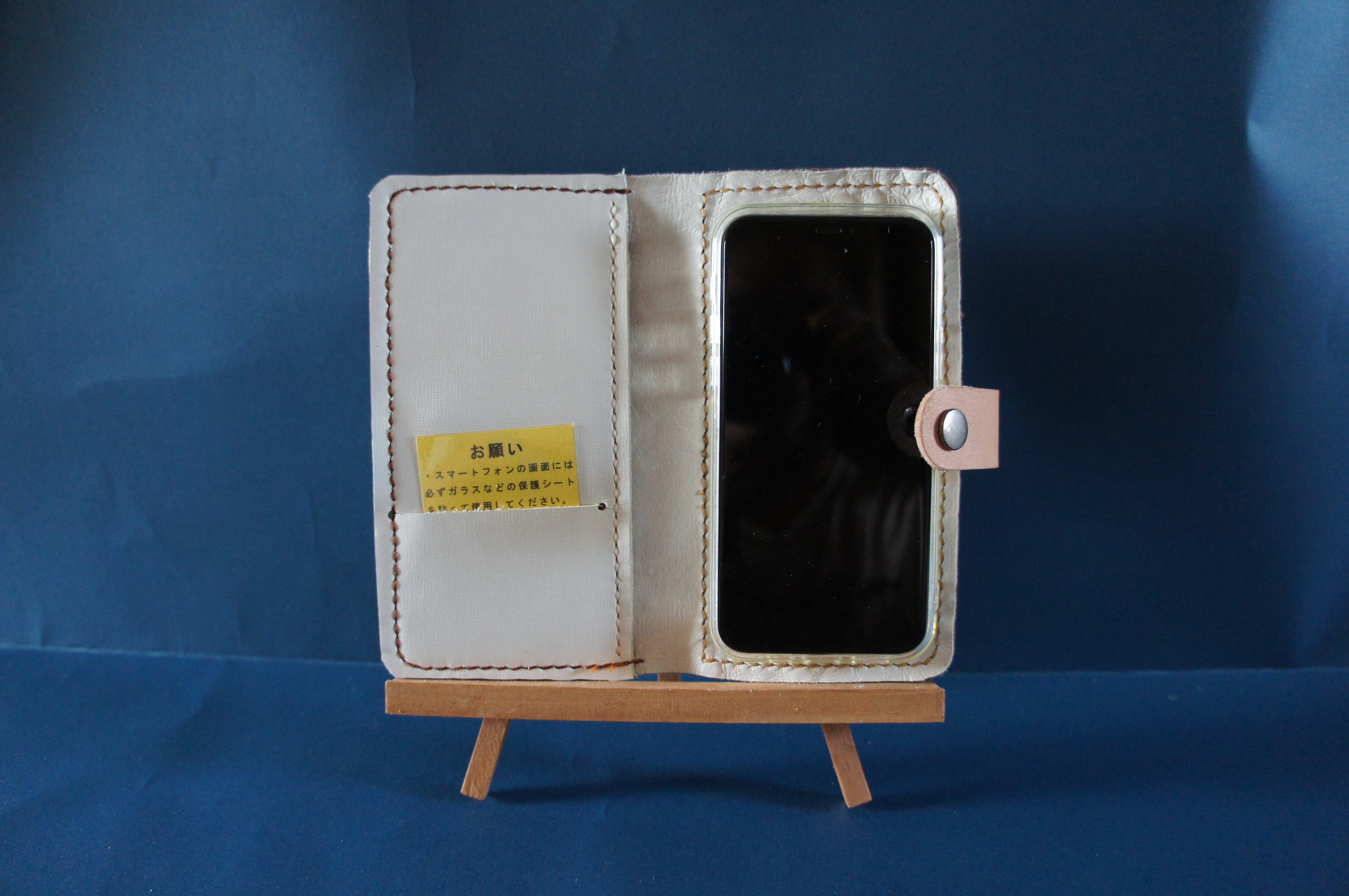 一点物です。iPhone12pro用の手帳型スマートフォンケースです。太さ1番の茶色の糸ですべて手縫いで仕上げています。2本の針で縫っていますので、ほつれにくい構造になっています。本体は1.5mmの厚さの英文字型押しの茶色の牛革です。内側には厚さ0.8mmの白色の牛革を使っています。カードホルダーが1つあります。カードホルダー部分の裏には収納スペースがあります。スマートフォンを固定する部分は、カシメ金具5個で固定してあります。バネホック、金具の色はブロンズです。カメラ穴部分を固くするためには皮革硬化剤を使用しています。貼り付け部分はつるつるに磨いています。