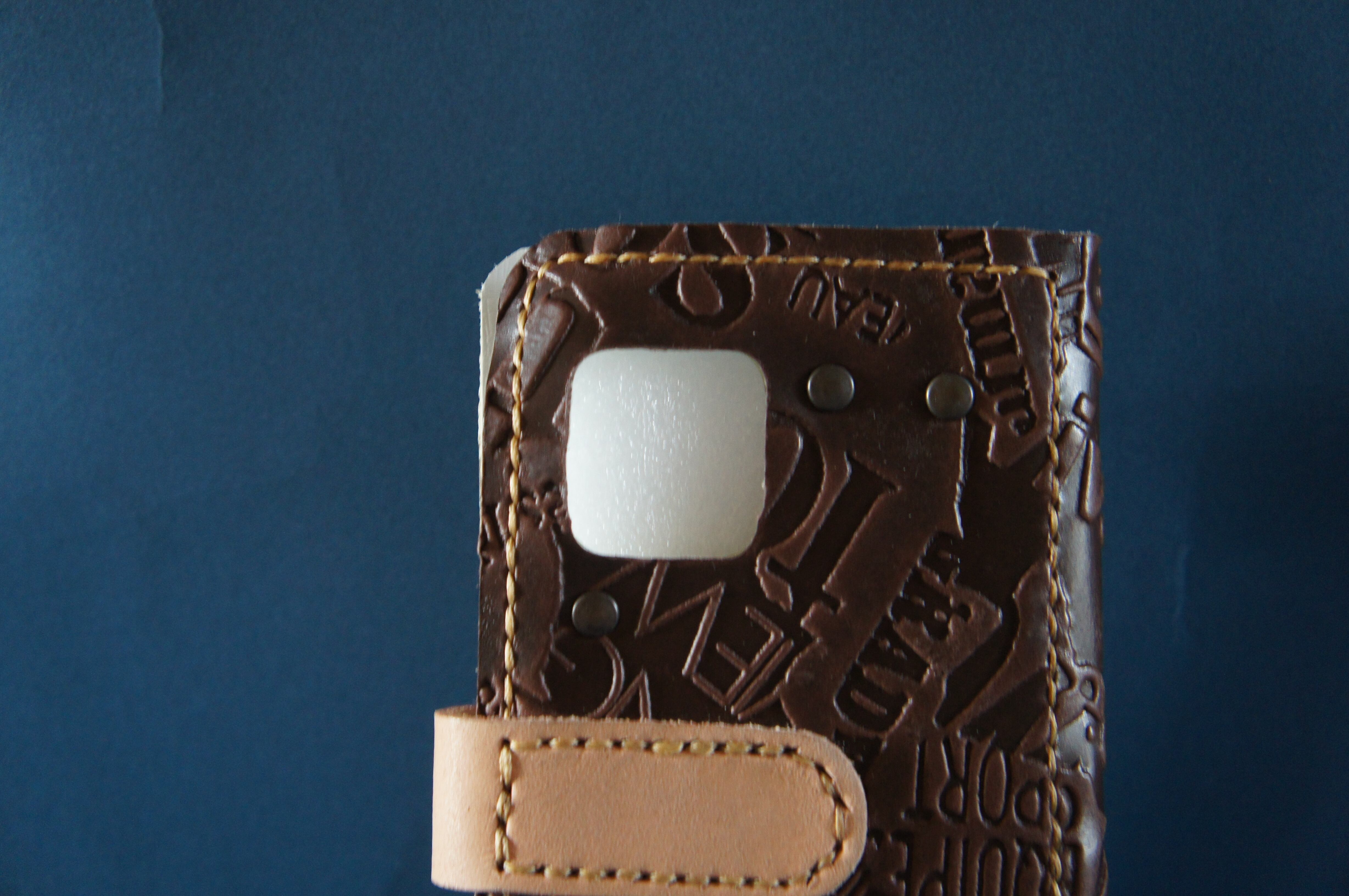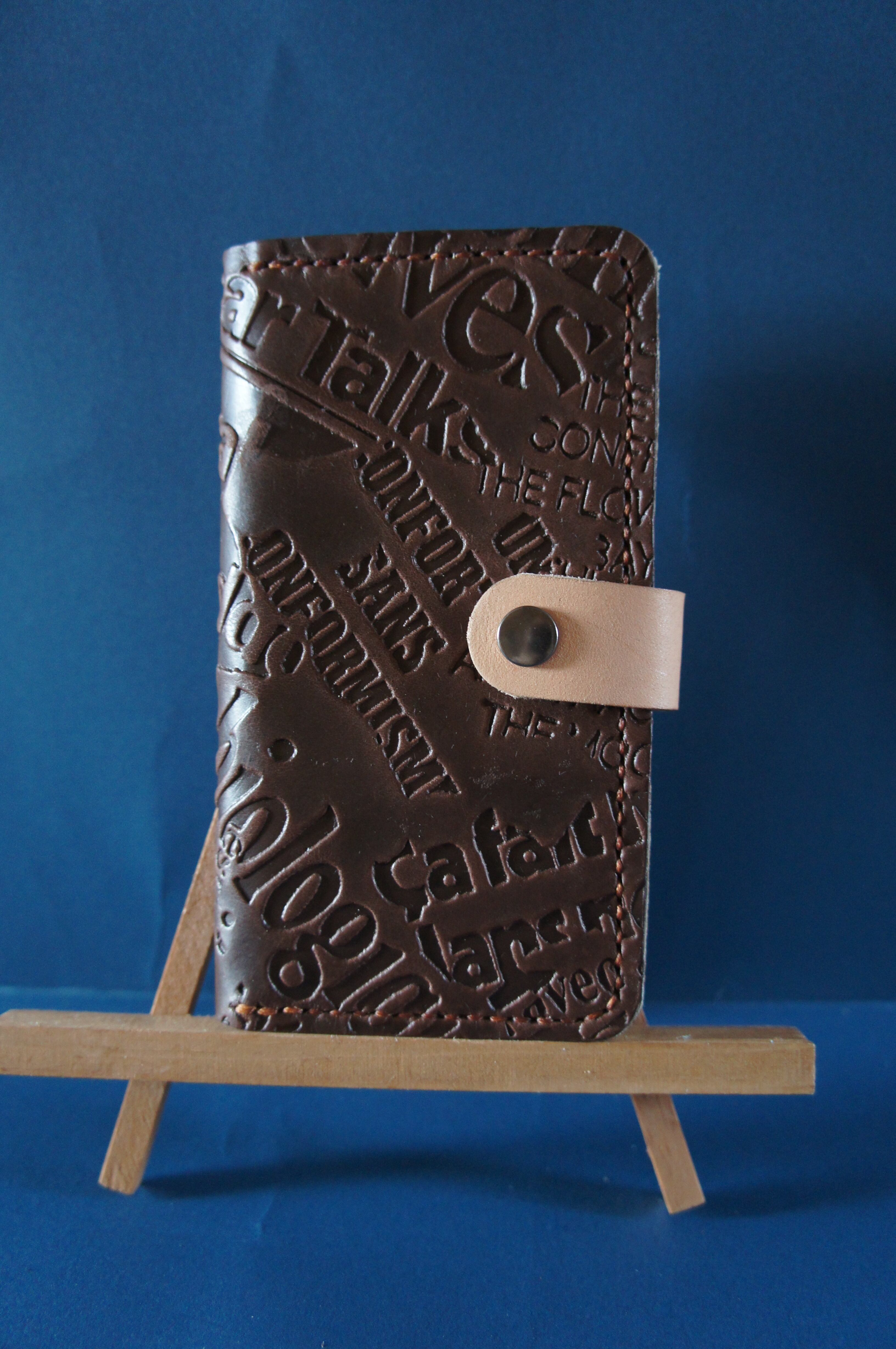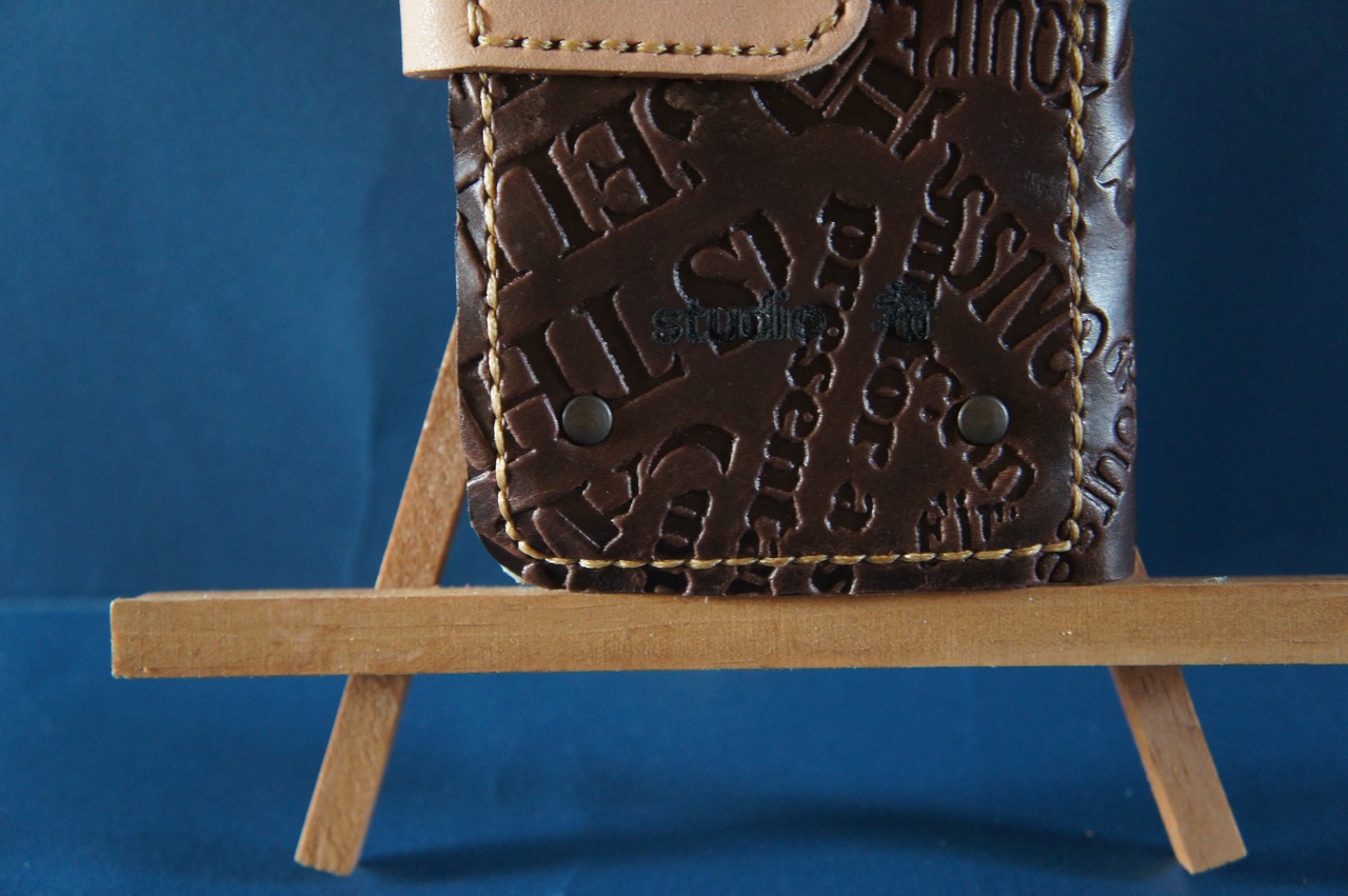 一点物です。iPhone12pro用の手帳型スマートフォンケースです。太さ1番の茶色の糸ですべて手縫いで仕上げています。2本の針で縫っていますので、ほつれにくい構造になっています。本体は1.5mmの厚さの英文字型押しの茶色の牛革です。内側には厚さ0.8mmの白色の牛革を使っています。カードホルダーが1つあります。カードホルダー部分の裏には収納スペースがあります。スマートフォンを固定する部分は、カシメ金具5個で固定してあります。バネホック、金具の色はブロンズです。カメラ穴部分を固くするためには皮革硬化剤を使用しています。貼り付け部分はつるつるに磨いています。