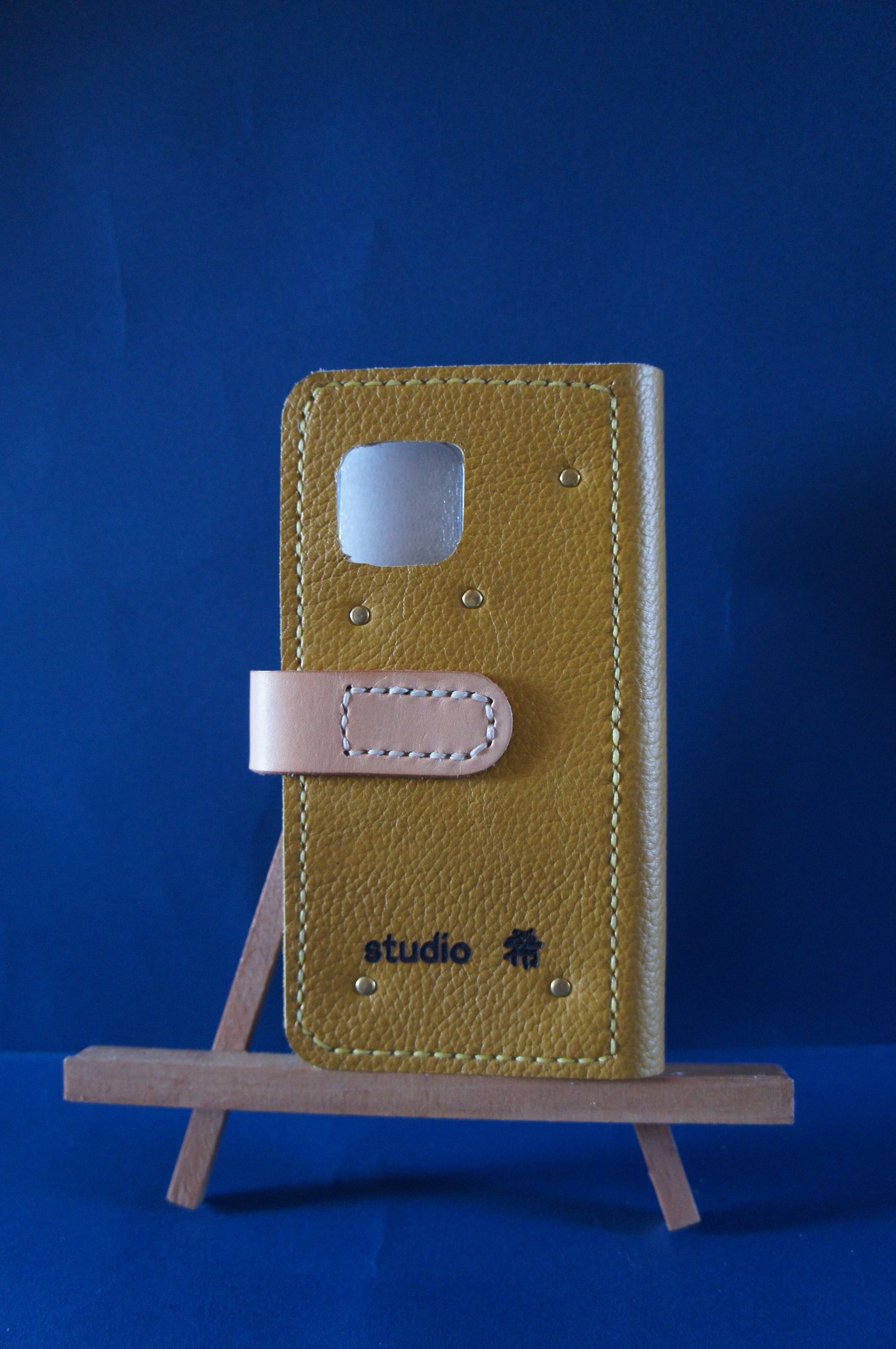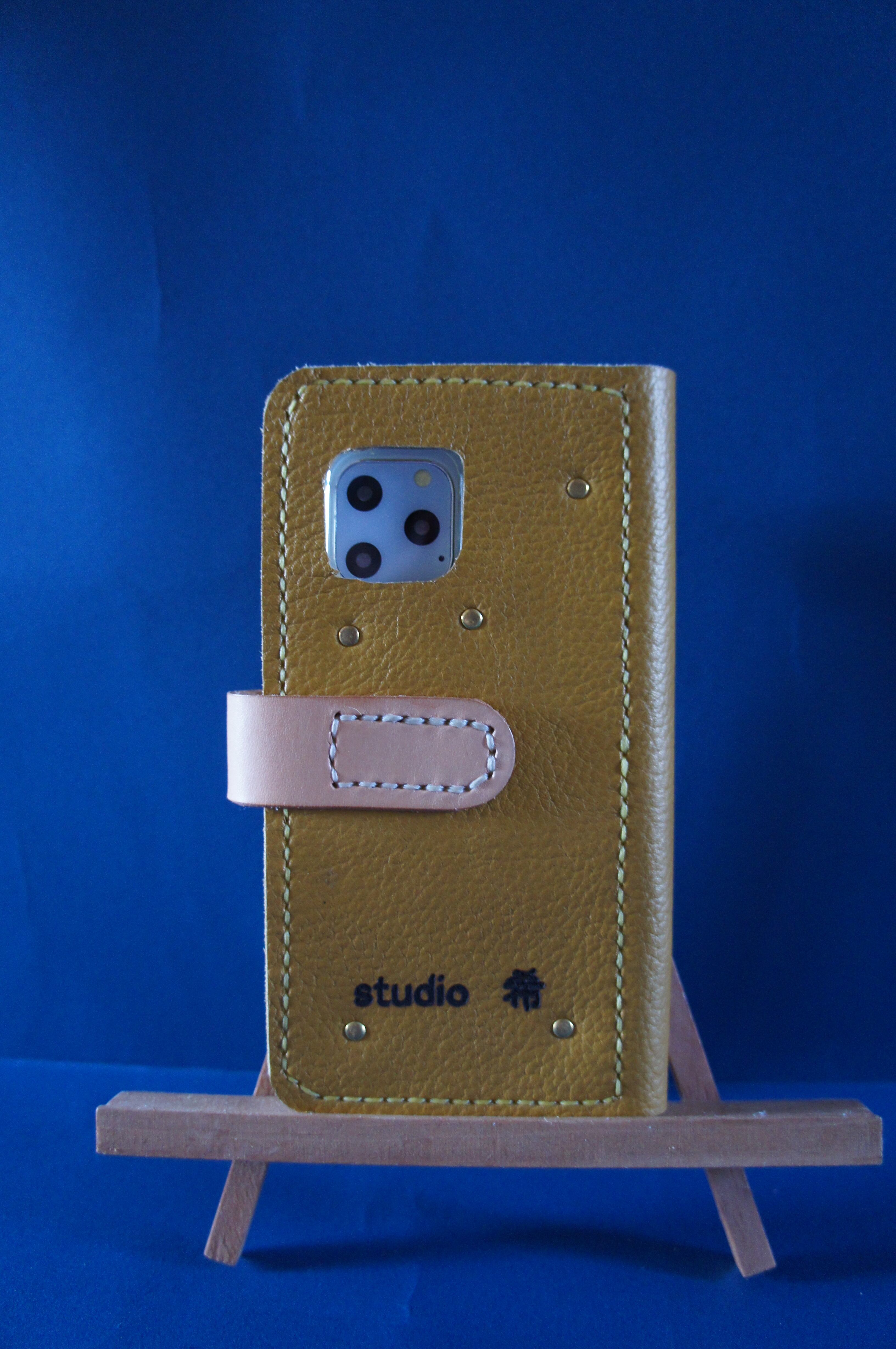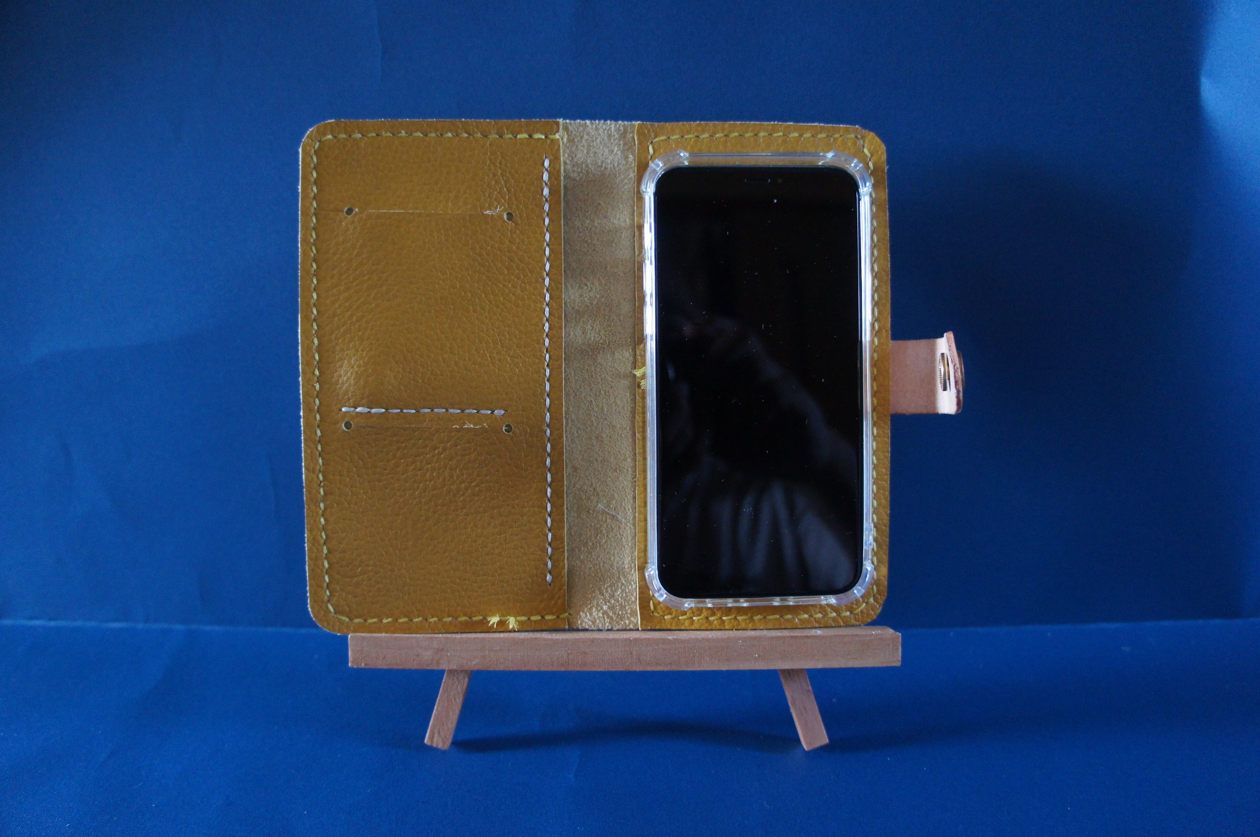 一点物です。iPhone12pro用の手帳型スマートフォンケースです。太さ1番の黄色の糸ですべて手縫いで仕上げています。2本の針で縫っていますので、ほつれにくい構造になっています。本体は1.8mmの厚さの黄土色の牛革です。内側にも同じ牛革を使っています。カードホルダーが2つあります。カードホルダー部分の裏には収納スペースがあります。スマートフォンを固定する部分は、カシメ金具5個で固定してあります。バネホック、金具の色は金色です。カメラ穴部分を固くするためには皮革硬化剤を使用しています。貼り付け部分はつるつるに磨いています。