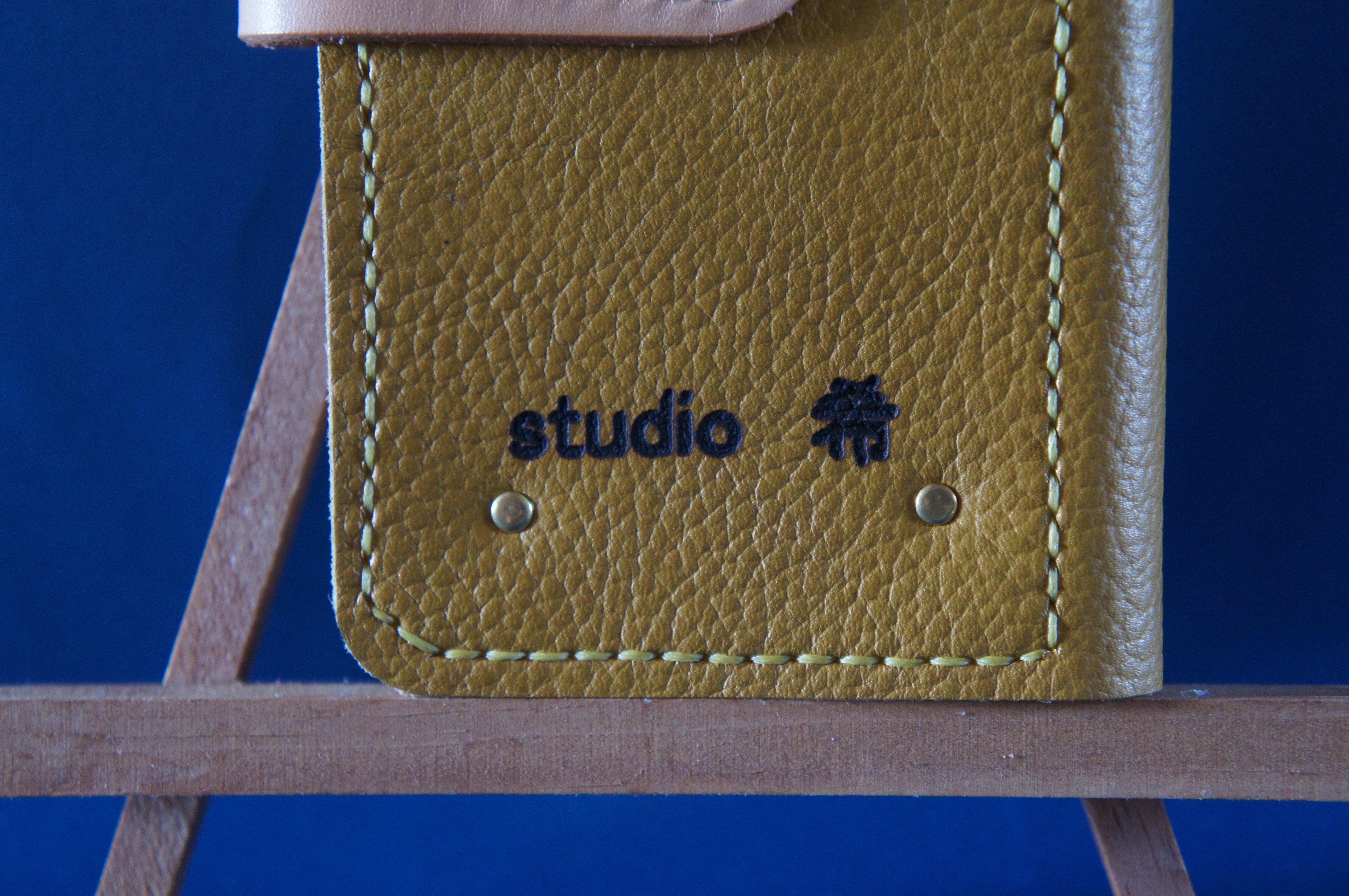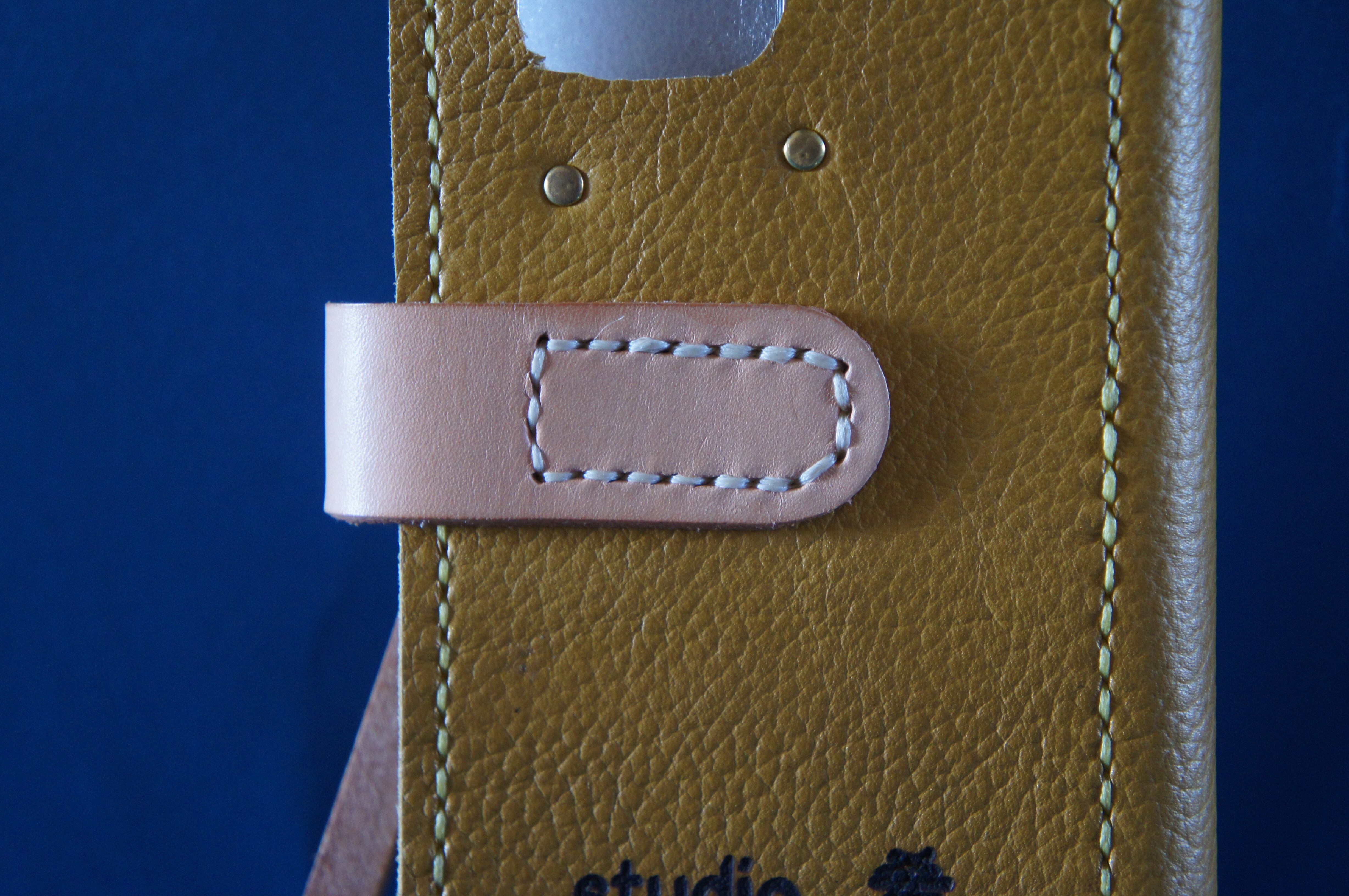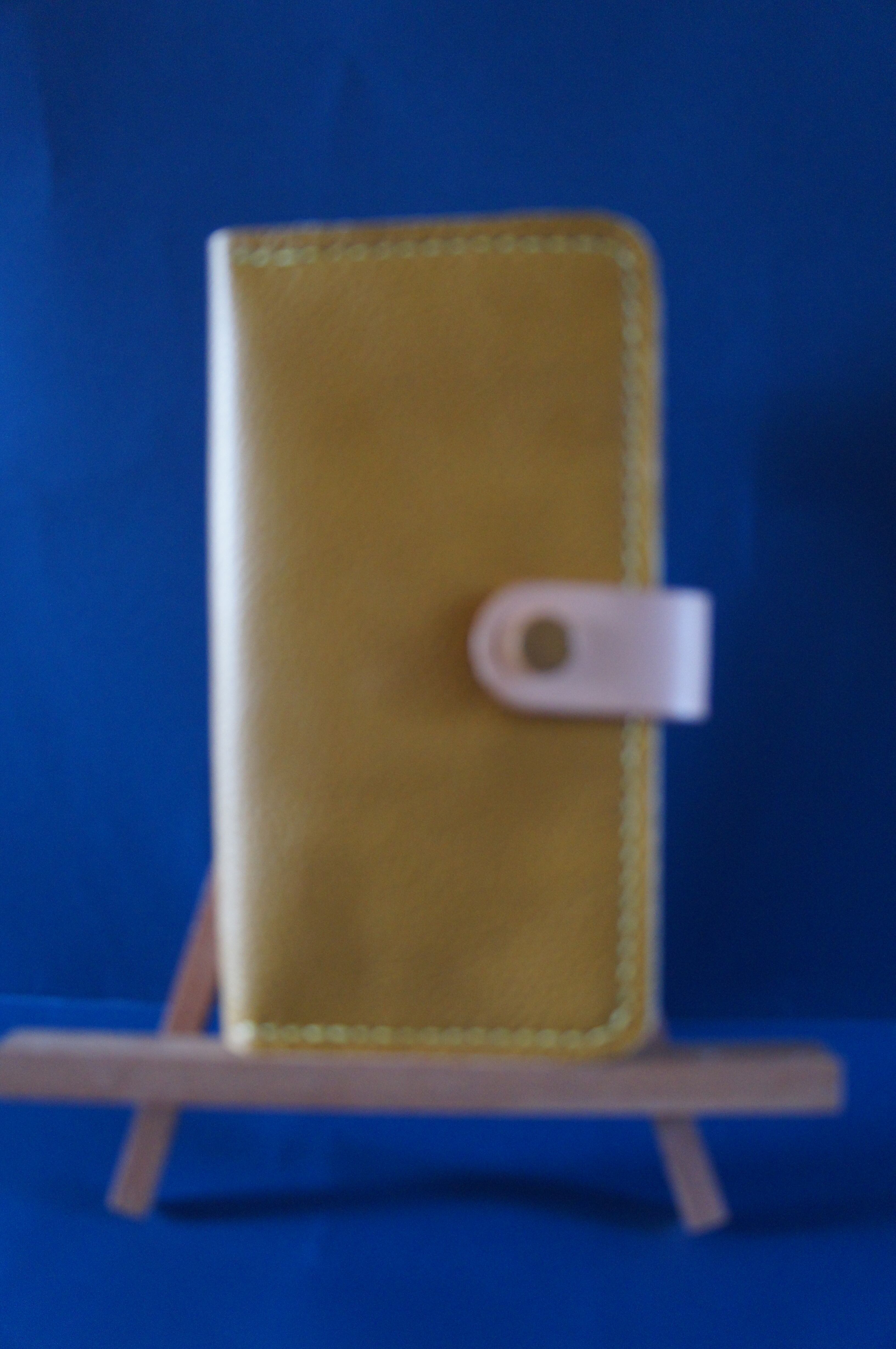 一点物です。iPhone12pro用の手帳型スマートフォンケースです。太さ1番の黄色の糸ですべて手縫いで仕上げています。2本の針で縫っていますので、ほつれにくい構造になっています。本体は1.8mmの厚さの黄土色の牛革です。内側にも同じ牛革を使っています。カードホルダーが2つあります。カードホルダー部分の裏には収納スペースがあります。スマートフォンを固定する部分は、カシメ金具5個で固定してあります。バネホック、金具の色は金色です。カメラ穴部分を固くするためには皮革硬化剤を使用しています。貼り付け部分はつるつるに磨いています。