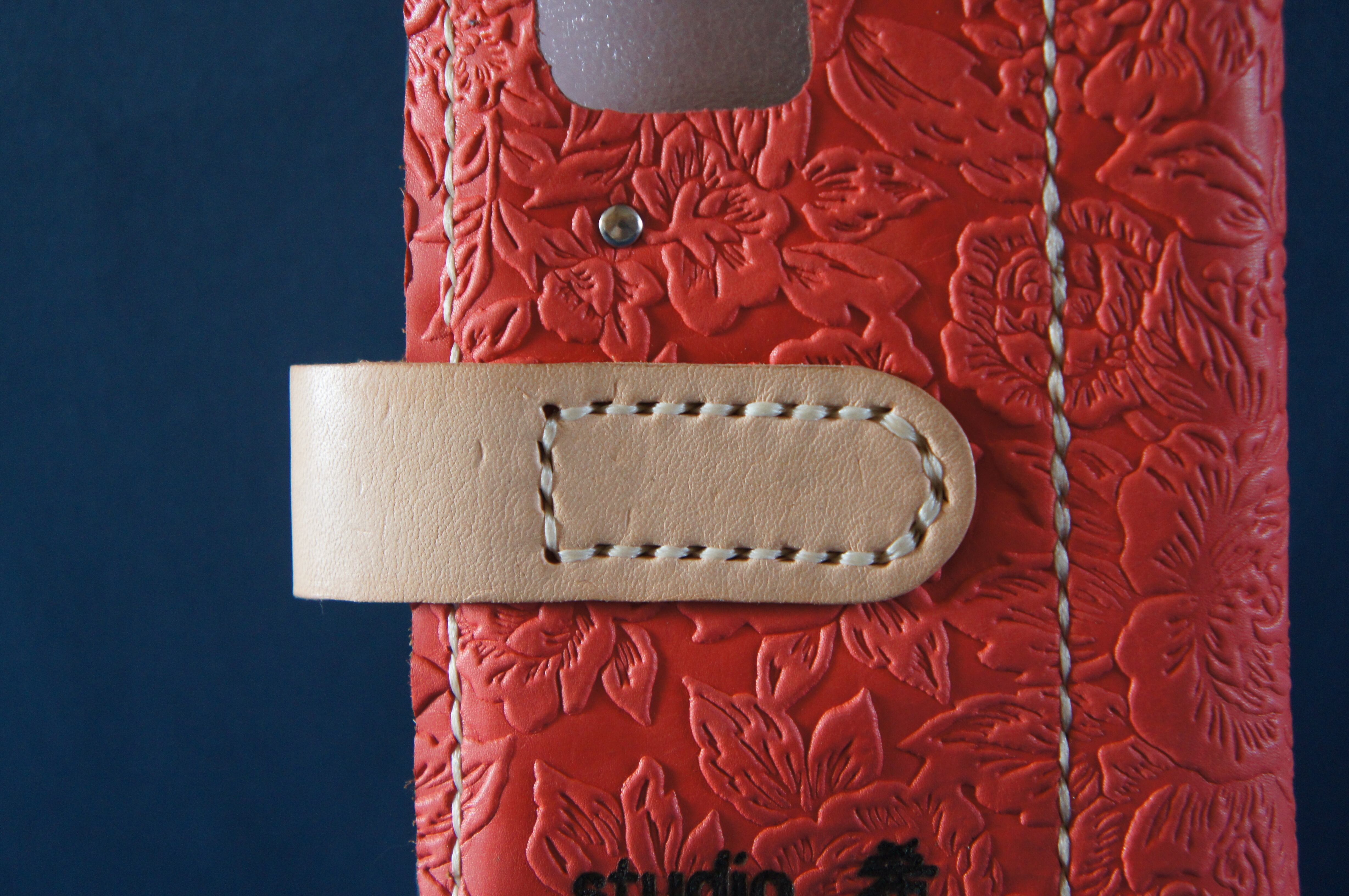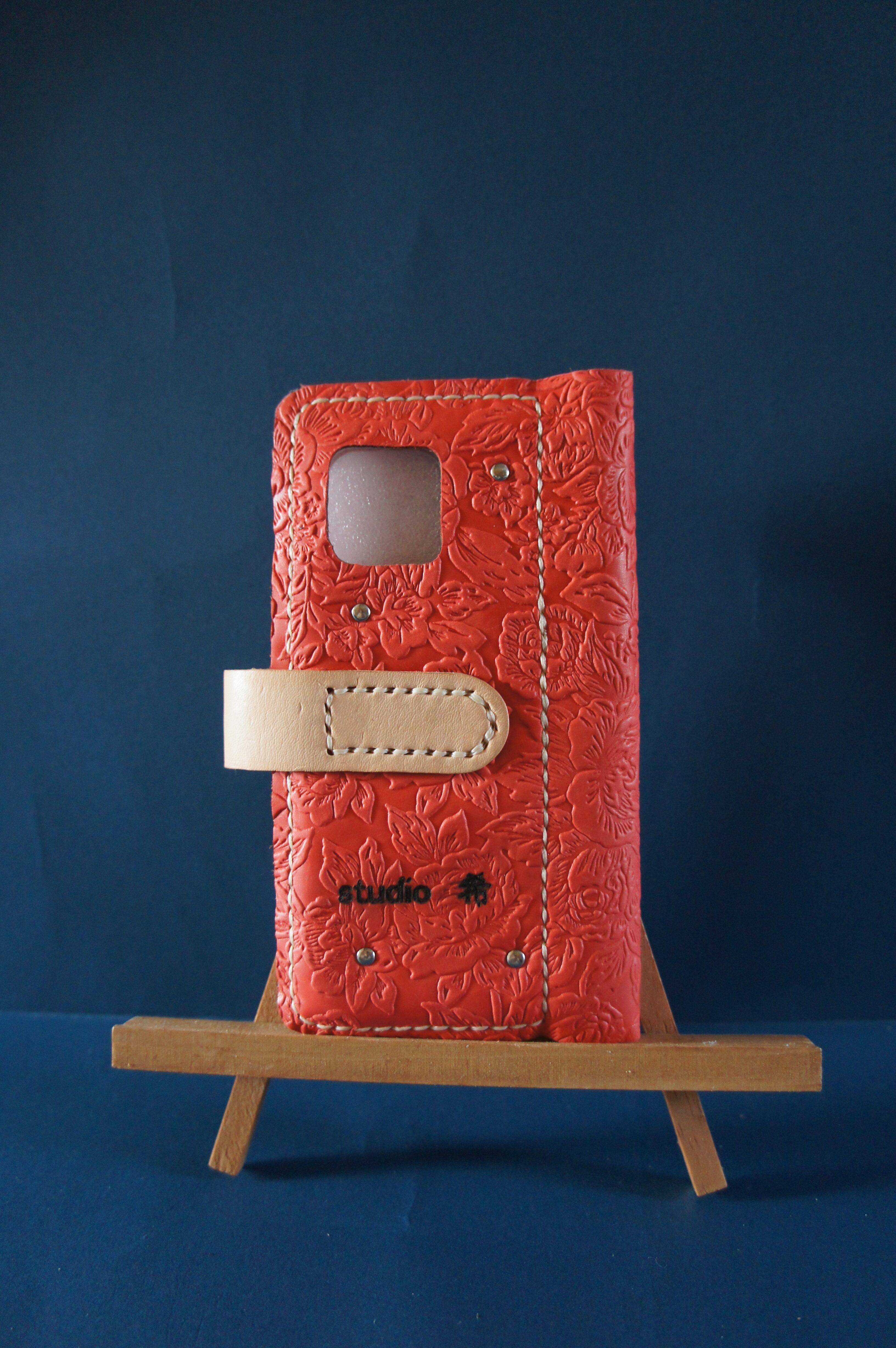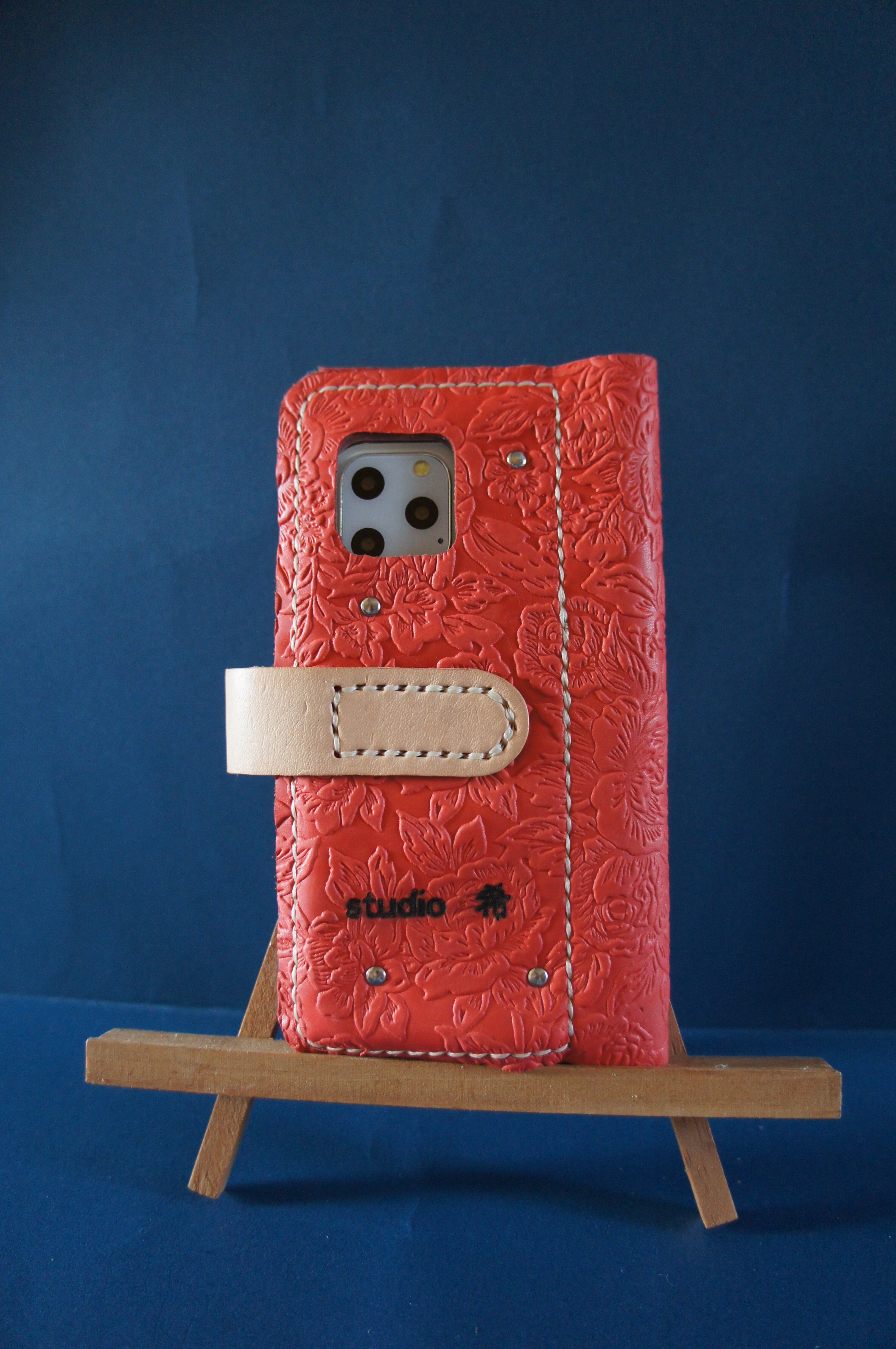 一点物です。iPhone12pro用の手帳型スマートフォンケースです。太さ1番の白色の糸ですべて手縫いで仕上げています。2本の針で縫っていますので、ほつれにくい構造になっています。本体は1.2mmの厚さの花柄型押しの朱色の牛革です。内側には厚さ0.8mmの水牛の革を使っています。カードホルダーが2つあります。カードホルダー部分の裏には収納スペースがあります。スマートフォンを固定する部分は、カシメ金具4個で固定してあります。バネホック、金具の色は銀色です。カメラ穴部分を固くするためには皮革硬化剤を使用しています。貼り付け部分はつるつるに磨いています。