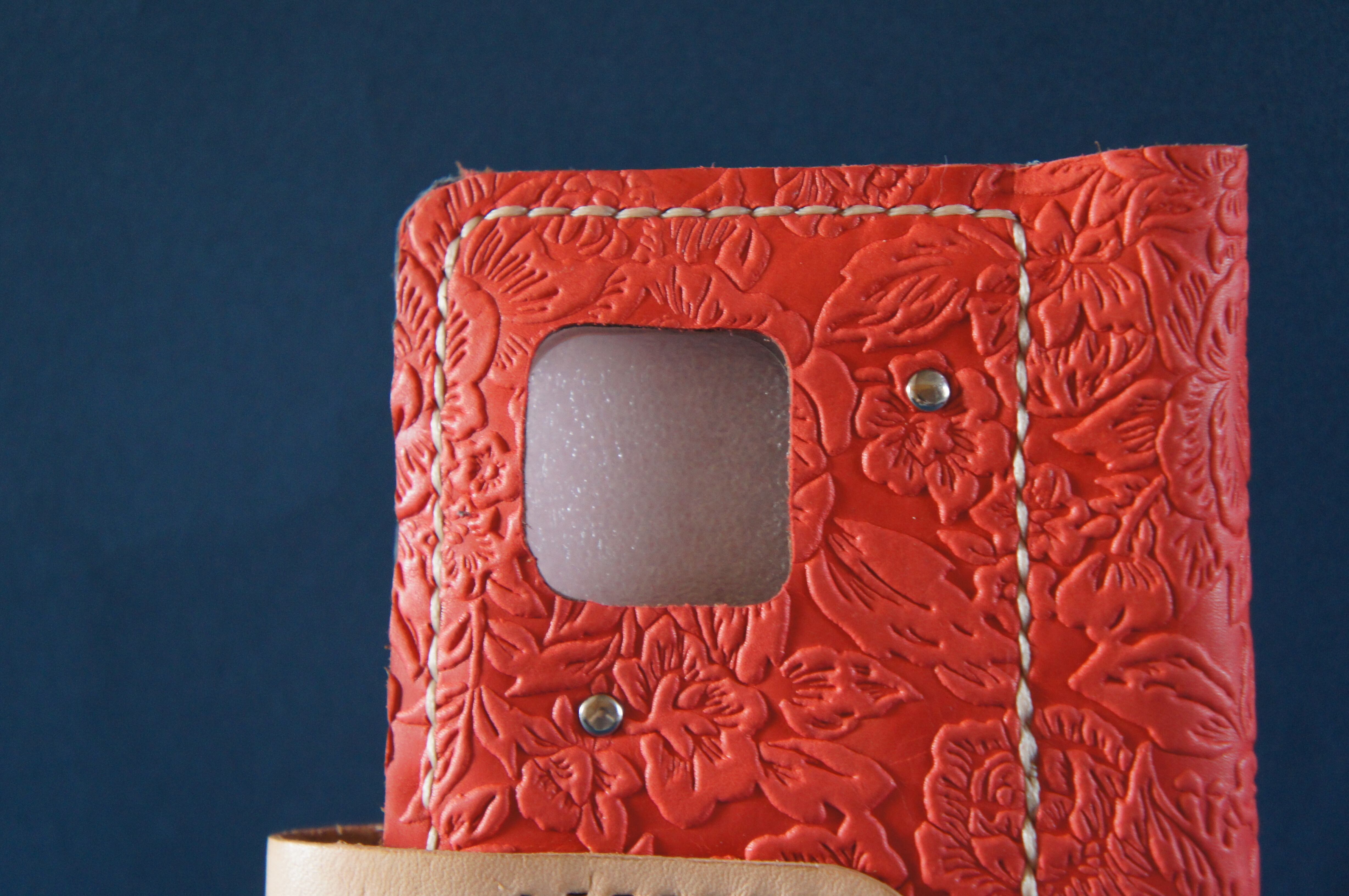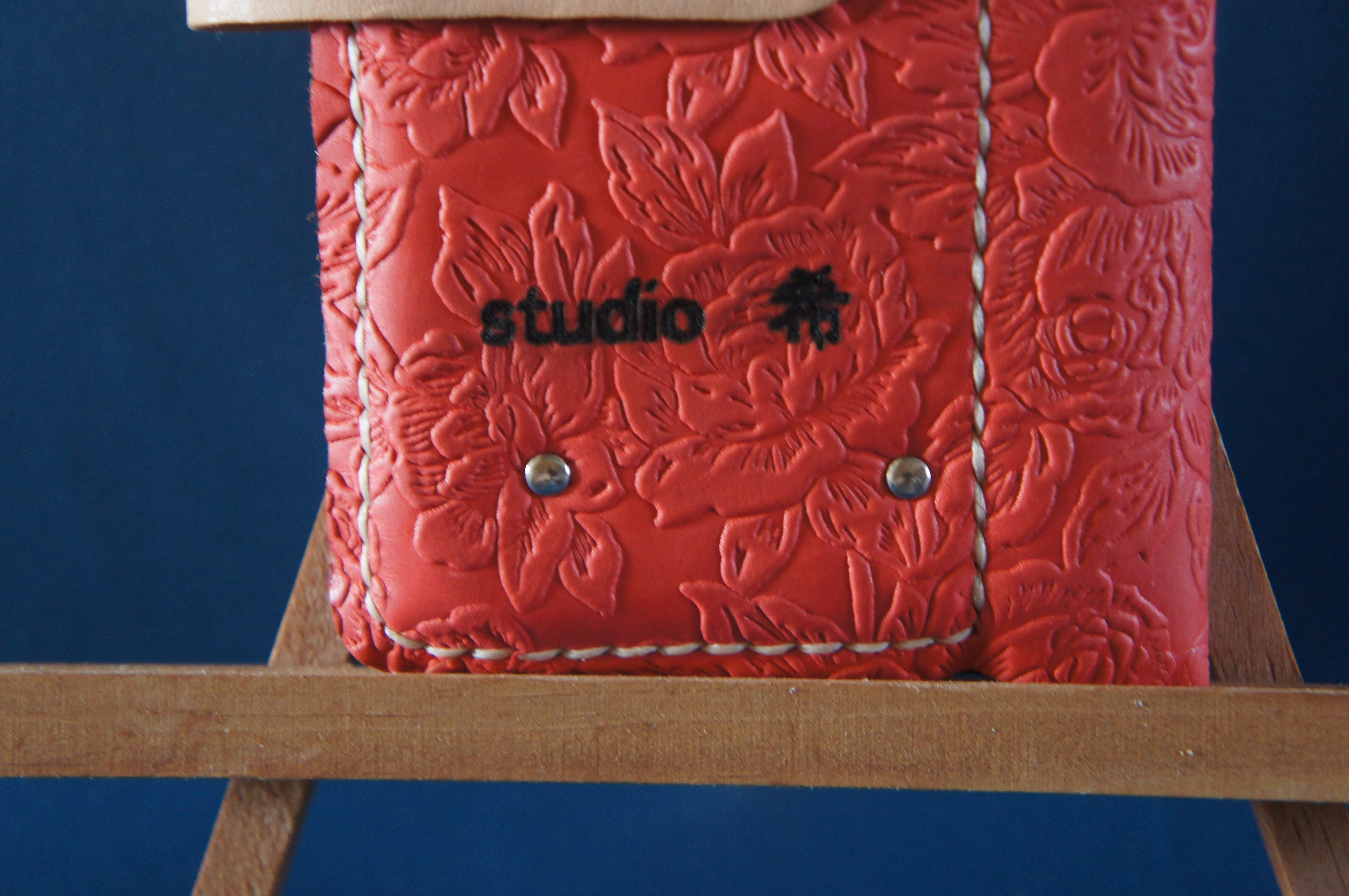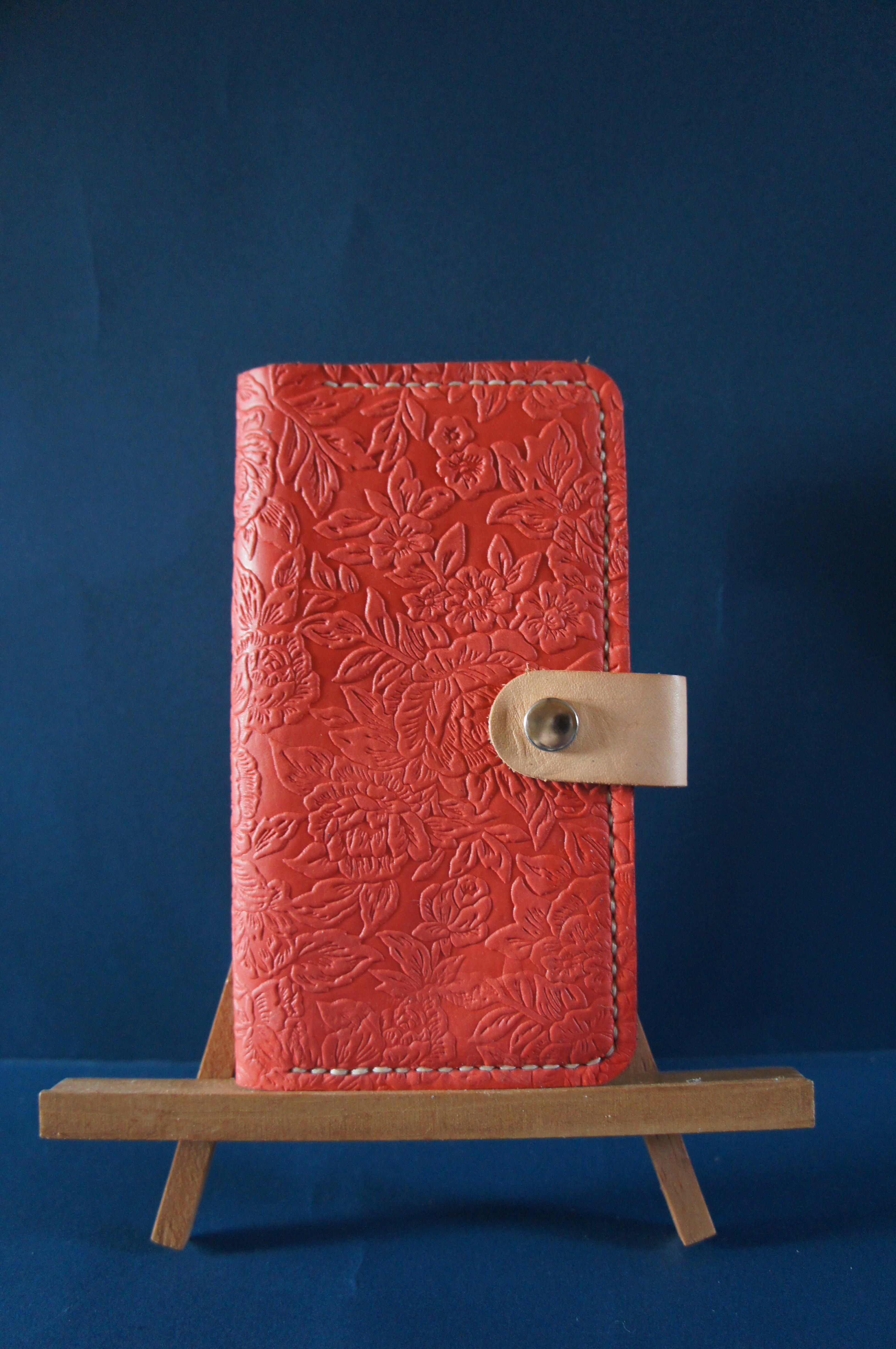 一点物です。iPhone12pro用の手帳型スマートフォンケースです。太さ1番の白色の糸ですべて手縫いで仕上げています。2本の針で縫っていますので、ほつれにくい構造になっています。本体は1.2mmの厚さの花柄型押しの朱色の牛革です。内側には厚さ0.8mmの水牛の革を使っています。カードホルダーが2つあります。カードホルダー部分の裏には収納スペースがあります。スマートフォンを固定する部分は、カシメ金具4個で固定してあります。バネホック、金具の色は銀色です。カメラ穴部分を固くするためには皮革硬化剤を使用しています。貼り付け部分はつるつるに磨いています。