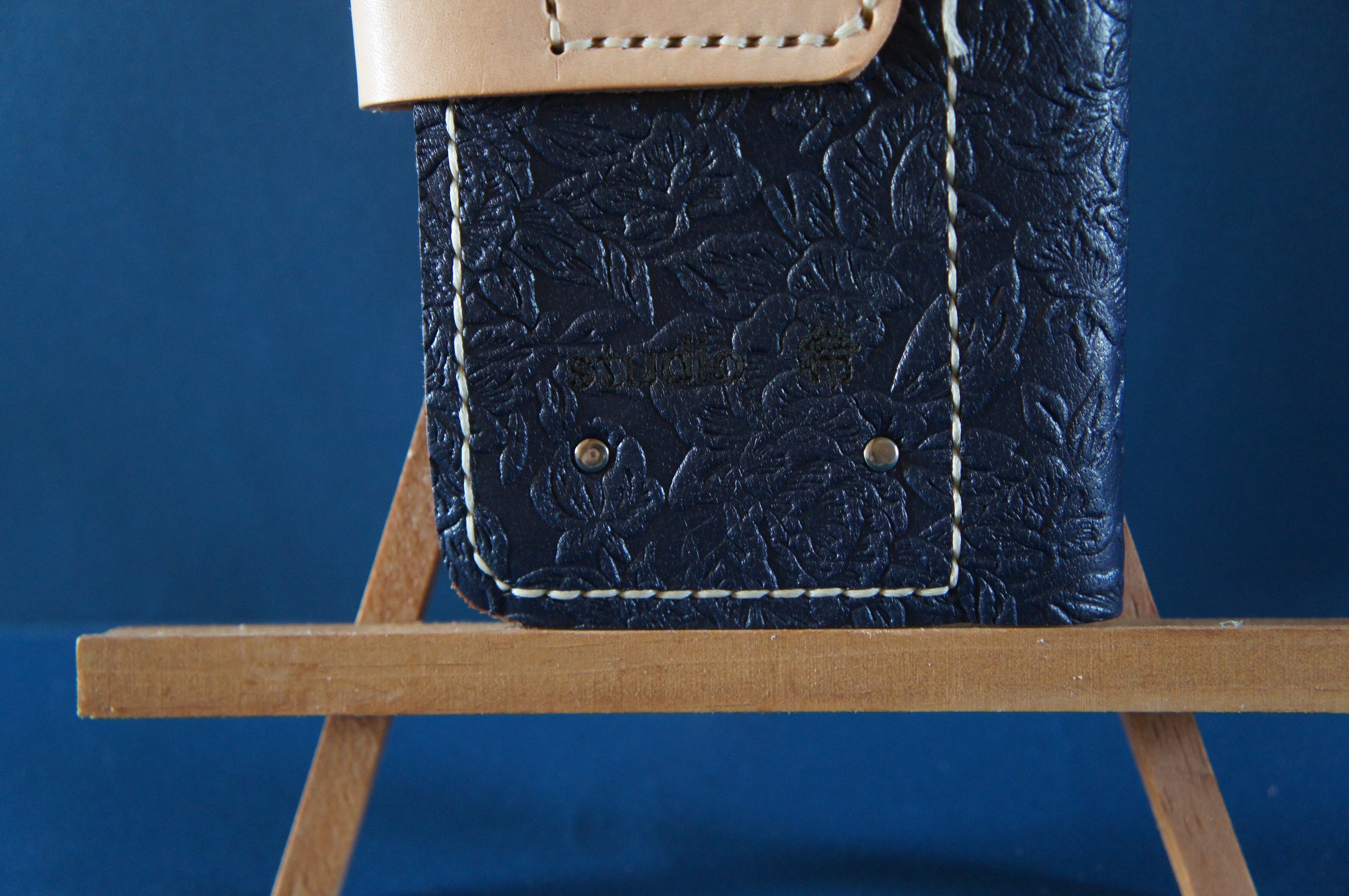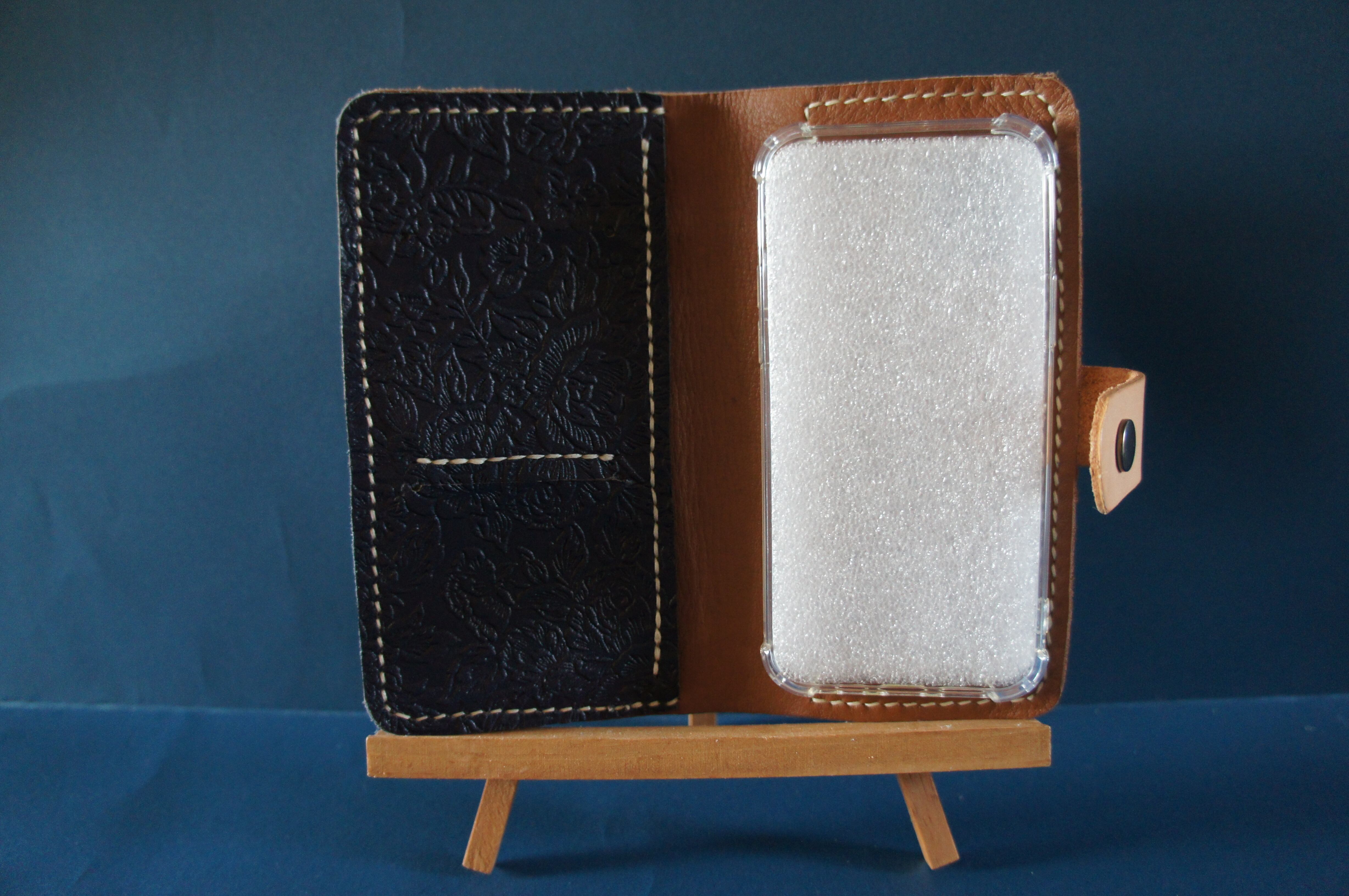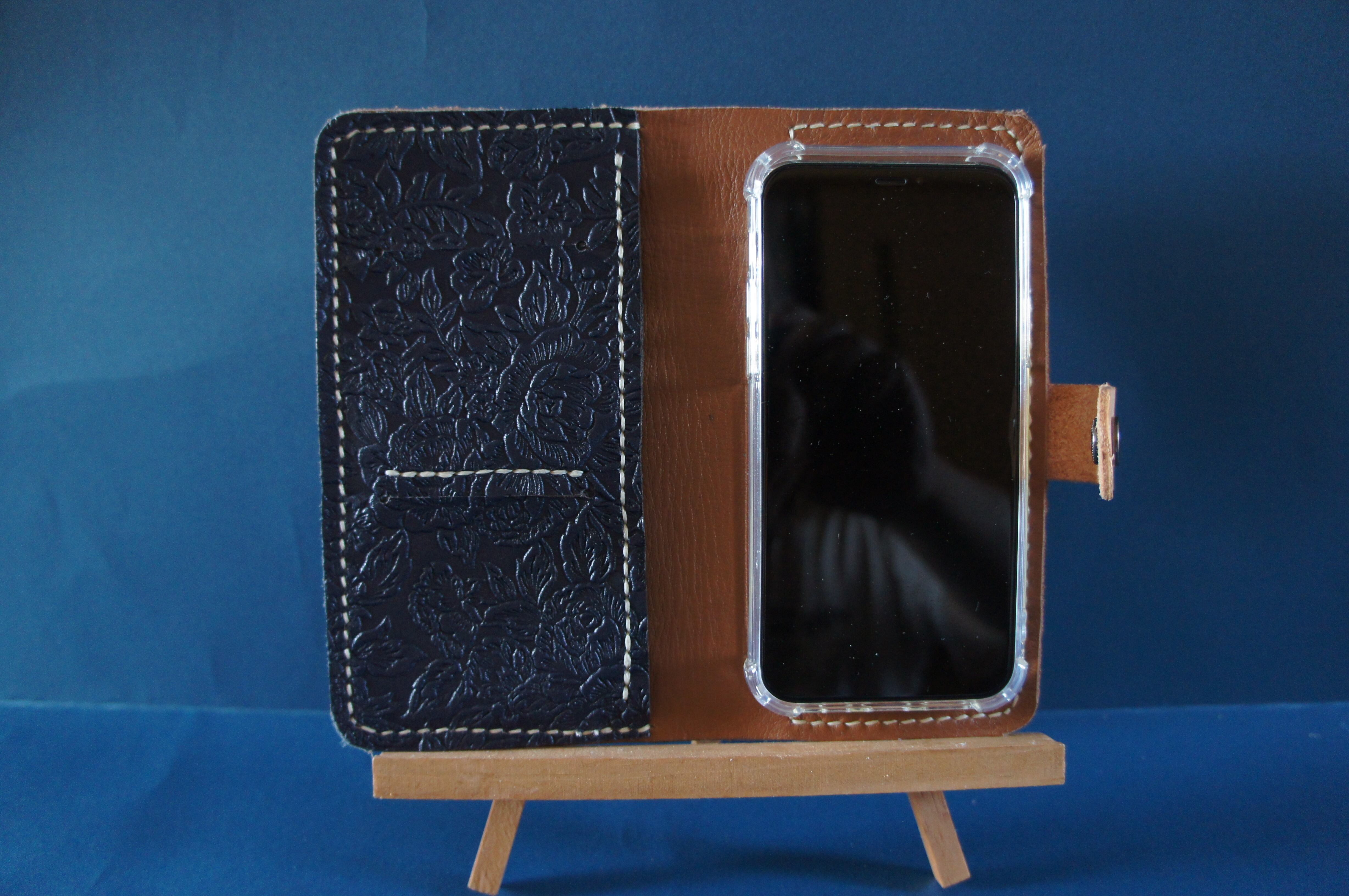 一点物です。iPhone12pro用の手帳型スマートフォンケースです。太さ1番の白色の糸ですべて手縫いで仕上げています。2本の針で縫っていますので、ほつれにくい構造になっています。本体は1.5mmの厚さの花柄型押しの紺色の牛革です。内側には厚さ0.8mmの水牛の革を使っています。カードホルダーが2つあります。カードホルダー部分の裏には収納スペースがあります。スマートフォンを固定する部分は、カシメ金具5個で固定してあります。バネホック、金具の色は銀色です。カメラ穴部分を固くするためには皮革硬化剤を使用しています。貼り付け部分はつるつるに磨いています。