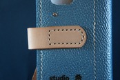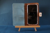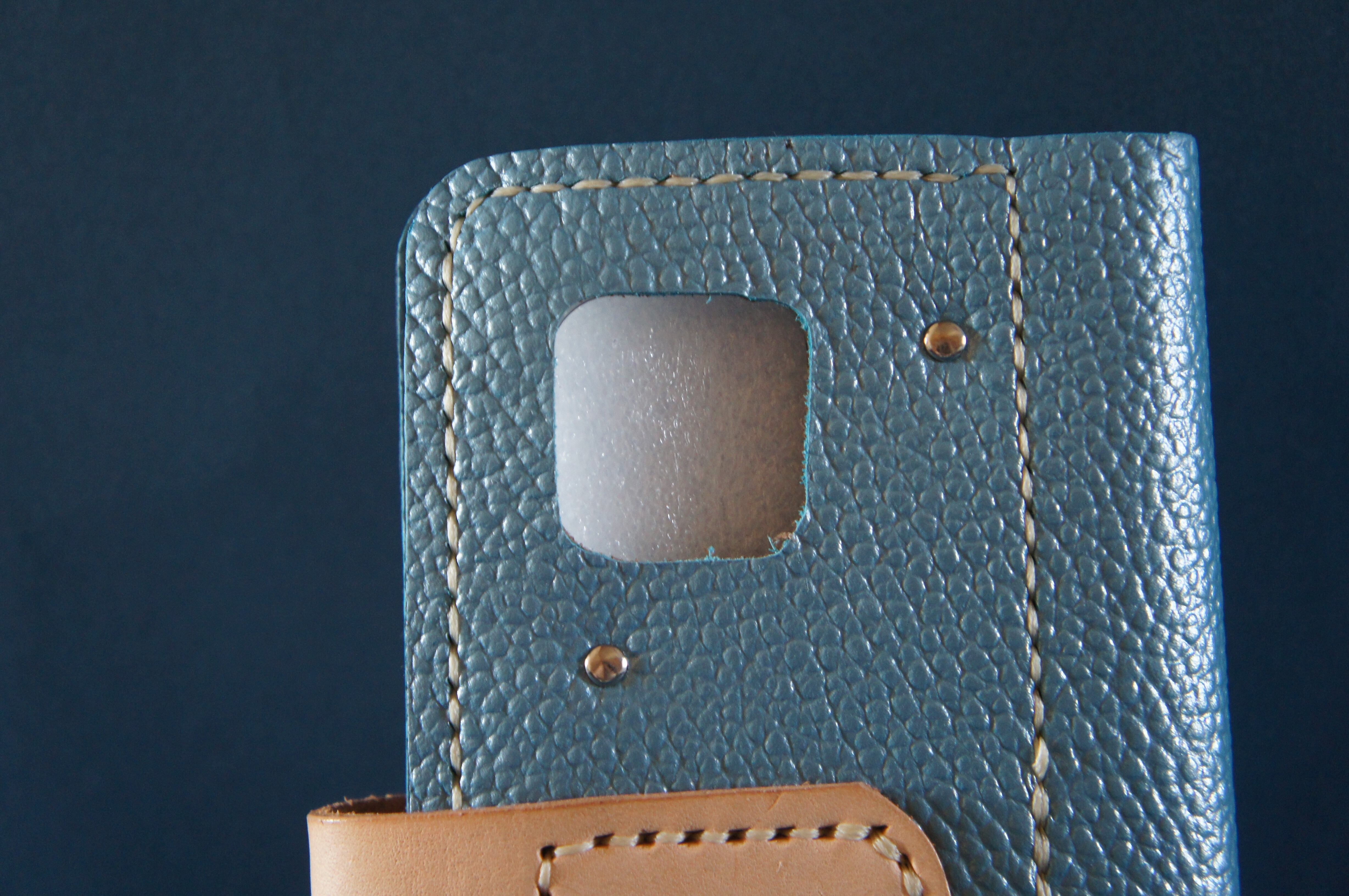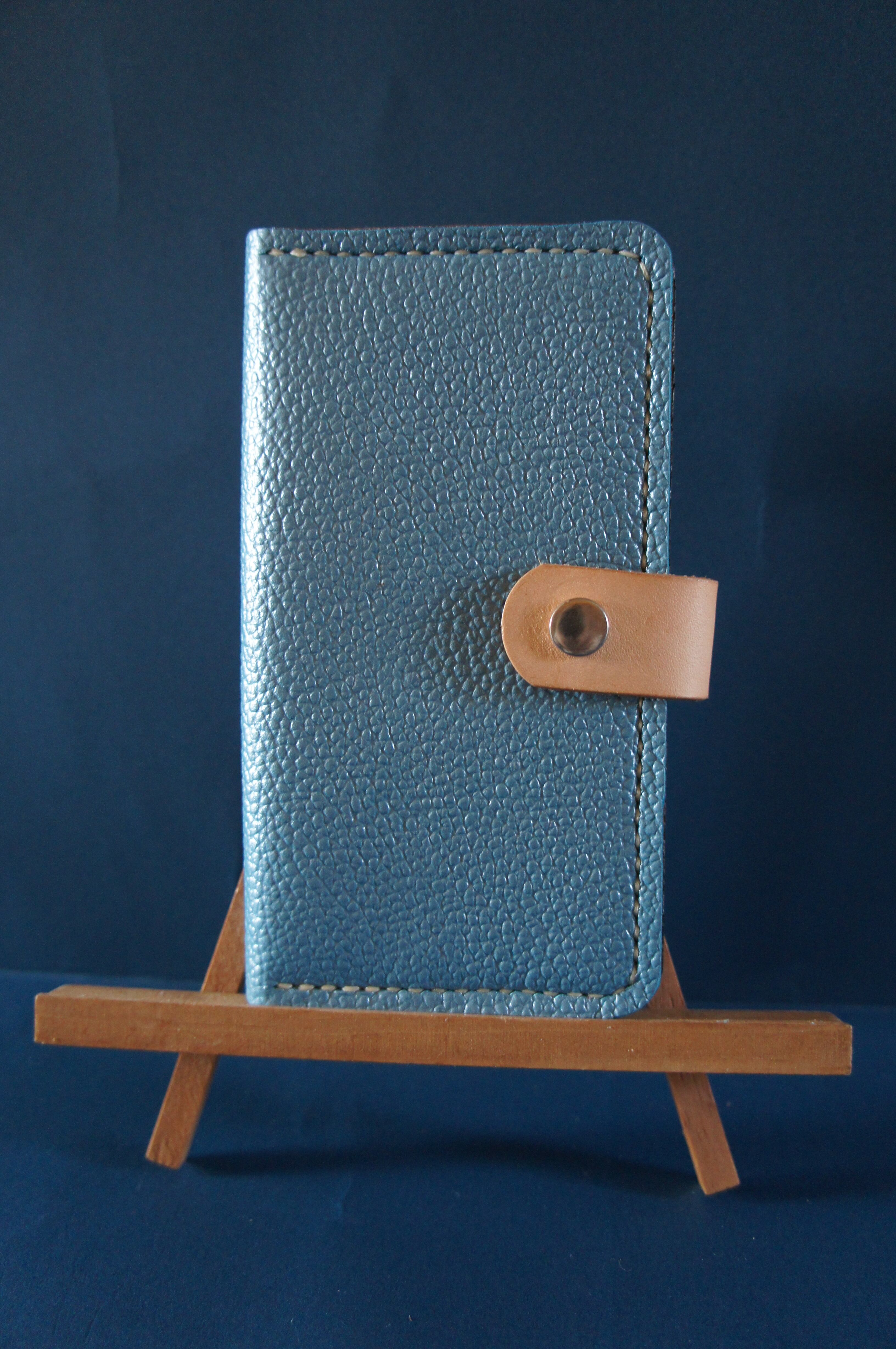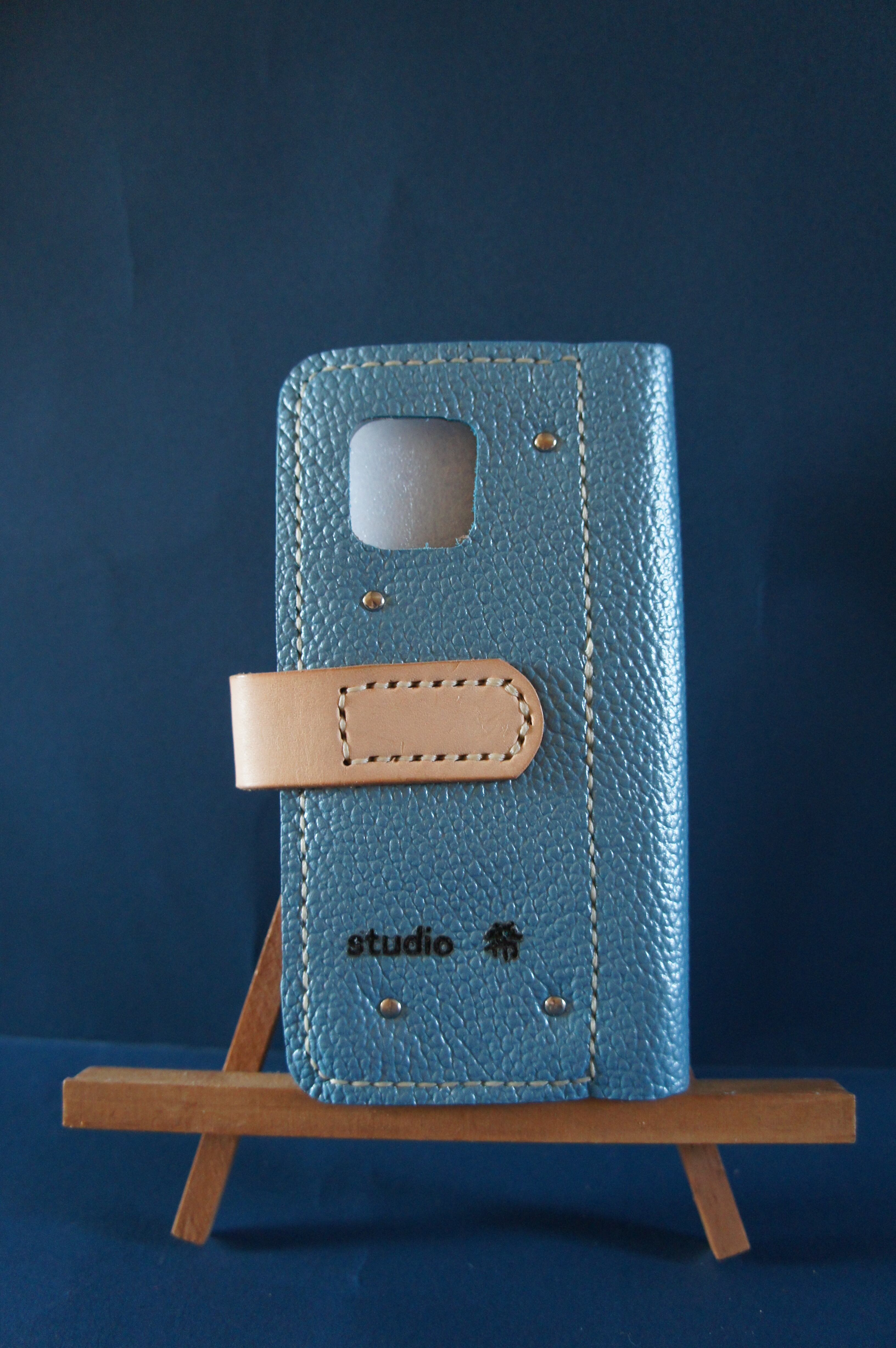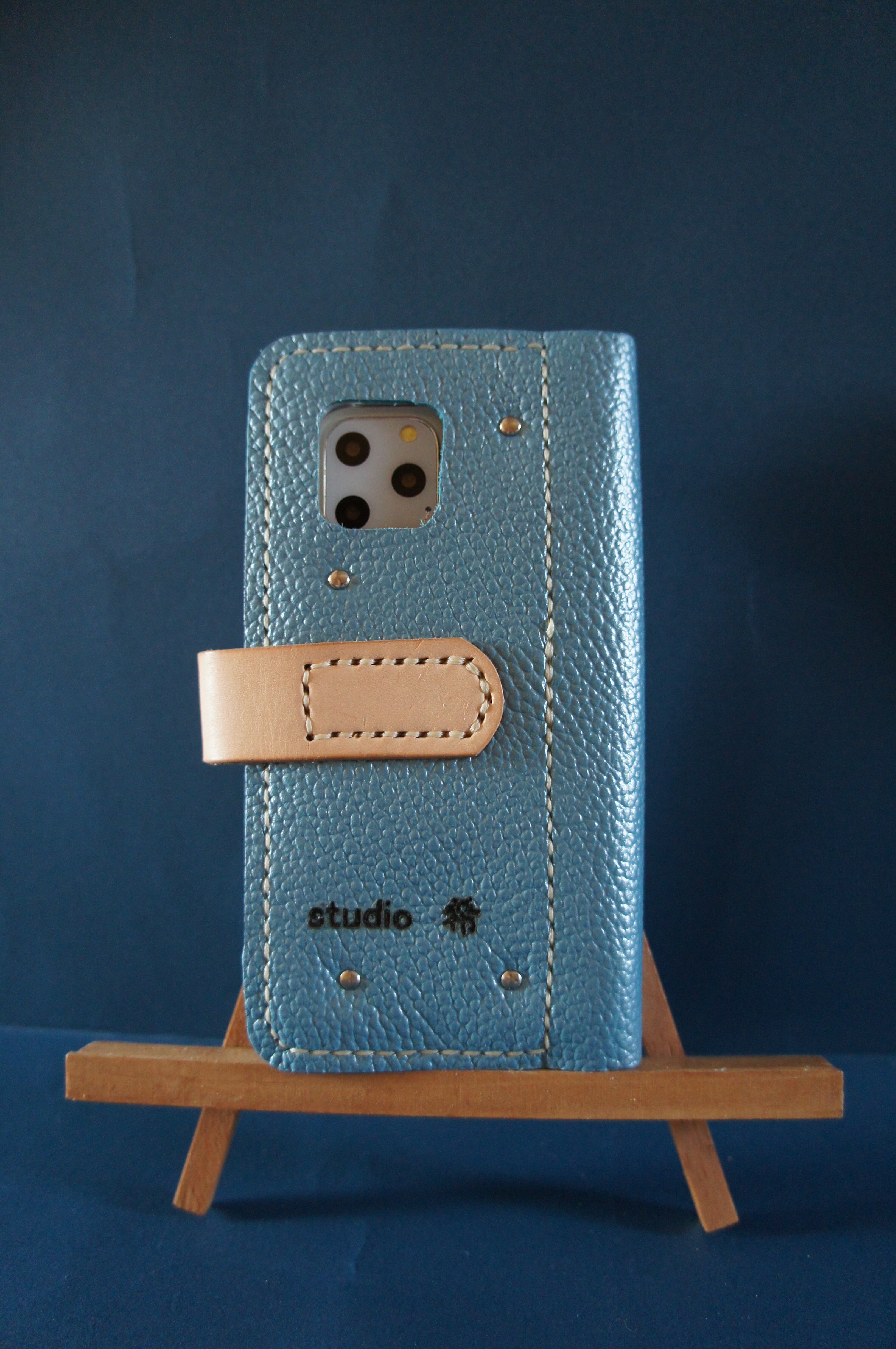 一点物です。iPhone12pro用の手帳型スマートフォンケースです。太さ1番の白色の糸ですべて手縫いで仕上げています。2本の針で縫っていますので、ほつれにくい構造になっています。本体は1.8mmの厚さの水色のシュリンクの牛革です。内側には厚さ0.8mmの水牛の革を使っています。カードホルダーが2つあります。カードホルダー部分の裏には収納スペースがあります。スマートフォンを固定する部分は、カシメ金具4個で固定してあります。バネホック、金具の色は銀色です。カメラ穴部分を固くするためには皮革硬化剤を使用しています。貼り付け部分はつるつるに磨いています。