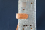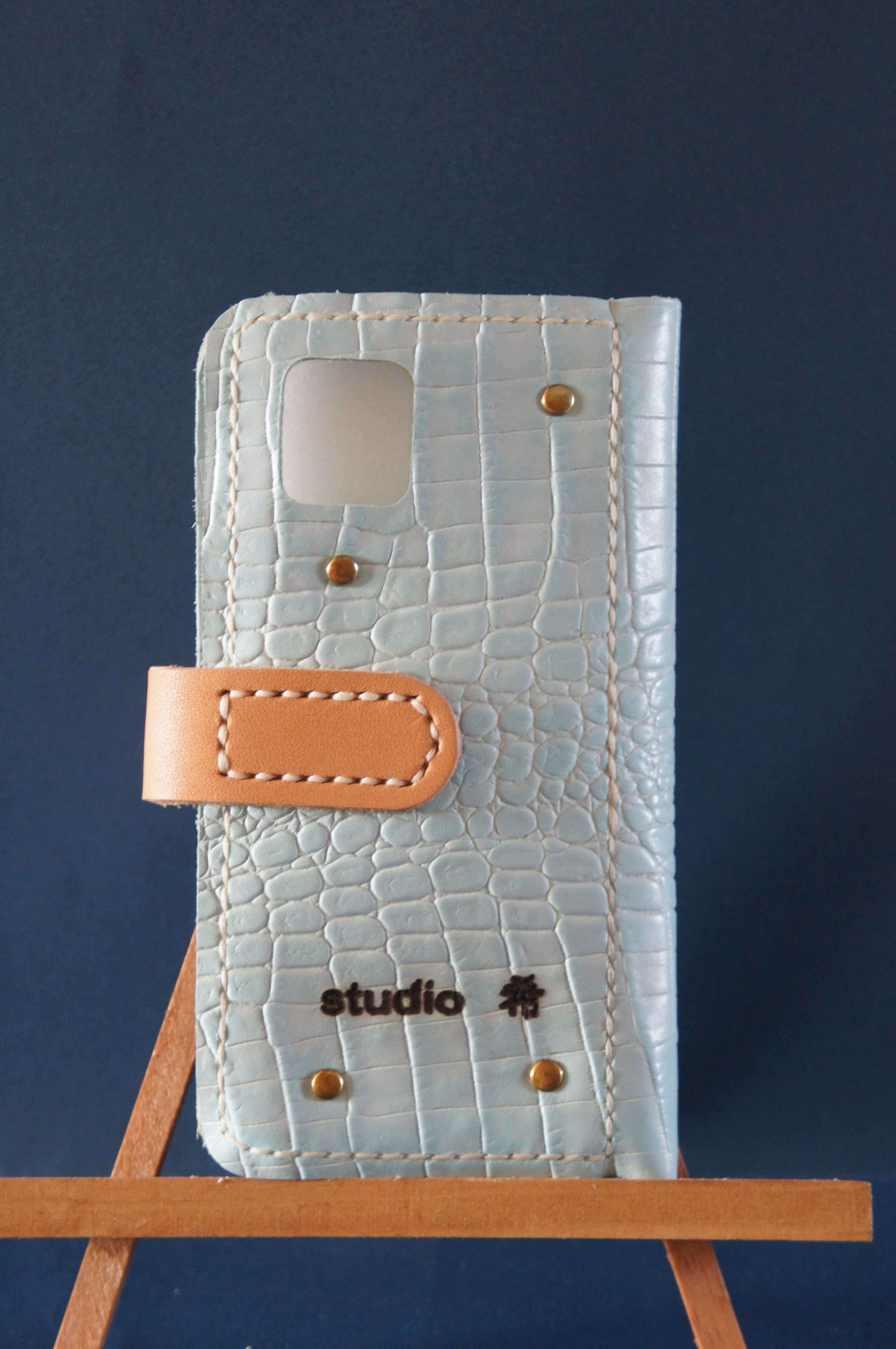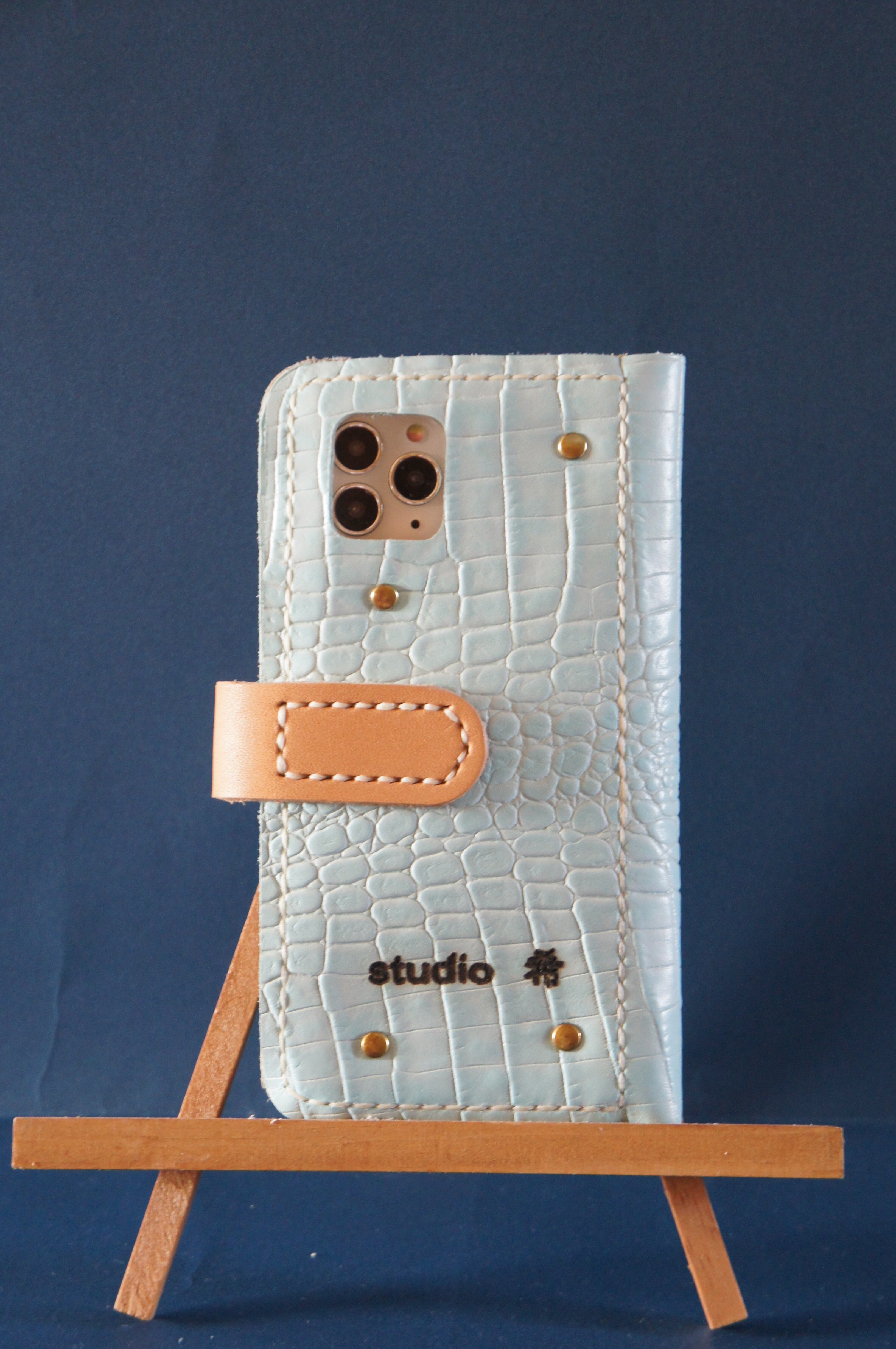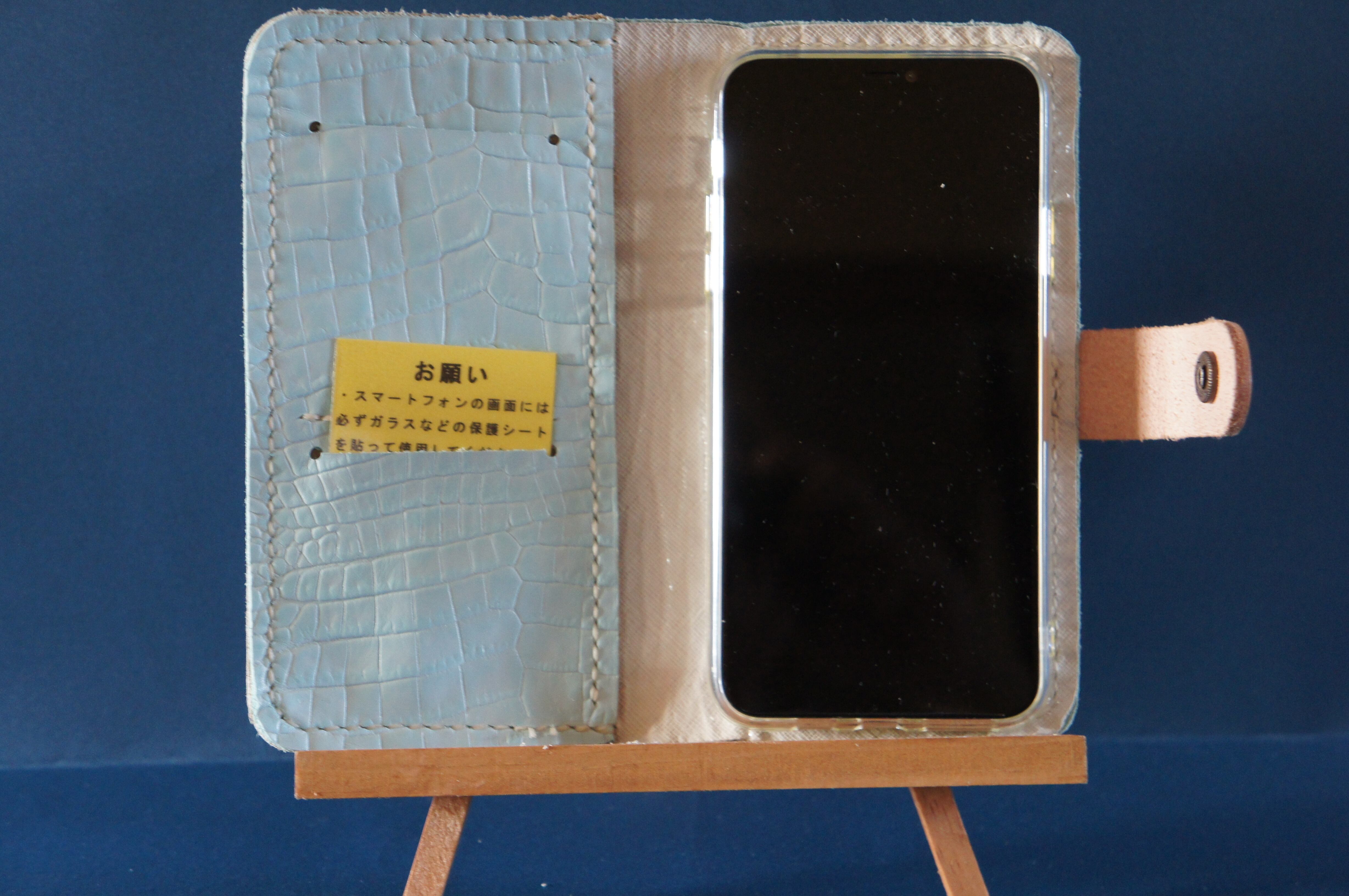 一点物です。iPhone11promax用の手帳型スマートフォンケースです。本体、内側、カードホルダー、ホルダー裏の合計4枚の革を縫い合わせています。太さ1番の白色の糸ですべて手縫いで仕上げています。2本の針で縫っていますので、ほつれにくい構造になっています。本体は1.5mmの厚さの蛇型押しの水色の牛革です。内側には厚さ0.8mmの白色の牛革を使っています。カードホルダーが2つあります。カードホルダー部分の裏には収納スペースがあります。スマートフォンを固定する部分は、カシメ金具4個で固定してあります。バネホック、金具の色は銅色です。カメラ穴部分を固くするためには皮革硬化剤を使用しています。貼り付け部分はつるつるに磨いています。