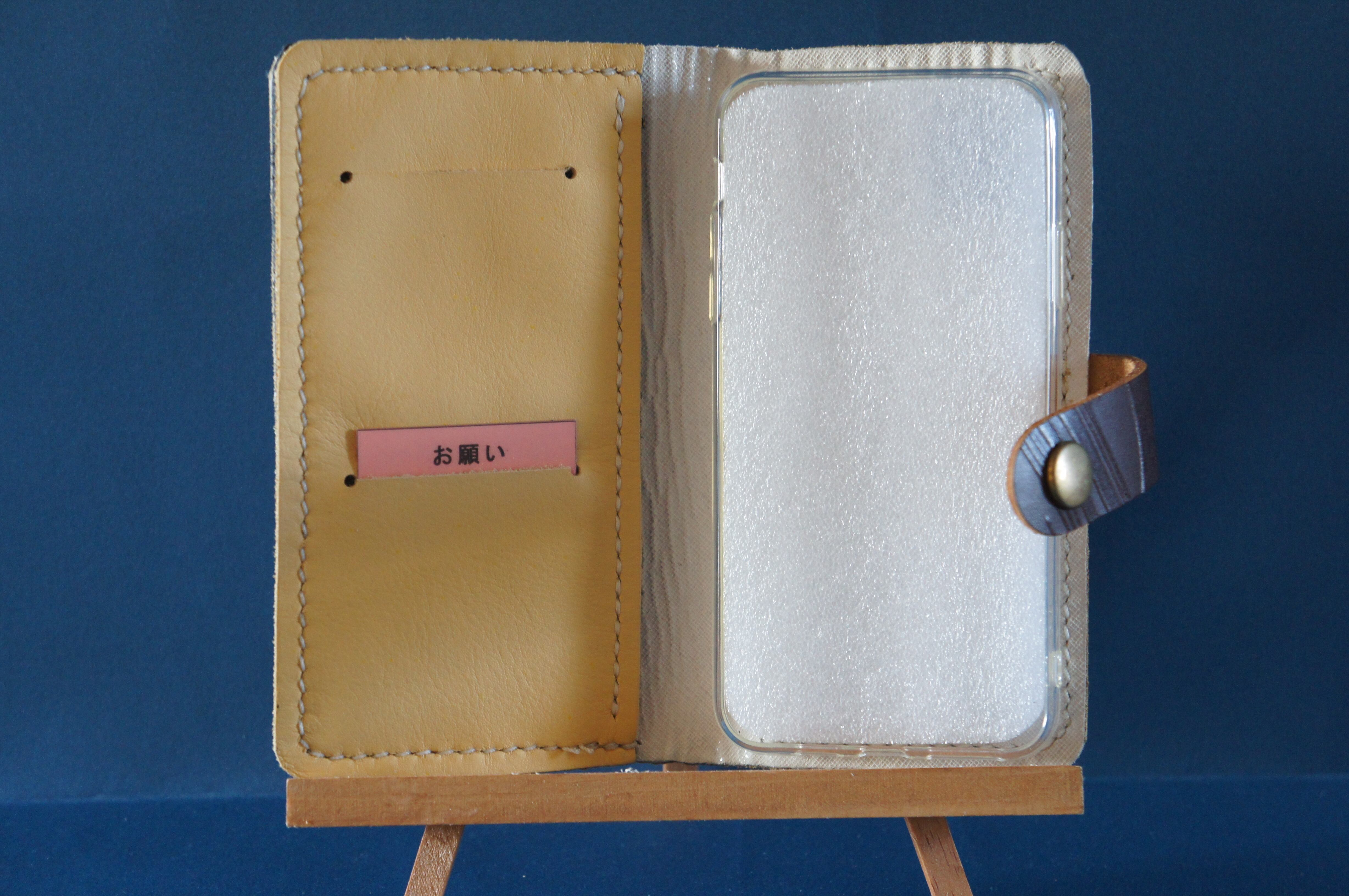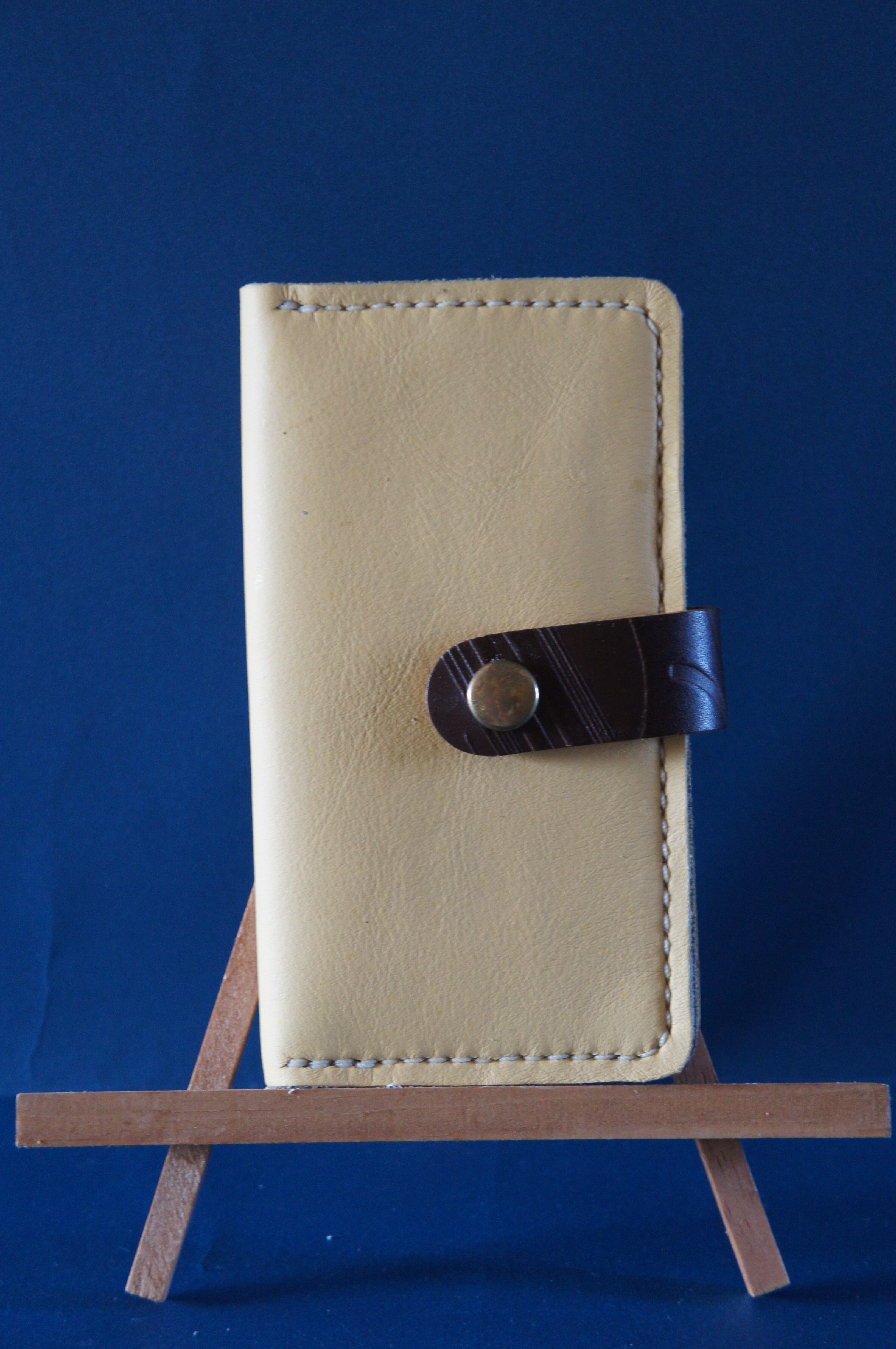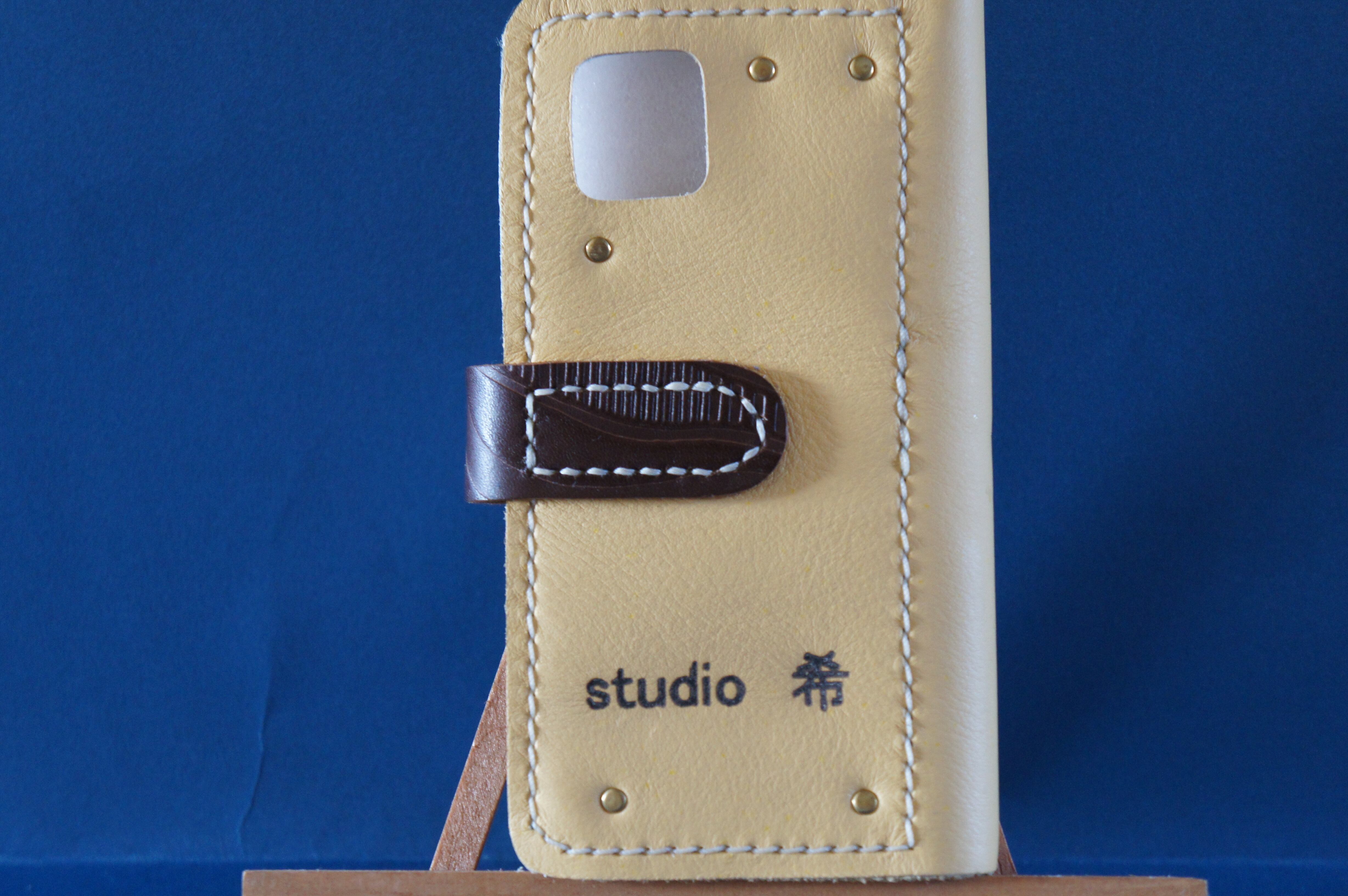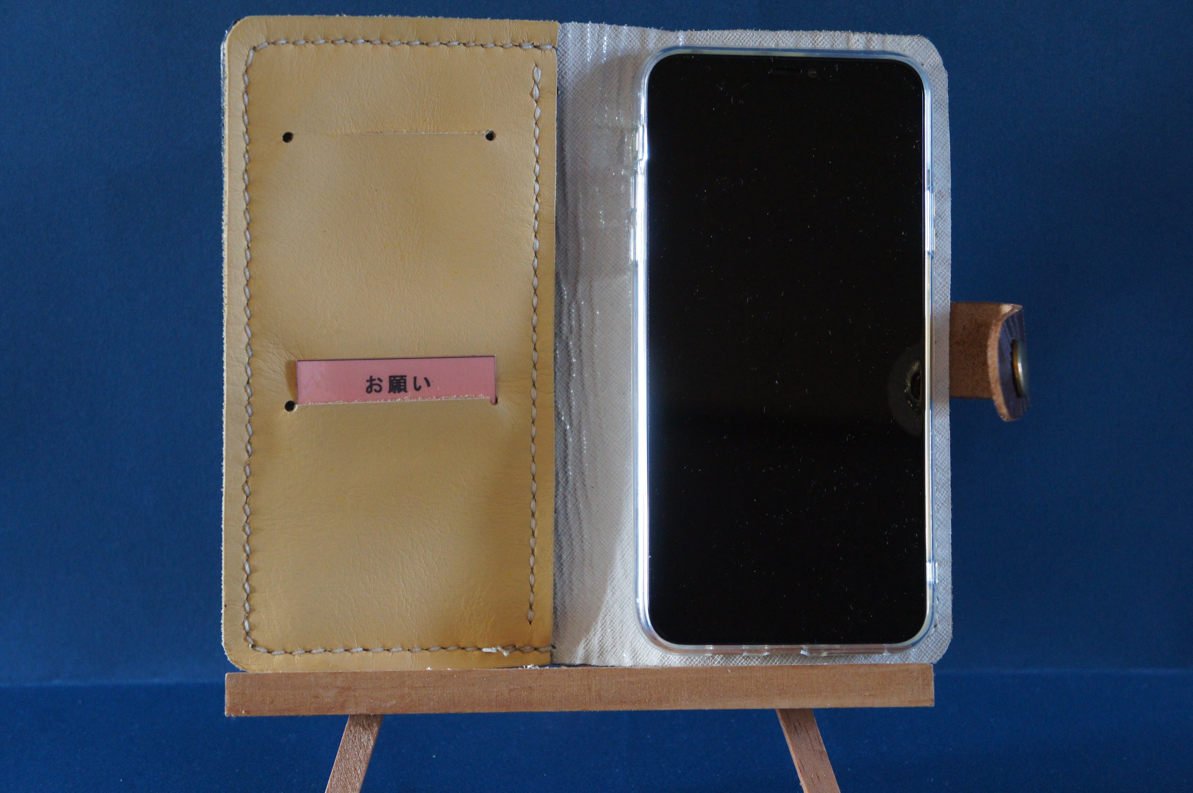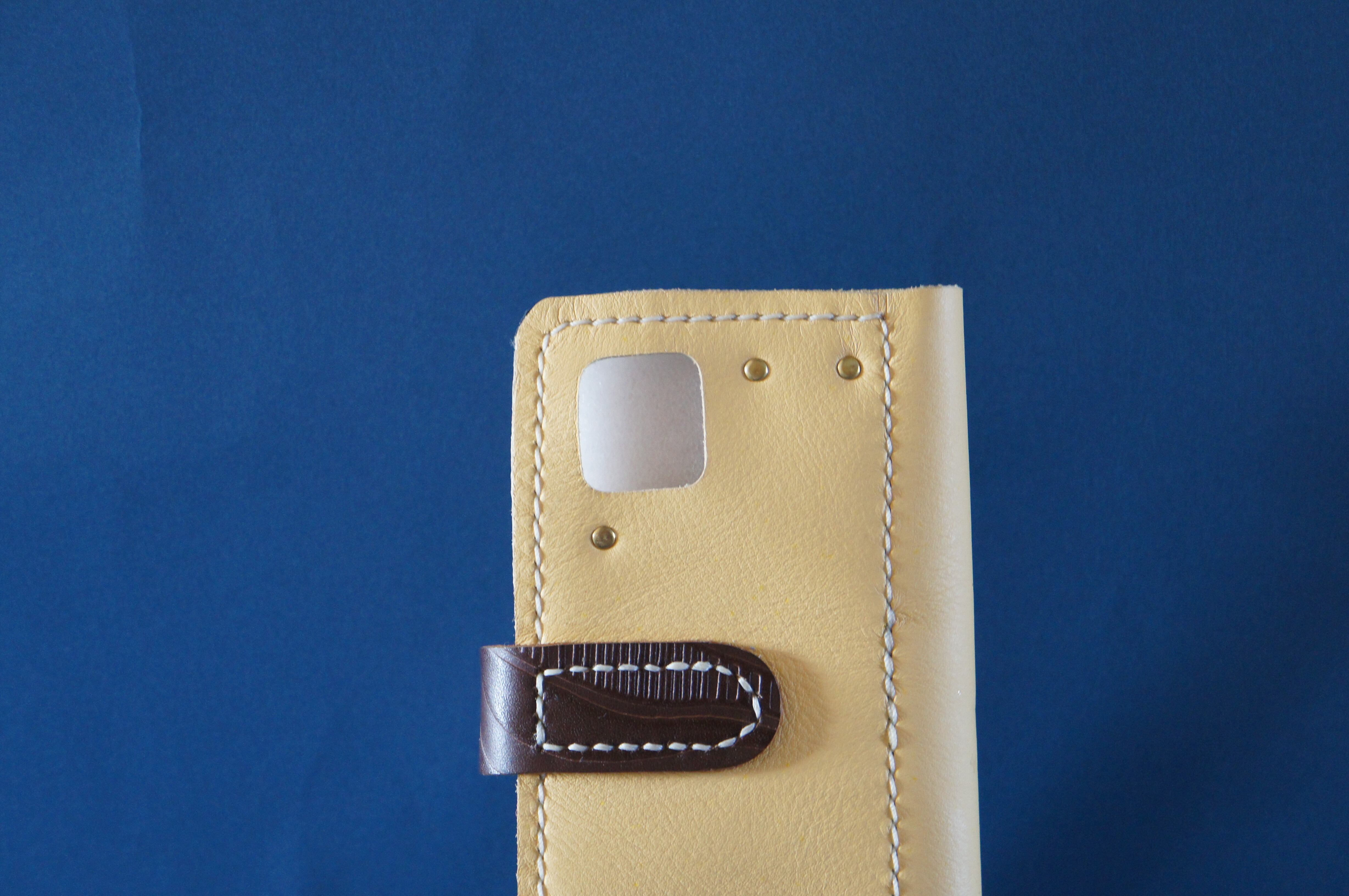 一点物です。iPhone11promax用の手帳型スマートフォンケースです。本体、内側、カードホルダー、ホルダー裏の合計4枚の革を縫い合わせています。太さ1番の白色の糸ですべて手縫いで仕上げています。2本の針で縫っていますので、ほつれにくい構造になっています。本体は1.5mmの厚さのクリーム色のソフトな牛革です。内側には厚さ0.8mmの白色の牛革を使っています。カードホルダーが2つあります。カードホルダー部分の裏には収納スペースがあります。スマートフォンを固定する部分は、カシメ金具5個で固定してあります。バネホック、金具の色は金色です。カメラ穴部分を固くするためには皮革硬化剤を使用しています。貼り付け部分はつるつるに磨いています。
