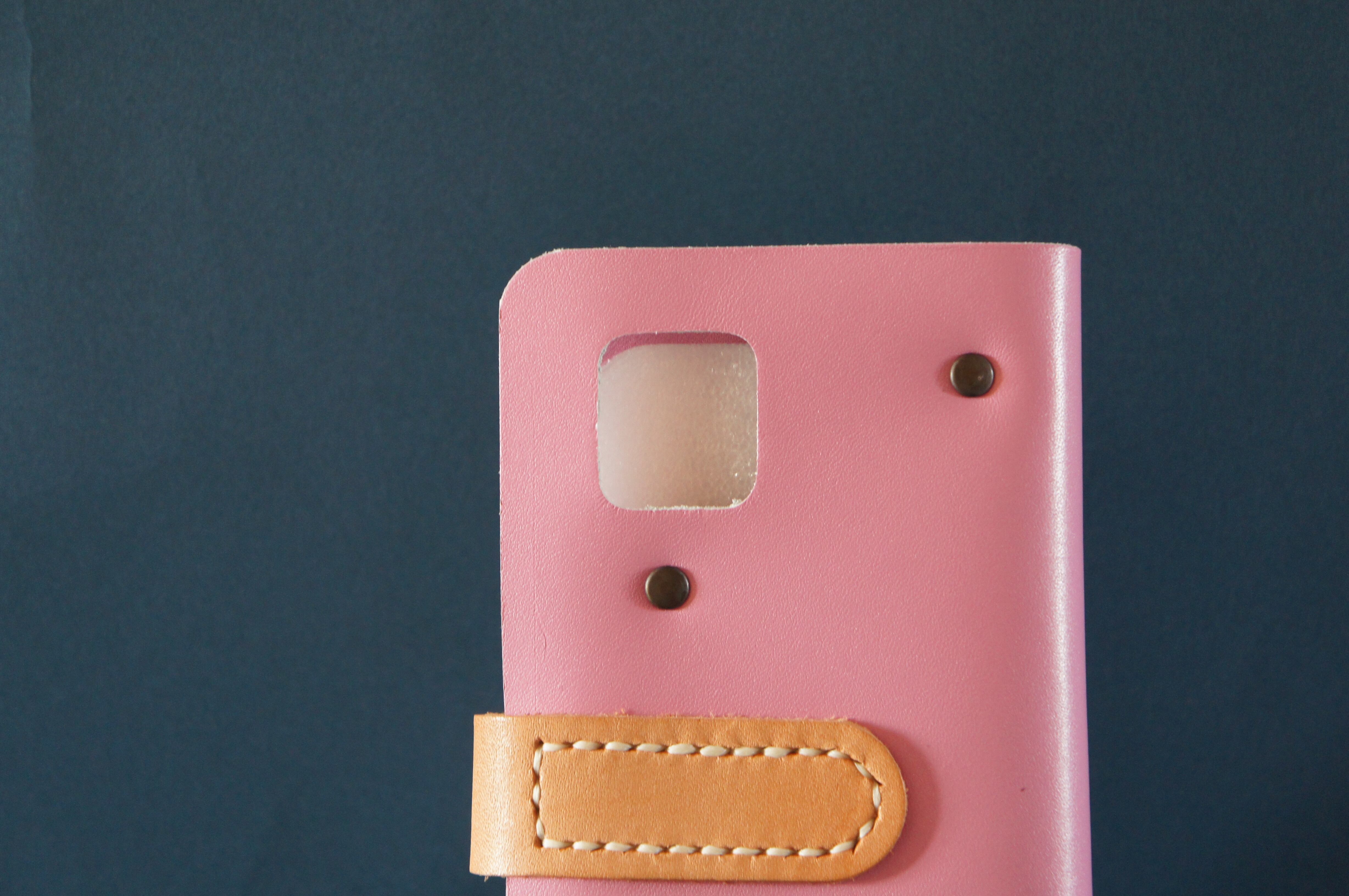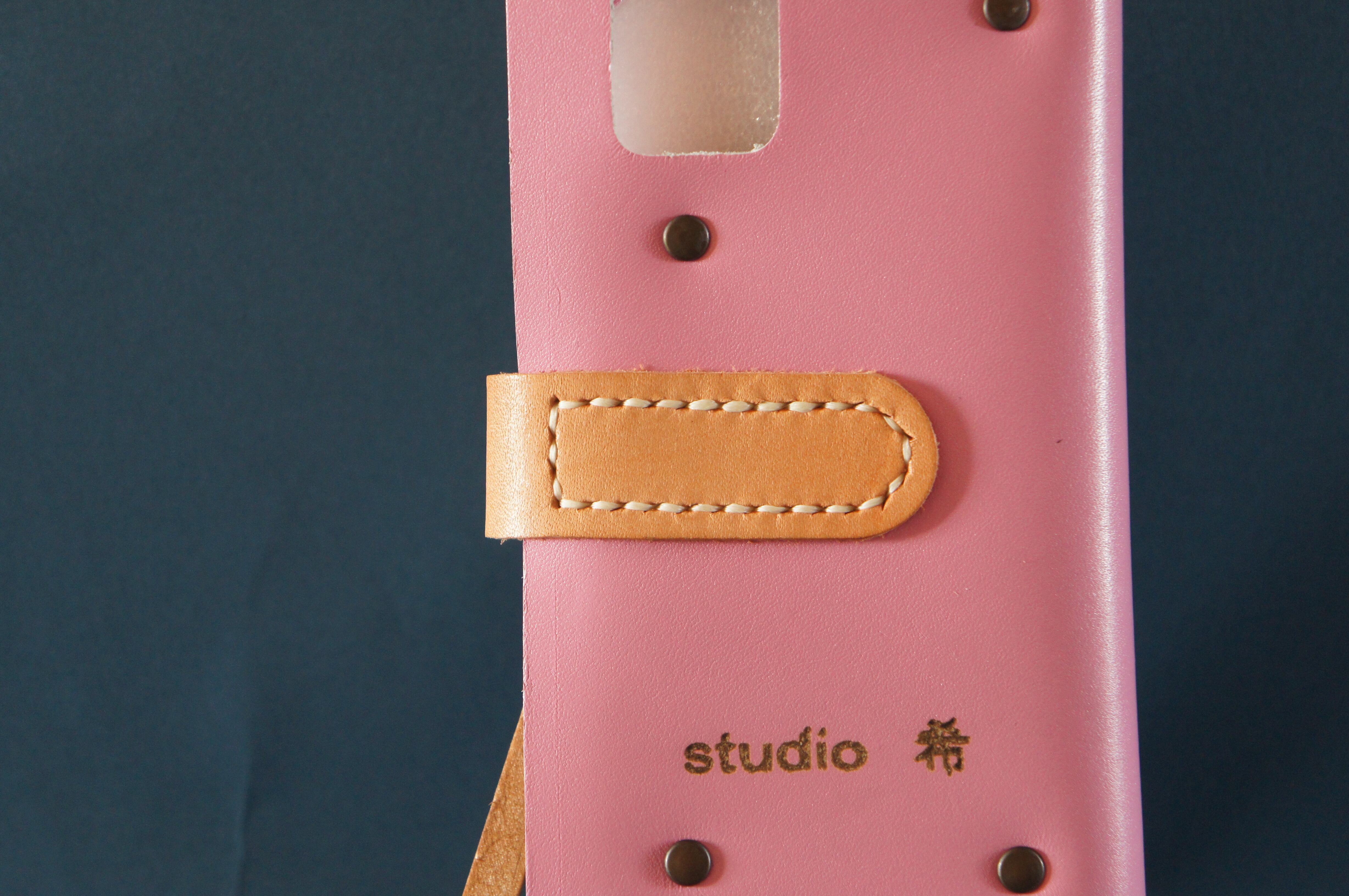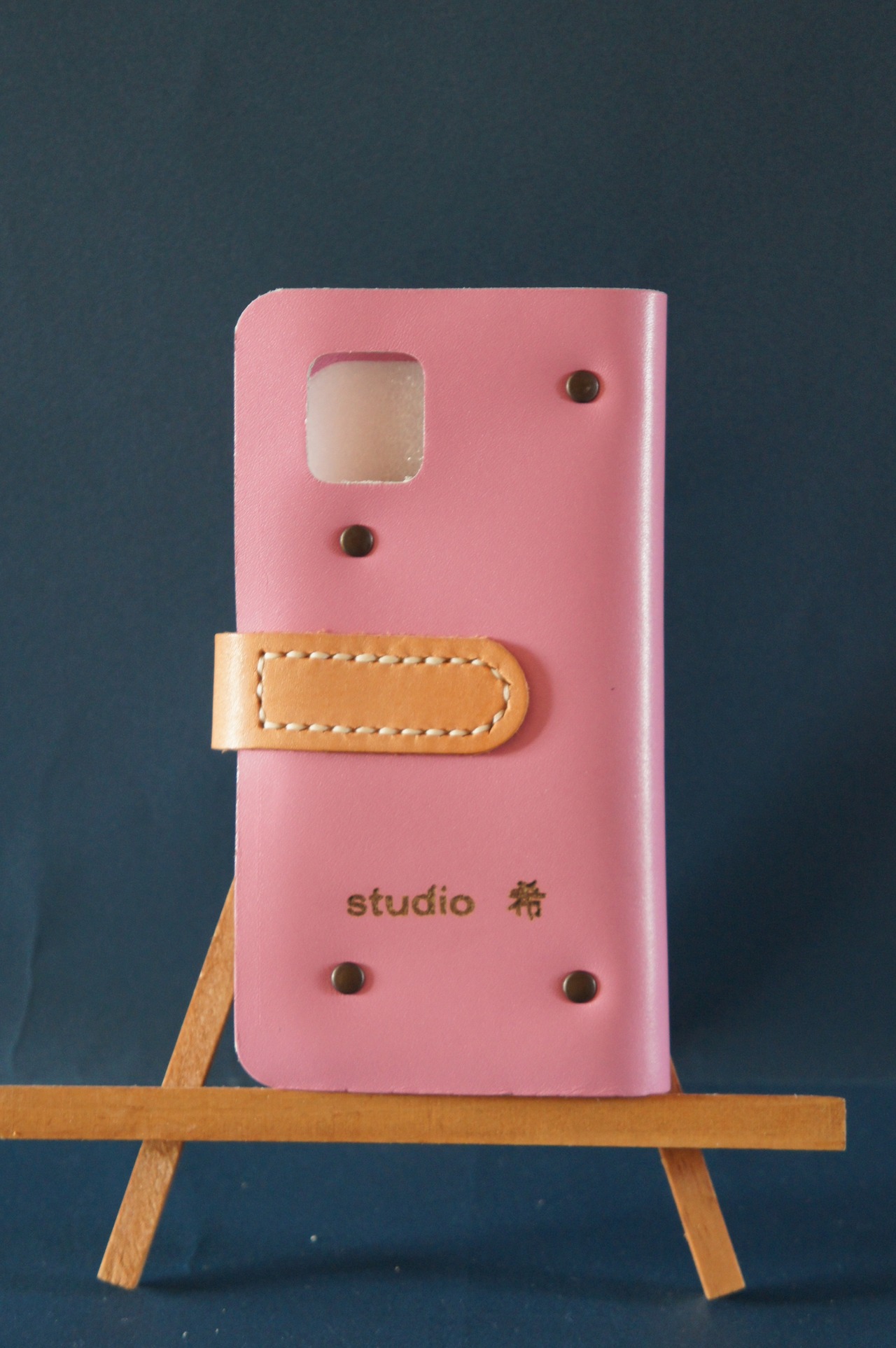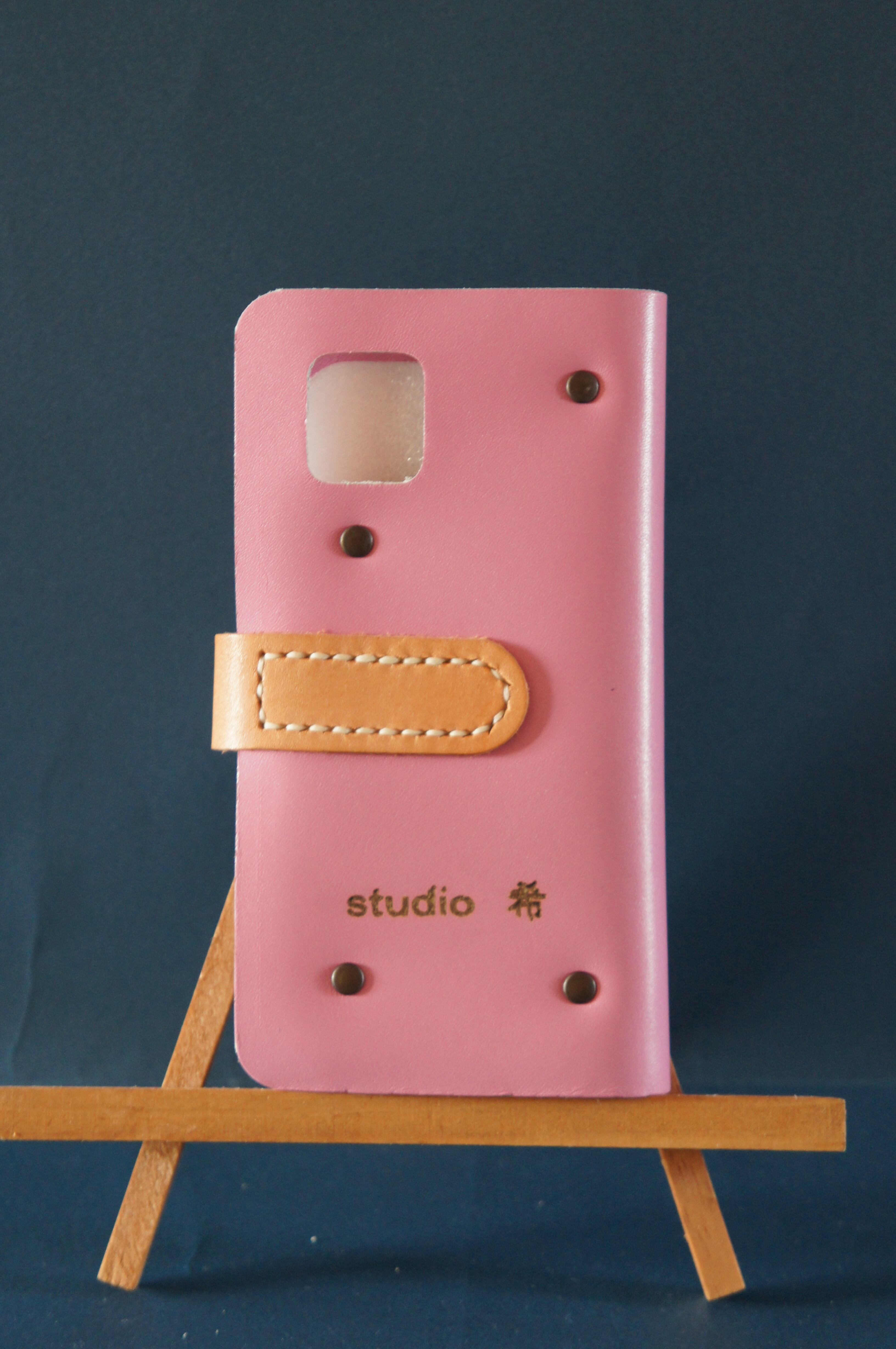 一点物です。iPhone11promax用の手帳型スマートフォンケースです。本体、カードホルダー、ホルダー裏の合計3枚の革を縫い合わせています。太さ1番の白色の糸ですべて手縫いで仕上げています。2本の針で縫っていますので、ほつれにくい構造になっています。本体は1.5mmの厚さのピンクの牛革です。カードホルダーが2つあります。カードホルダー部分の裏には収納スペースがあります。スマートフォンを固定する部分は、カシメ金具4個で固定してあります。バネホック、金具の色はブロンズです。カメラ穴部分を固くするためには皮革硬化剤を使用しています。貼り付け部分はつるつるに磨いています。