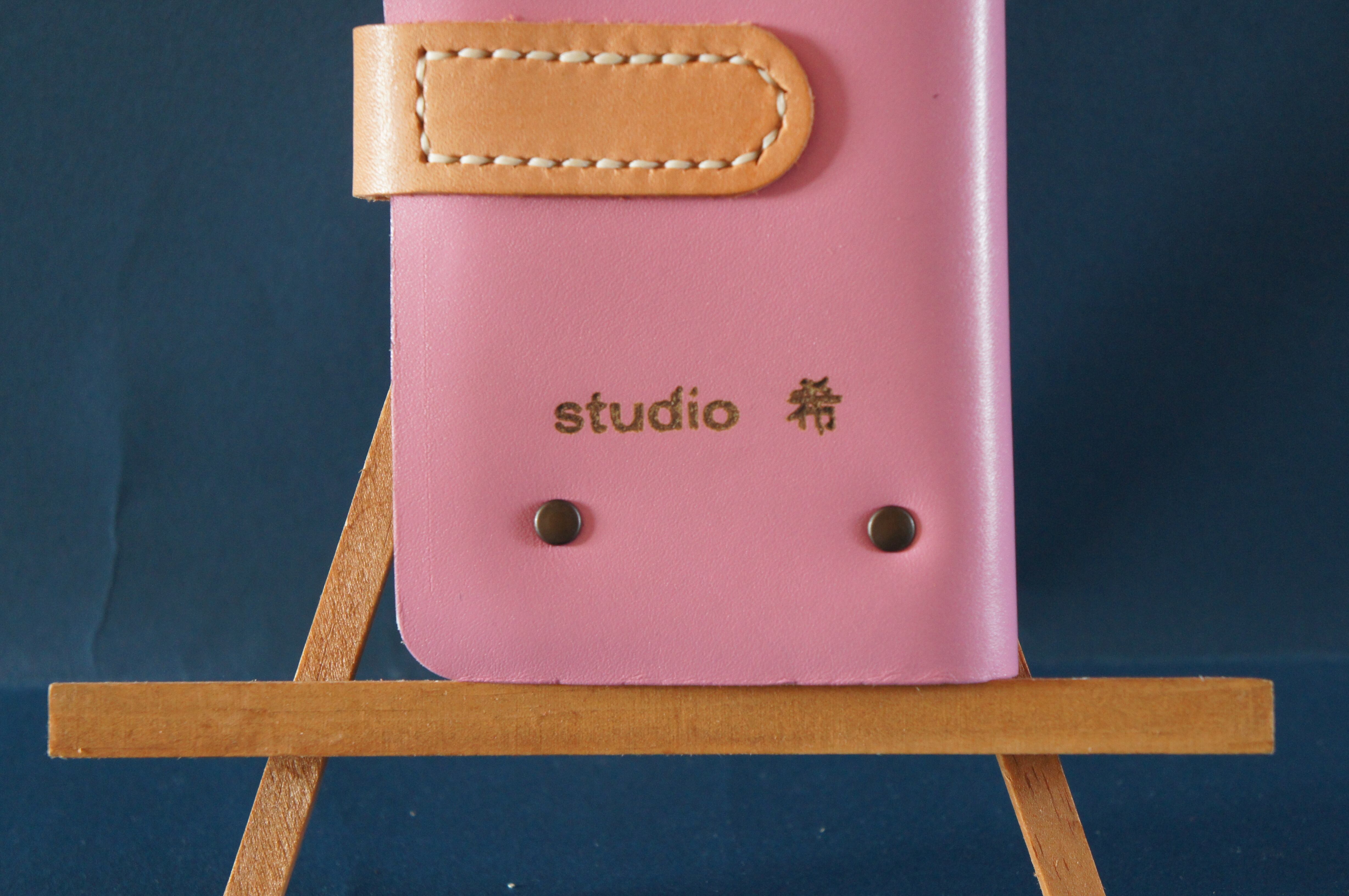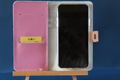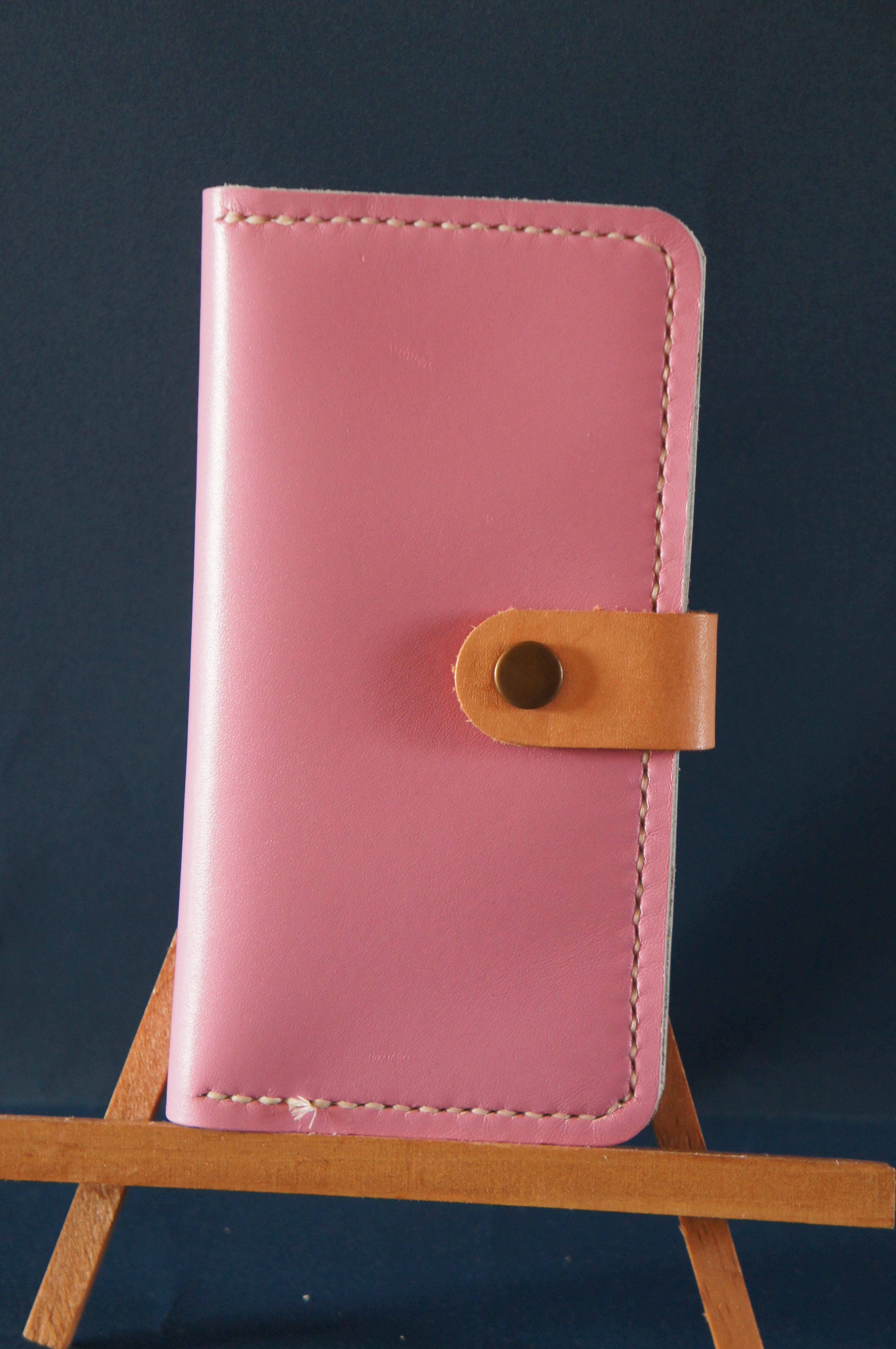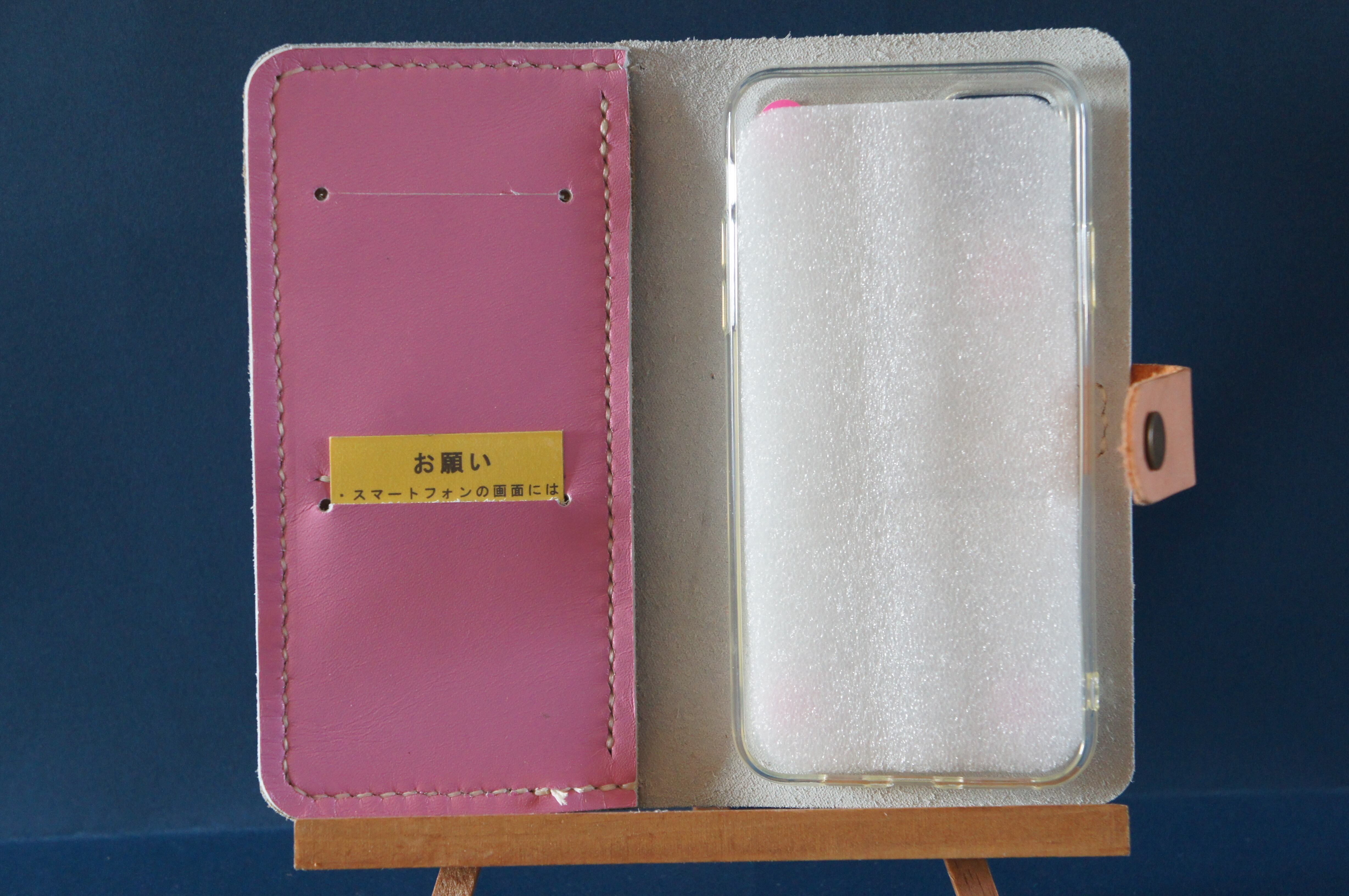 一点物です。iPhone11promax用の手帳型スマートフォンケースです。本体、カードホルダー、ホルダー裏の合計3枚の革を縫い合わせています。太さ1番の白色の糸ですべて手縫いで仕上げています。2本の針で縫っていますので、ほつれにくい構造になっています。本体は1.5mmの厚さのピンクの牛革です。カードホルダーが2つあります。カードホルダー部分の裏には収納スペースがあります。スマートフォンを固定する部分は、カシメ金具4個で固定してあります。バネホック、金具の色はブロンズです。カメラ穴部分を固くするためには皮革硬化剤を使用しています。貼り付け部分はつるつるに磨いています。
