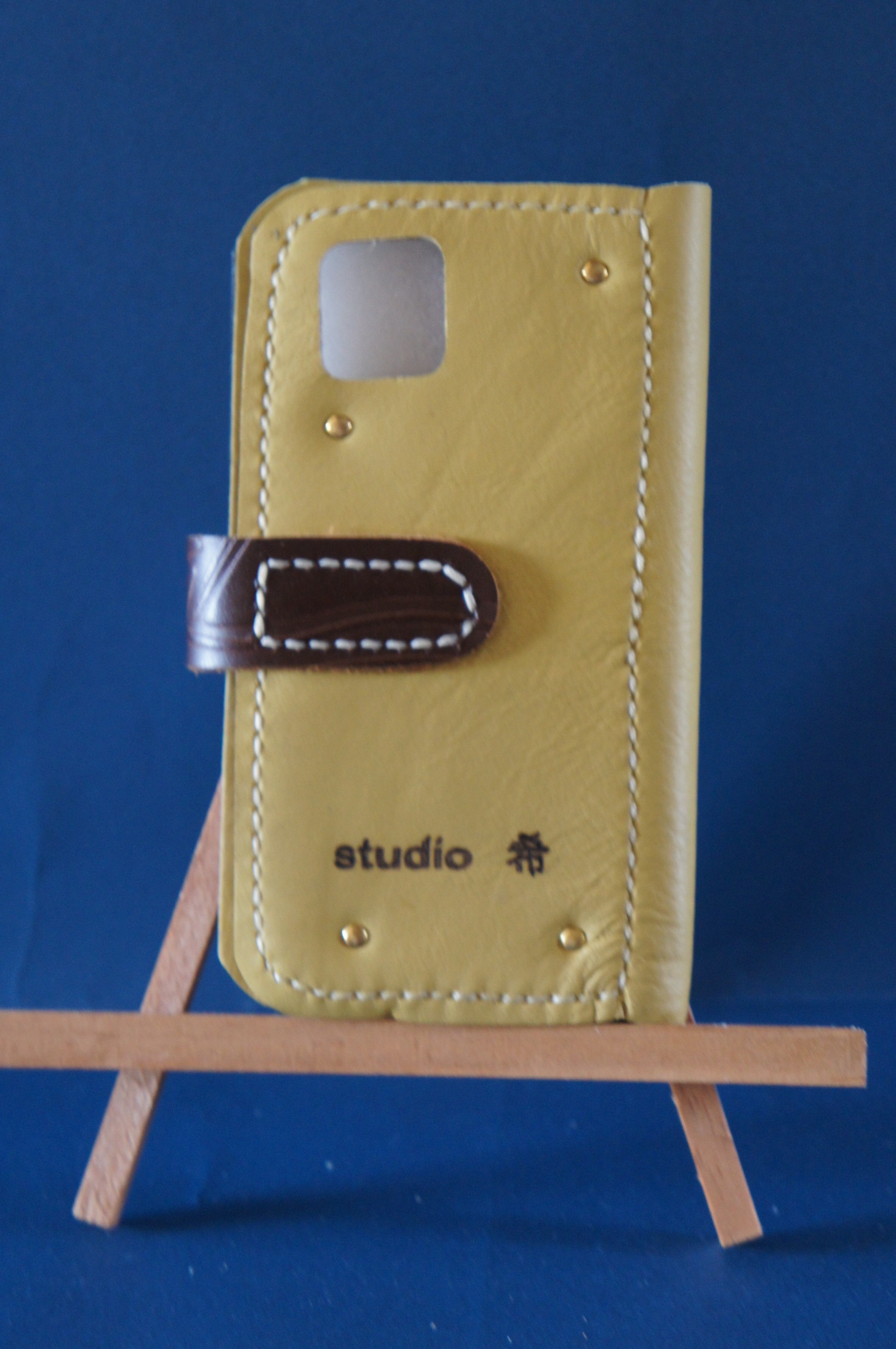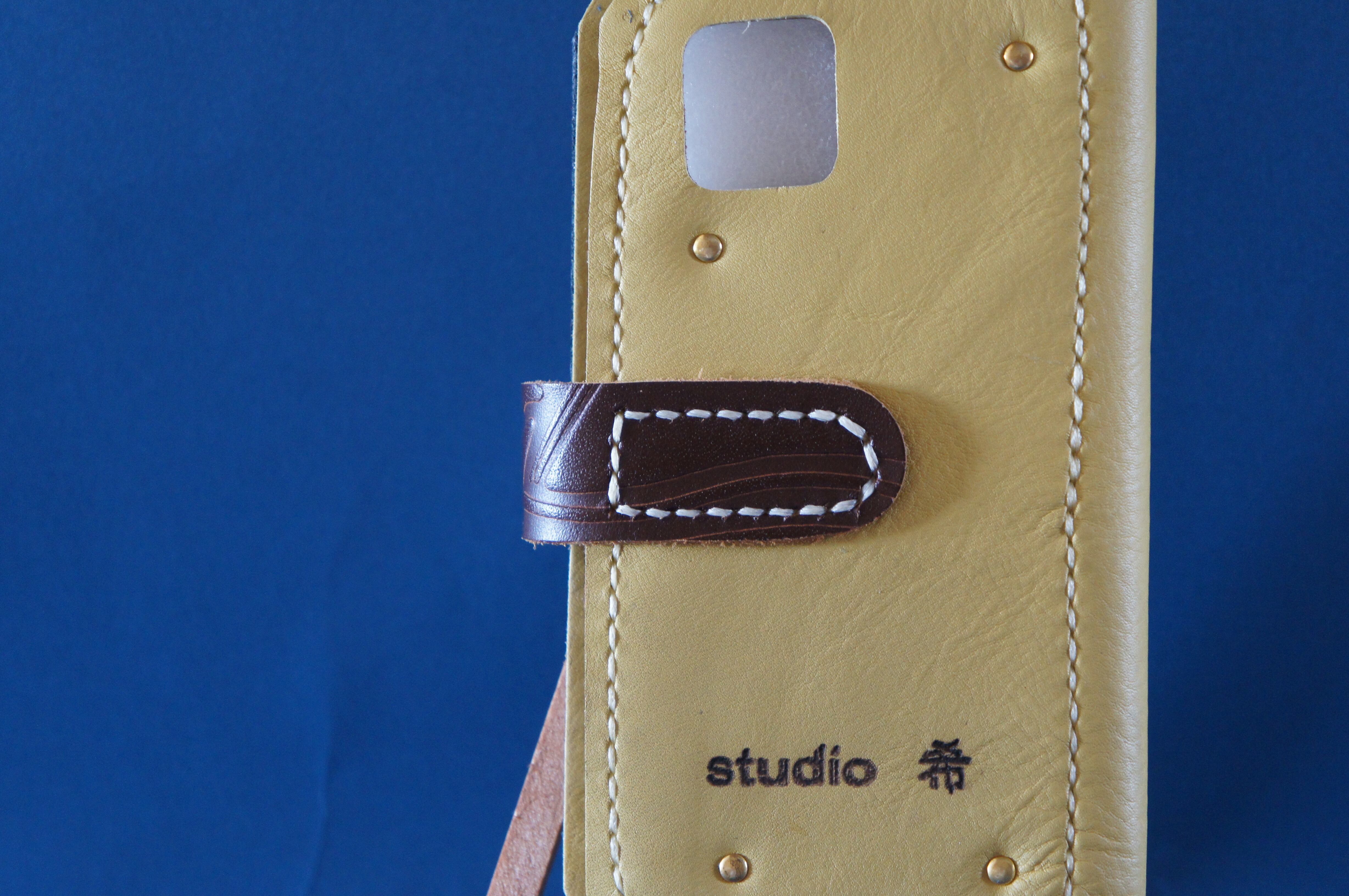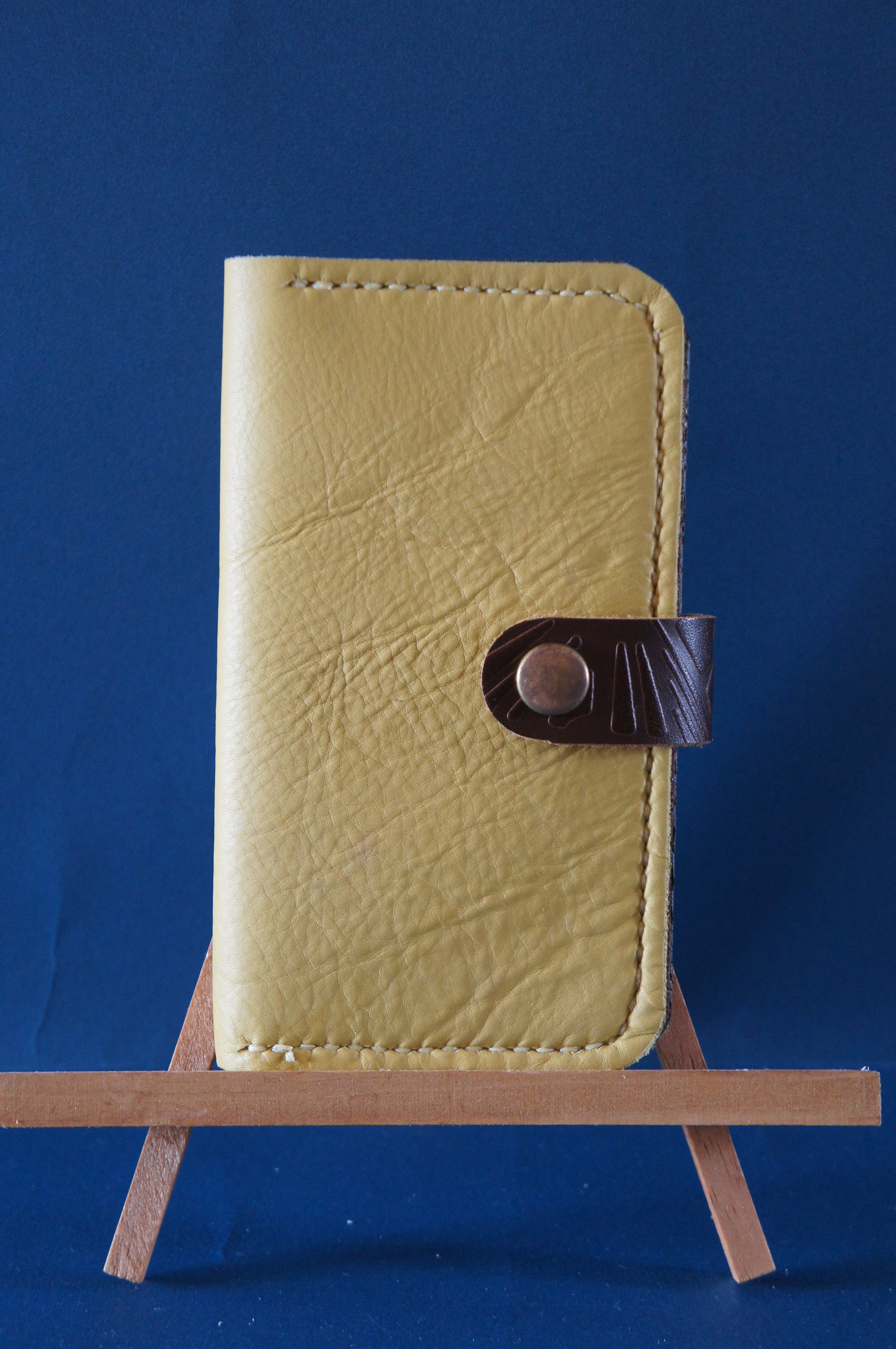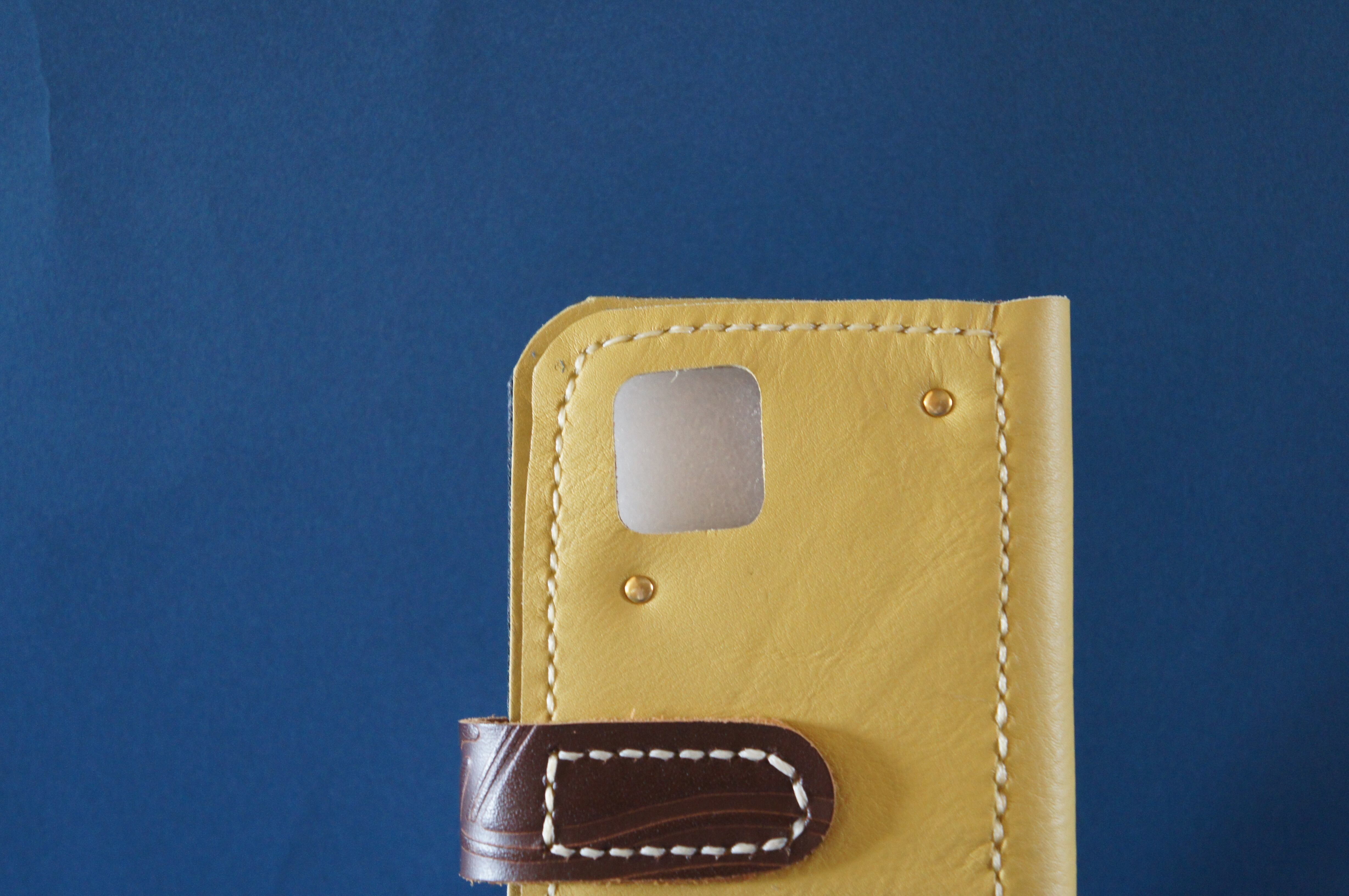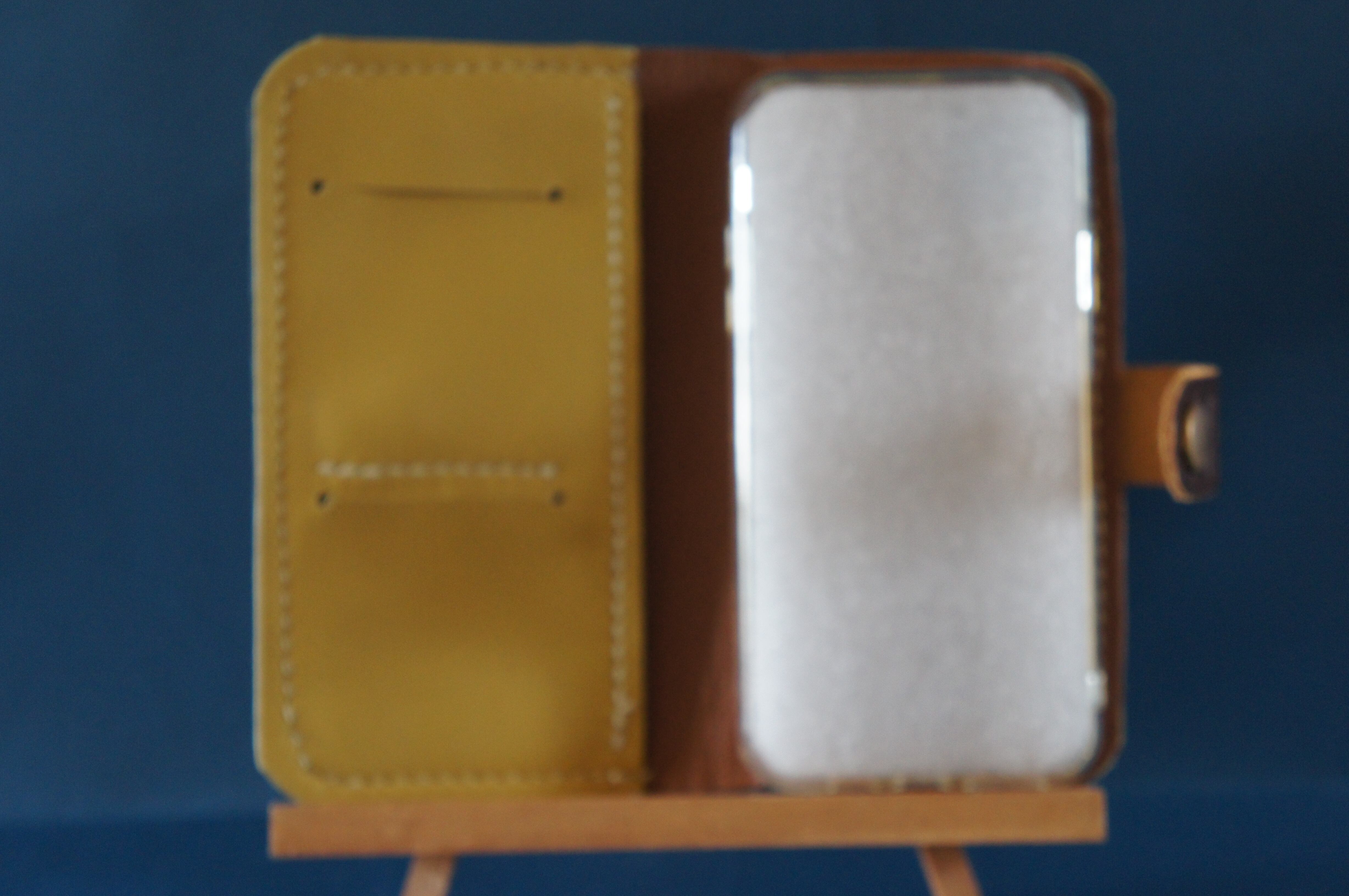 一点物です。iPhone11promax用の手帳型スマートフォンケースです。本体、内側、カードホルダー、ホルダー裏の合計4枚の革を縫い合わせています。太さ1番の白色の糸ですべて手縫いで仕上げています。2本の針で縫っていますので、ほつれにくい構造になっています。本体は1.5mmの厚さのカラシ色のソフトな牛革です。内側には厚さ0.8mmの水牛の革を使っています。カードホルダーが2つあります。カードホルダー部分の裏には収納スペースがあります。スマートフォンを固定する部分は、カシメ金具4個で固定してあります。バネホック、金具の色は金色です。カメラ穴部分を固くするためには皮革硬化剤を使用しています。貼り付け部分はつるつるに磨いています。