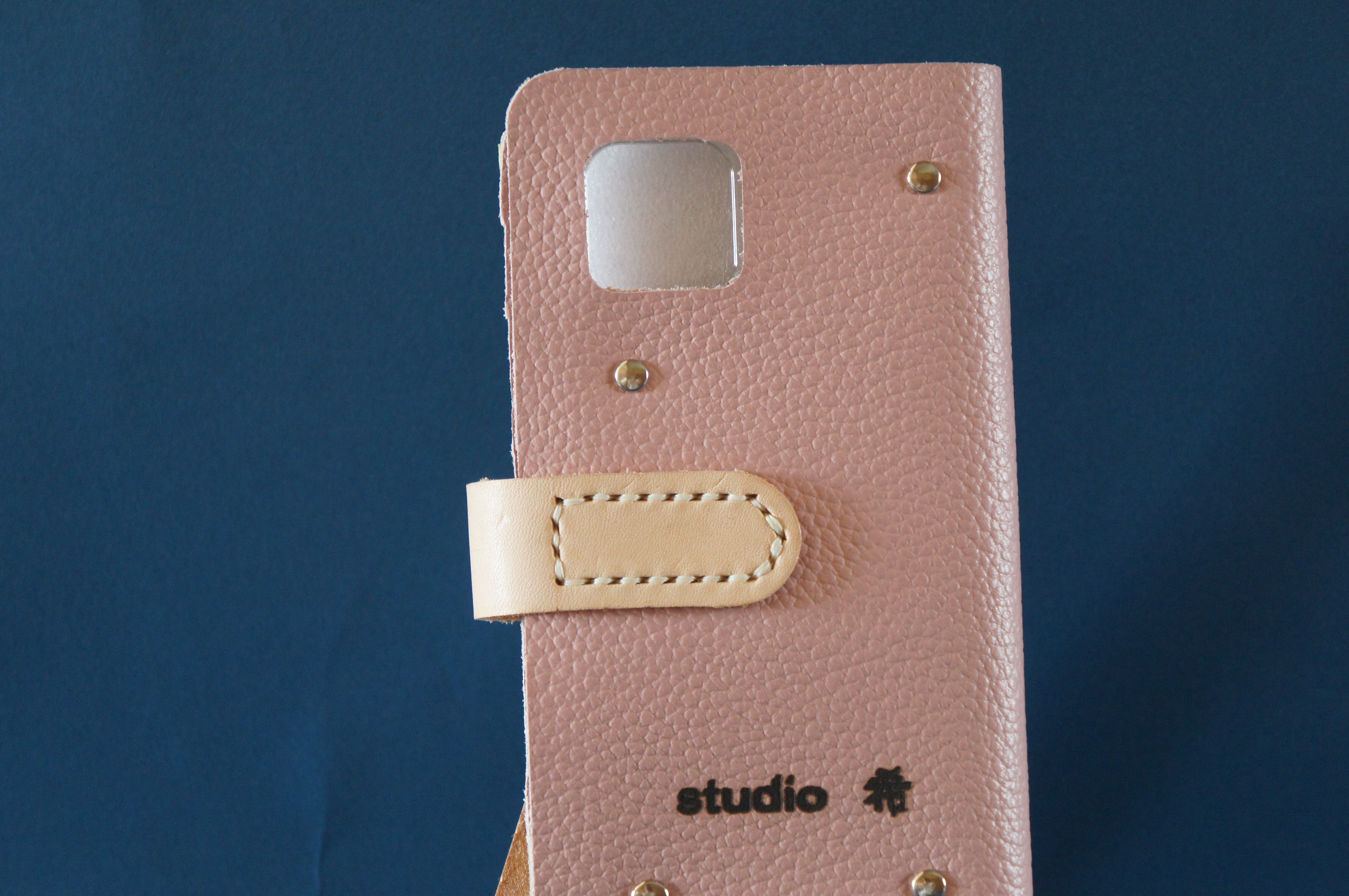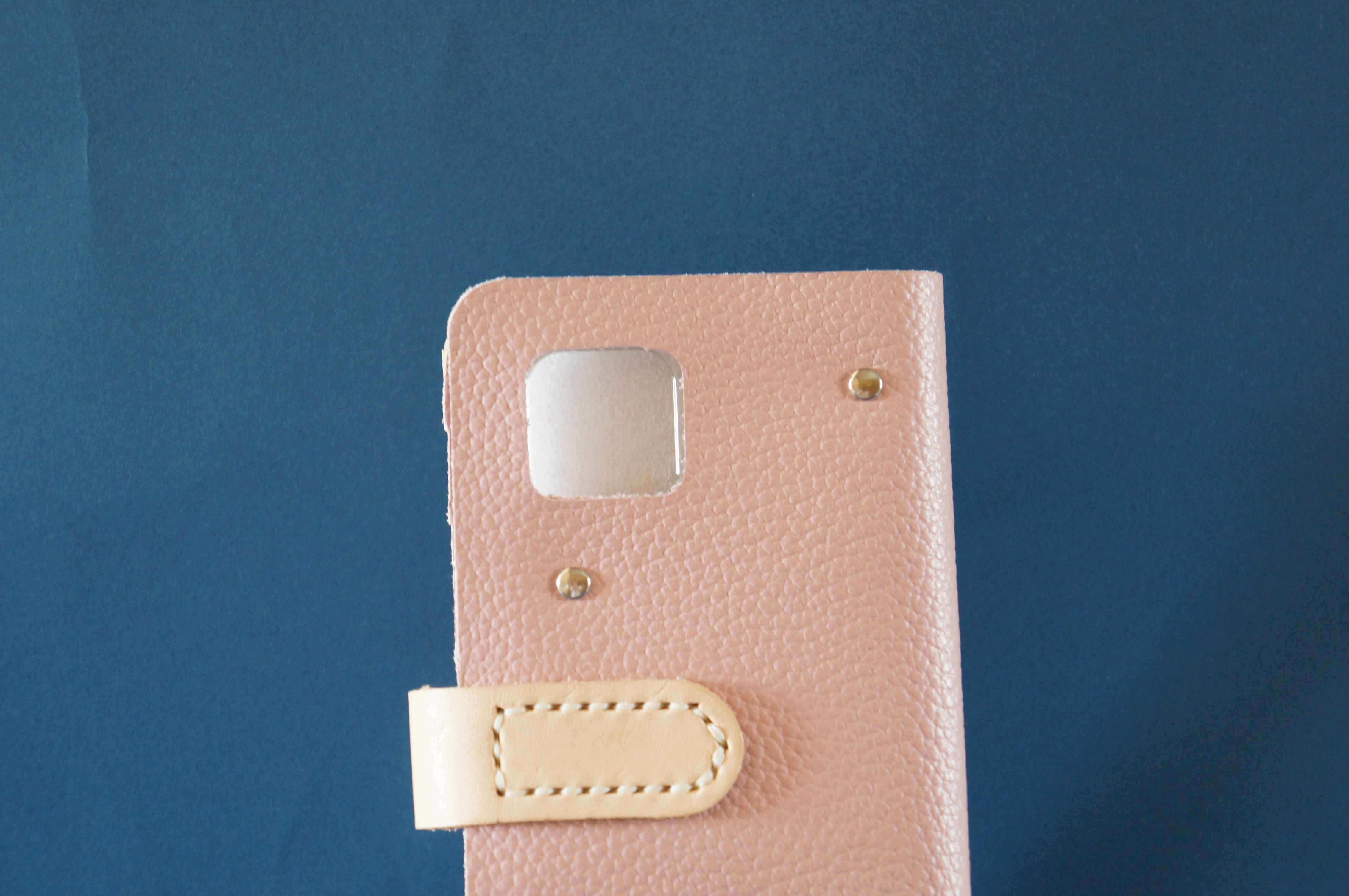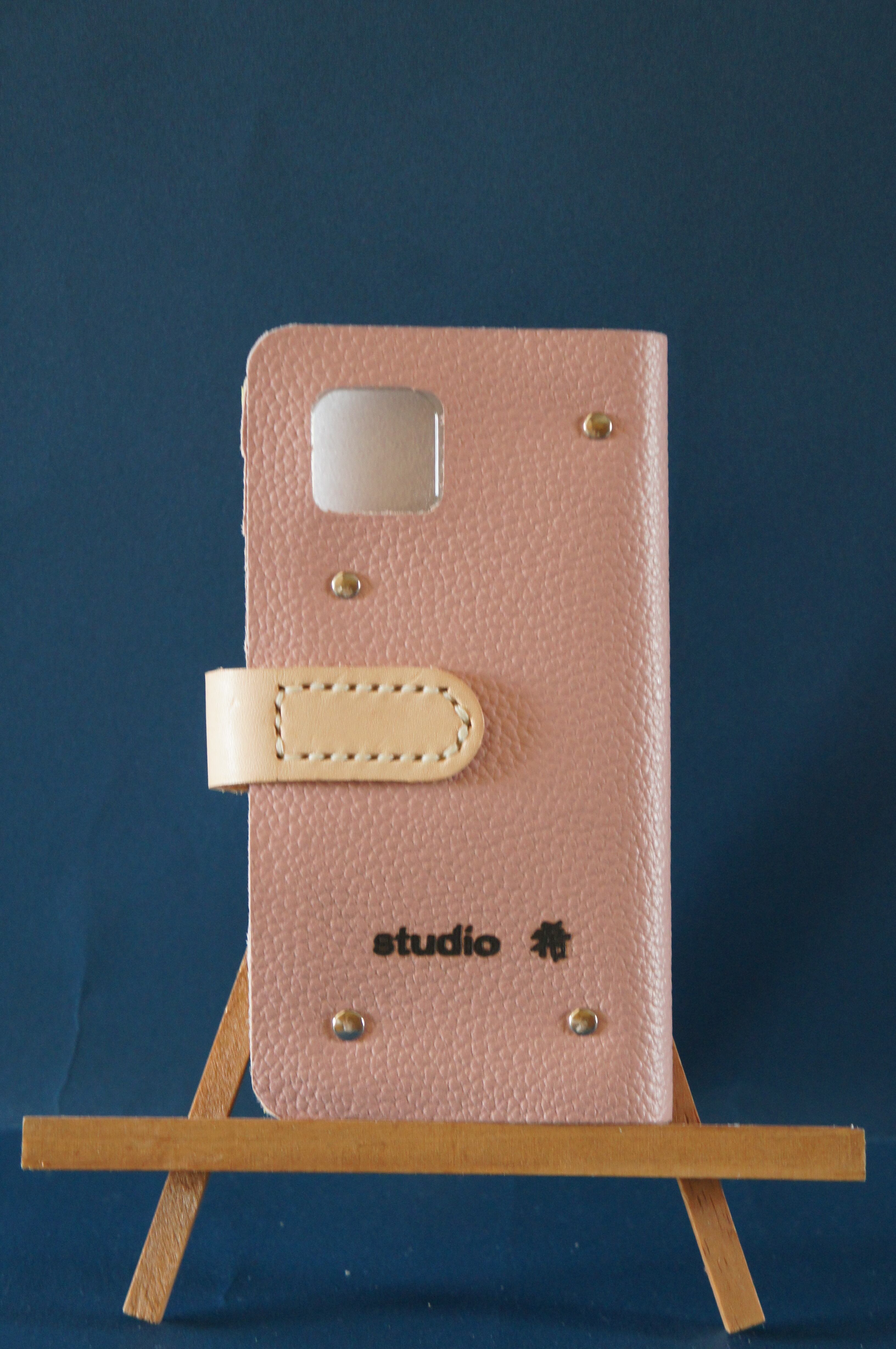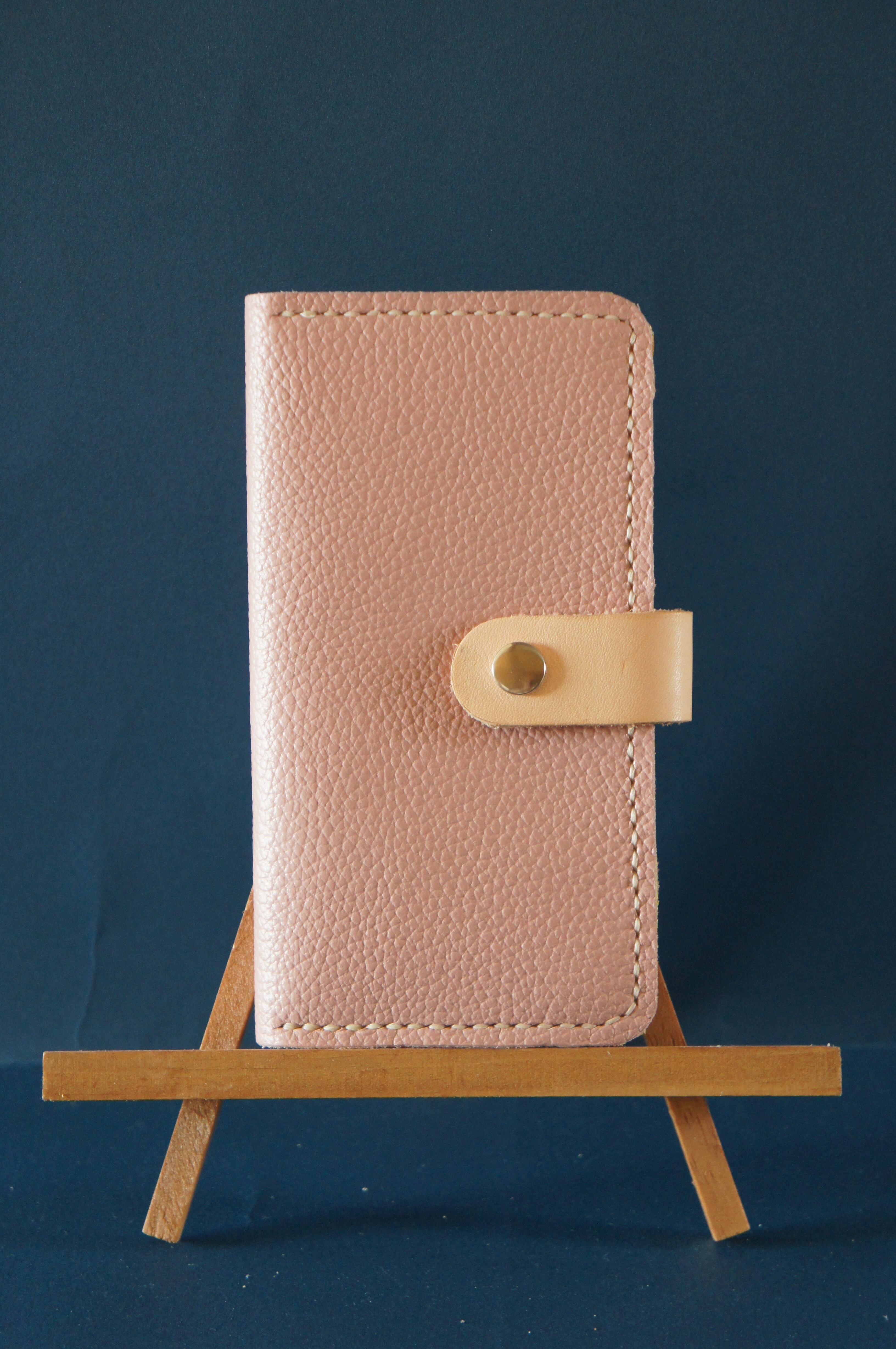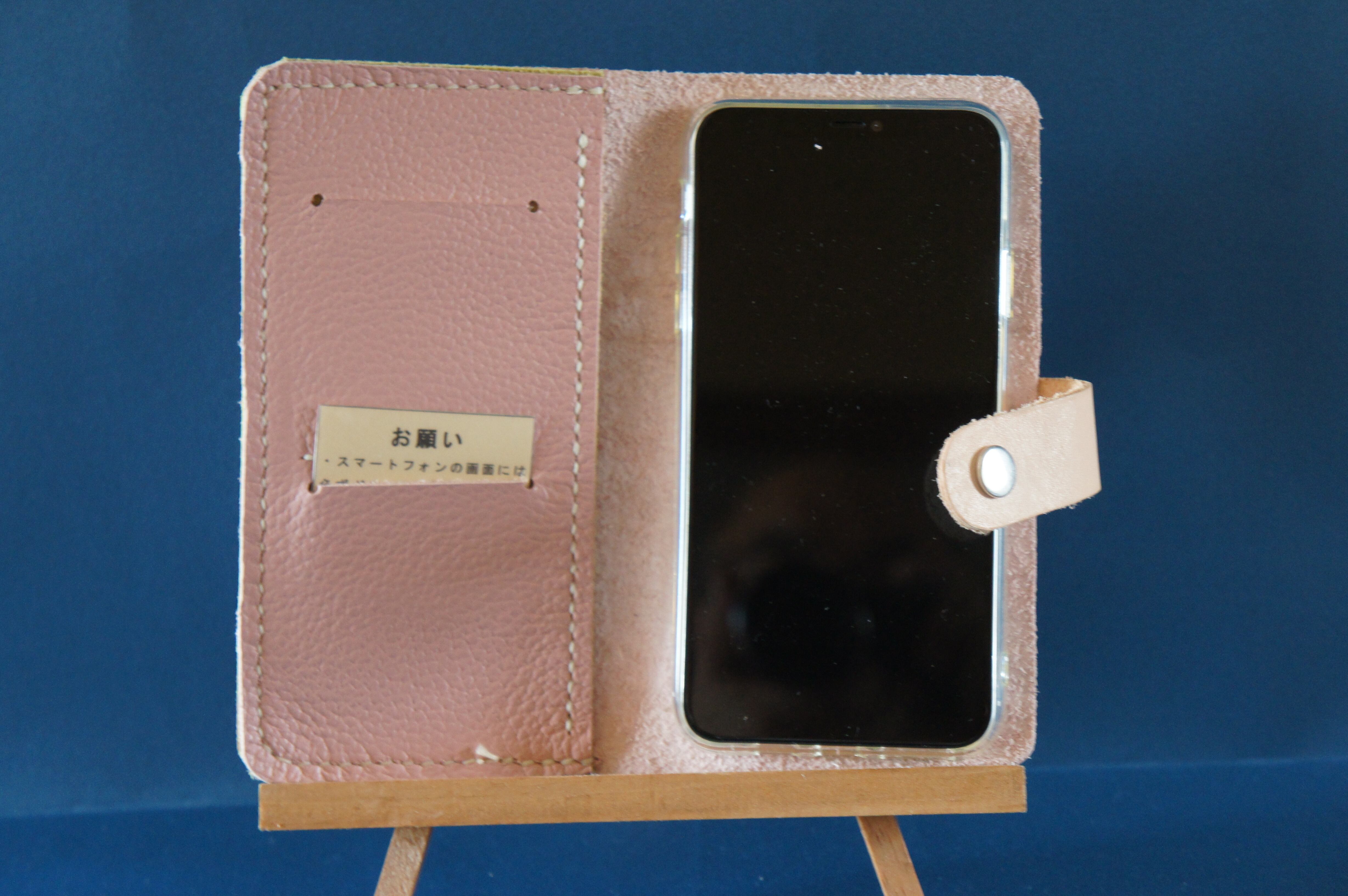 一点物です。iPhone11promax用の手帳型スマートフォンケースです。本体、カードホルダー、ホルダー裏の合計3枚の革を縫い合わせています。太さ1番の白色の糸ですべて手縫いで仕上げています。2本の針で縫っていますので、ほつれにくい構造になっています。本体は1.8mmの厚さのサーモンピンクのシュリンクの牛革です。カードホルダーが2つあります。カードホルダー部分の裏には収納スペースがあります。スマートフォンを固定する部分は、カシメ金具4個で固定してあります。バネホック、金具の色は銀色です。カメラ穴部分を固くするためには皮革硬化剤を使用しています。貼り付け部分はつるつるに磨いています。