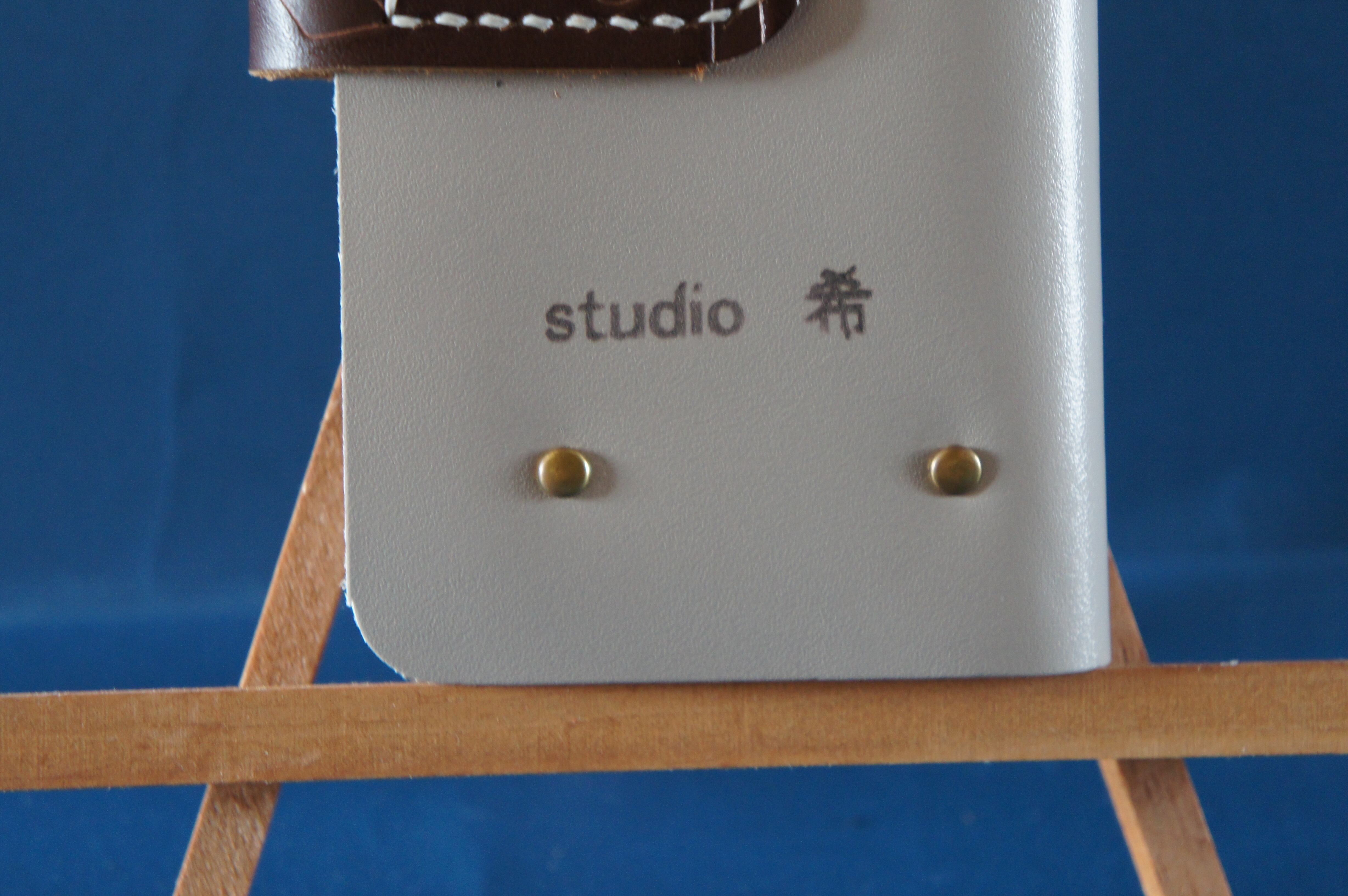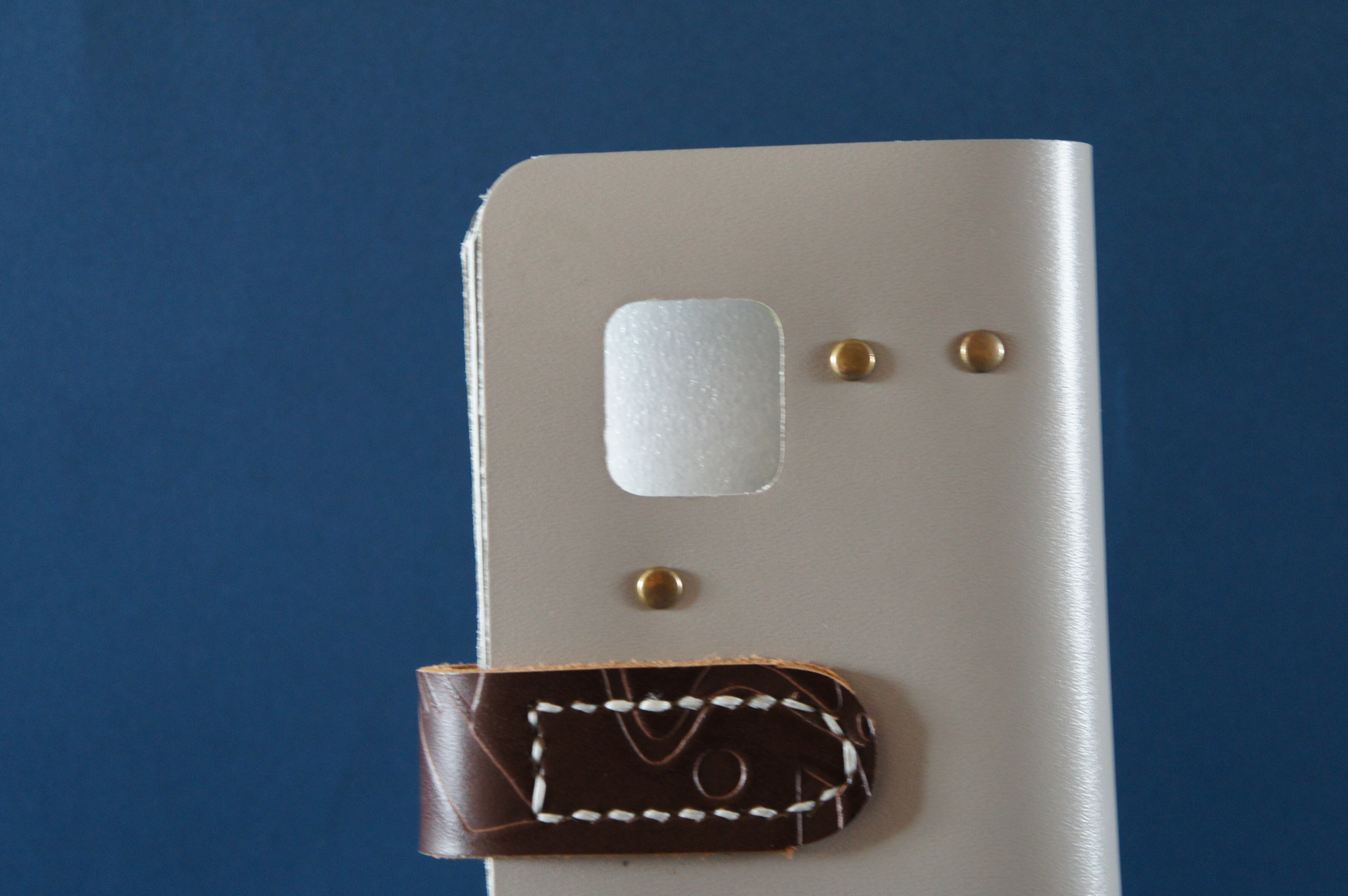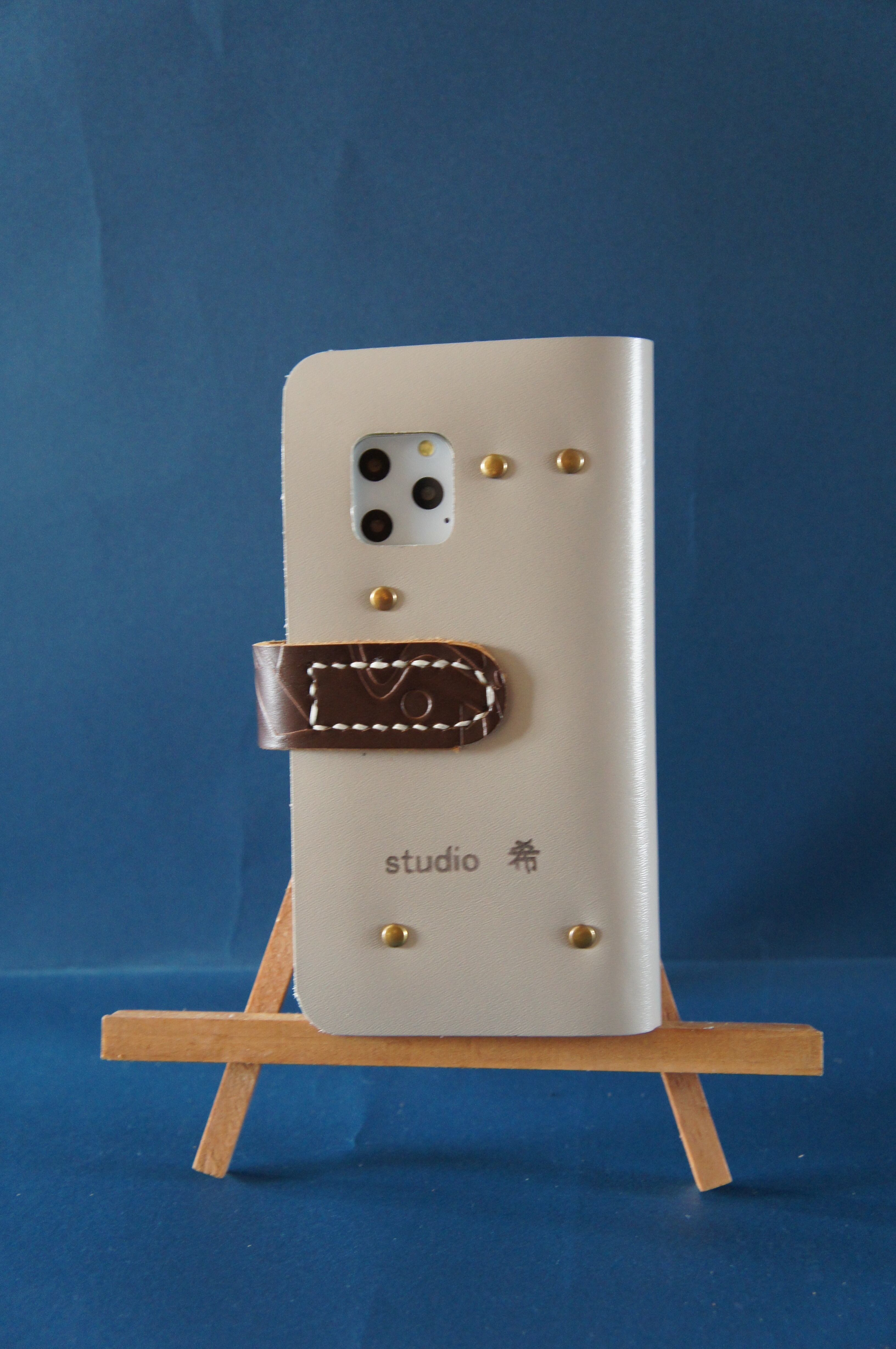 一点物です。iPhone11pro用の手帳型スマートフォンケースです。本体、カードホルダー、ホルダー裏の合計3枚の革を縫い合わせています。太さ1番の白色の糸ですべて手縫いで仕上げています。2本の針で縫っていますので、ほつれにくい構造になっています。本体は1.8mmの厚さの灰色の牛革です。カードホルダーが2つあります。カードホルダー部分の裏には収納スペースがあります。スマートフォンを固定する部分は、カシメ金具5個で固定してあります。バネホック、金具の色は金色です。カメラ穴部分を固くするためには皮革硬化剤を使用しています。貼り付け部分はつるつるに磨いています。