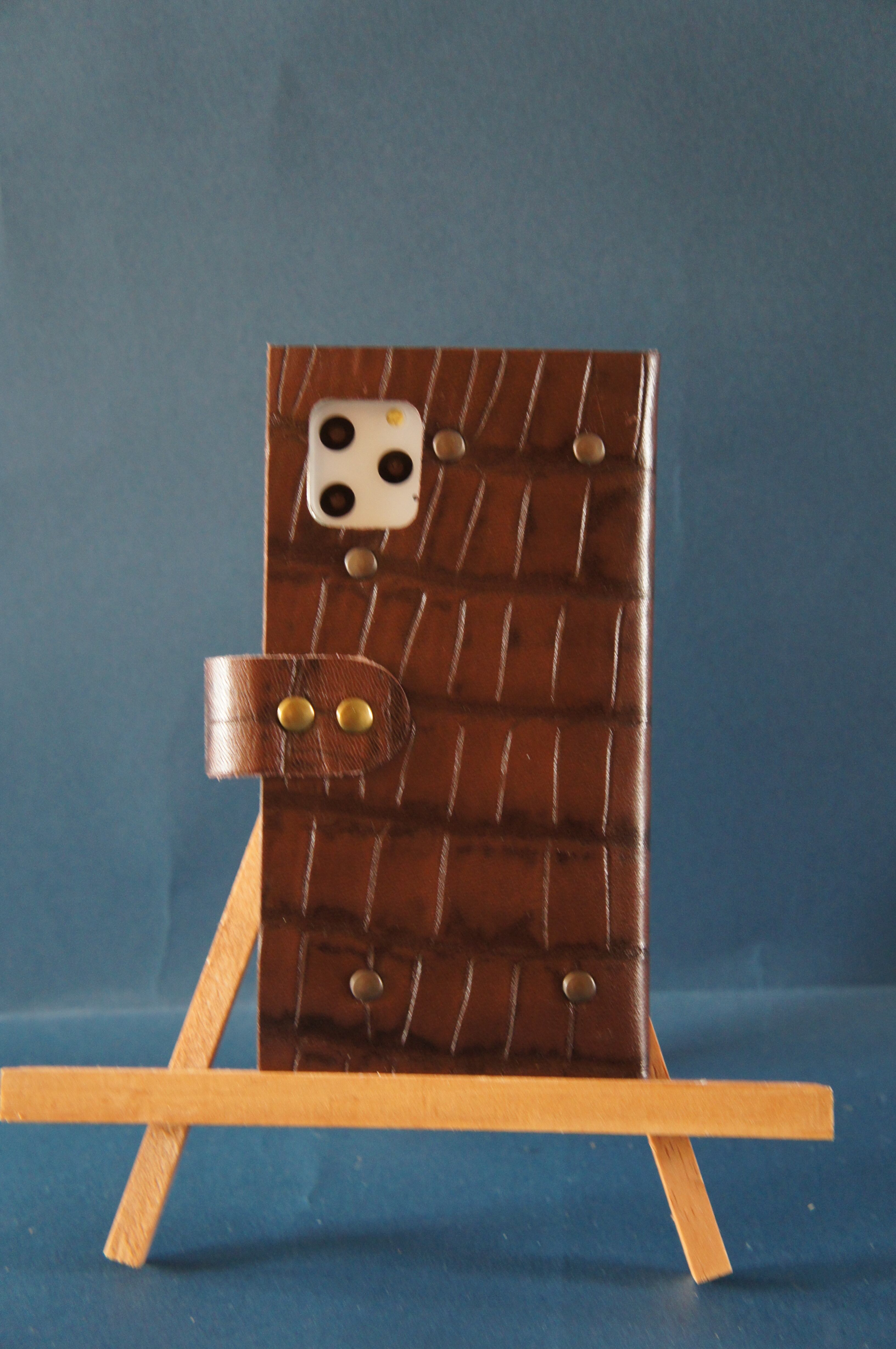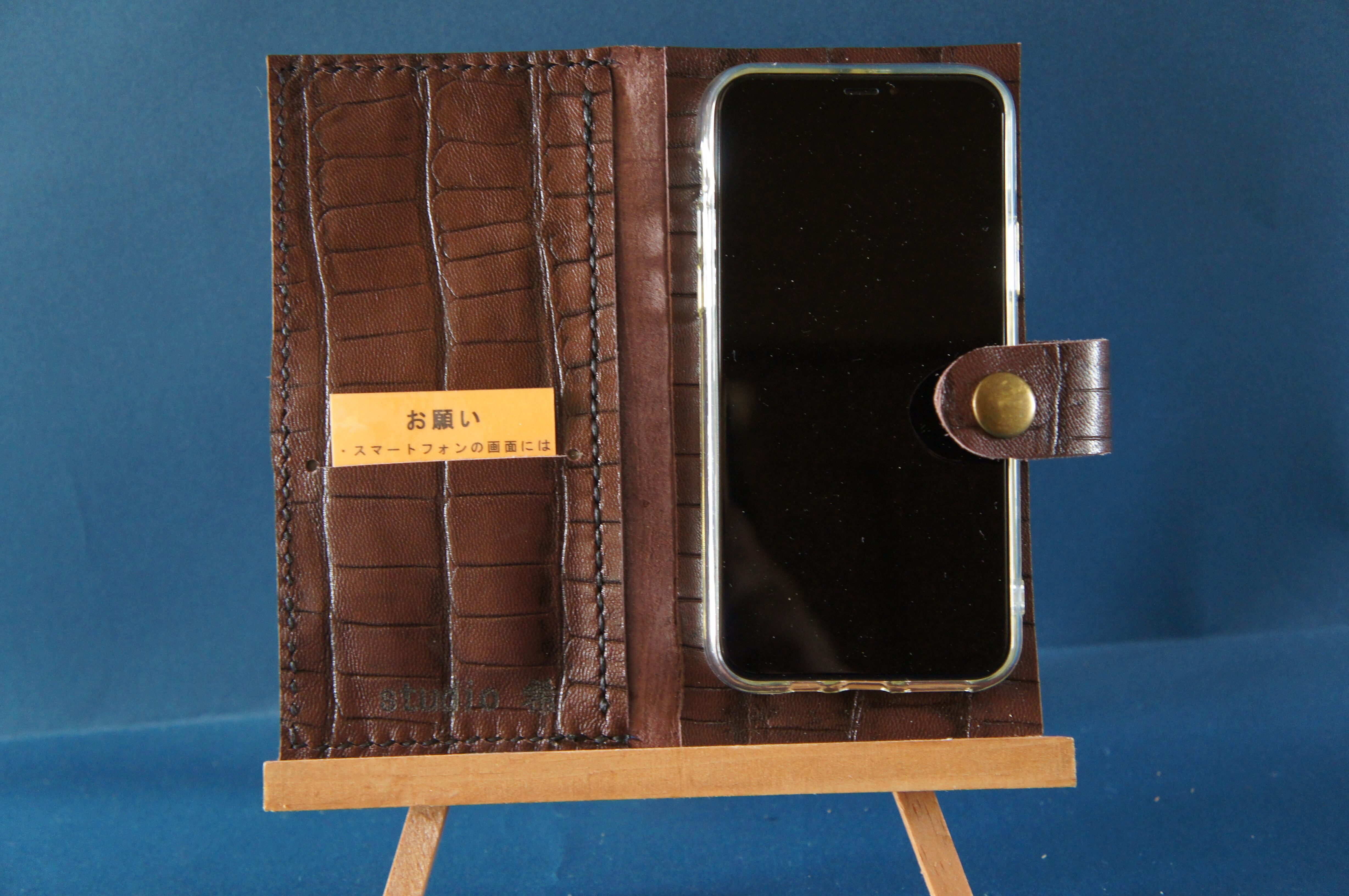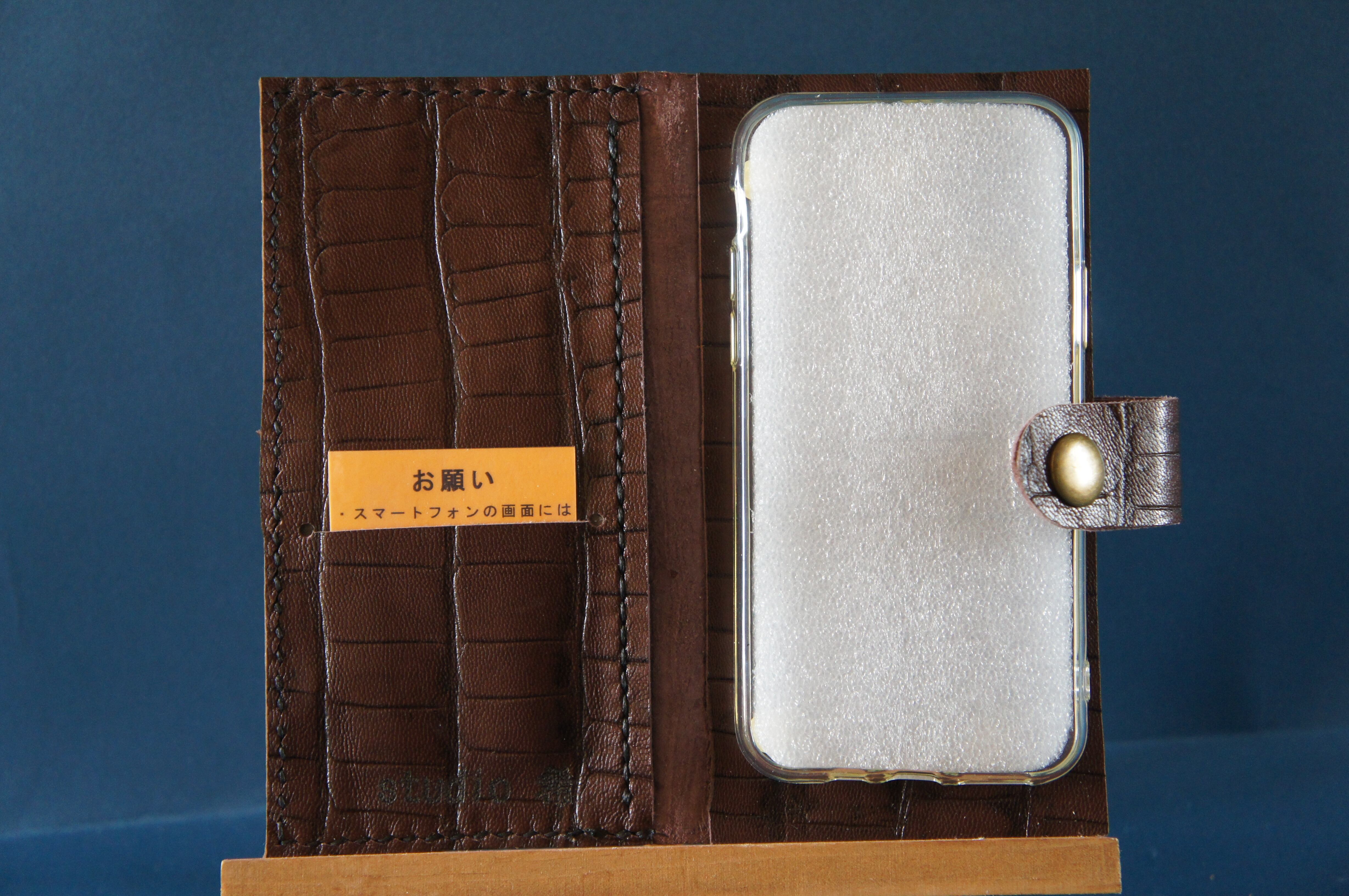 一点物です。iPhone11pro用の手帳型スマートフォンケースです。本体、内側、カードホルダー、ホルダー裏の合計4枚の革を縫い合わせています。太さ1番の茶色の糸ですべて手縫いで仕上げています。2本の針で縫っていますので、ほつれにくい構造になっています。本体は1.5mmの厚さのワニ型押しの茶色のソフト牛革です。内側にも同じ牛革を使っています。カードホルダーが1つあります。カードホルダー部分の裏には収納スペースがあります。スマートフォンを固定する部分は、カシメ金具5個で固定してあります。バネホック、金具の色はブロンズです。カメラ穴部分を固くするためには皮革硬化剤を使用しています。貼り付け部分はつるつるに磨いています。