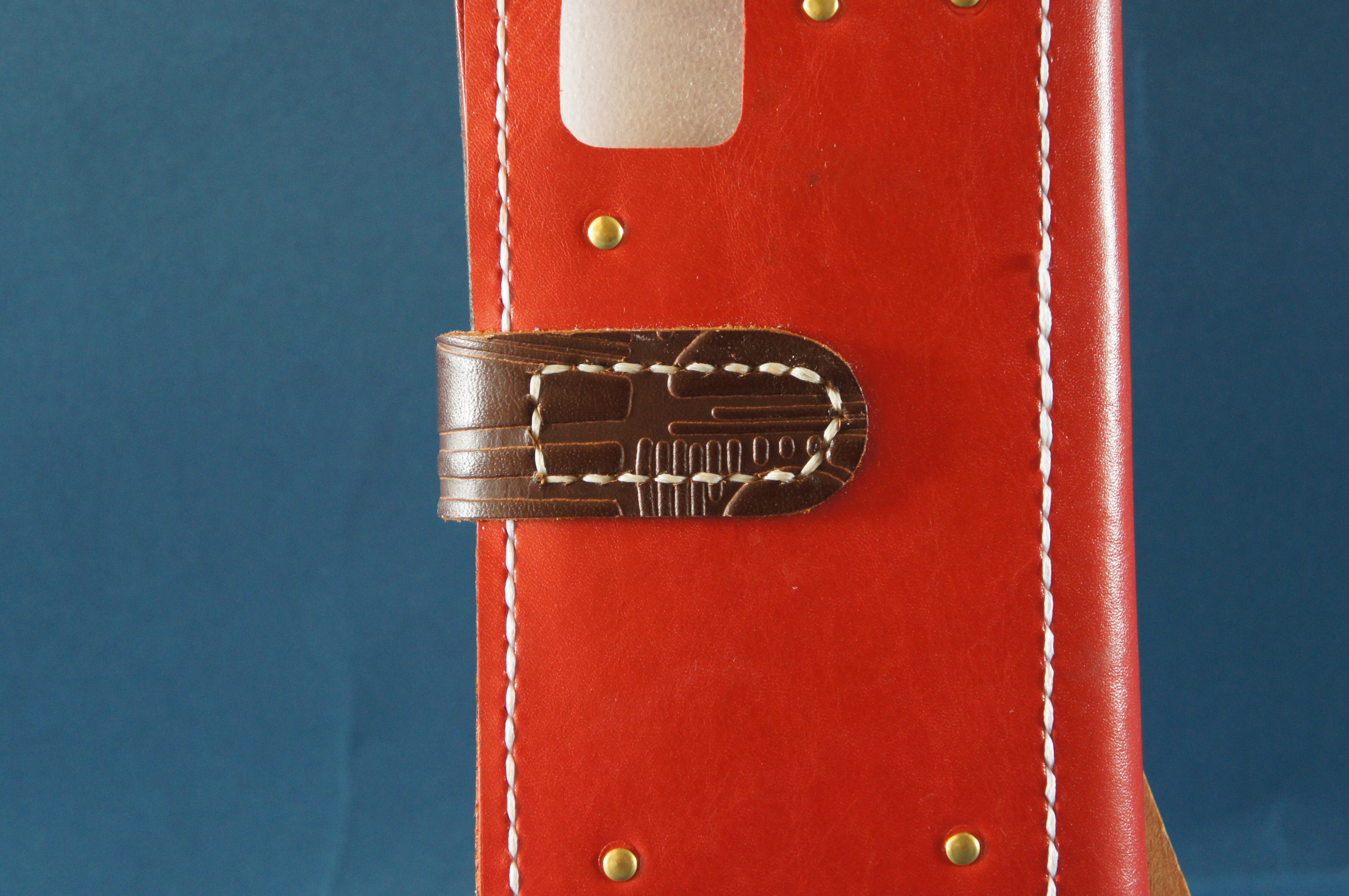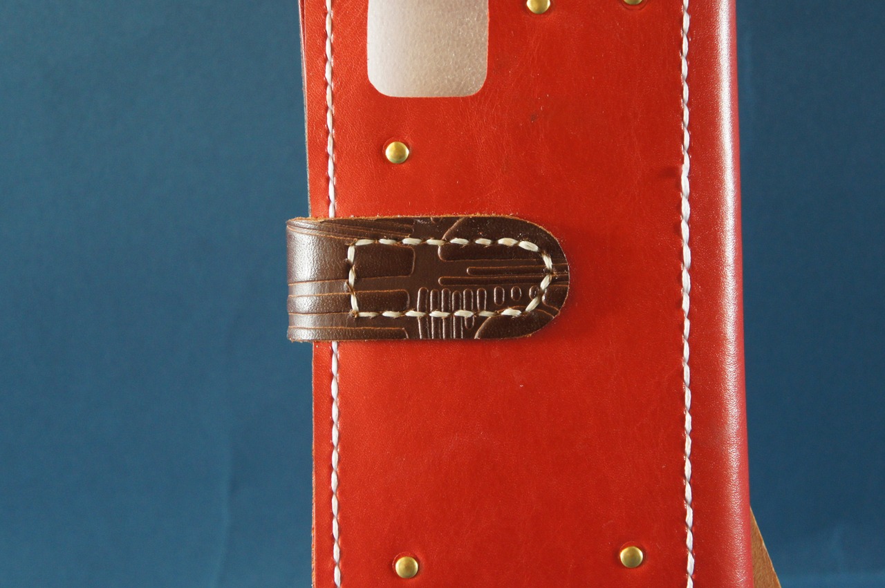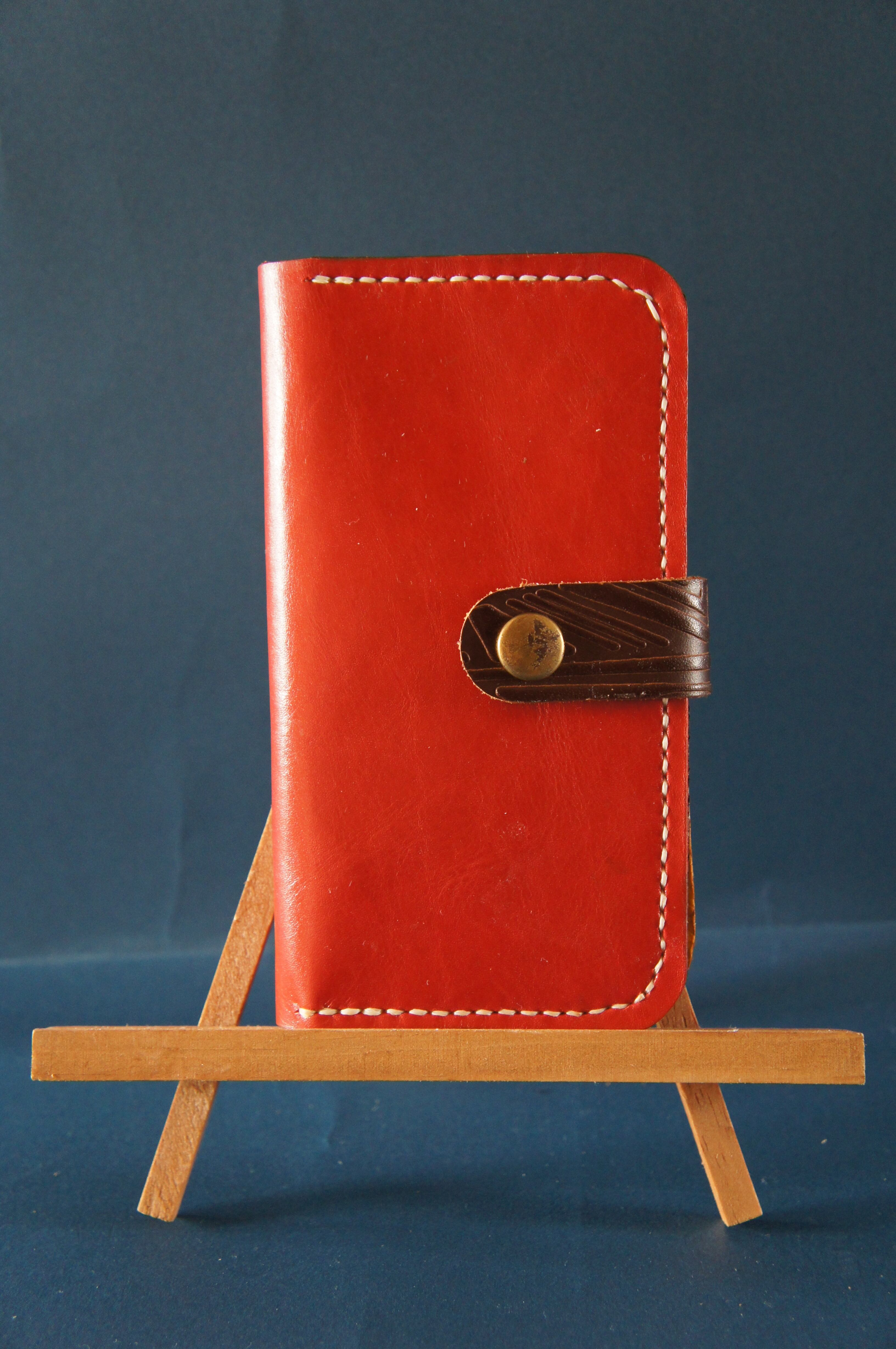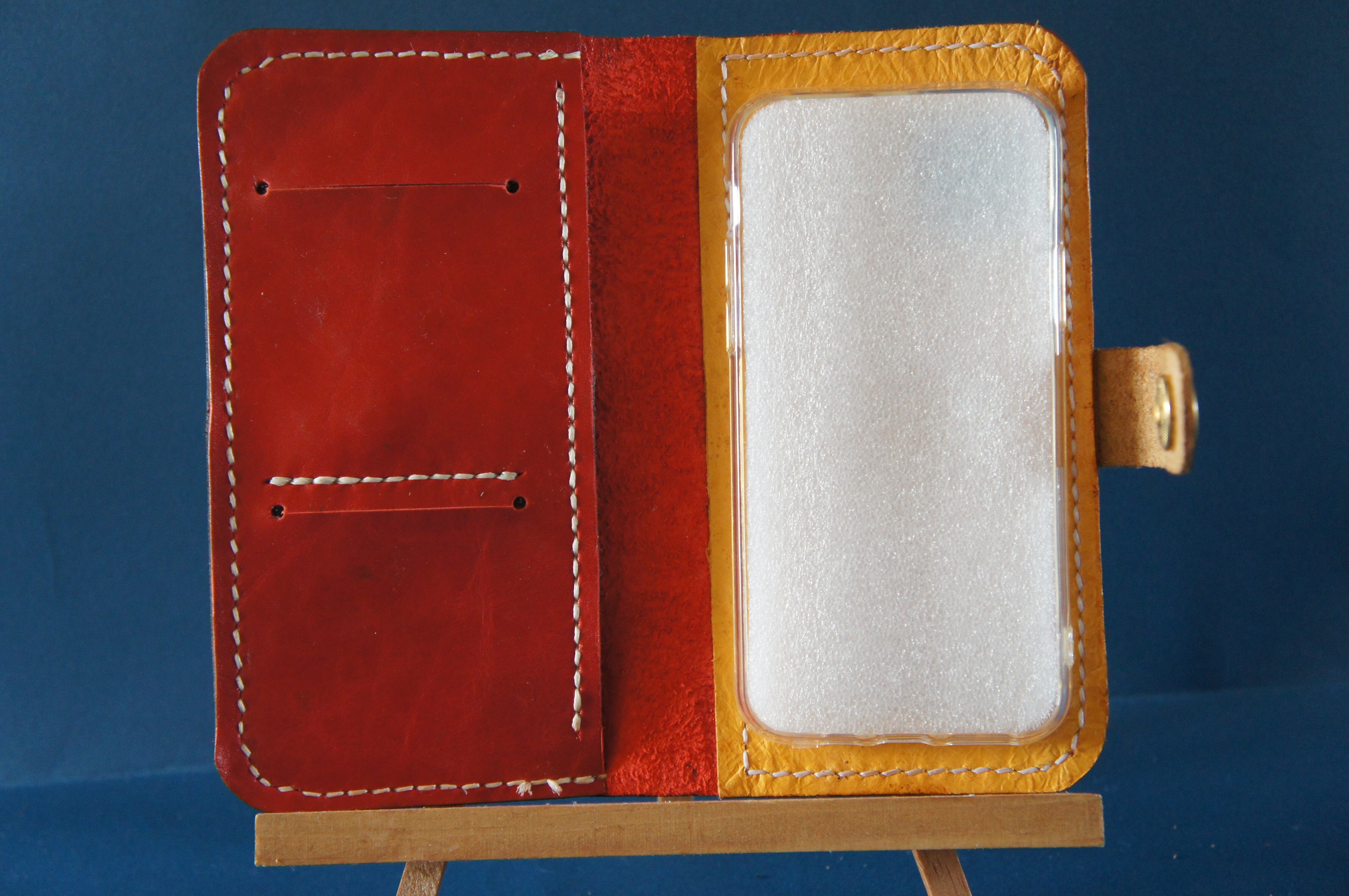 一点物です。iPhone11pro用の手帳型スマートフォンケースです。本体、内側、カードホルダー、ホルダー裏の合計4枚の革を縫い合わせています。太さ1番の白色の糸ですべて手縫いで仕上げています。2本の針で縫っていますので、ほつれにくい構造になっています。本体は1.5mmの厚さの赤色の牛革です。内側には厚さ0.8mmのアメ色の豚革を使っています。カードホルダーが2つあります。カードホルダー部分の裏には収納スペースがあります。スマートフォンを固定する部分は、カシメ金具5個で固定してあります。バネホック、金具の色は金色です。カメラ穴部分を固くするためには皮革硬化剤を使用しています。貼り付け部分はつるつるに磨いています。