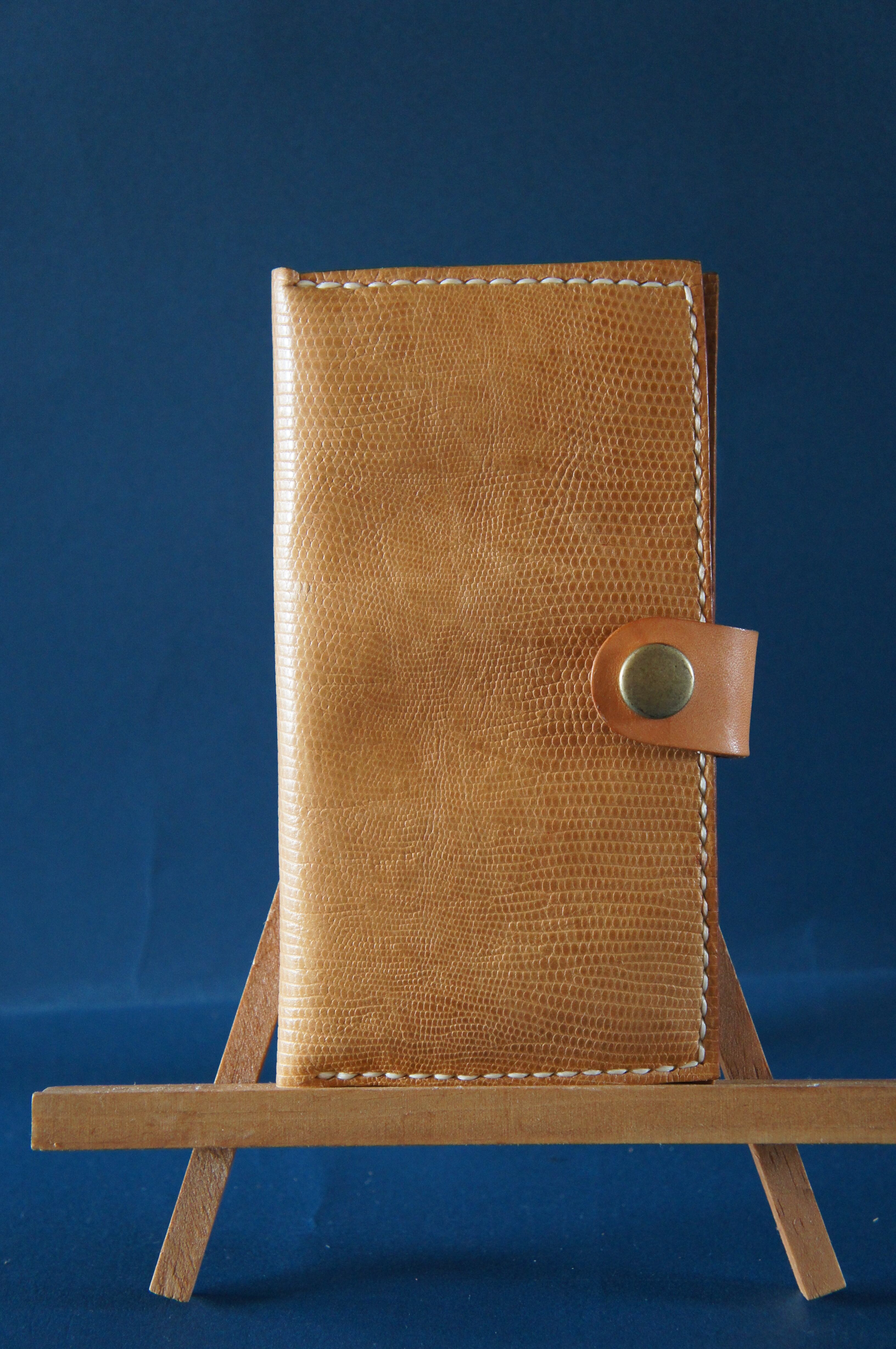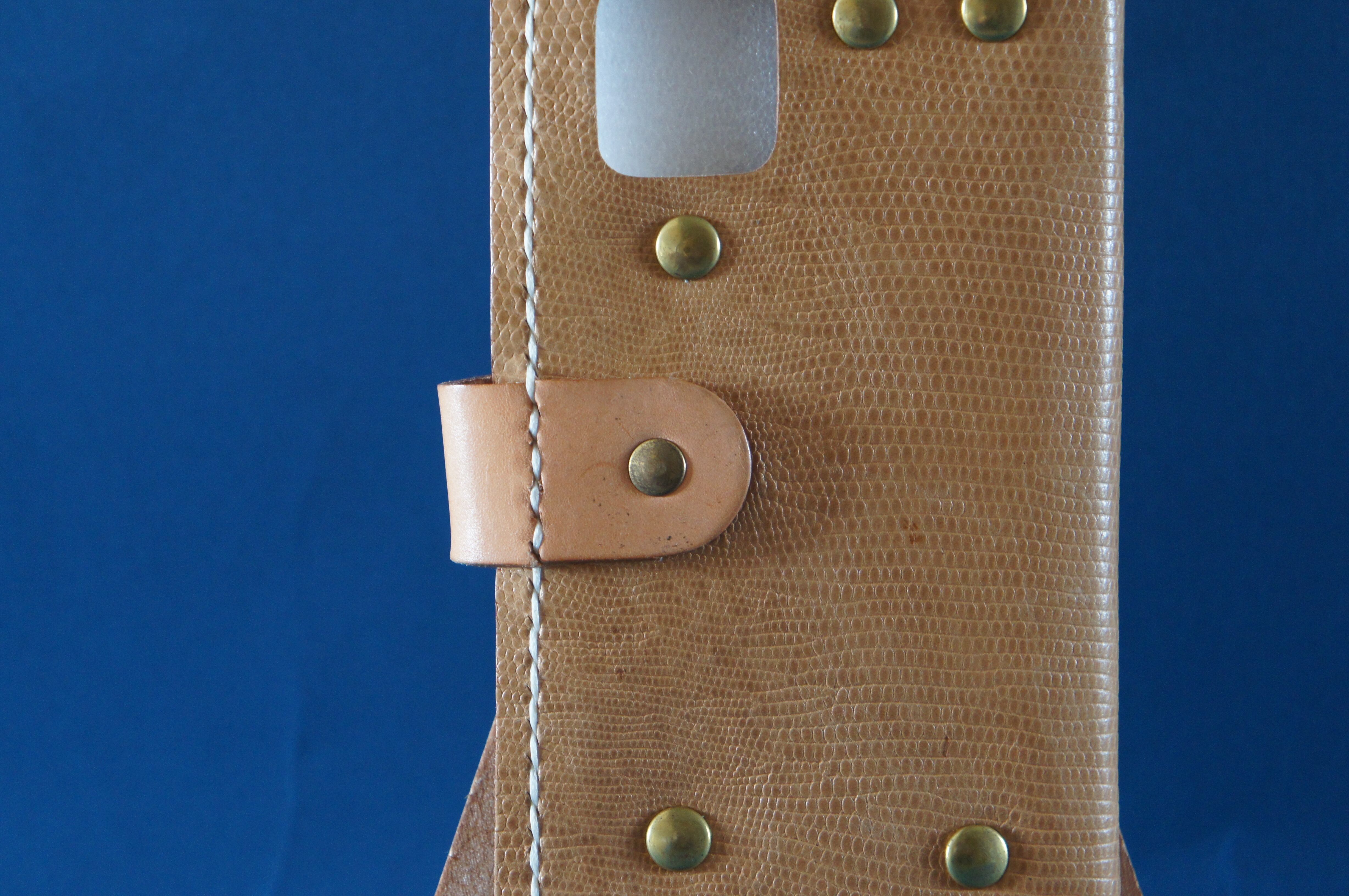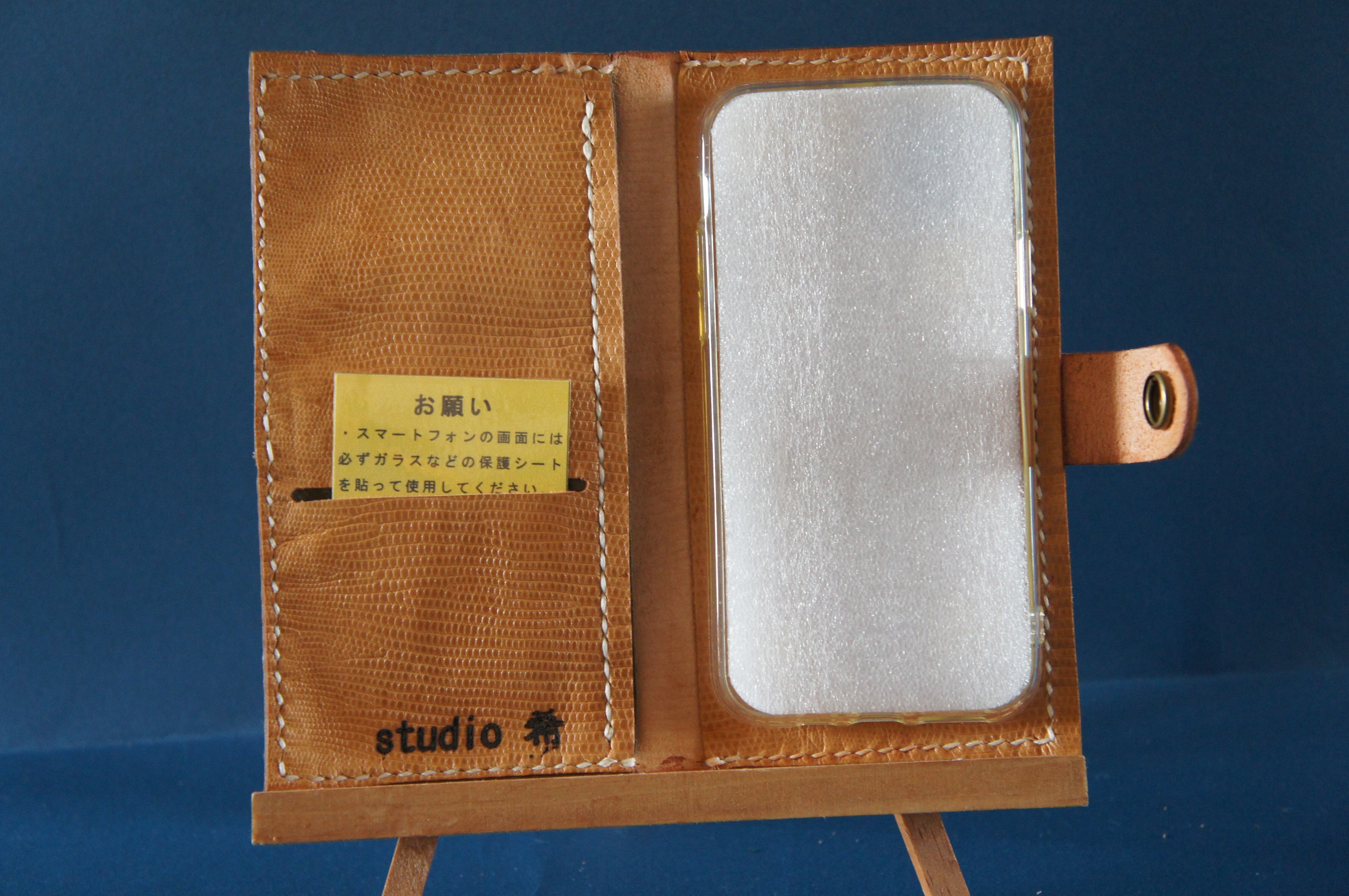 一点物です。iPhone11pro用の手帳型スマートフォンケースです。本体、内側、カードホルダー、ホルダー裏の合計4枚の革を縫い合わせています。太さ1番の白色の糸ですべて手縫いで仕上げています。2本の針で縫っていますので、ほつれにくい構造になっています。本体は1.5mmの厚さの蛇模様の茶色の牛革です。内側にも同じ革を使っています。カードホルダーが1つあります。カードホルダー部分の裏には収納スペースがあります。スマートフォンを固定する部分は、カシメ金具5個で固定してあります。バネホック、金具の色は銅色です。カメラ穴部分を固くするためには皮革硬化剤を使用しています。貼り付け部分はつるつるに磨いています。