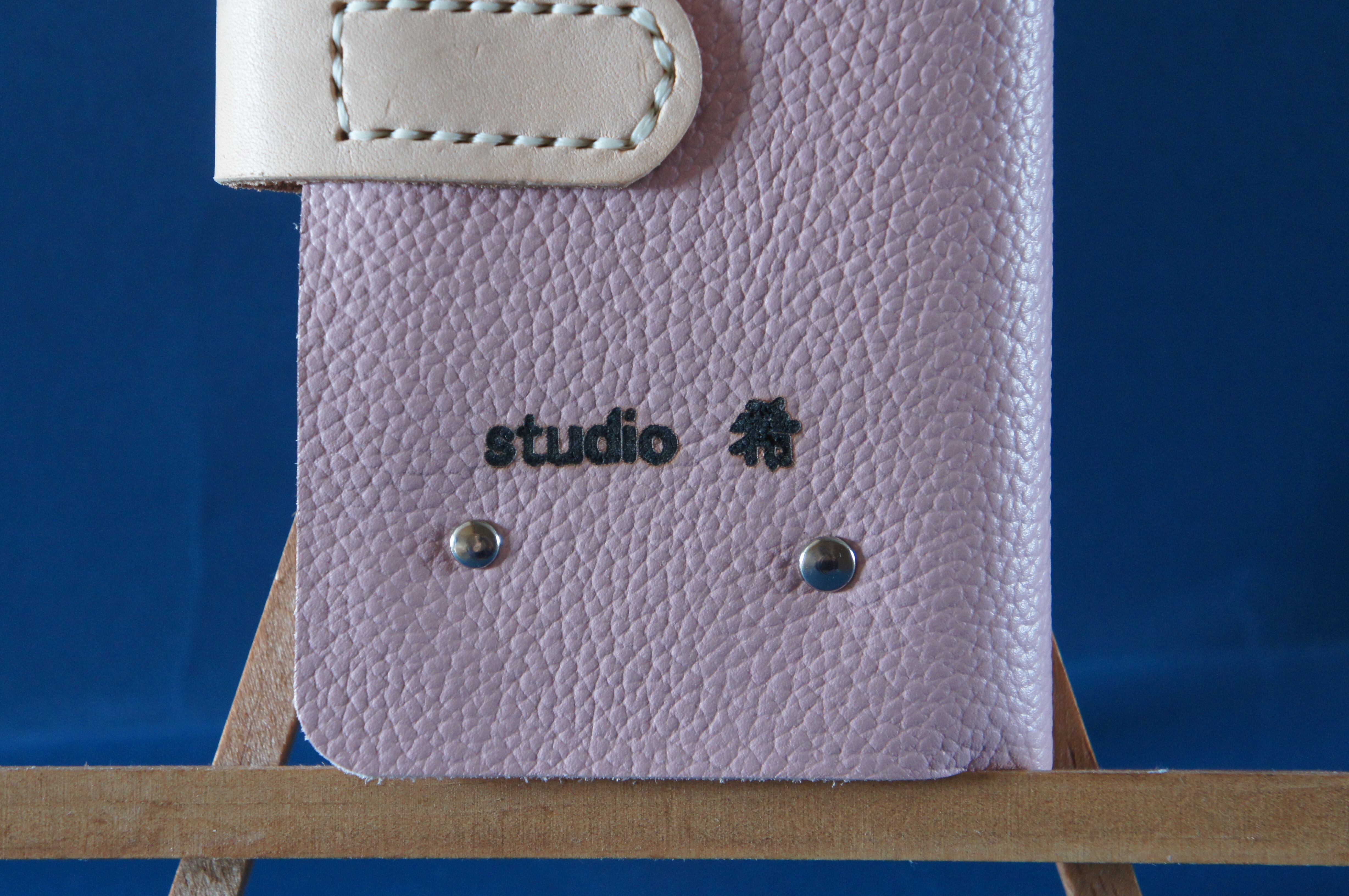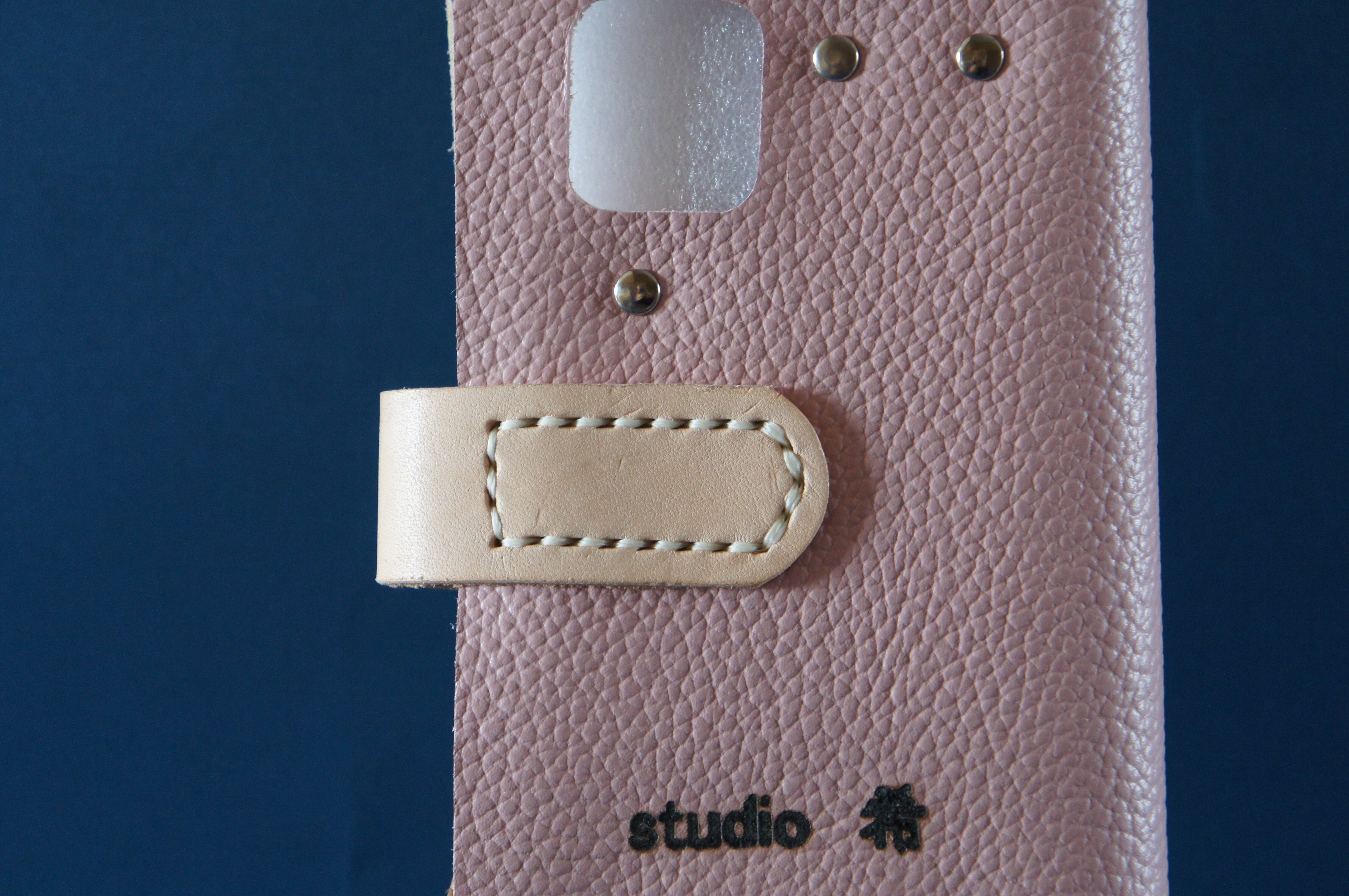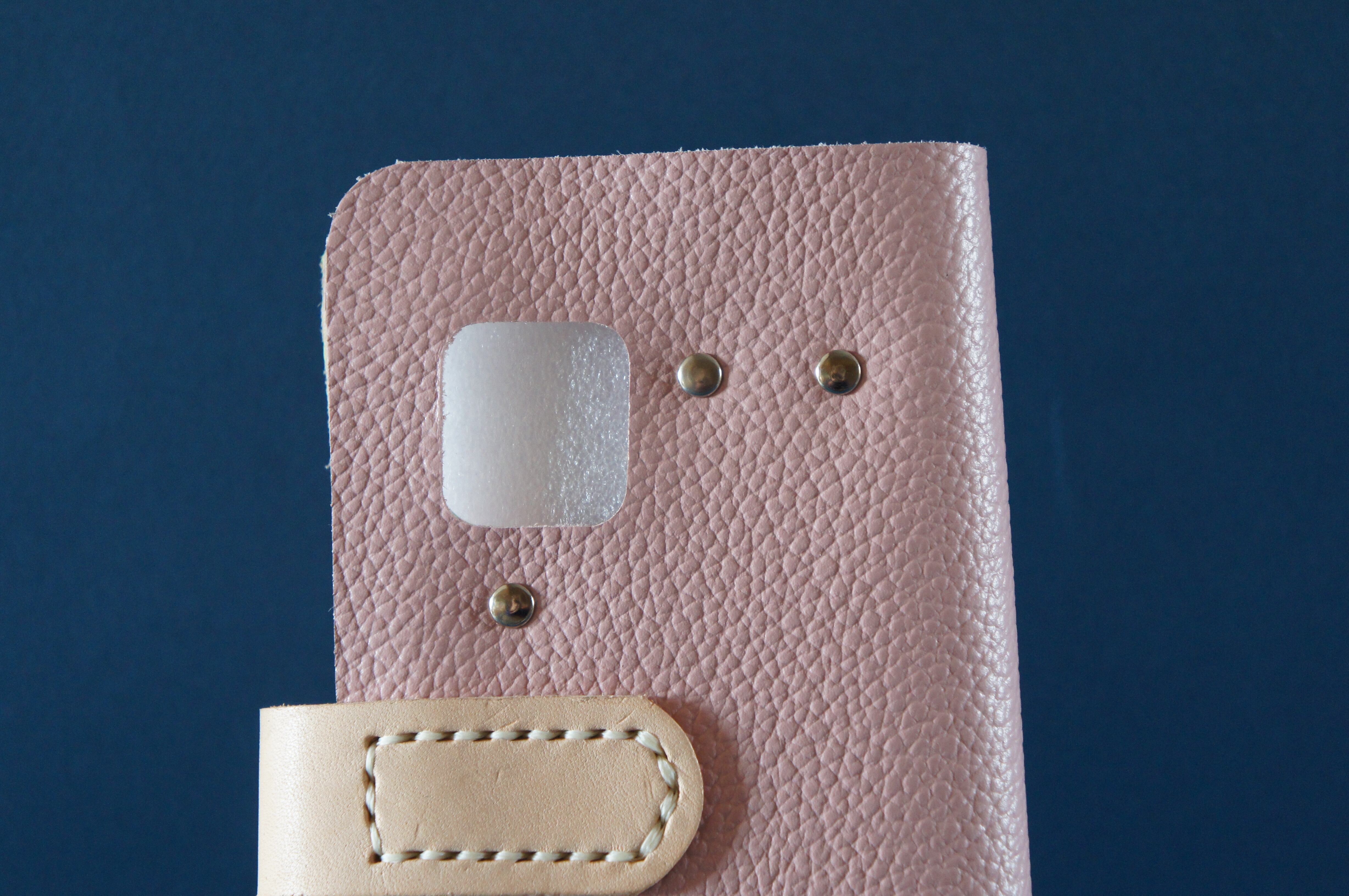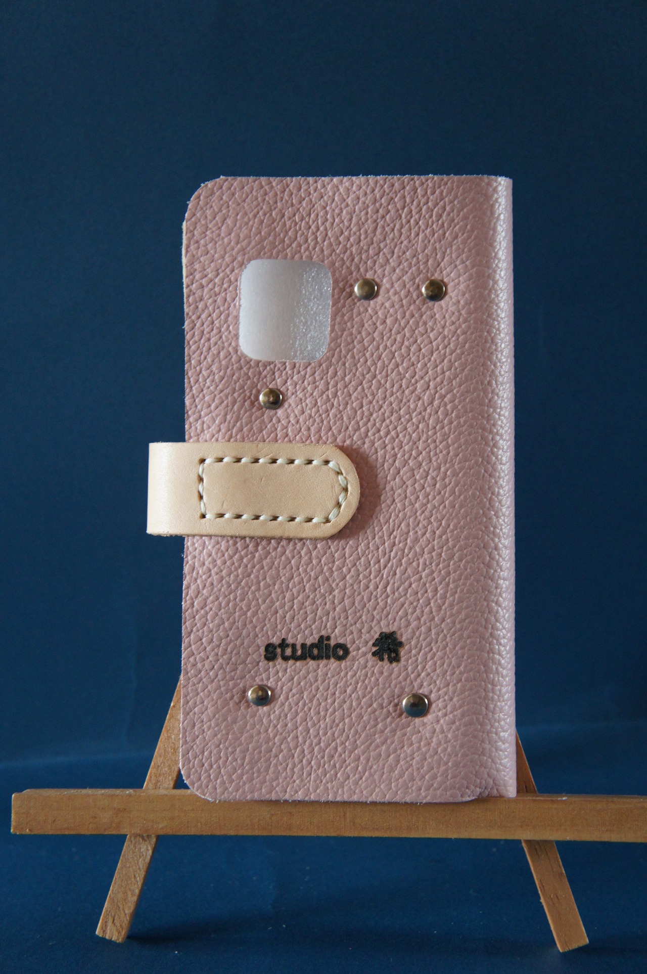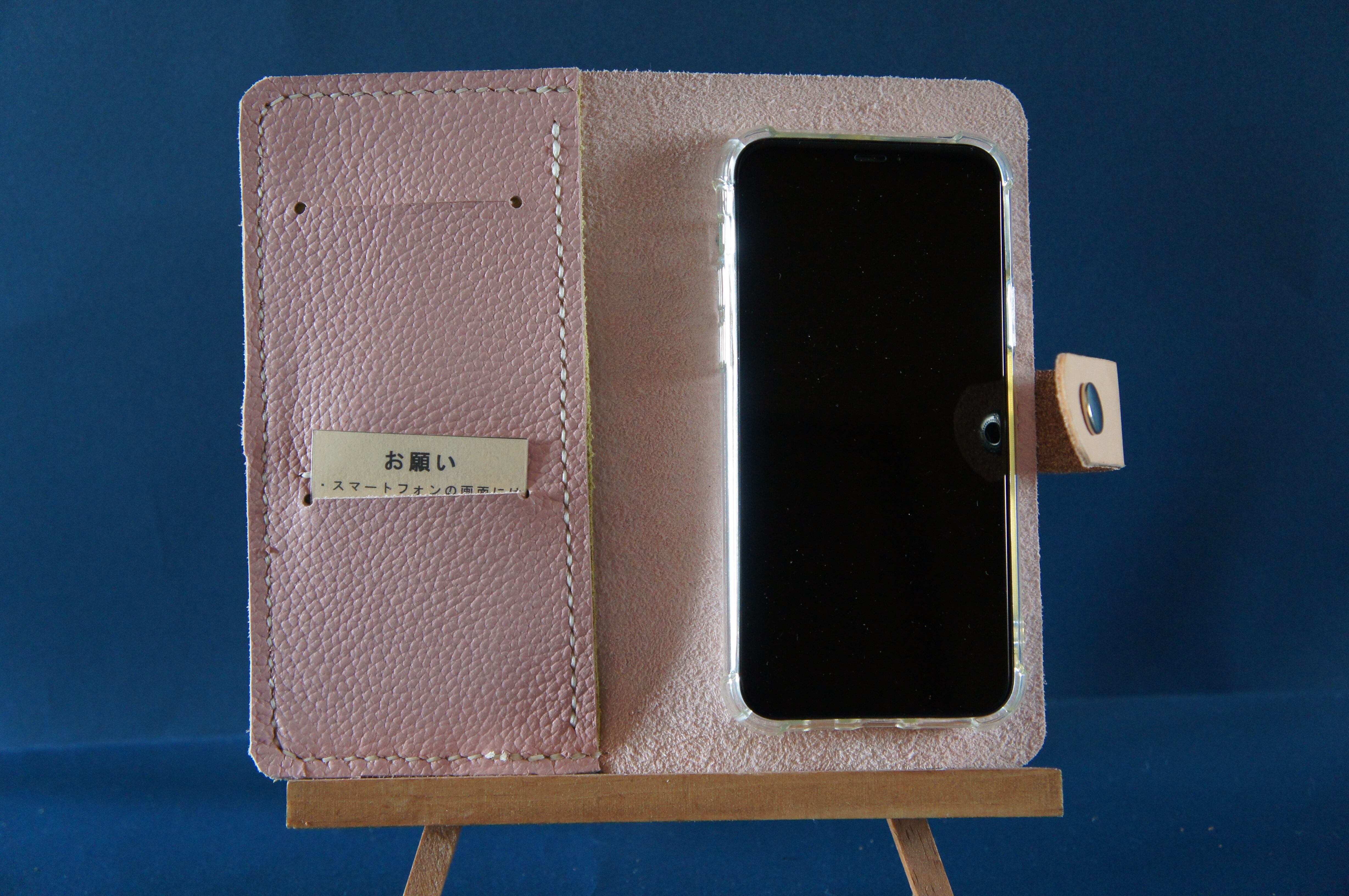 一点物です。iPhone11pro用の手帳型スマートフォンケースです。本体、カードホルダー、ホルダー裏の合計3枚の革を縫い合わせています。太さ1番の白色の糸ですべて手縫いで仕上げています。2本の針で縫っていますので、ほつれにくい構造になっています。本体は1.5mmの厚さのサーモンピンクのソフトシュリンクの牛革です。カードホルダーが2つあります。カードホルダー部分の裏には収納スペースがあります。スマートフォンを固定する部分は、カシメ金具5個で固定してあります。バネホック、金具の色は銀色です。カメラ穴部分を固くするためには皮革硬化剤を使用しています。貼り付け部分はつるつるに磨いています。