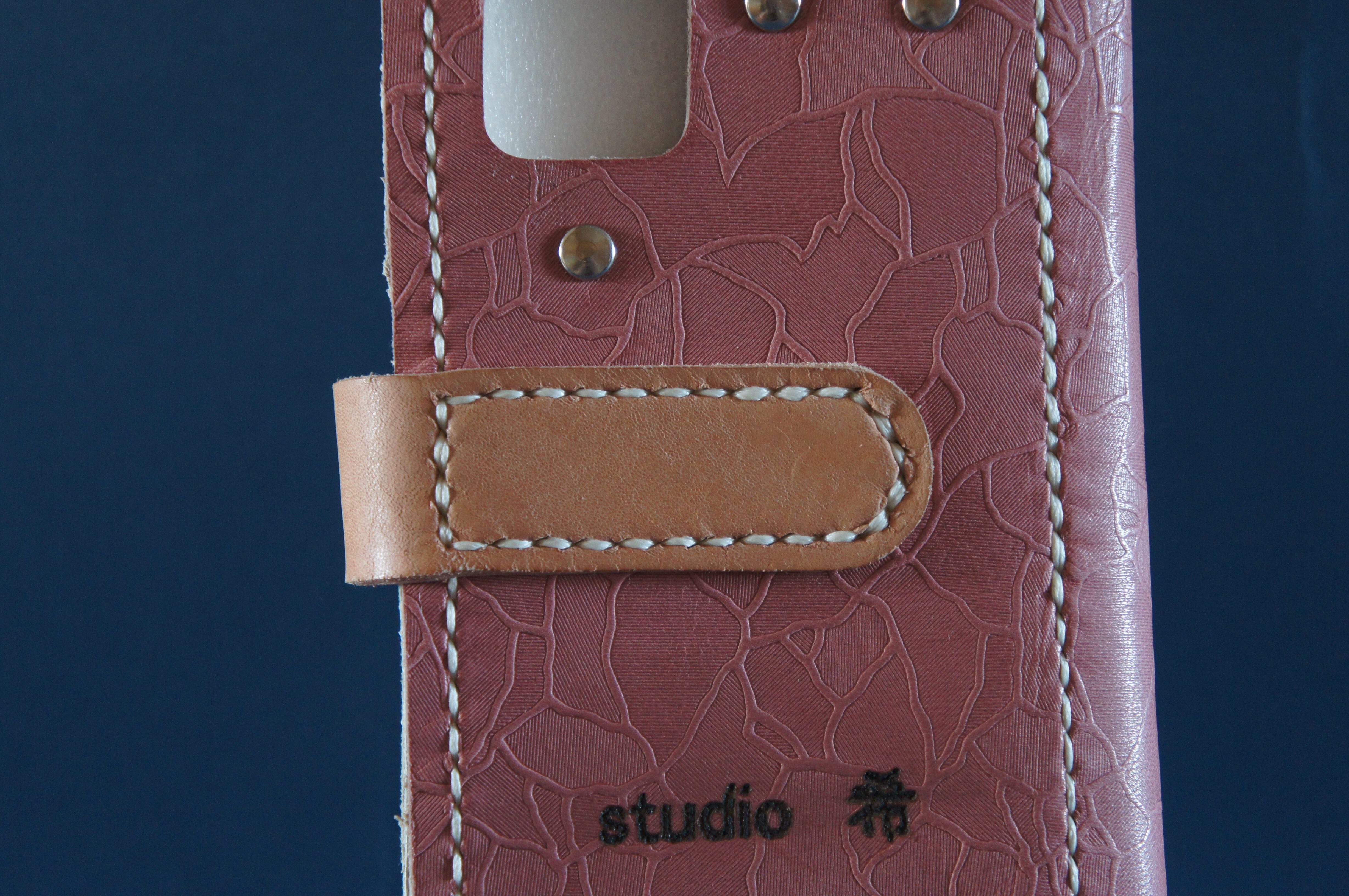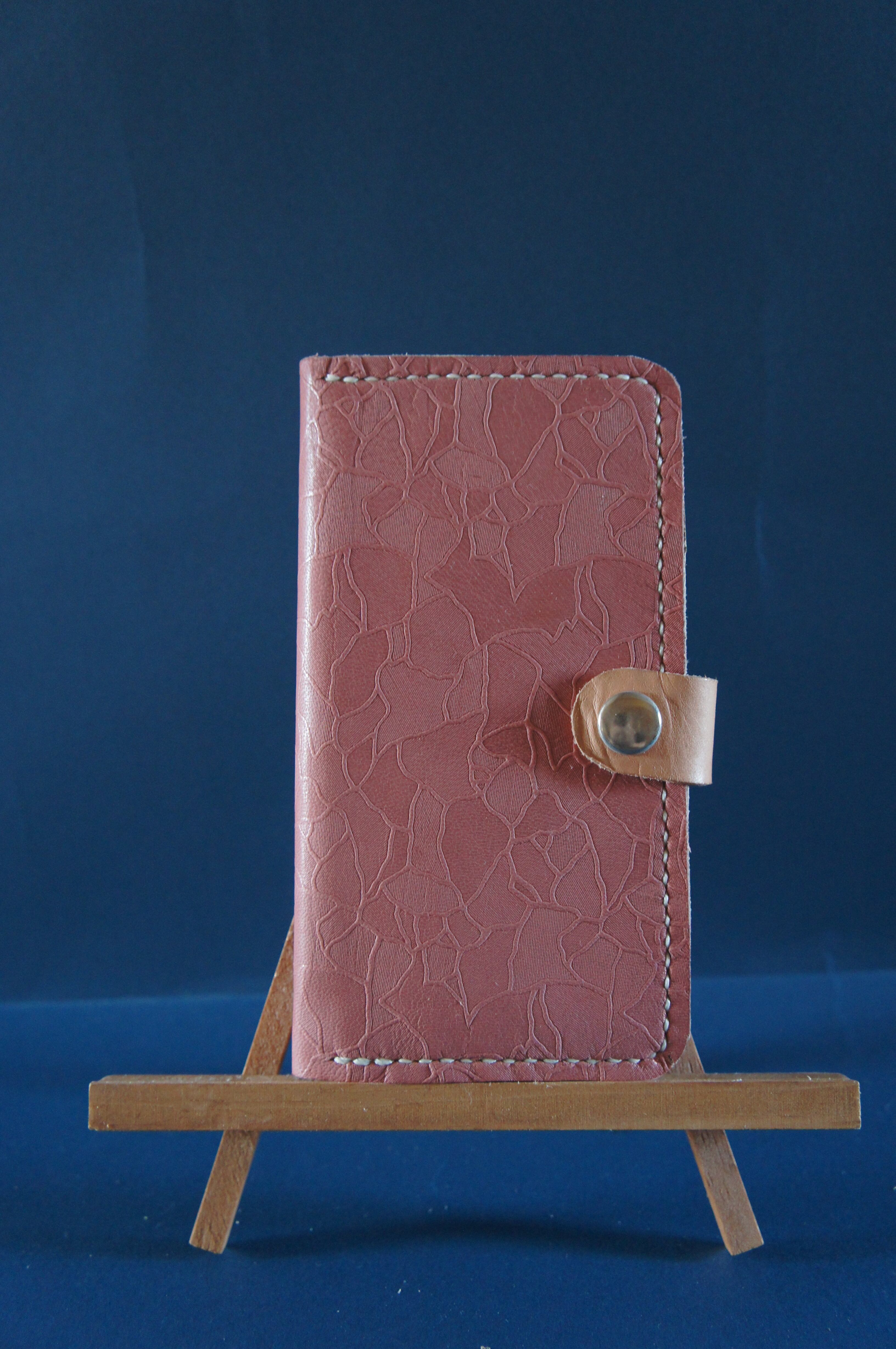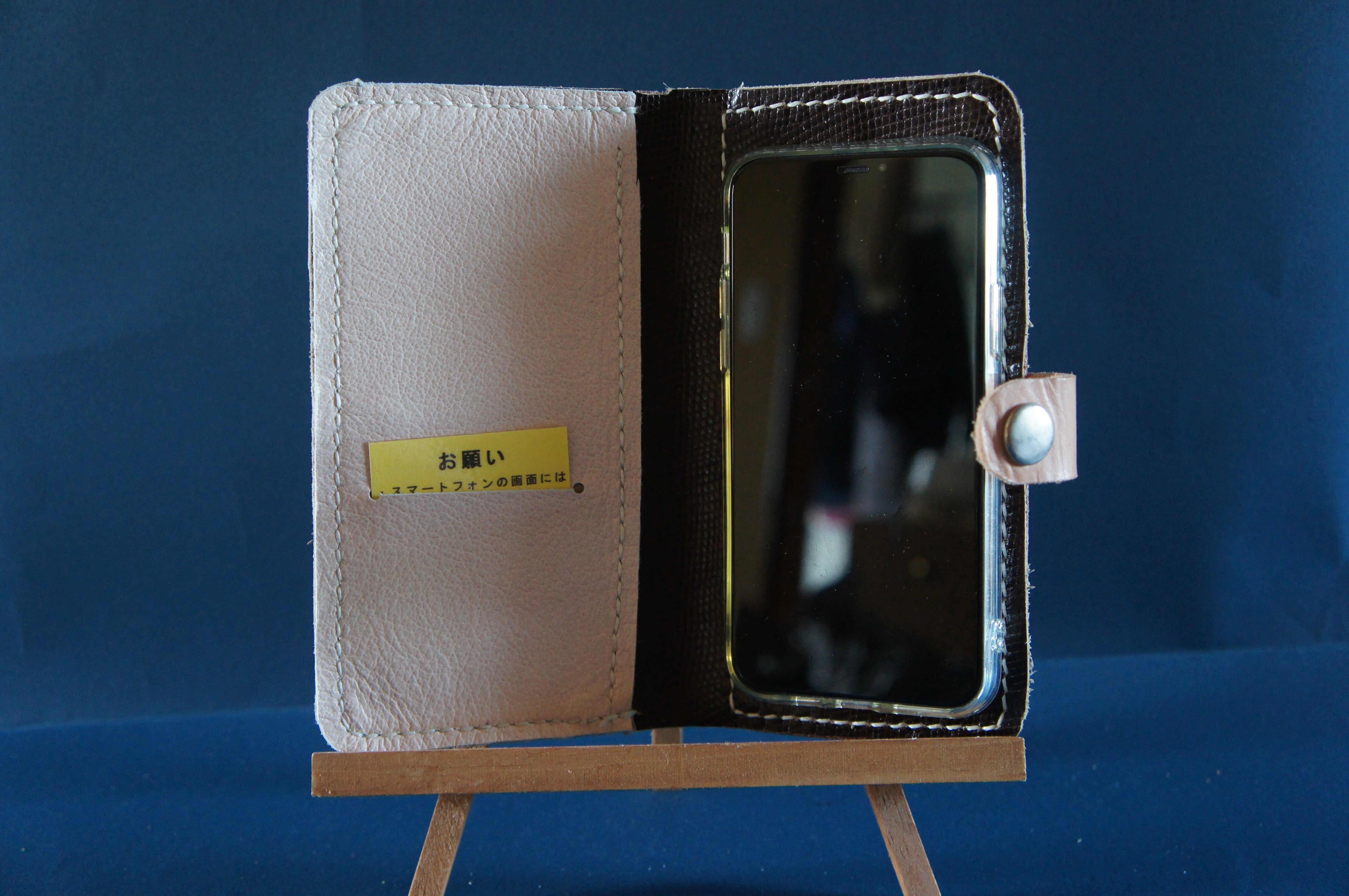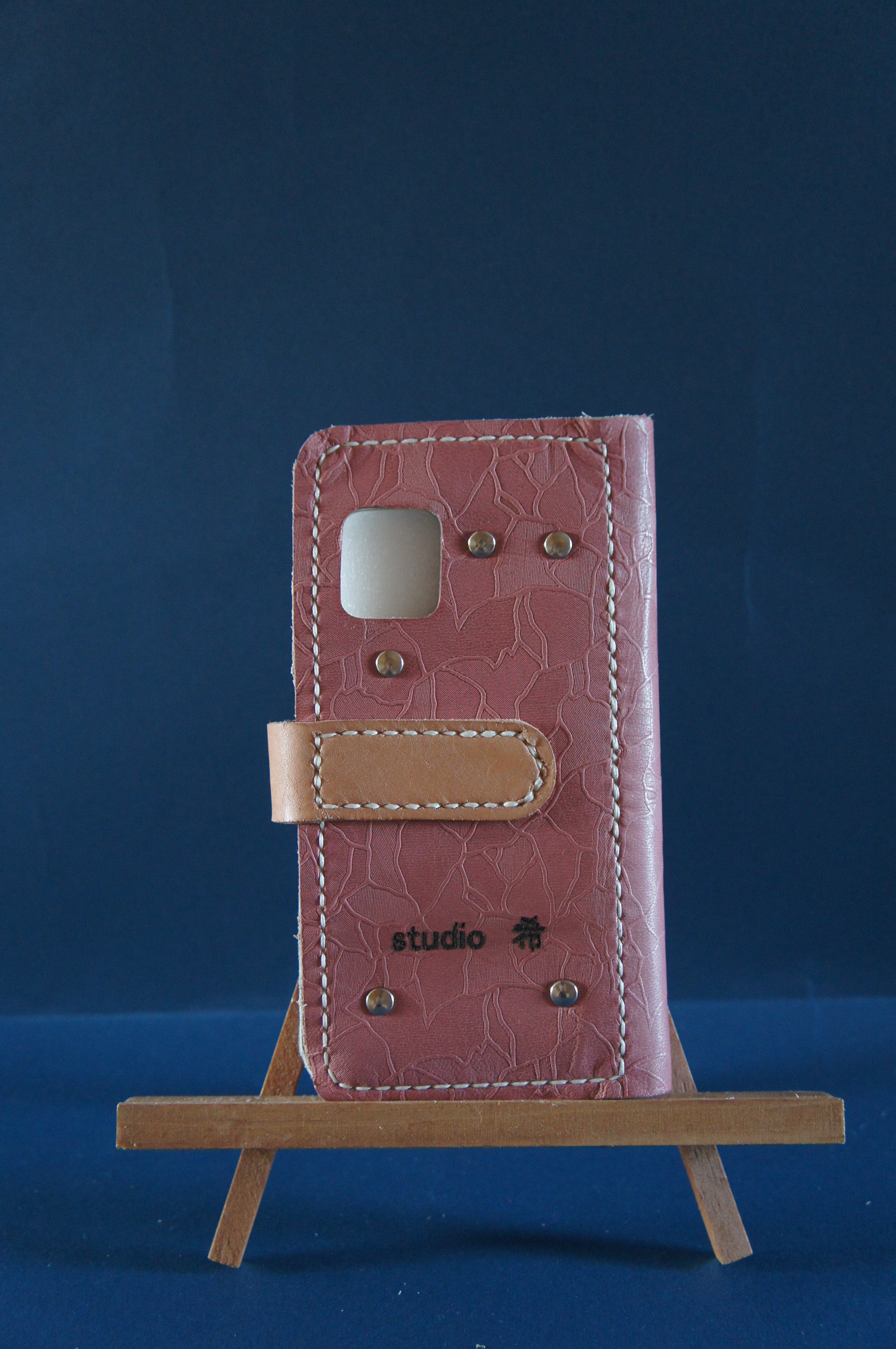一点物です。iPhone11pro用の手帳型スマートフォンケースです。本体、内側、カードホルダー、ホルダー裏の合計4枚の革を縫い合わせています。太さ1番の白色の糸ですべて手縫いで仕上げています。2本の針で縫っていますので、ほつれにくい構造になっています。本体は1.5mmの厚さの和柄モザイクのピンク色の牛革です。内側には厚さ0.8mmの牛革を使っています。カードホルダーが1つあります。カードホルダー部分の裏には収納スペースがあります。スマートフォンを固定する部分は、カシメ金具5個で固定してあります。バネホック、金具の色は銀色です。カメラ穴部分を固くするためには皮革硬化剤を使用しています。貼り付け部分はつるつるに磨いています。