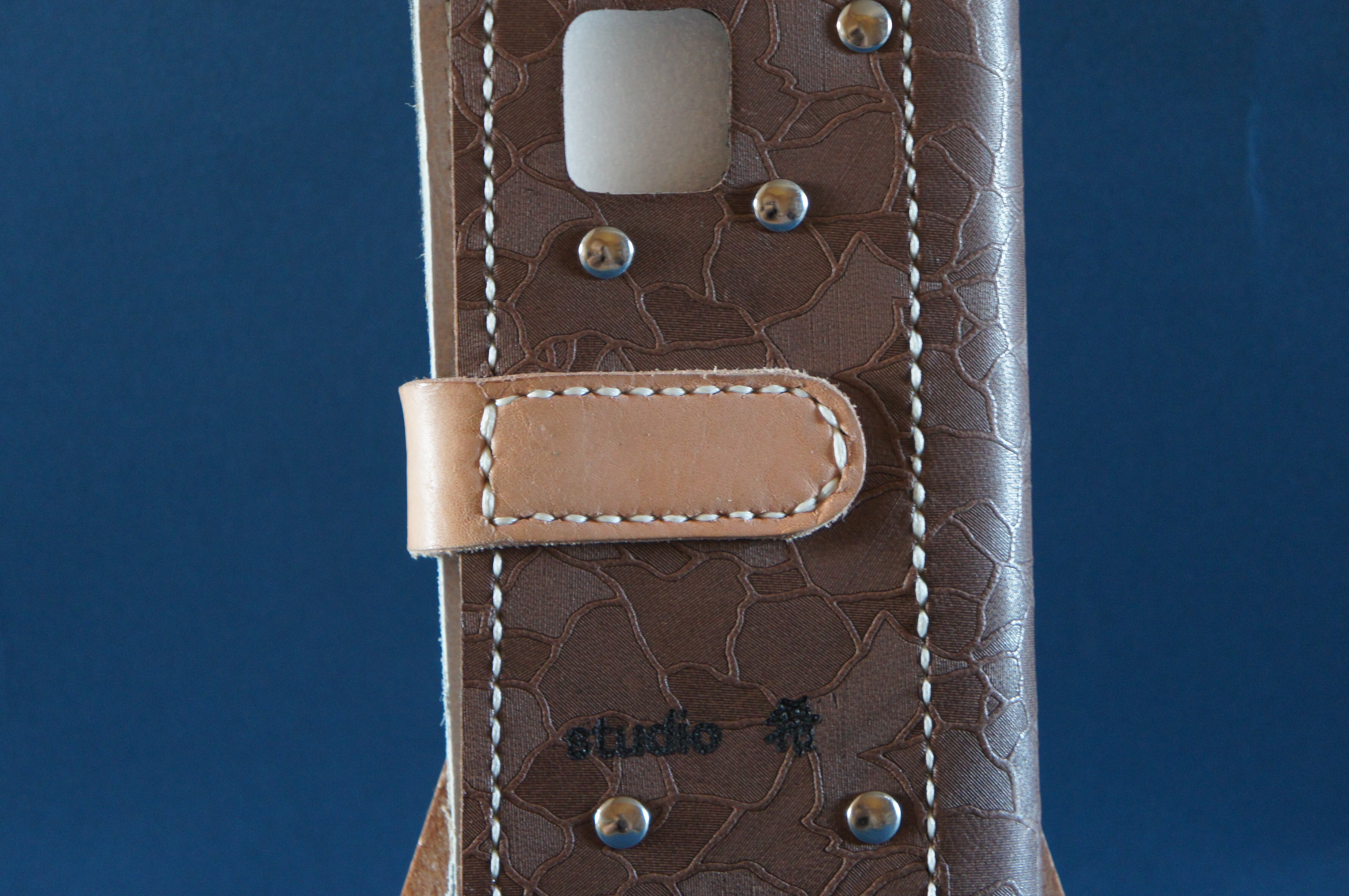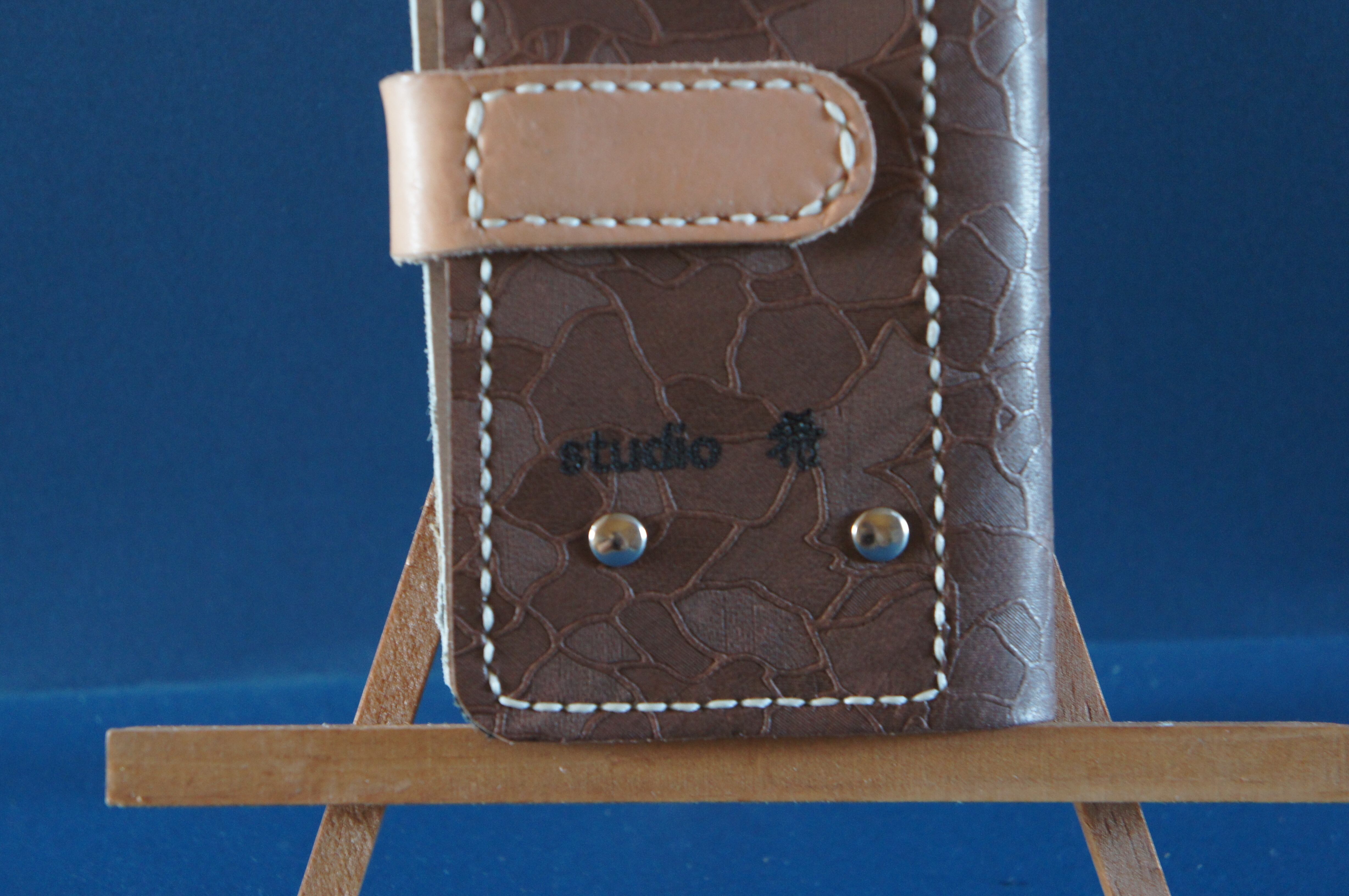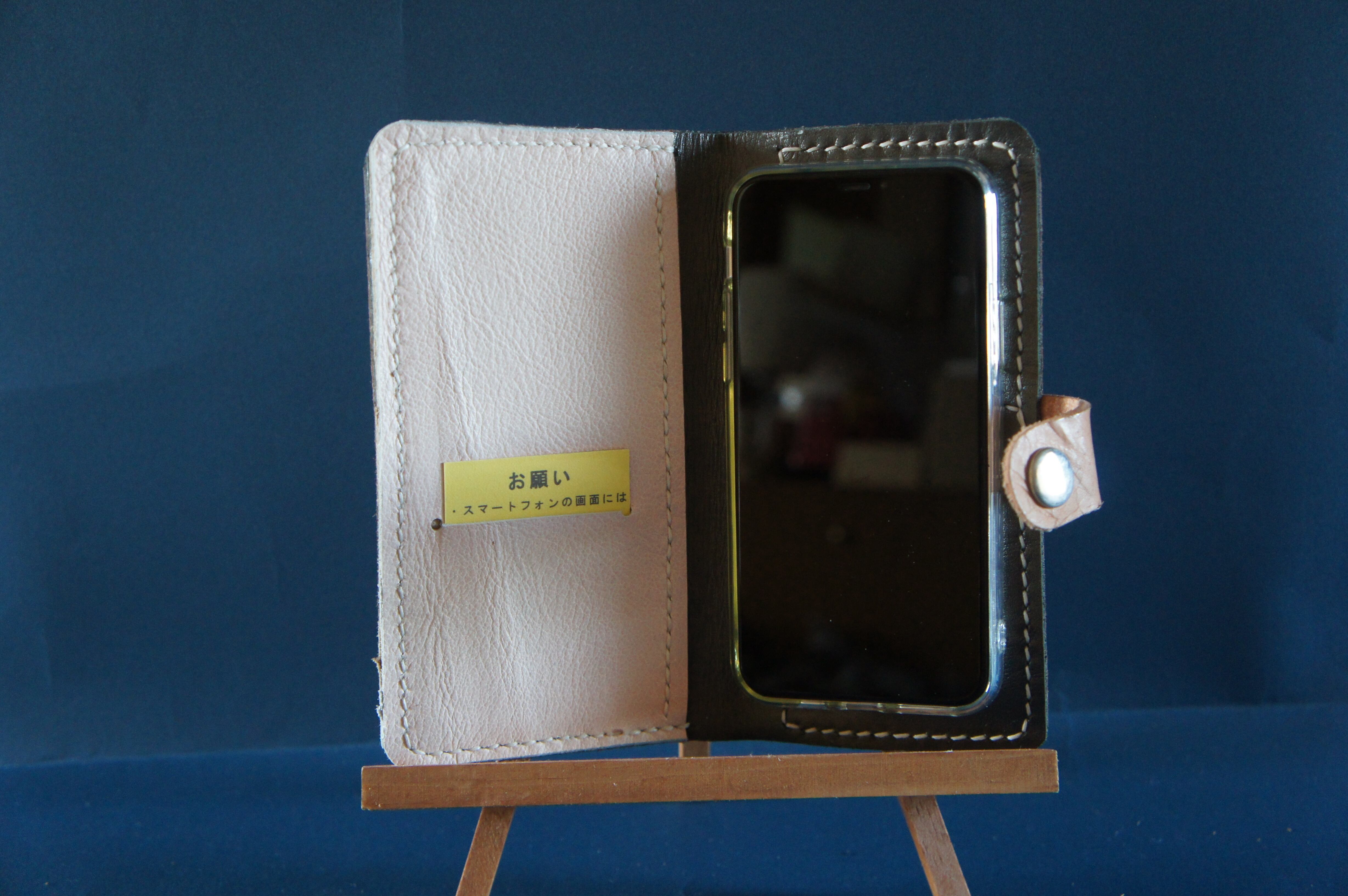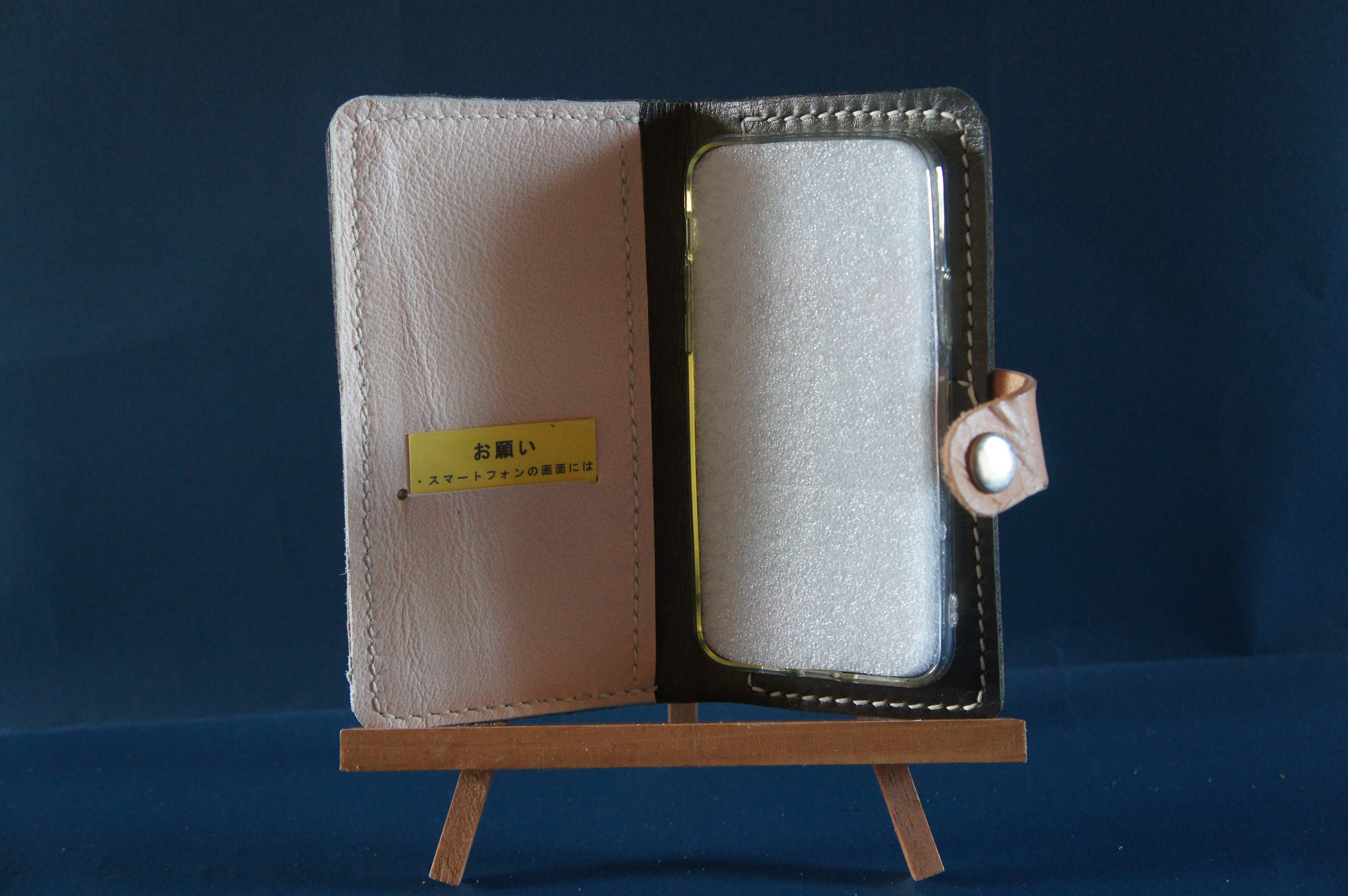 一点物です。iPhone11pro用の手帳型スマートフォンケースです。本体、内側、カードホルダー、ホルダー裏の合計4枚の革を縫い合わせています。太さ1番の白色の糸ですべて手縫いで仕上げています。2本の針で縫っていますので、ほつれにくい構造になっています。本体は1.5mmの厚さの和柄モザイクの茶色の牛革です。内側には厚さ1,0mmのグレイの牛革を使っています。カードホルダーが1つあります。カードホルダー部分の裏には収納スペースがあります。スマートフォンを固定する部分は、カシメ金具5個で固定してあります。バネホック、金具の色は銀色です。カメラ穴部分を固くするためには皮革硬化剤を使用しています。貼り付け部分はつるつるに磨いています。