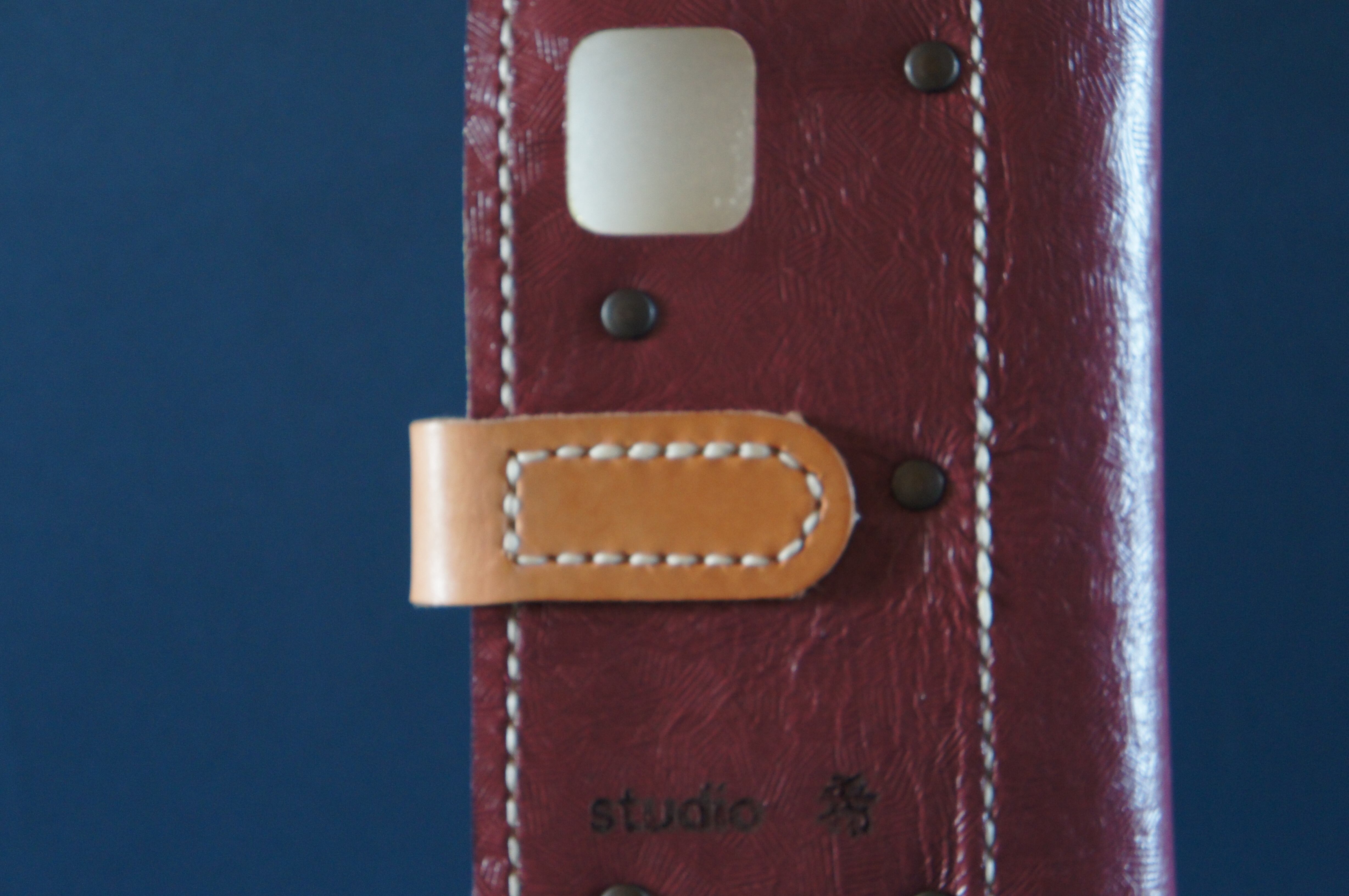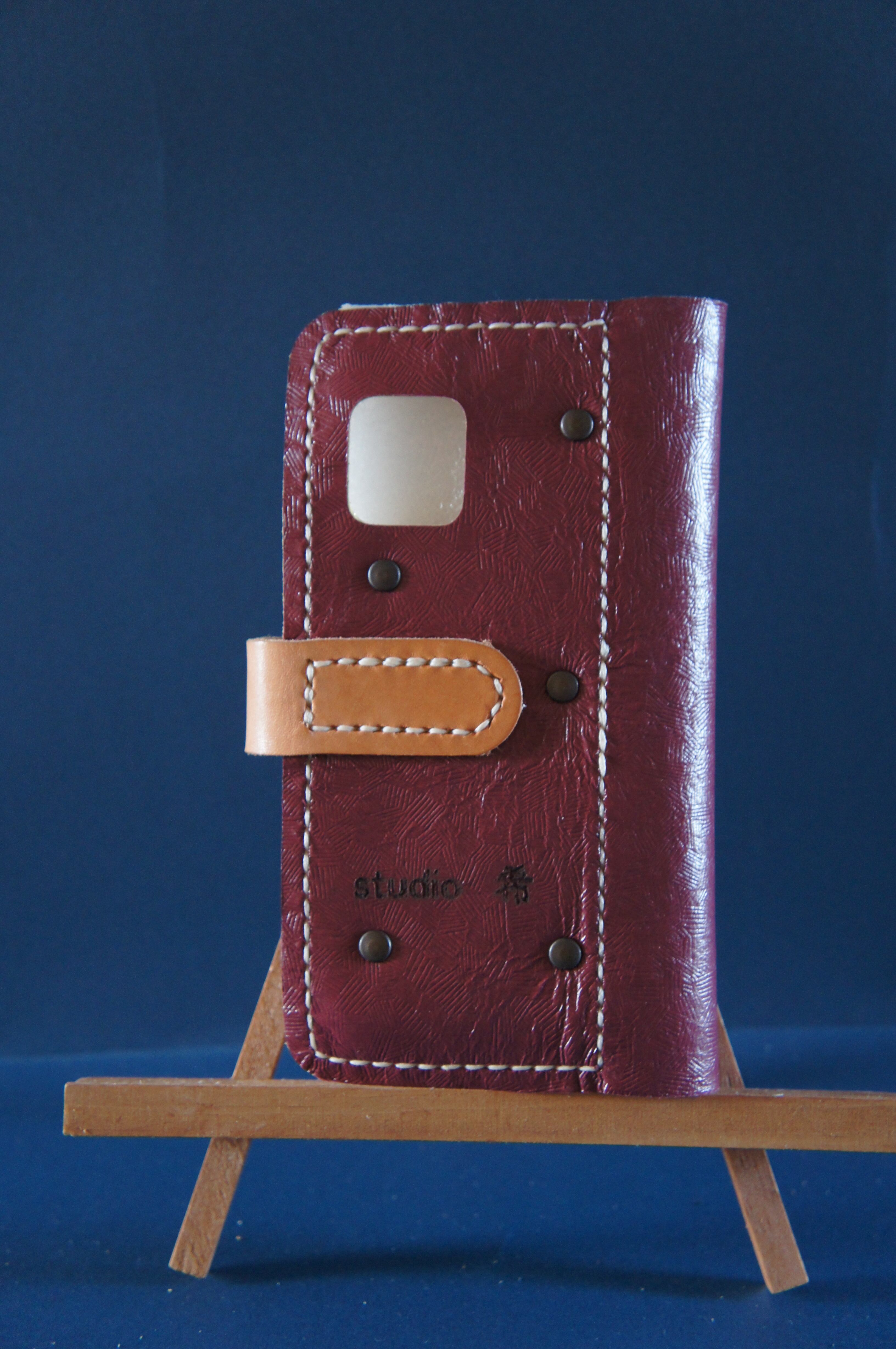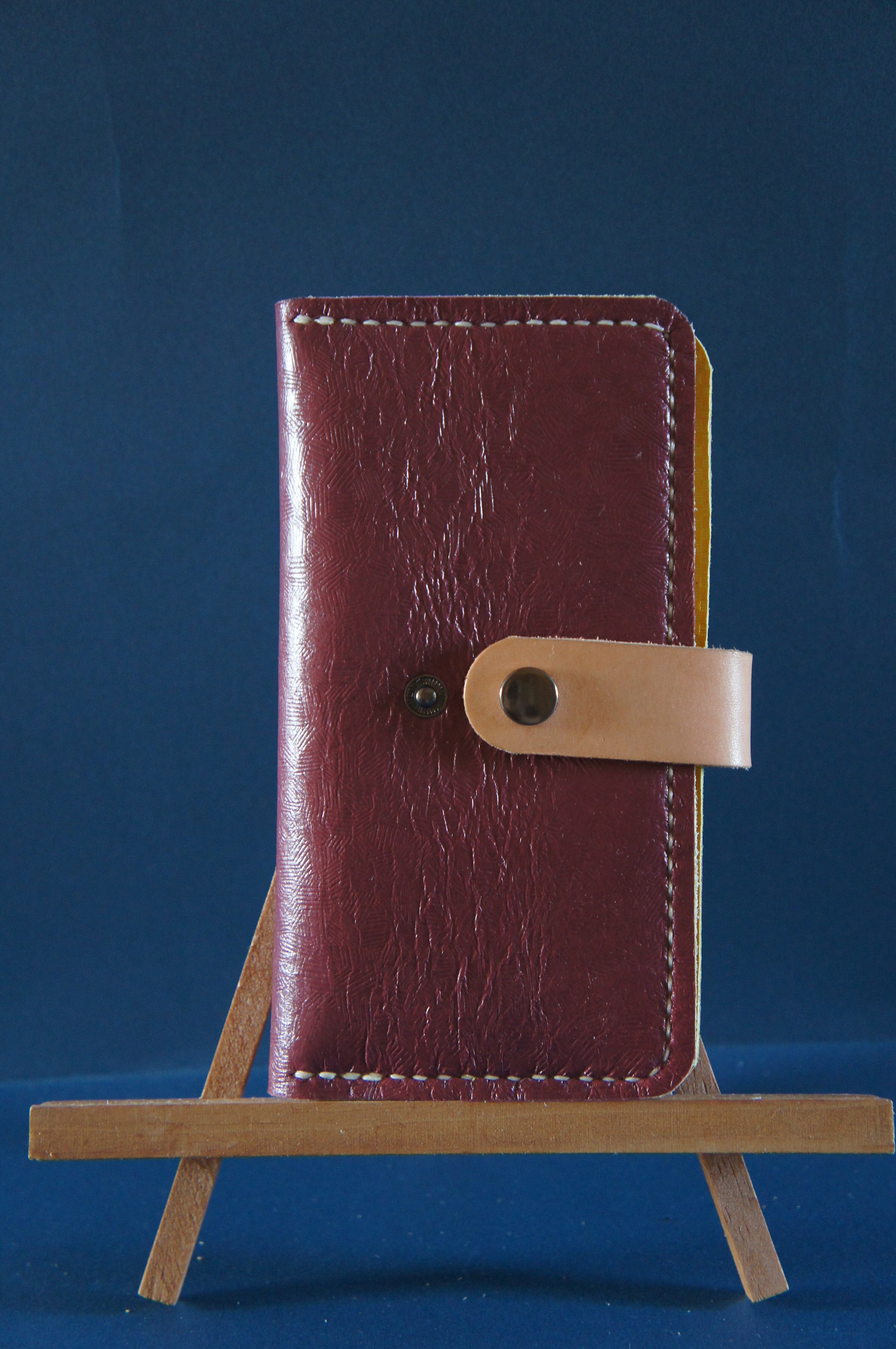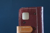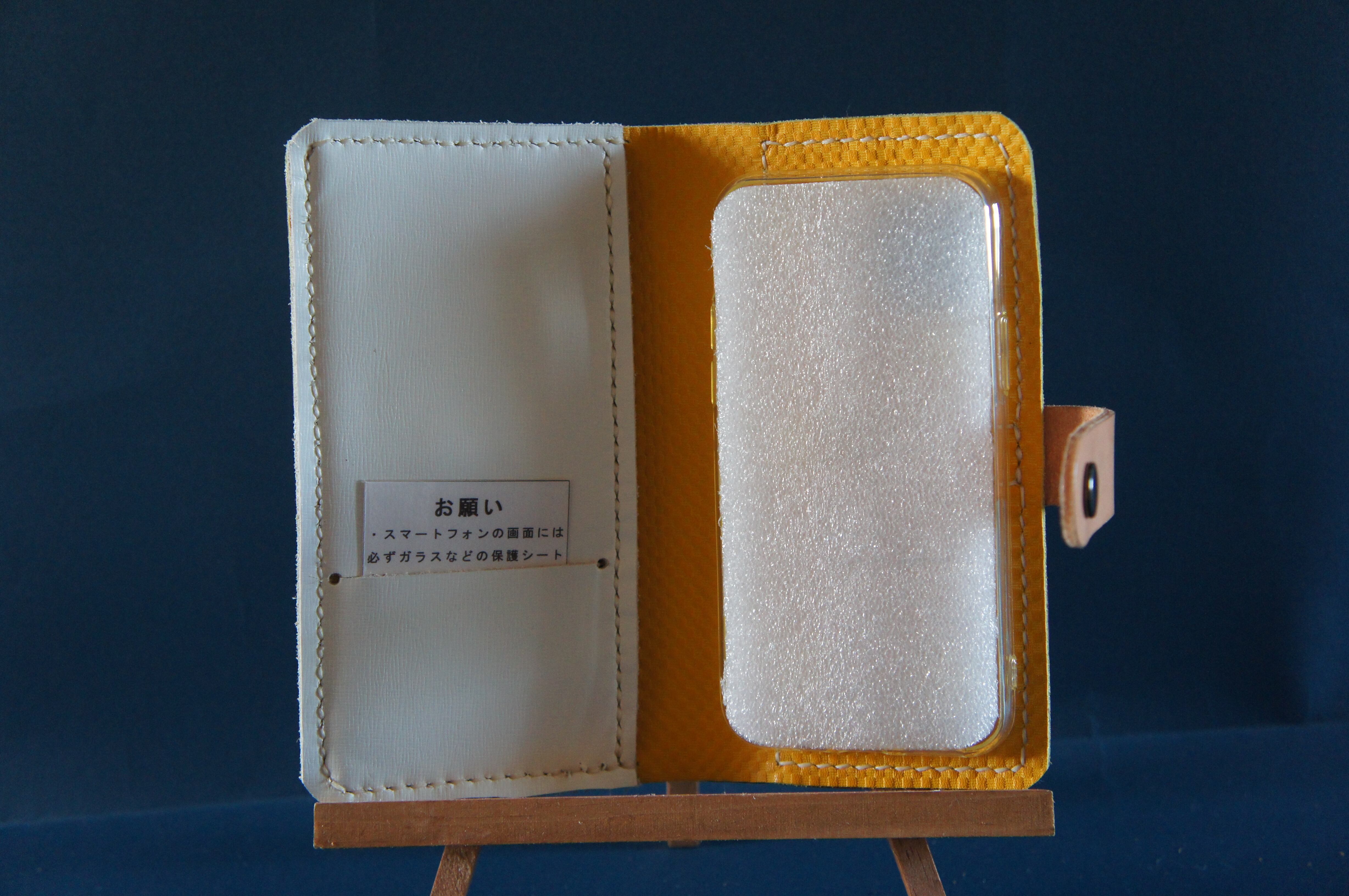 一点物です。iPhone11pro用の手帳型スマートフォンケースです。本体、内側、カードホルダー、ホルダー裏の合計4枚の革を縫い合わせています。太さ1番の白色の糸ですべて手縫いで仕上げています。2本の針で縫っていますので、ほつれにくい構造になっています。本体は1.5mmの厚さの和柄モザイクの紫色の牛革です。内側には厚さ1.0mmの黄色の牛革を使っています。カードホルダーが1つあります。カードホルダー部分の裏には収納スペースがあります。スマートフォンを固定する部分は、カシメ金具5個で固定してあります。バネホック、金具の色はブロンズです。カメラ穴部分を固くするためには皮革硬化剤を使用しています。貼り付け部分はつるつるに磨いています。
