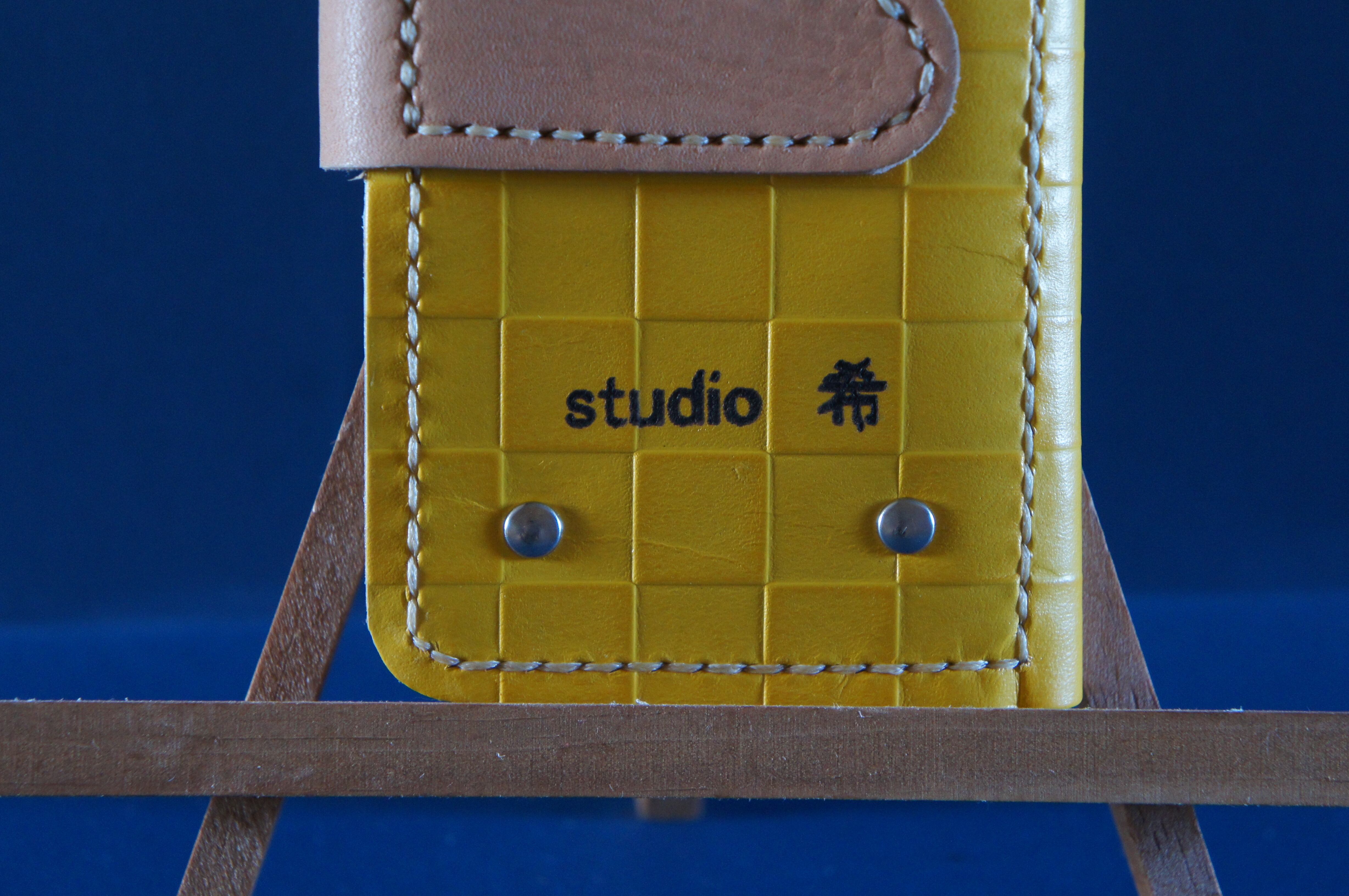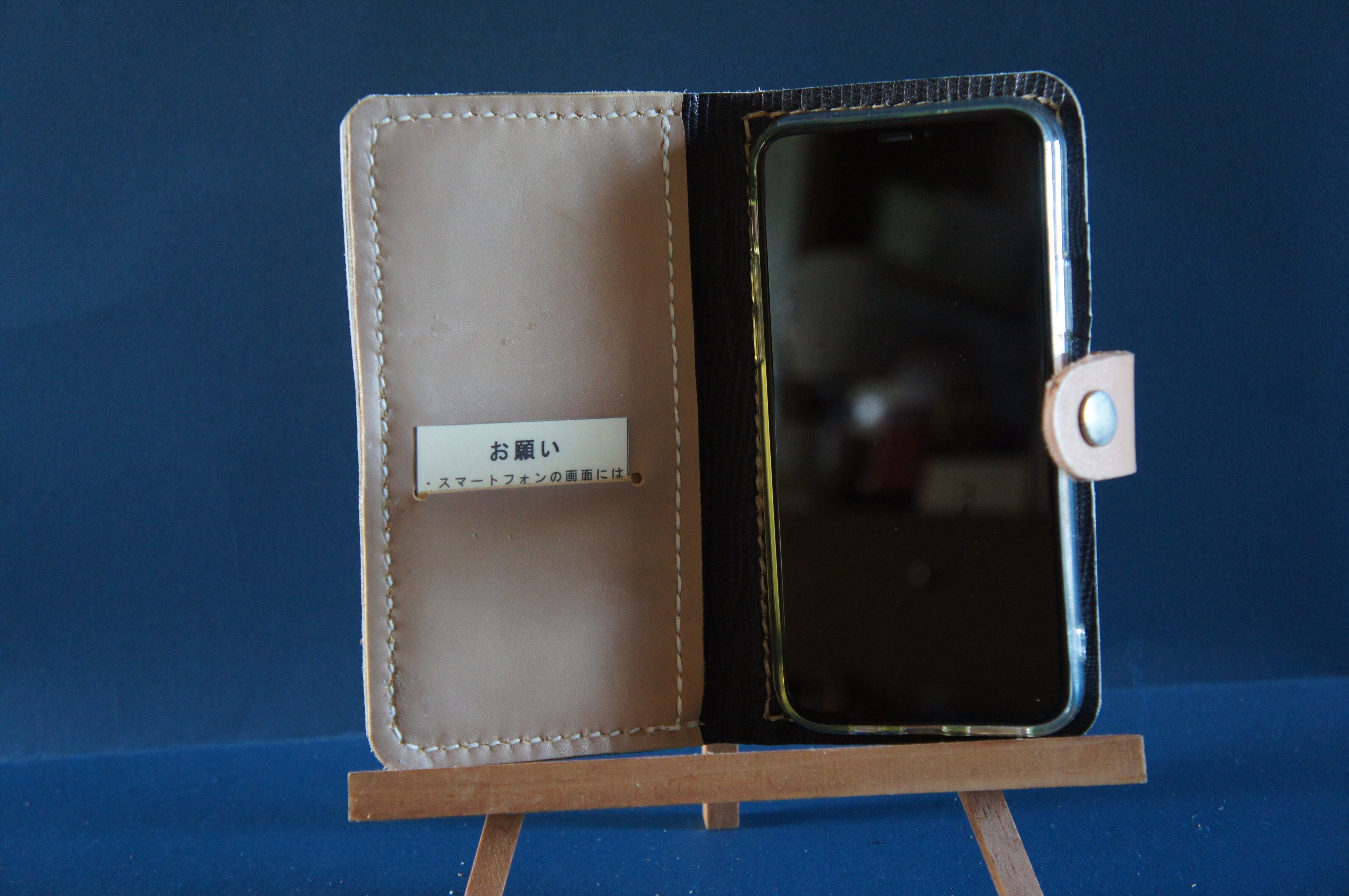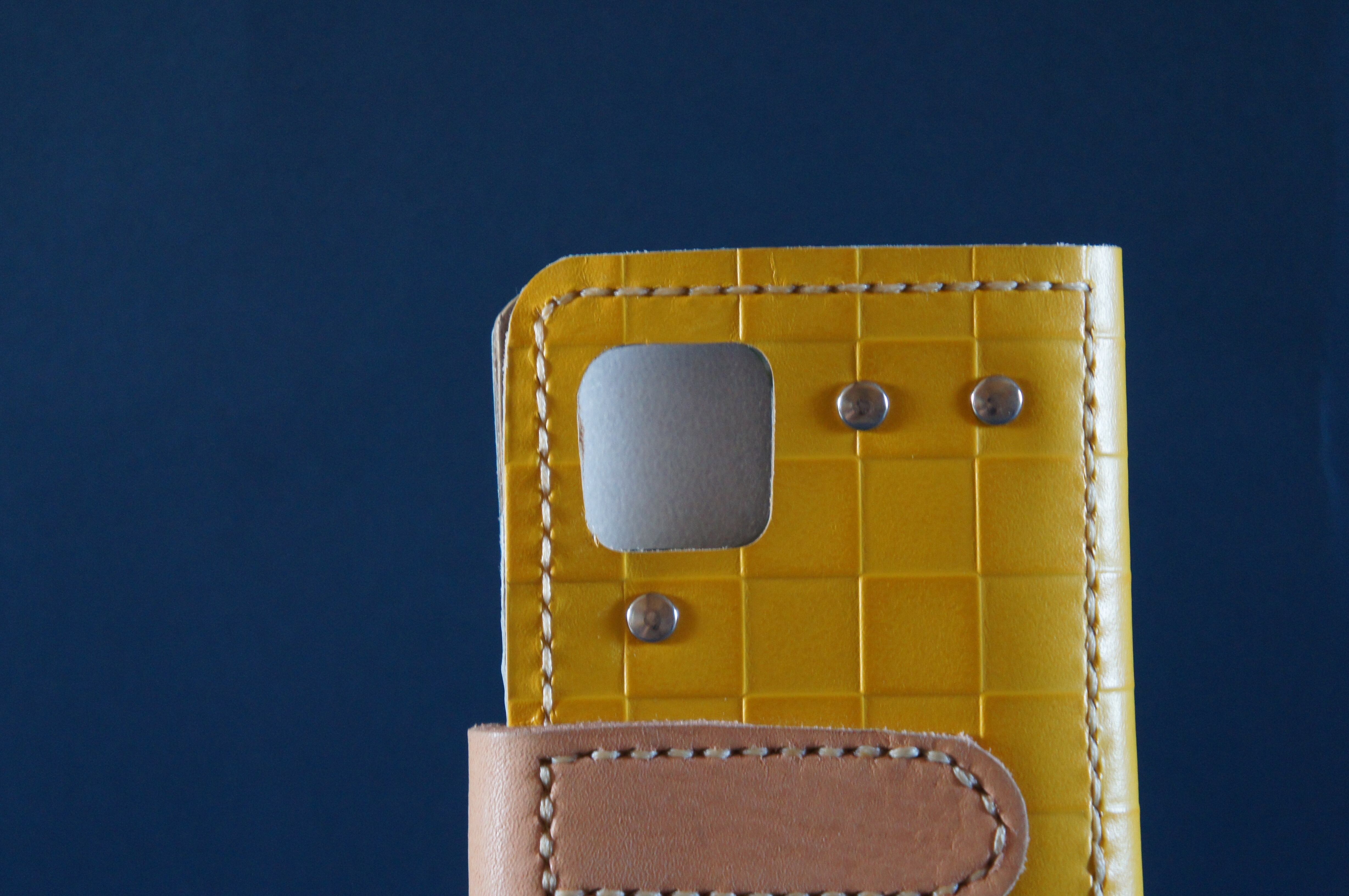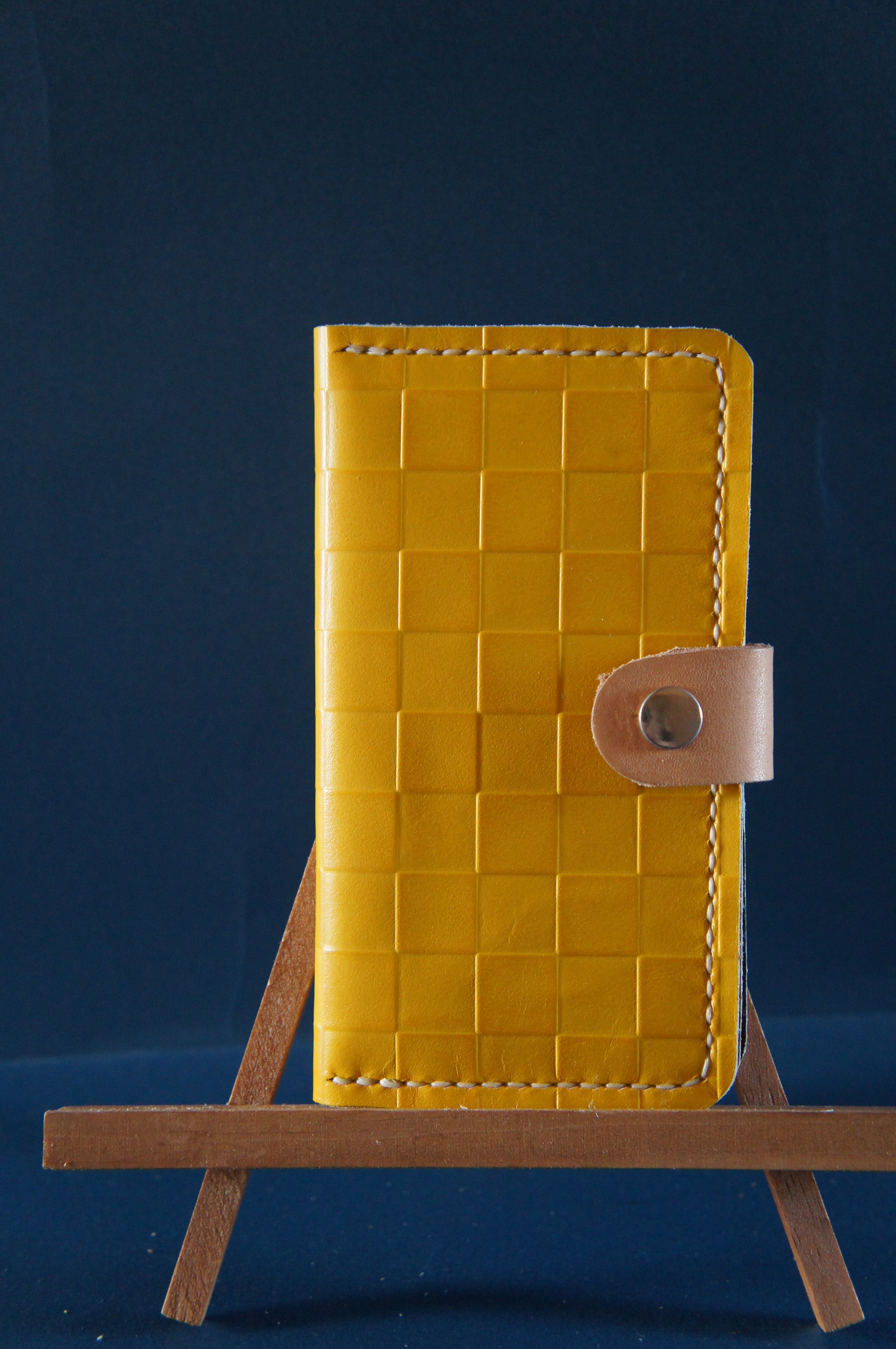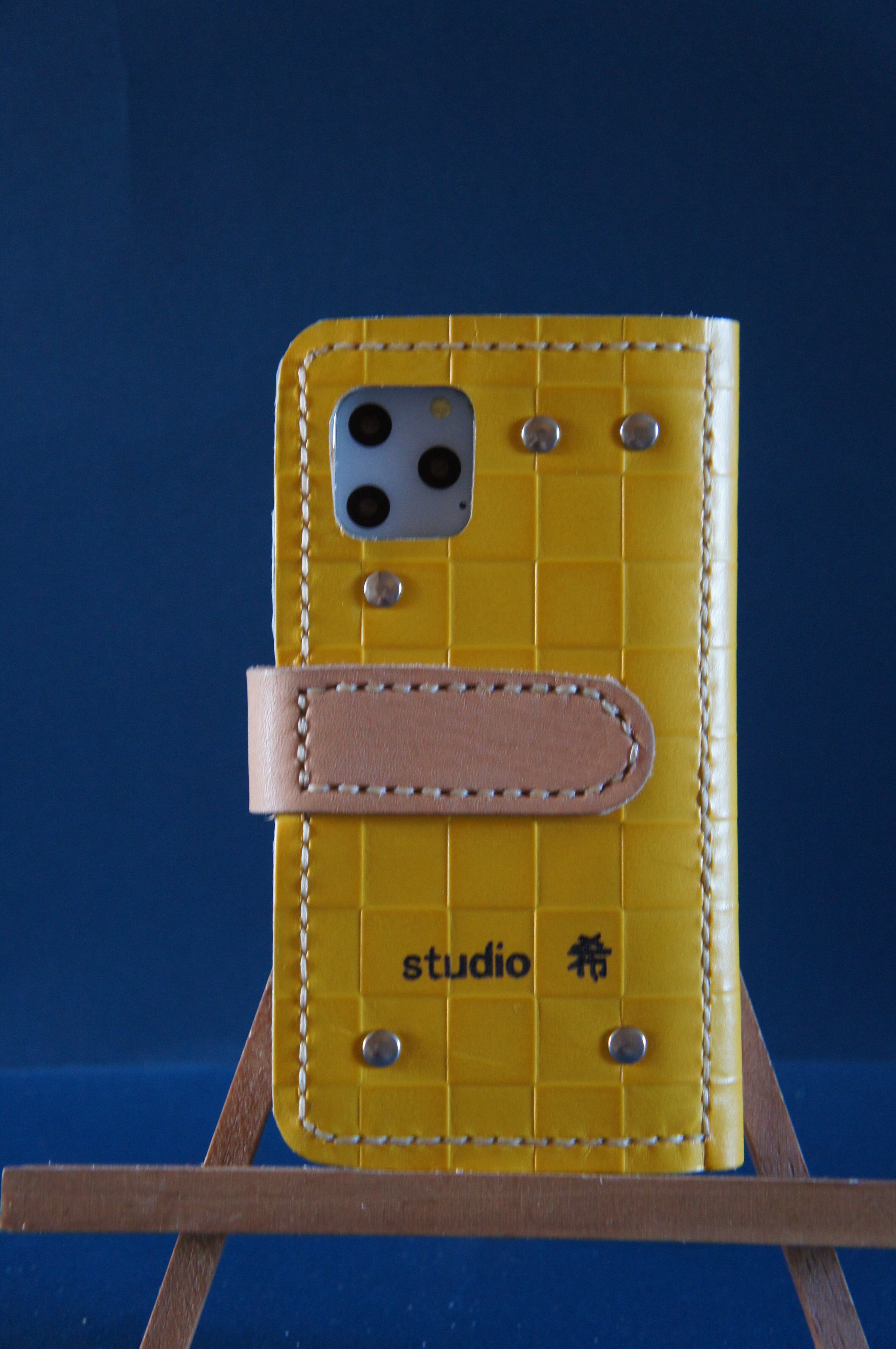 一点物です。iPhone11pro用の手帳型スマートフォンケースです。本体、内側、カードホルダー、ホルダー裏の合計4枚の革を縫い合わせています。太さ1番の白色の糸ですべて手縫いで仕上げています。2本の針で縫っていますので、ほつれにくい構造になっています。本体は1.5mmの厚さの市松模様の黄色の牛革です。内側には厚さ0.8mmの牛革を使っています。カードホルダーが1つあります。カードホルダー部分の裏には収納スペースがあります。スマートフォンを固定する部分は、カシメ金具5個で固定してあります。バネホック、金具の色は銀色です。カメラ穴部分を固くするためには皮革硬化剤を使用しています。貼り付け部分はつるつるに磨いています。