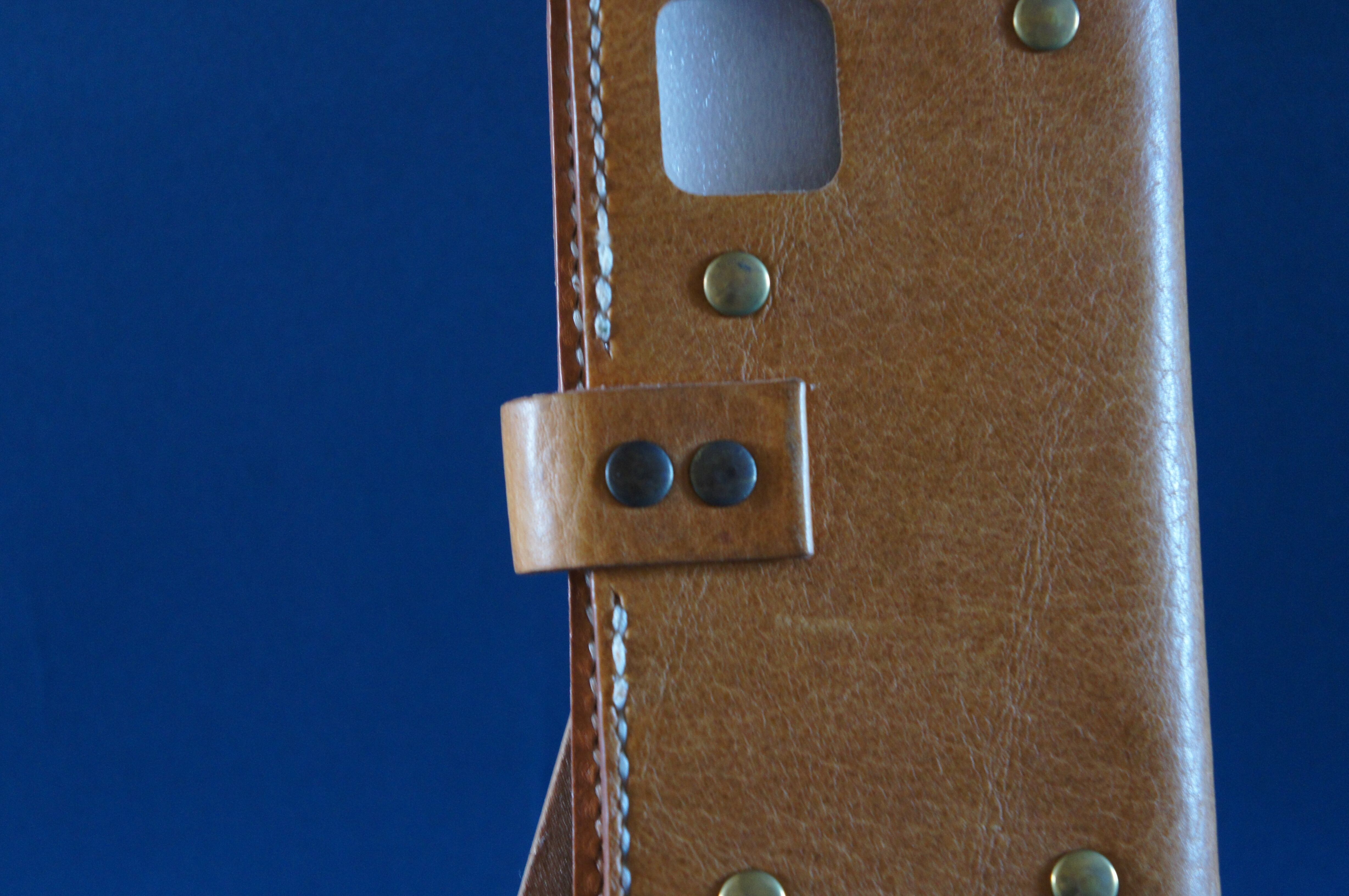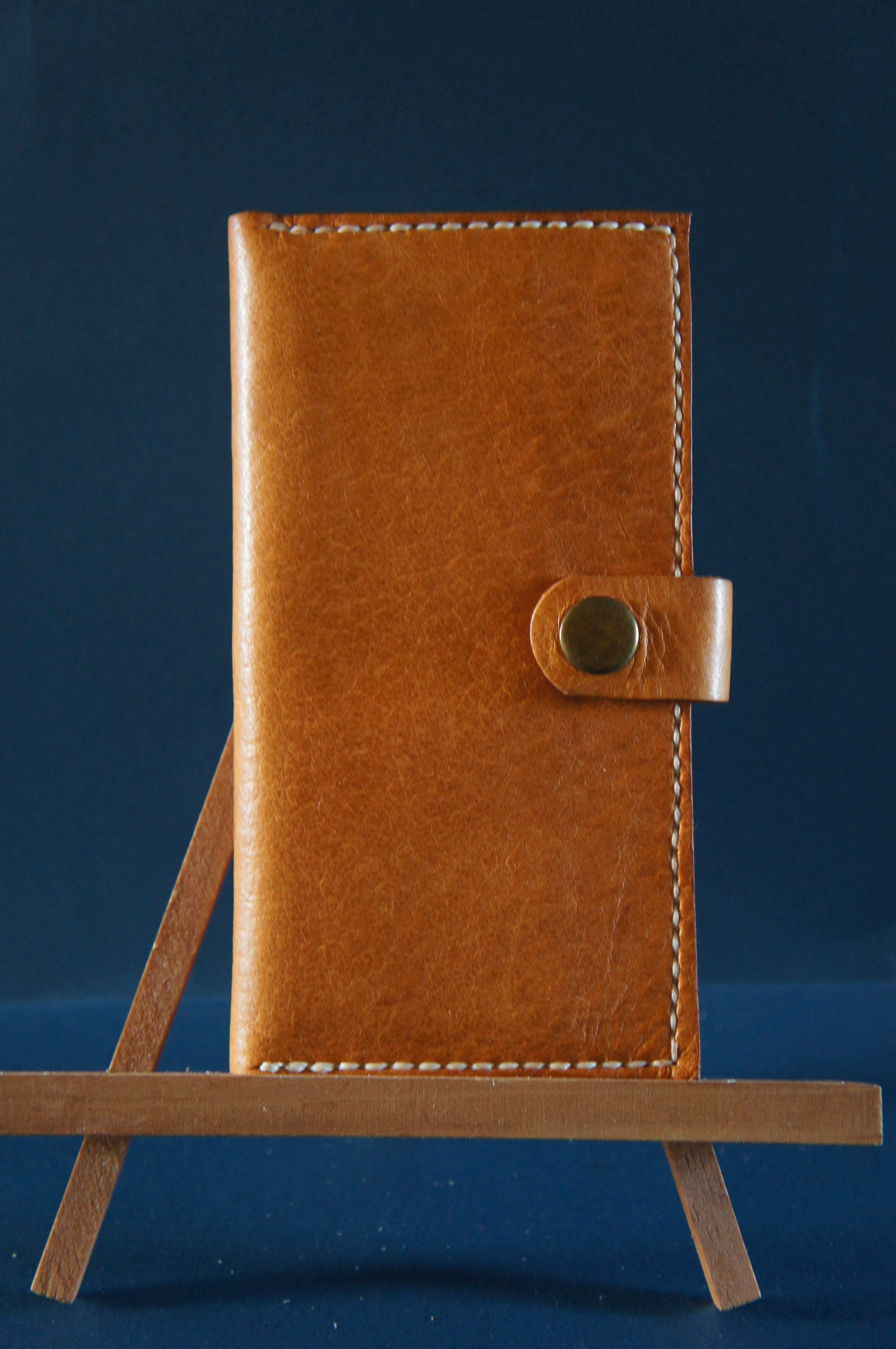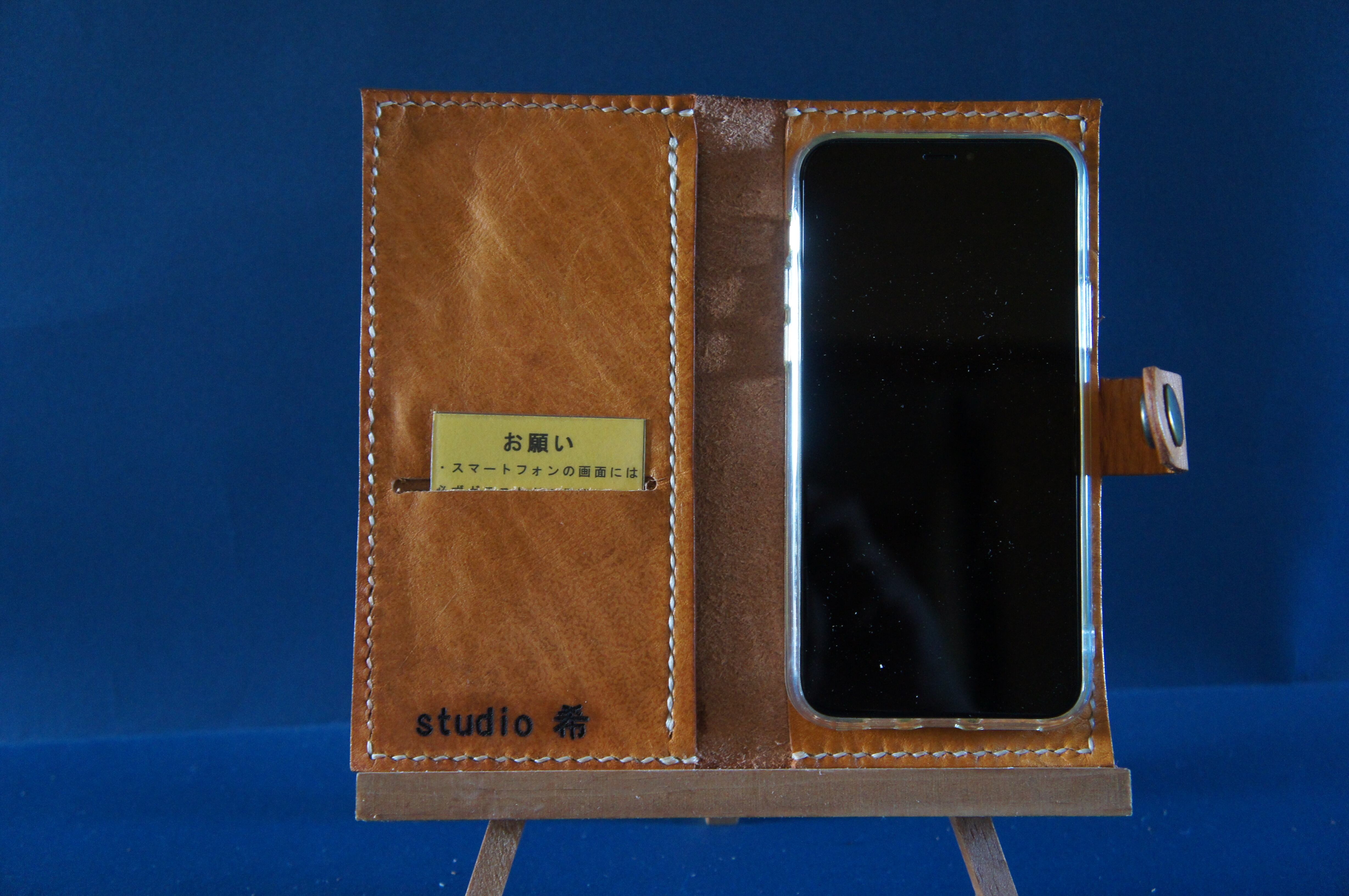一点物です。iPhone11pro用の手帳型スマートフォンケースです。本体、内側、カードホルダー、ホルダー裏の合計4枚の革を縫い合わせています。太さ1番の白色の糸ですべて手縫いで仕上げています。2本の針で縫っていますので、ほつれにくい構造になっています。1.5mmの厚さの茶色のソフトな牛革です。カードホルダーが1つあります。カードホルダー部分の裏には収納スペースがあります。スマートフォンを固定する部分は、カシメ金具4個で固定してあります。バネホック、金具の色は金色です。カメラ穴部分を固くするためには皮革硬化剤を使用しています。貼り付け部分はつるつるに磨いています。