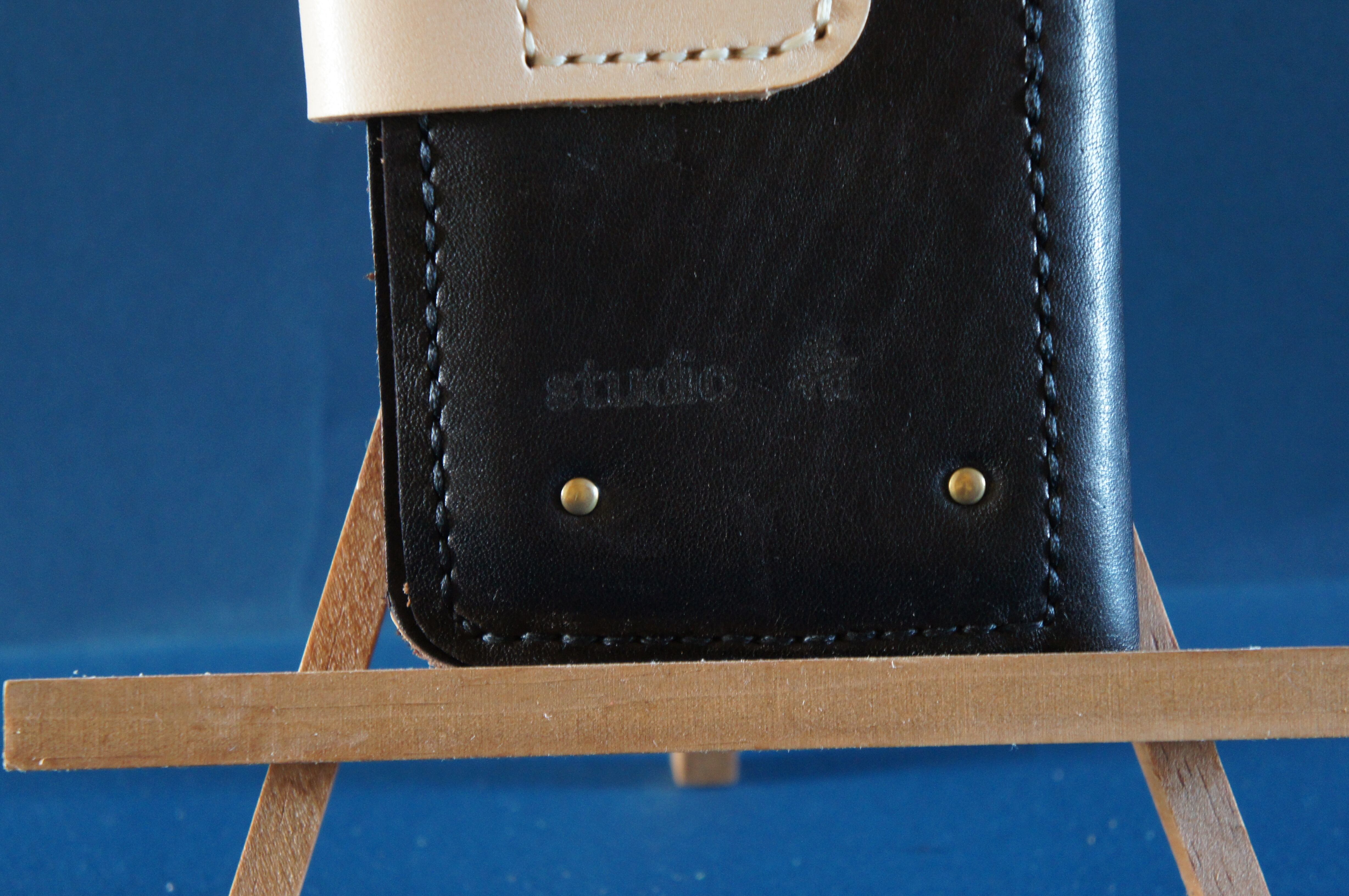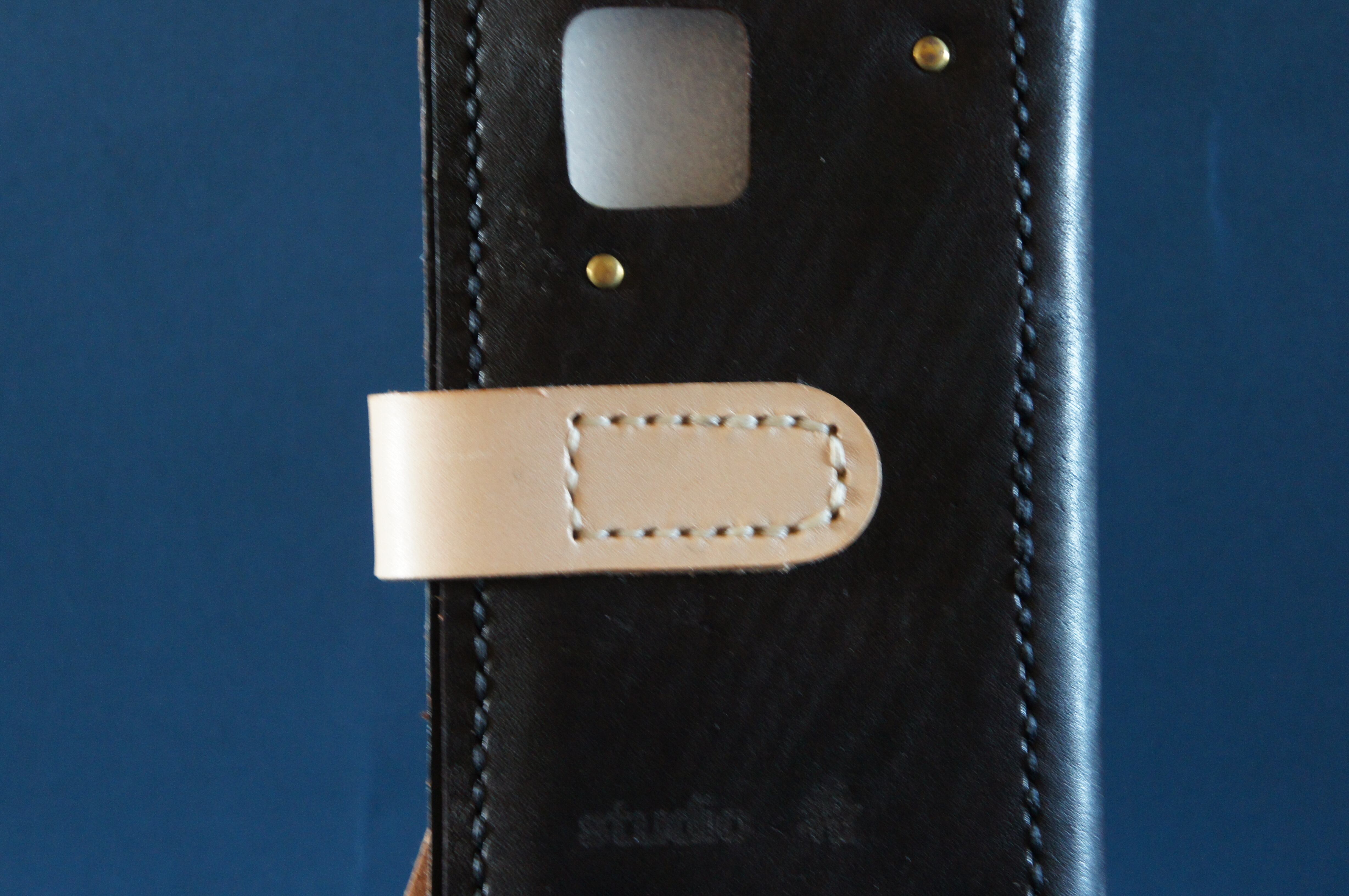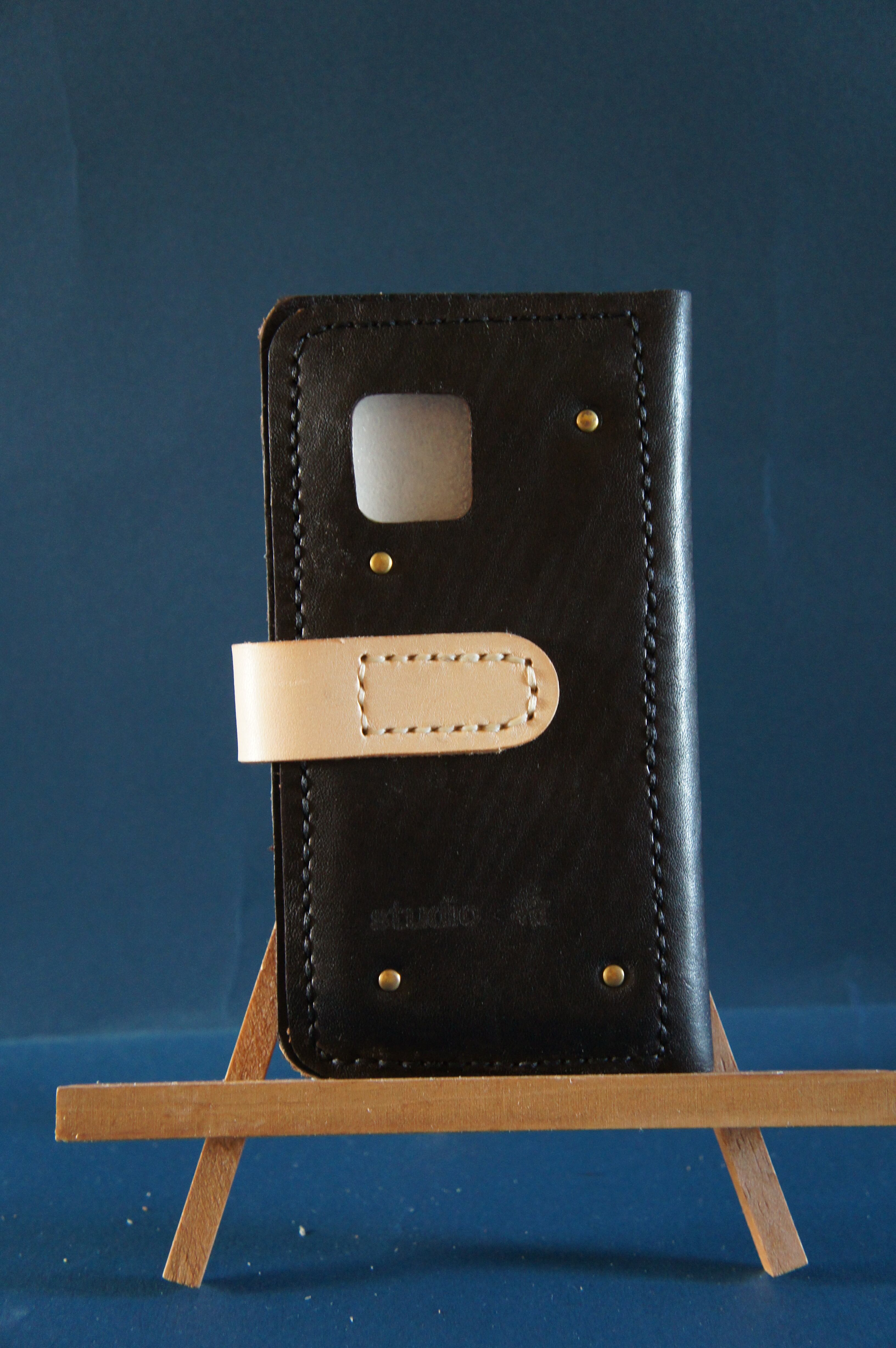 一点物です。iPhone11pro用の手帳型スマートフォンケースです。本体、内側、カードホルダー、ホルダー裏の合計4枚の革を縫い合わせています。太さ1番の白色の糸ですべて手縫いで仕上げています。2本の針で縫っていますので、ほつれにくい構造になっています。本体は1.5mmの厚さのソフトな黒色の牛革です。内側には厚さ0.8mmの水牛の革を使っています。カードホルダーが2つあります。カードホルダー部分の裏には収納スペースがあります。スマートフォンを固定する部分は、カシメ金具4個で固定してあります。バネホック、金具の色は銅色です。カメラ穴部分を固くするためには皮革硬化剤を使用しています。貼り付け部分はつるつるに磨いています。
