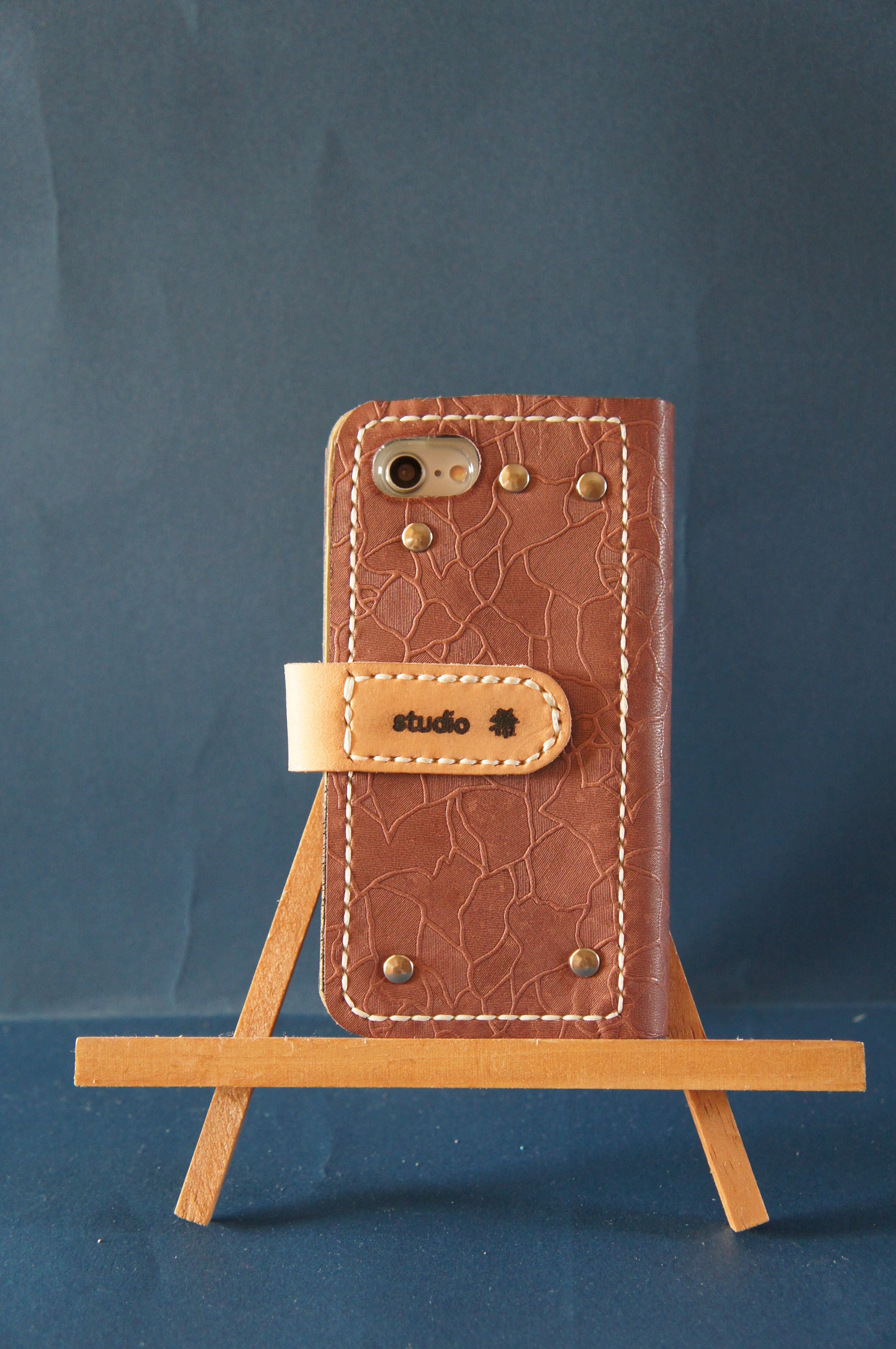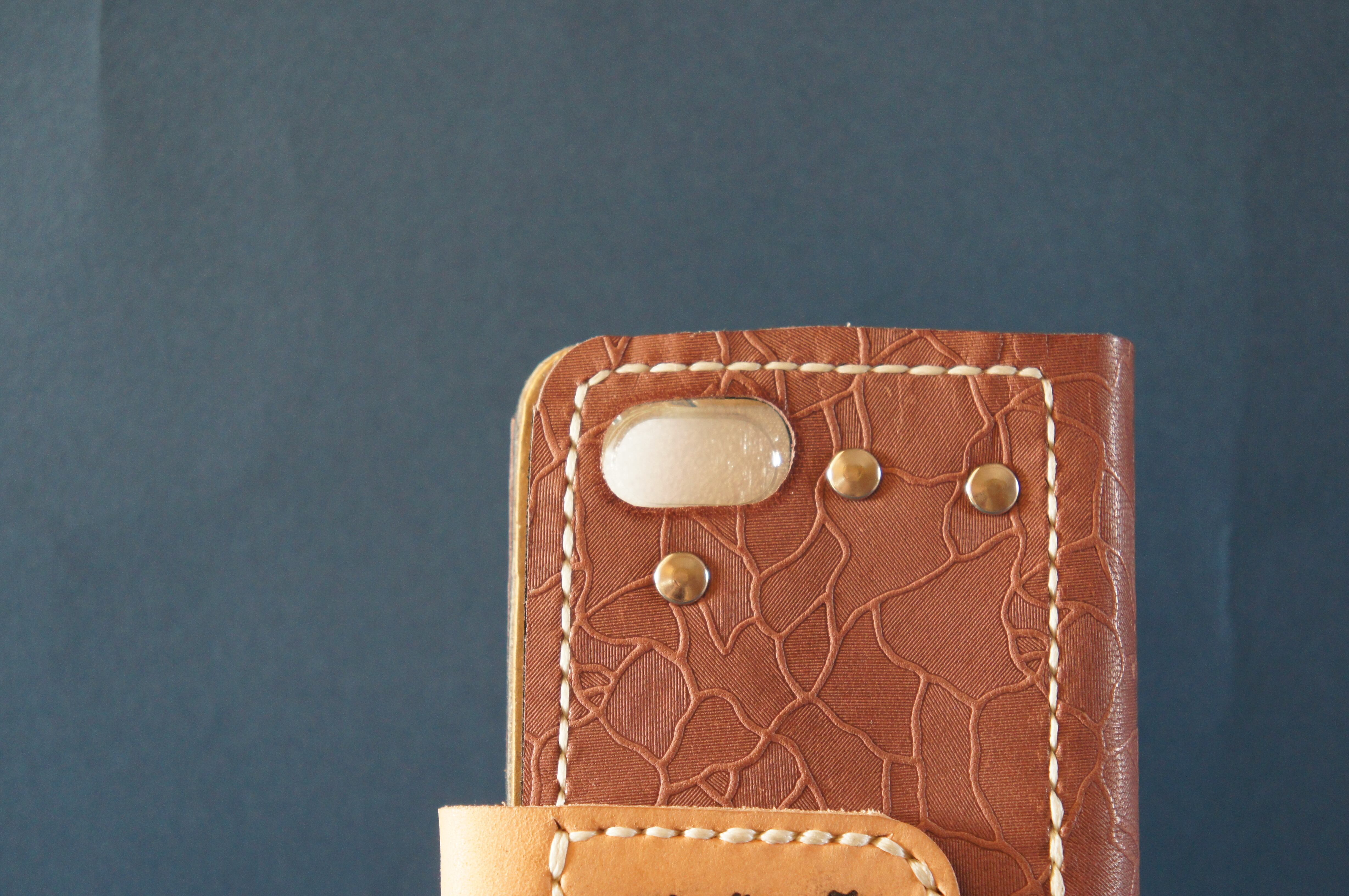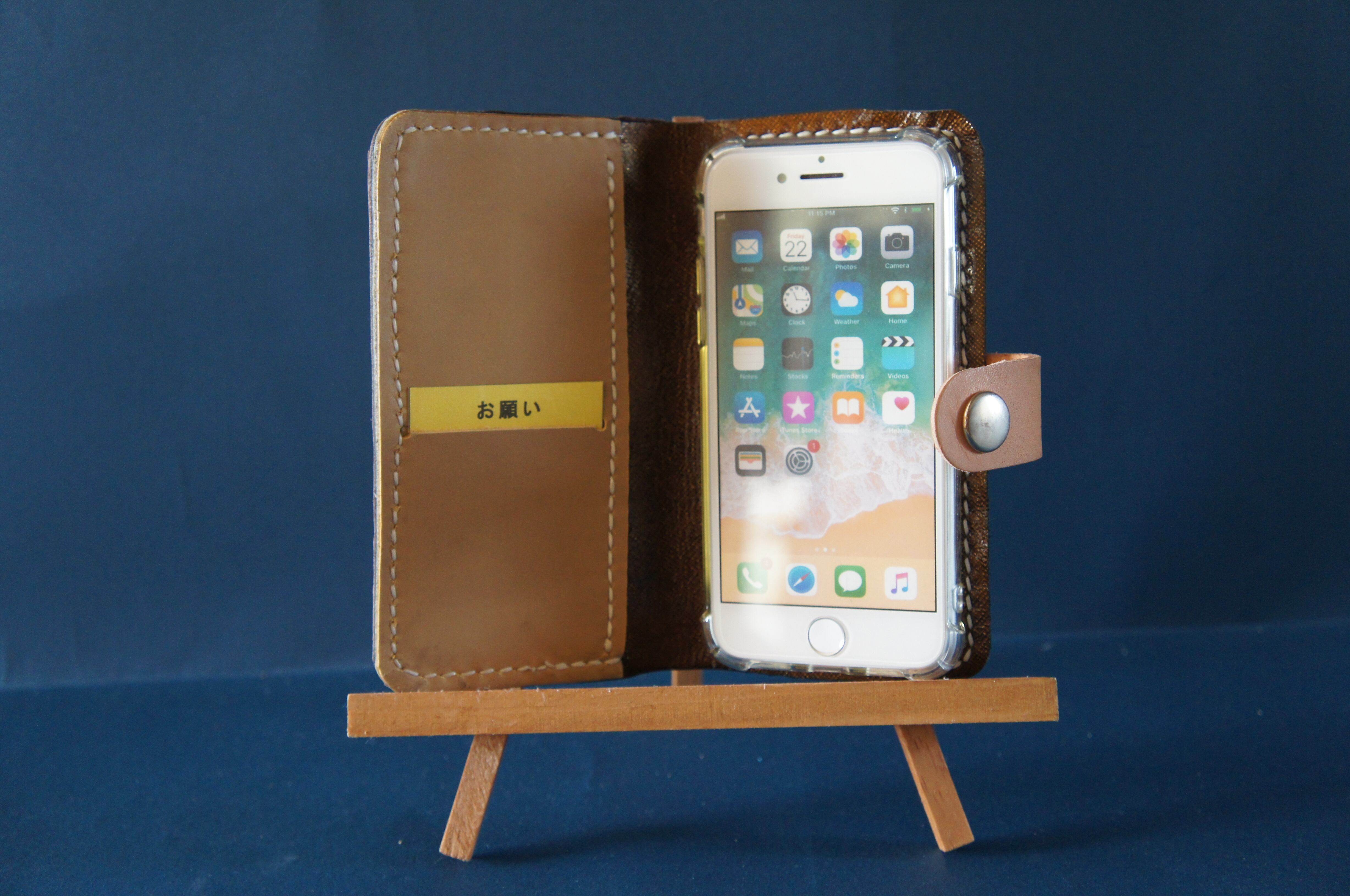 一点物です。iPhoneSE/ iPhone7/ iPhone8用の手帳型スマートフォンケースです。本体、内側、カードホルダー、ホルダー裏の合計4枚の革を縫い合わせています。太さ1番の白色の糸ですべて手縫いで仕上げています。2本の針で縫っていますので、ほつれにくい構造になっています。本体は1.0mmの厚さの和柄モザイク模様の茶色の牛革です。内側には厚さ0.8mmの牛革を使っています。カードホルダーが1つあります。カードホルダー部分の裏には収納スペースがあります。スマートフォンを固定する部分は、カシメ金具5個で固定してあります。バネホック、金具の色はシルバーです。カメラ穴部分を固くするためには皮革硬化剤を使用しています。貼り付け部分はつるつるに磨いています。