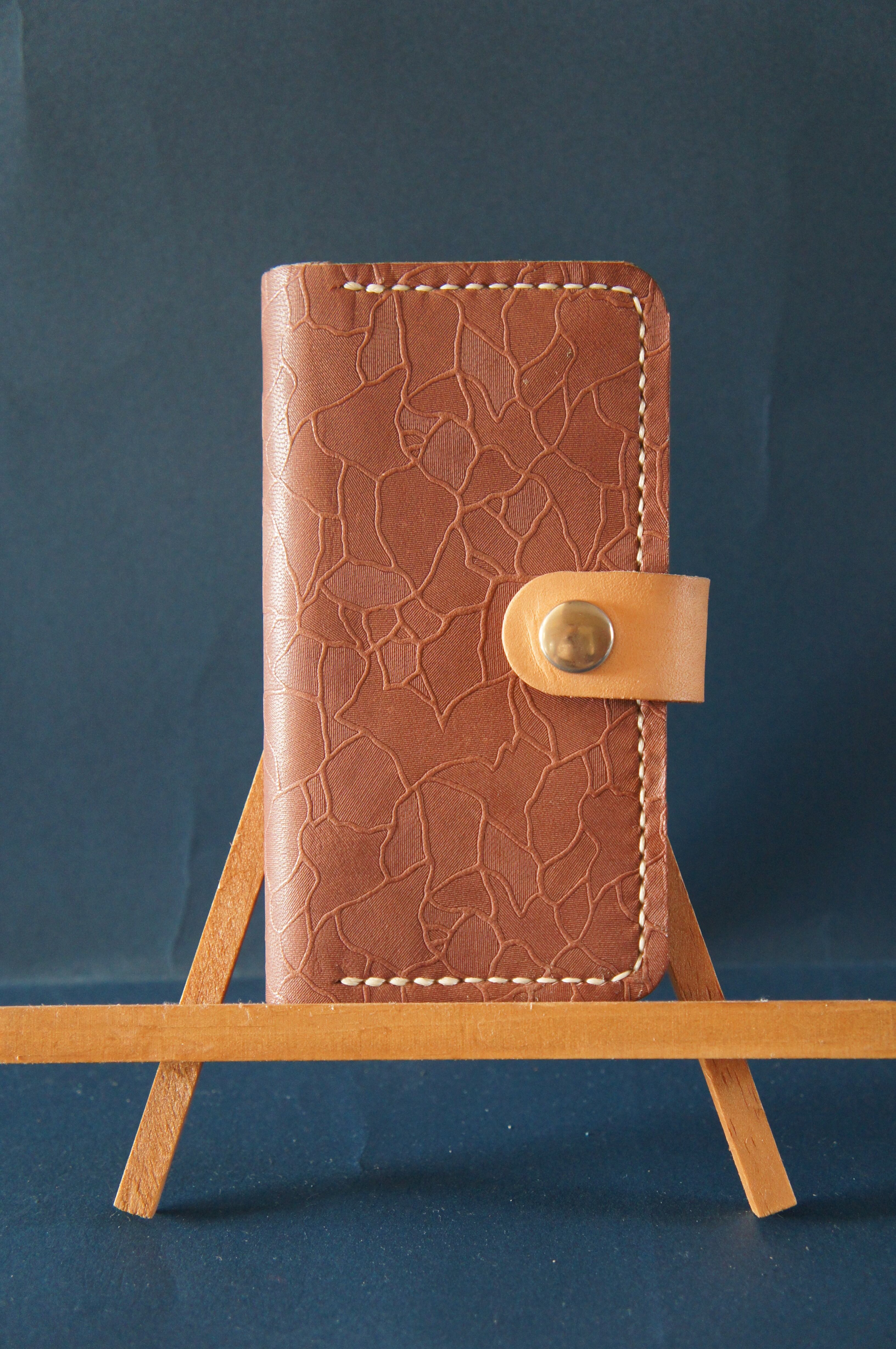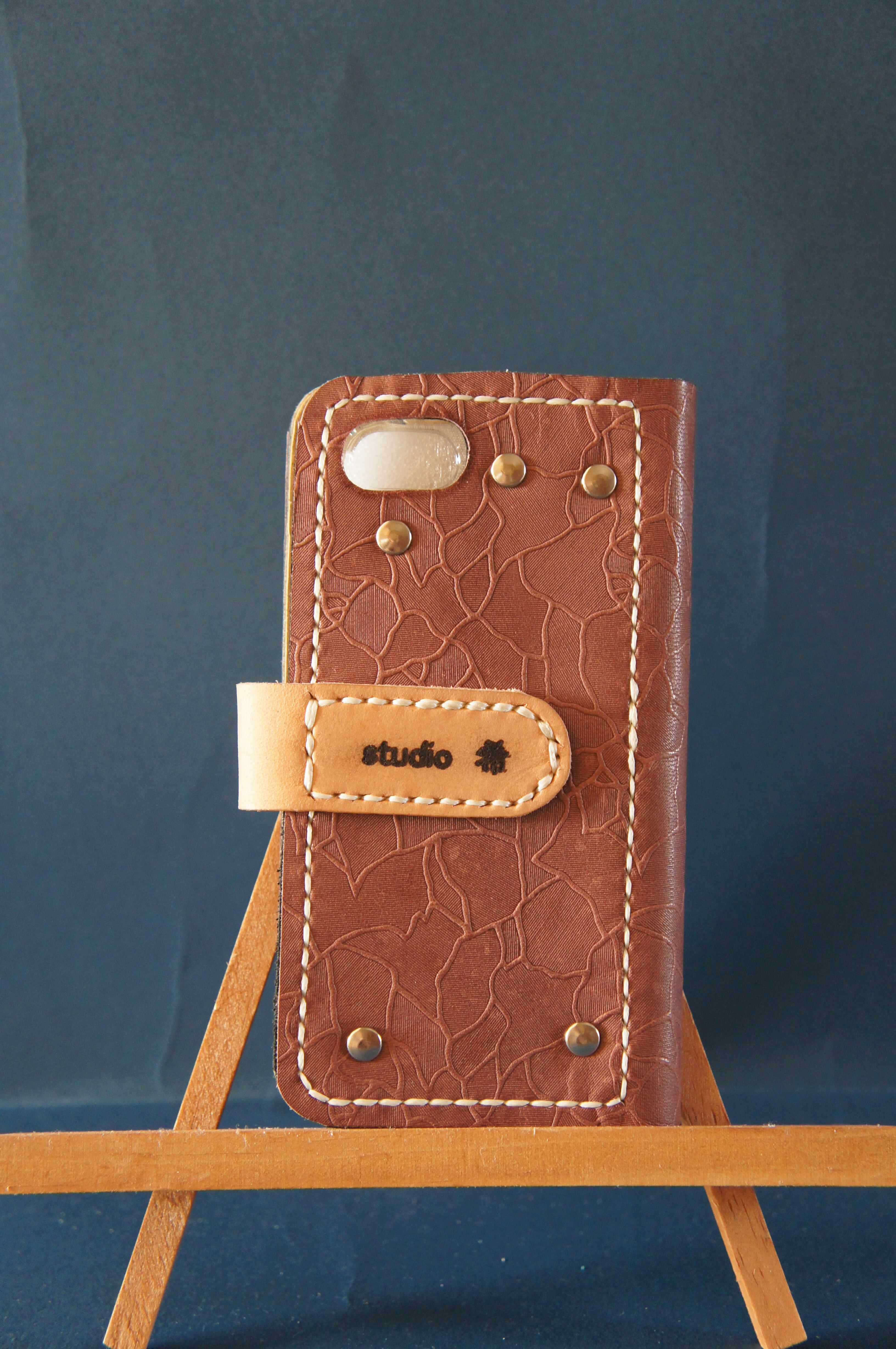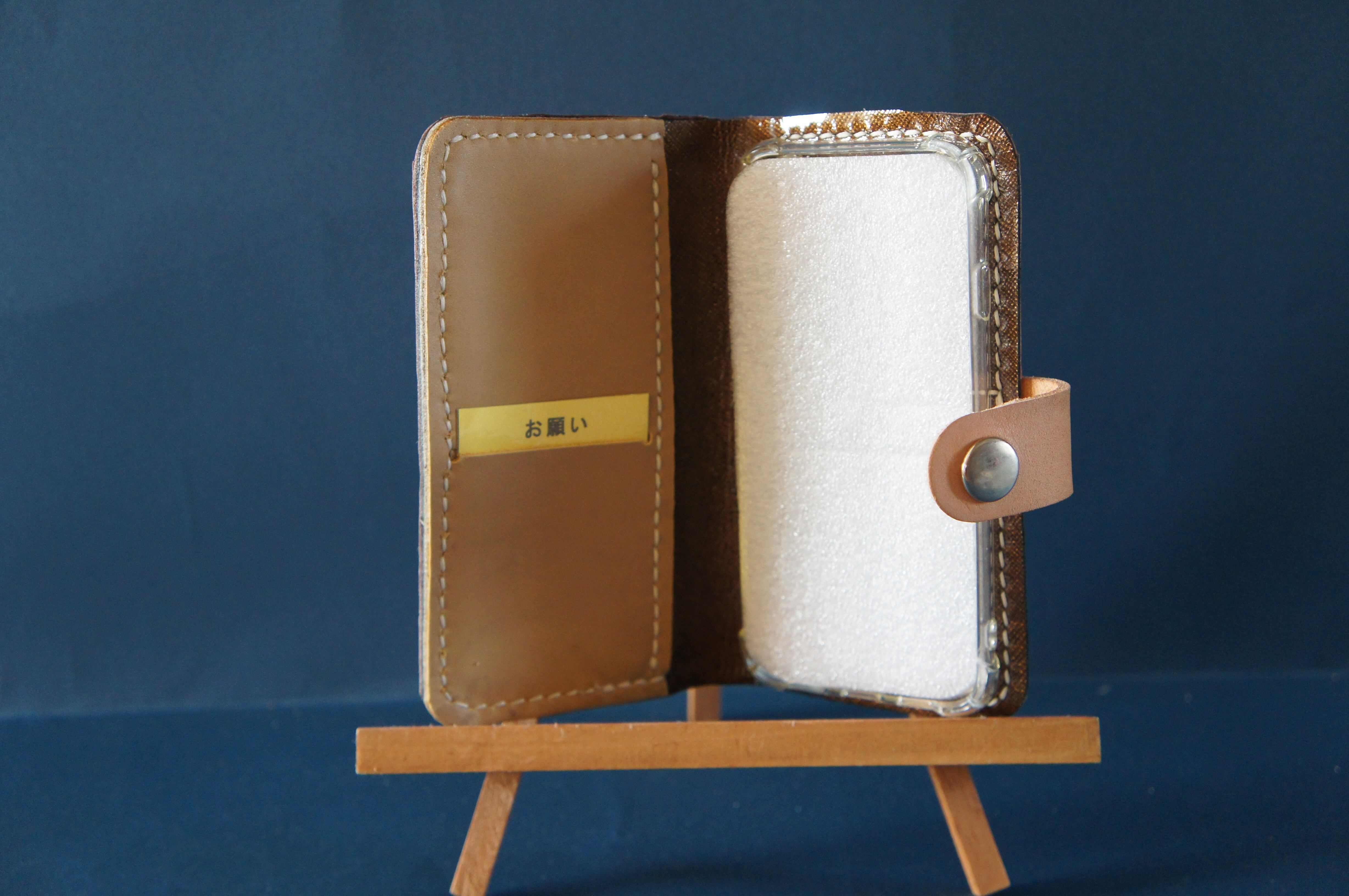 一点物です。iPhoneSE/ iPhone7/ iPhone8用の手帳型スマートフォンケースです。本体、内側、カードホルダー、ホルダー裏の合計4枚の革を縫い合わせています。太さ1番の白色の糸ですべて手縫いで仕上げています。2本の針で縫っていますので、ほつれにくい構造になっています。本体は1.0mmの厚さの和柄モザイク模様の茶色の牛革です。内側には厚さ0.8mmの牛革を使っています。カードホルダーが1つあります。カードホルダー部分の裏には収納スペースがあります。スマートフォンを固定する部分は、カシメ金具5個で固定してあります。バネホック、金具の色はシルバーです。カメラ穴部分を固くするためには皮革硬化剤を使用しています。貼り付け部分はつるつるに磨いています。