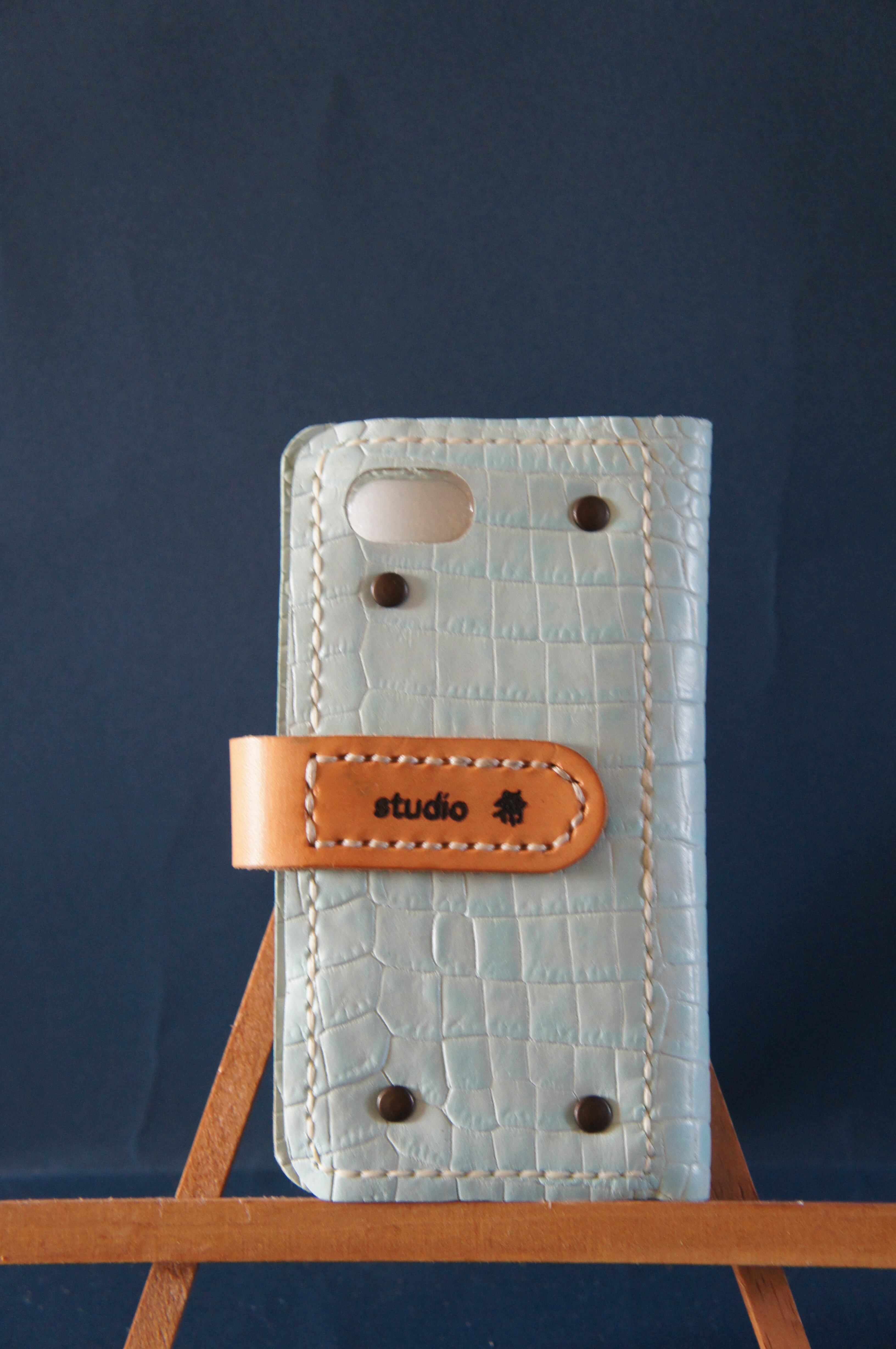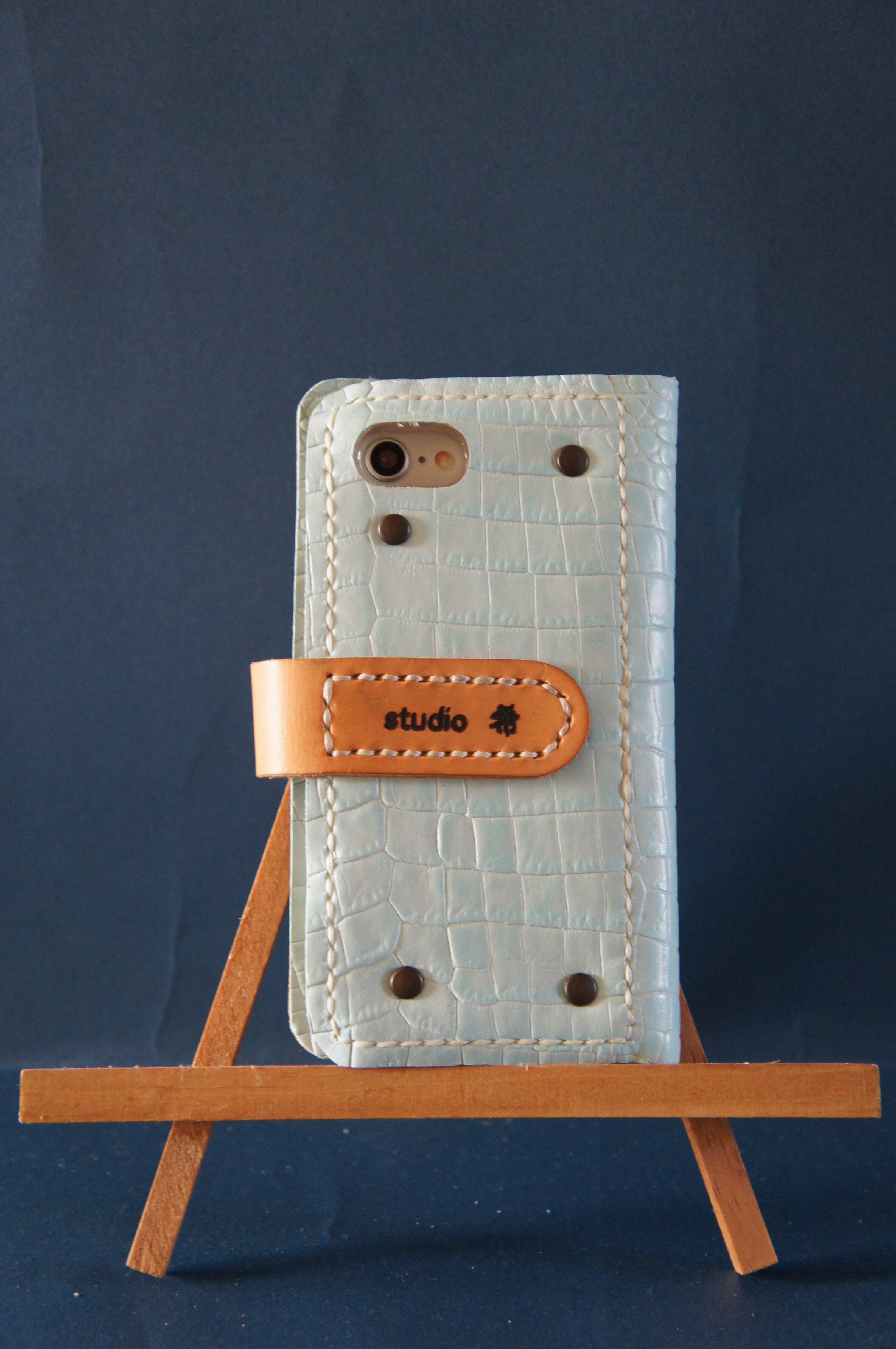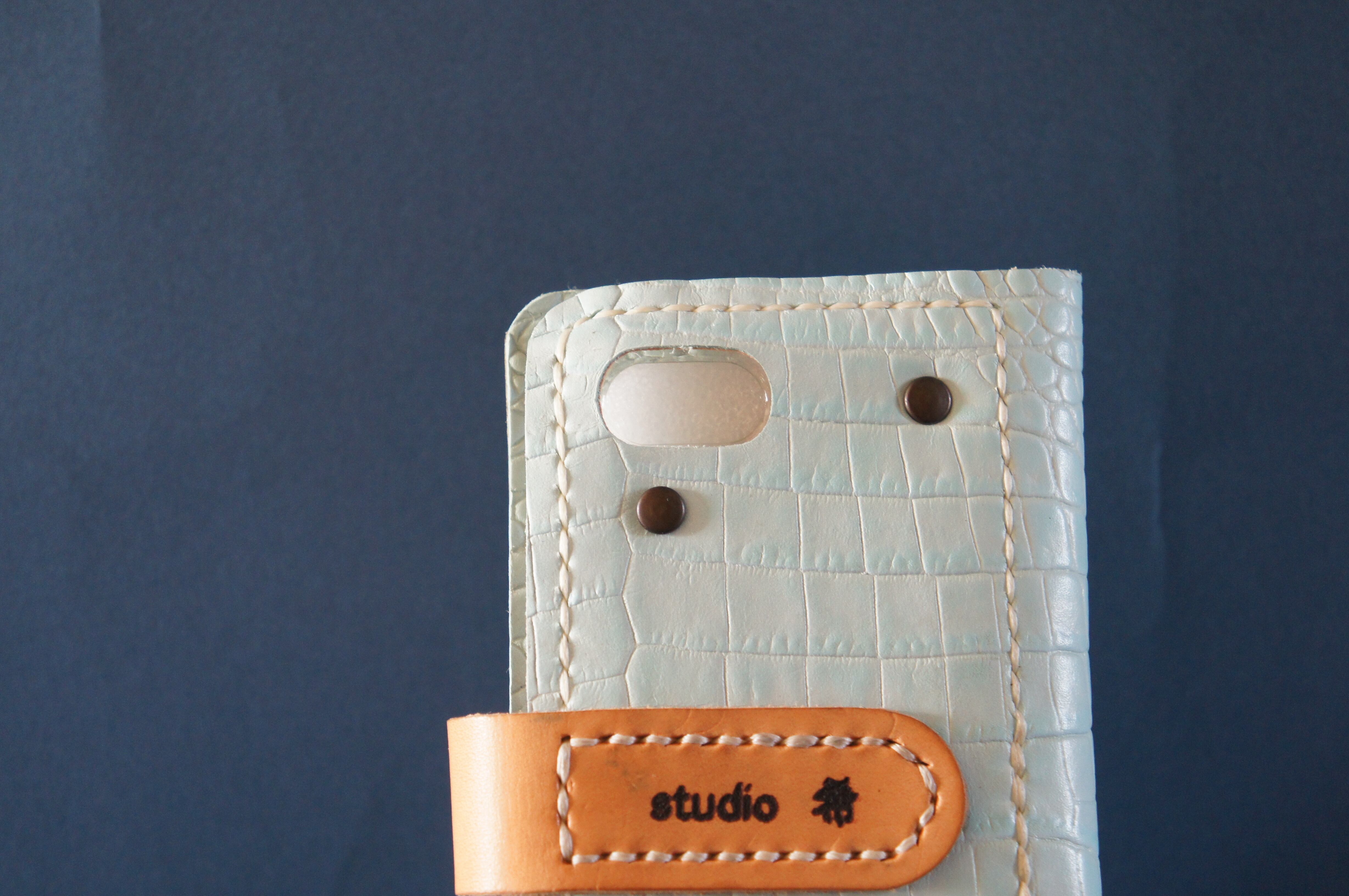 一点物です。iPhoneSE/ iPhone7/ iPhone8用の手帳型スマートフォンケースです。本体、内側、カードホルダー、ホルダー裏の合計4枚の革を縫い合わせています。太さ1番の白色の糸ですべて手縫いで仕上げています。2本の針で縫っていますので、ほつれにくい構造になっています。本体は1.5mmの厚さの蛇型押しの水色の牛革です。内側には厚さ0.8mmの豚革を使っています。カードホルダーが1つあります。カードホルダー部分の裏には収納スペースがあります。スマートフォンを固定する部分は、カシメ金具4個で固定してあります。バネホック、金具の色はブロンズです。カメラ穴部分を固くするためには皮革硬化剤を使用しています。貼り付け部分はつるつるに磨いています。