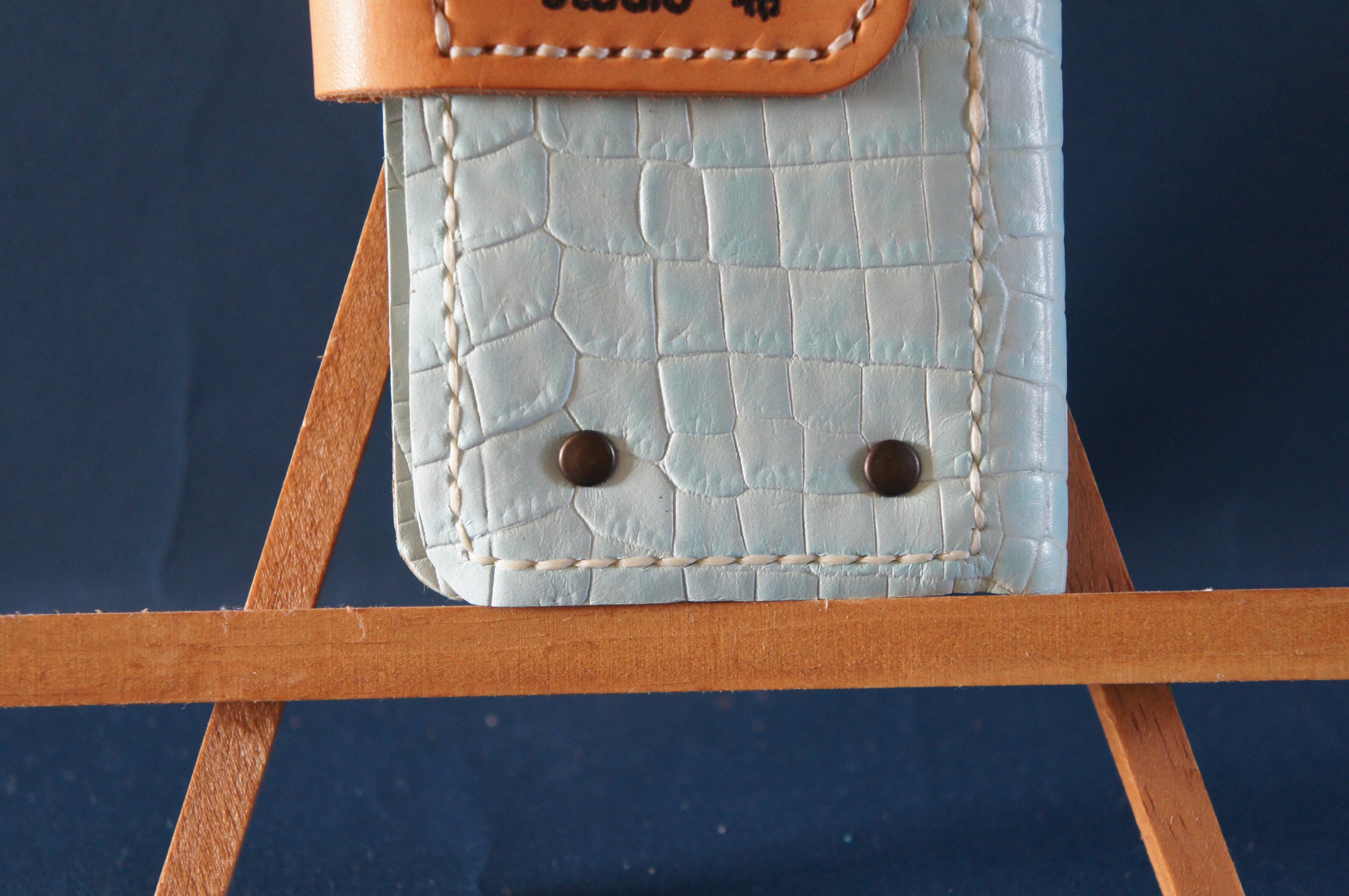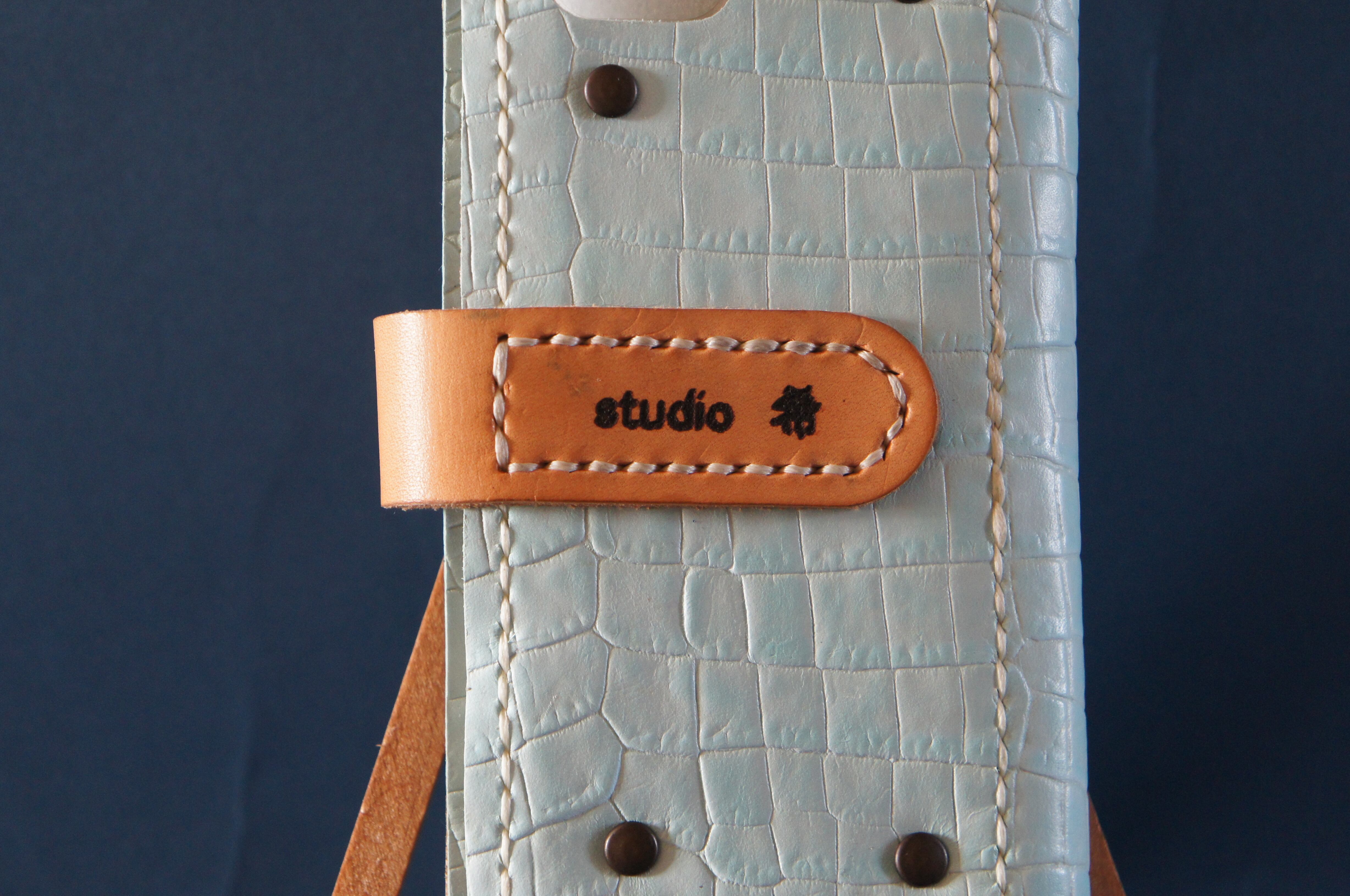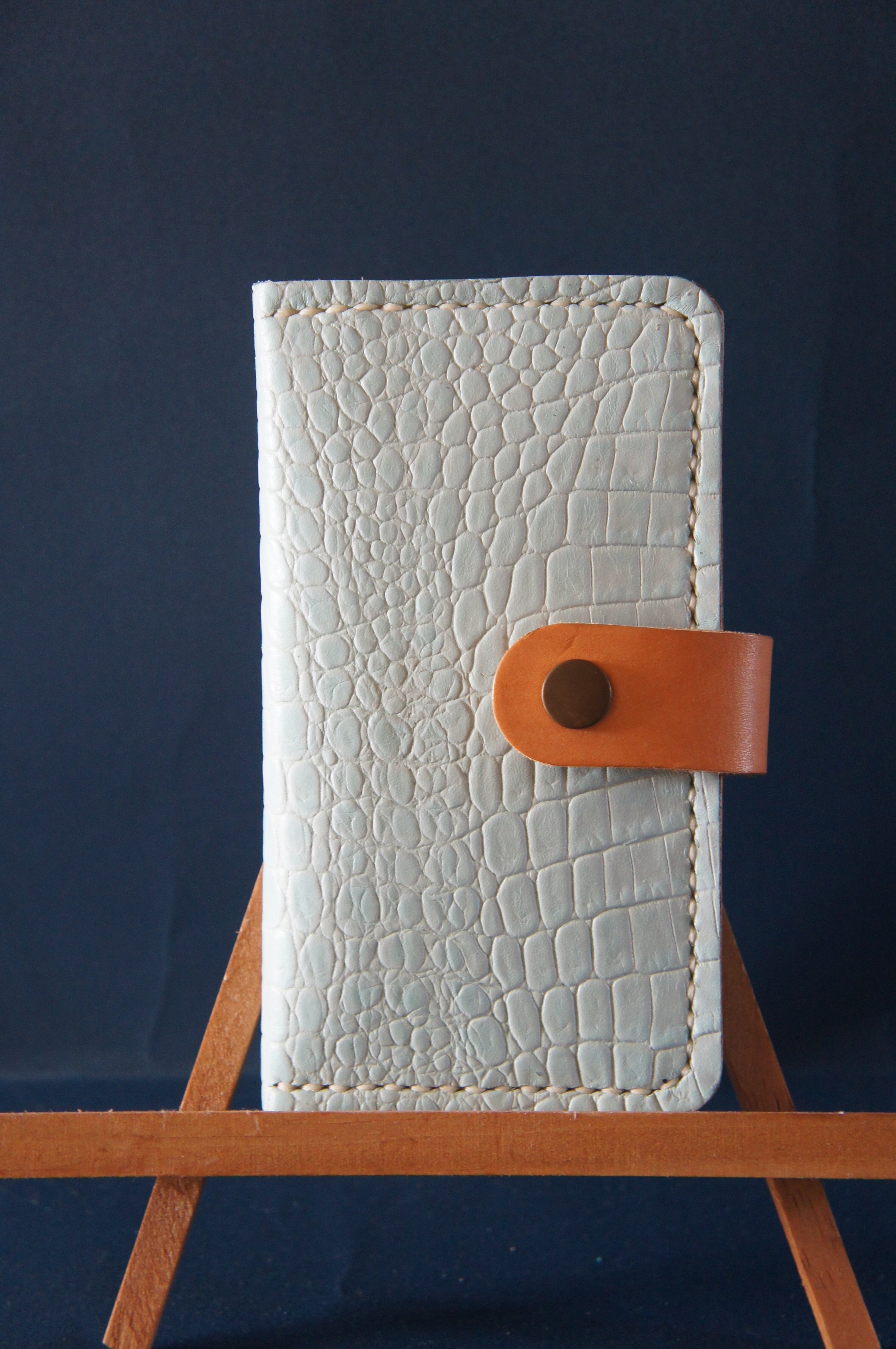 一点物です。iPhoneSE/ iPhone7/ iPhone8用の手帳型スマートフォンケースです。本体、内側、カードホルダー、ホルダー裏の合計4枚の革を縫い合わせています。太さ1番の白色の糸ですべて手縫いで仕上げています。2本の針で縫っていますので、ほつれにくい構造になっています。本体は1.5mmの厚さの蛇型押しの水色の牛革です。内側には厚さ0.8mmの豚革を使っています。カードホルダーが1つあります。カードホルダー部分の裏には収納スペースがあります。スマートフォンを固定する部分は、カシメ金具4個で固定してあります。バネホック、金具の色はブロンズです。カメラ穴部分を固くするためには皮革硬化剤を使用しています。貼り付け部分はつるつるに磨いています。