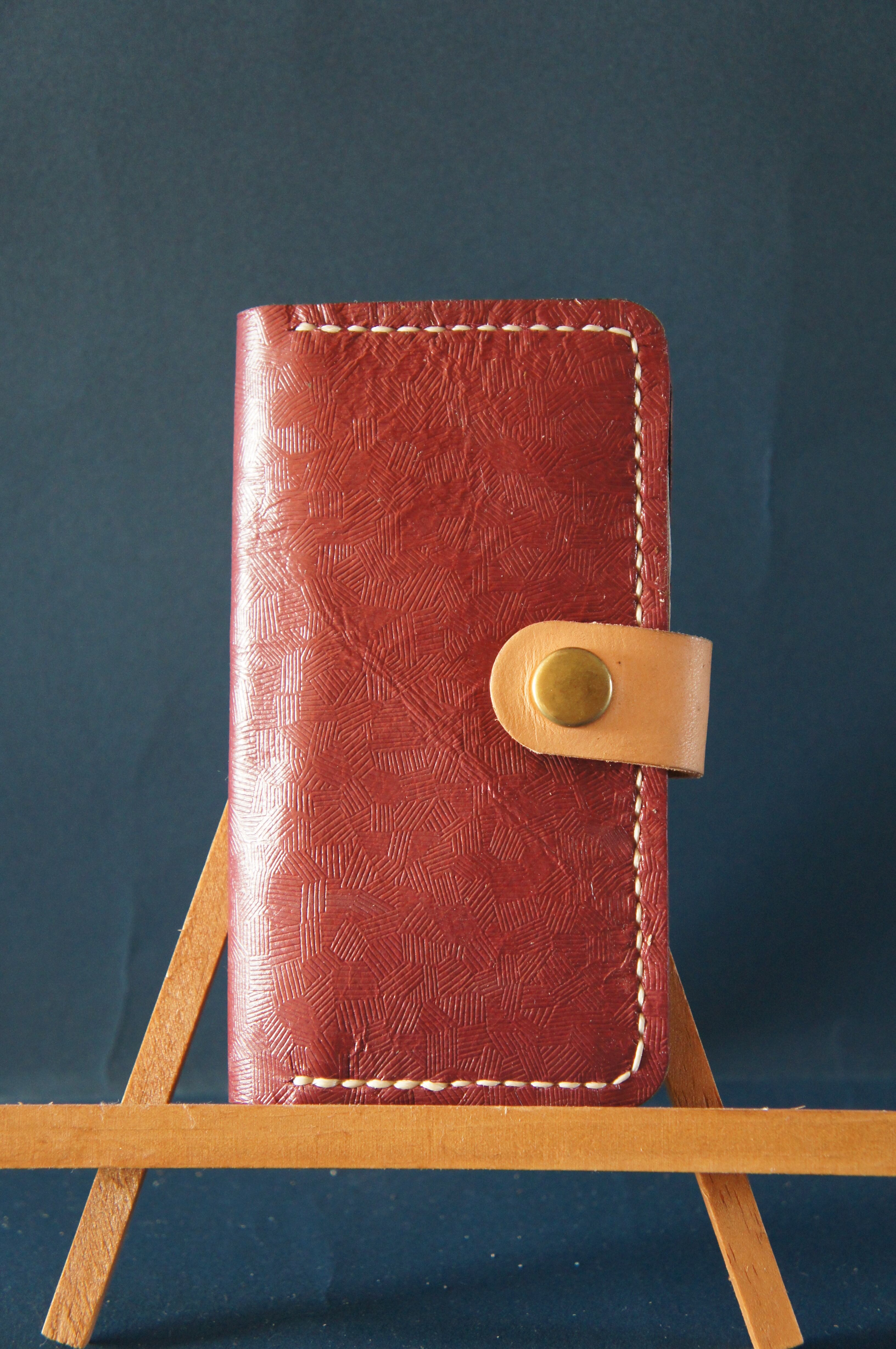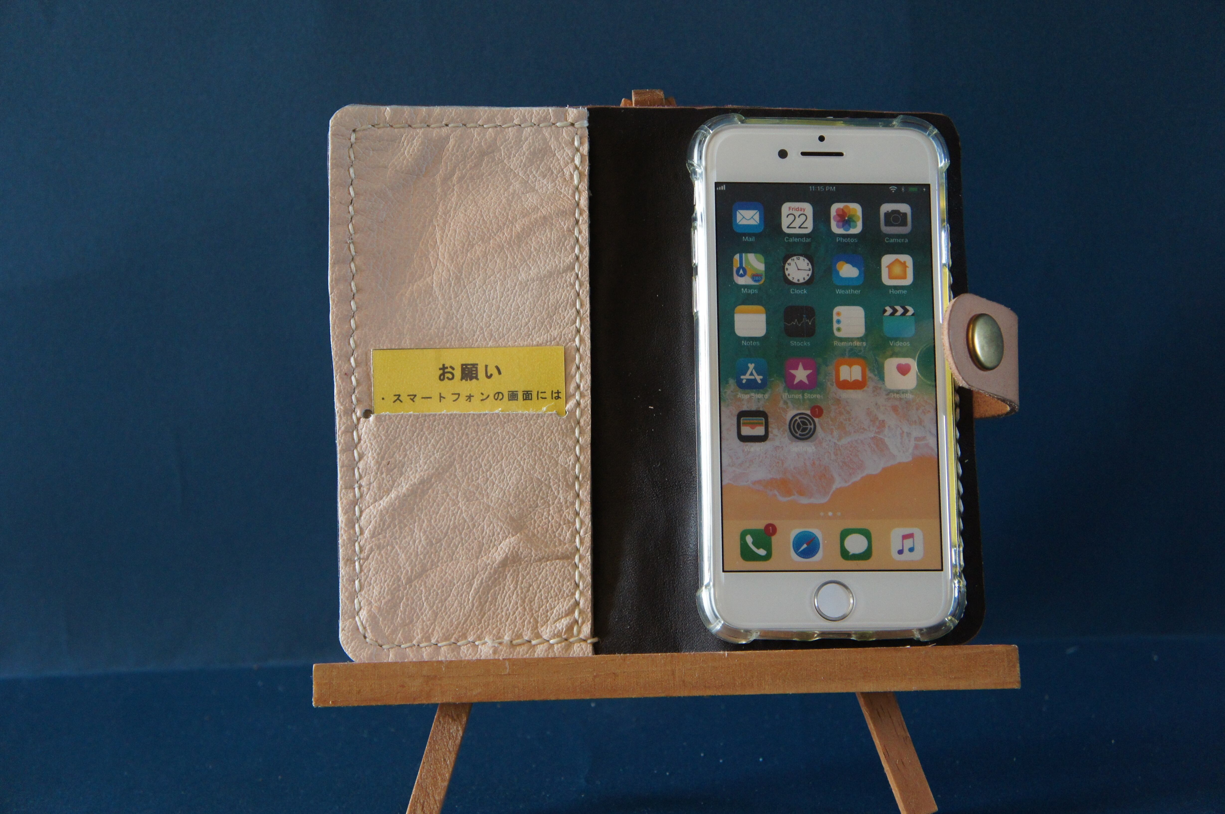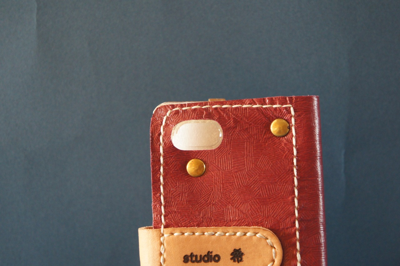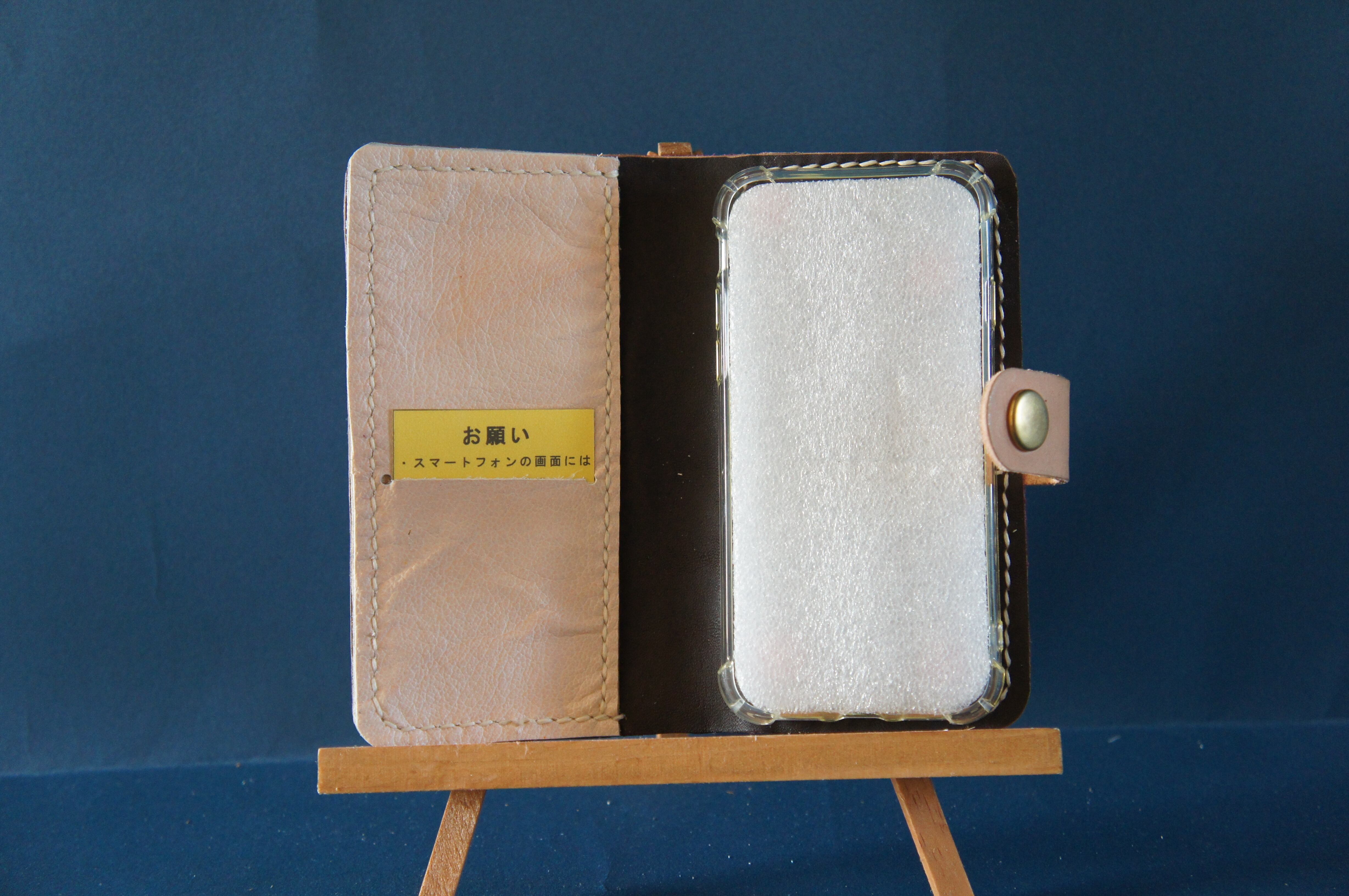 一点物です。iPhoneSE/ iPhone7/ iPhone8用の手帳型スマートフォンケースです。本体、内側、カードホルダー、ホルダー裏の合計4枚の革を縫い合わせています。太さ1番の白色の糸ですべて手縫いで仕上げています。2本の針で縫っていますので、ほつれにくい構造になっています。本体は1.5mmの厚さの和柄モザイク模様のピンクの牛革です。内側には厚さ0.8mmの牛革を使っています。カードホルダーが1つあります。カードホルダー部分の裏には収納スペースがあります。スマートフォンを固定する部分は、カシメ金具4個で固定してあります。バネホック、金具の色は金色です。カメラ穴部分を固くするためには皮革硬化剤を使用しています。貼り付け部分はつるつるに磨いています。