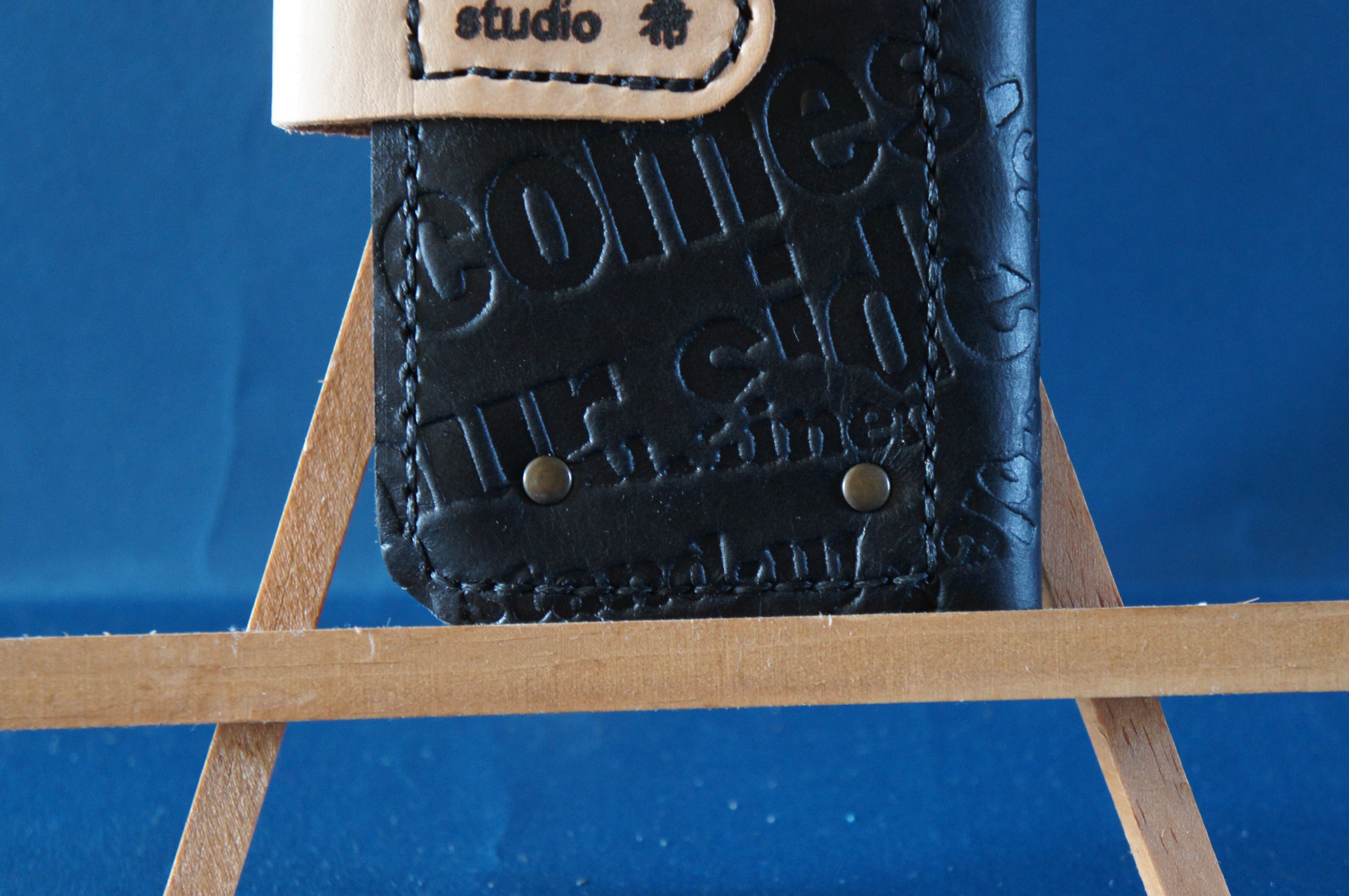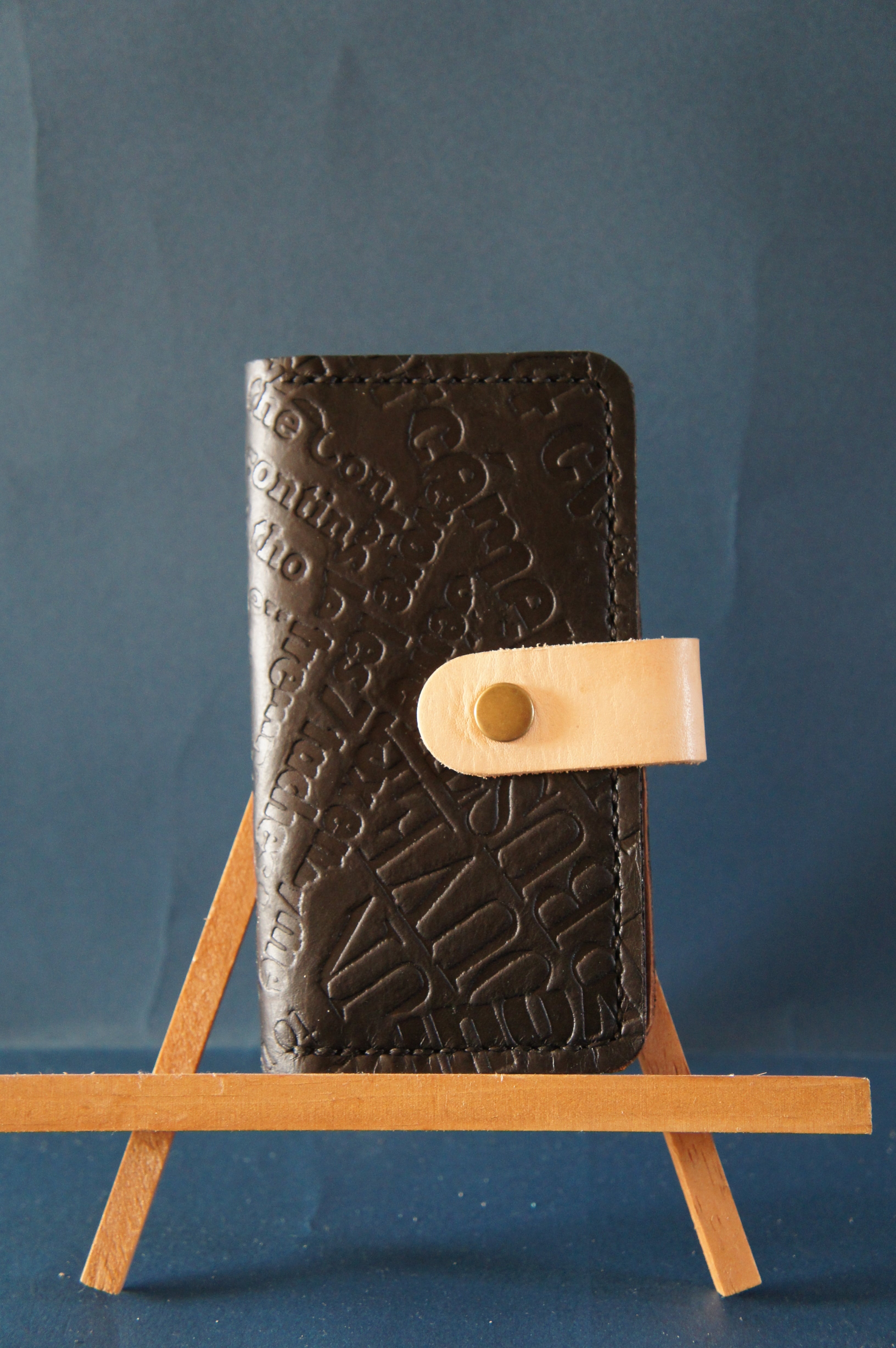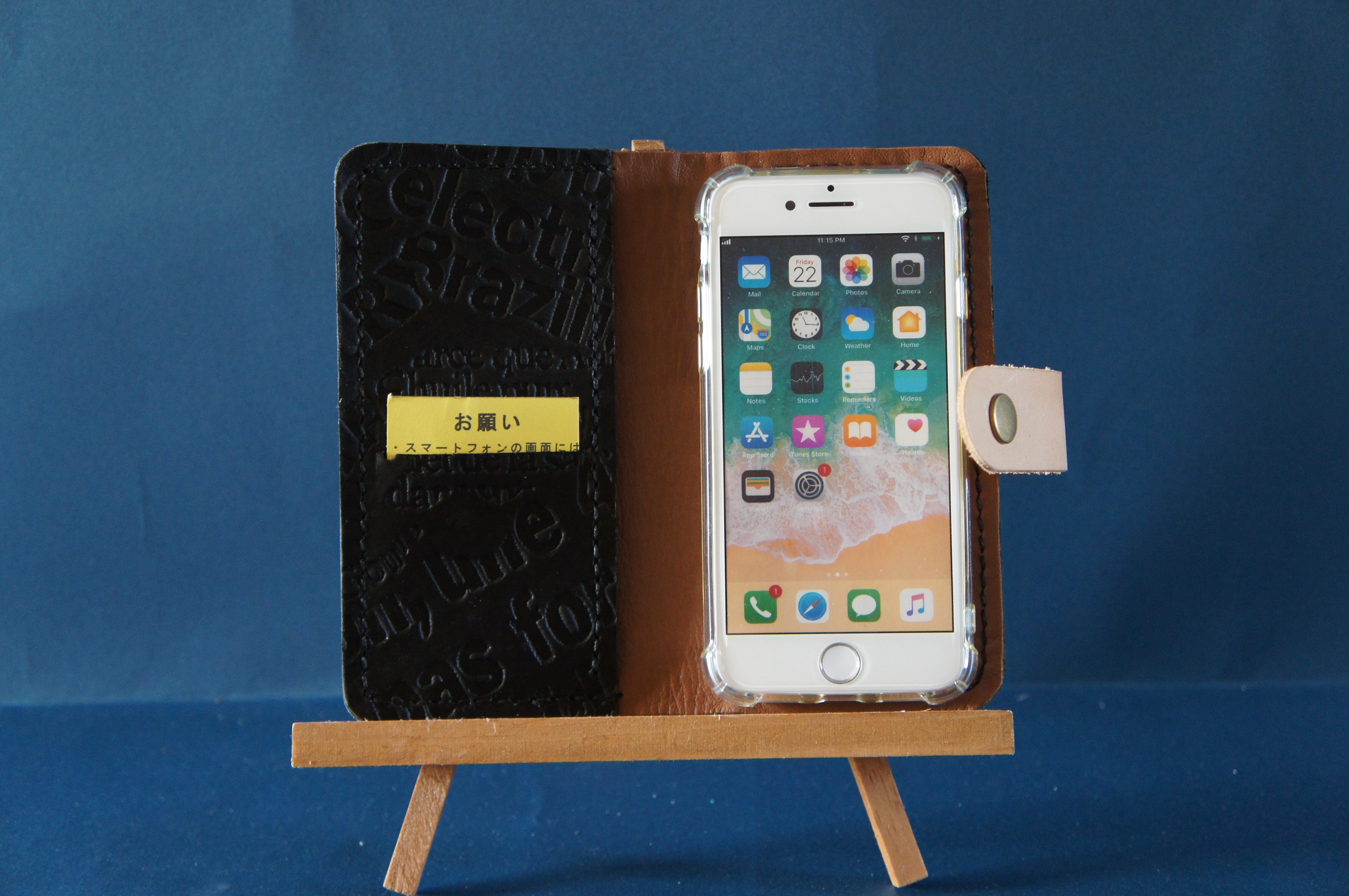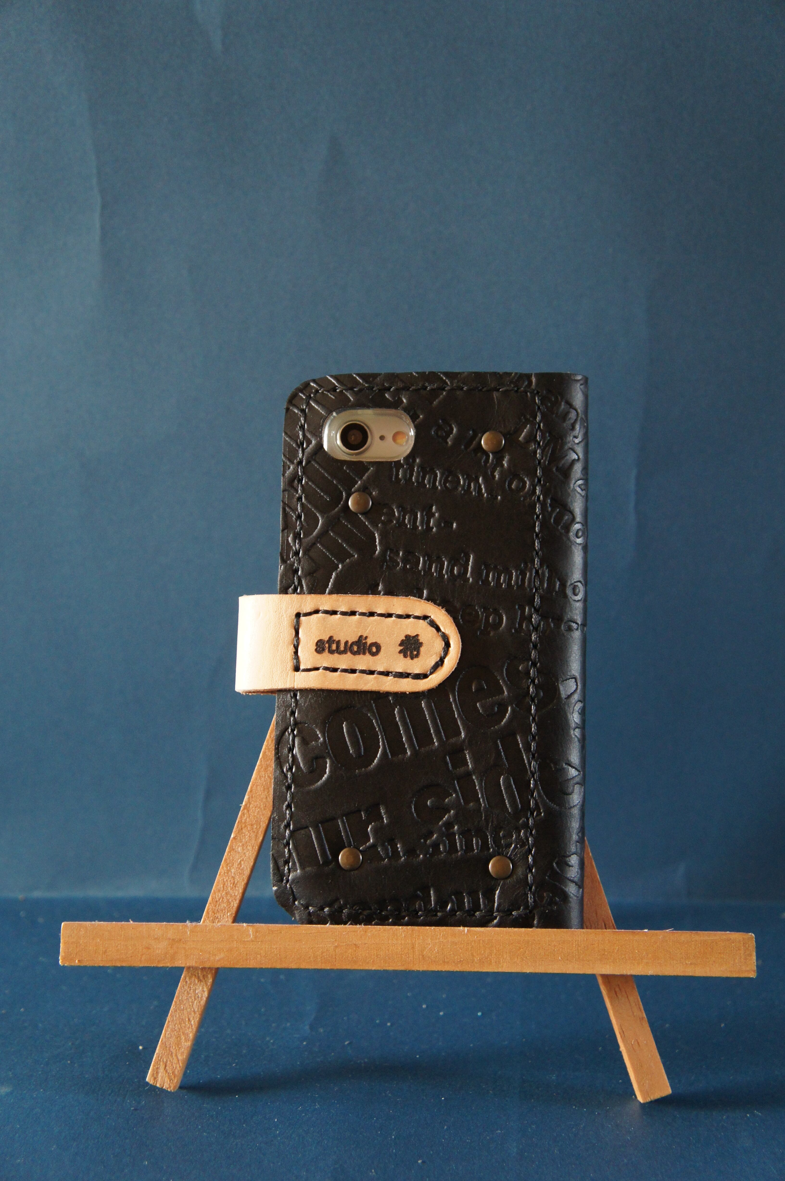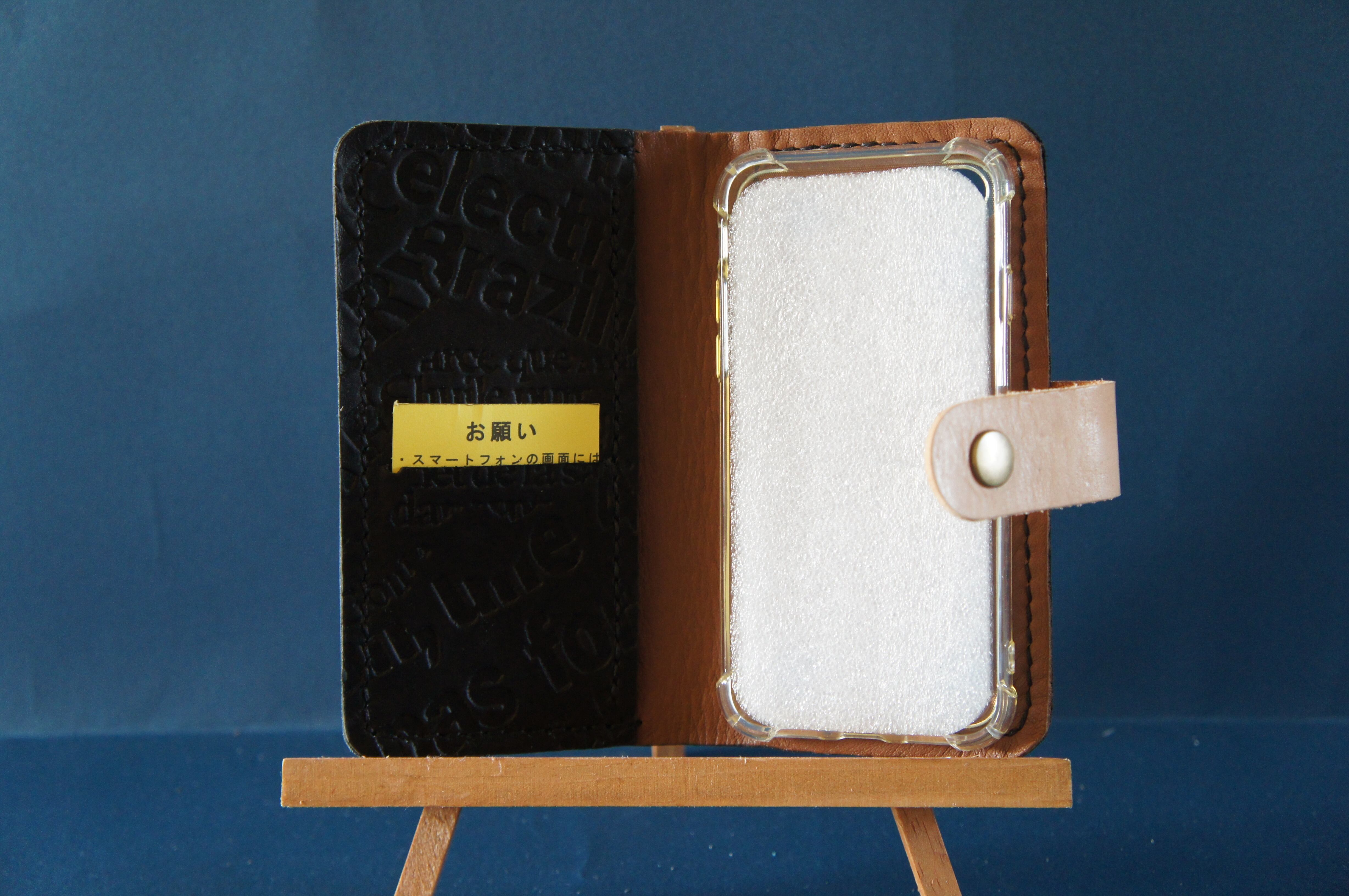 一点物です。iPhoneSE/ iPhone7/ iPhone8用の手帳型スマートフォンケースです。本体、内側、カードホルダー、ホルダー裏の合計4枚の革を縫い合わせています。太さ1番の黒色の糸ですべて手縫いで仕上げています。2本の針で縫っていますので、ほつれにくい構造になっています。本体は1.5mmの厚さの英文字型押しの黒色の牛革です。内側には厚さ0.8mmの水牛の革を使っています。カードホルダーが1つあります。カードホルダー部分の裏には収納スペースがあります。スマートフォンを固定する部分は、カシメ金具4個で固定してあります。バネホック、金具の色はガンメタです。カメラ穴部分を固くするためには皮革硬化剤を使用しています。貼り付け部分はつるつるに磨いています。